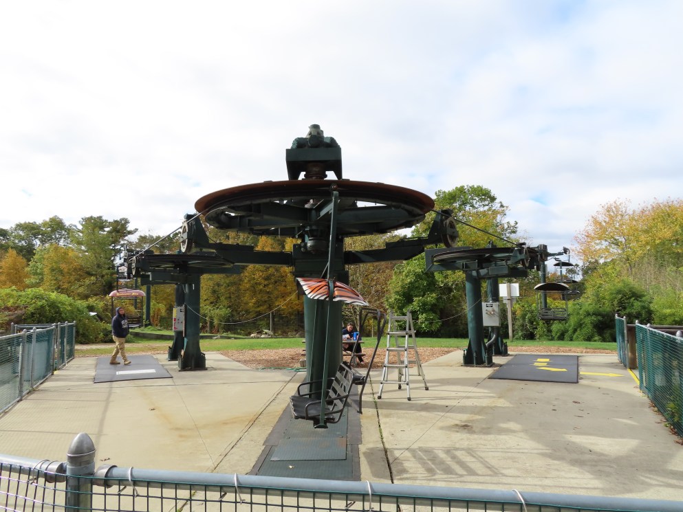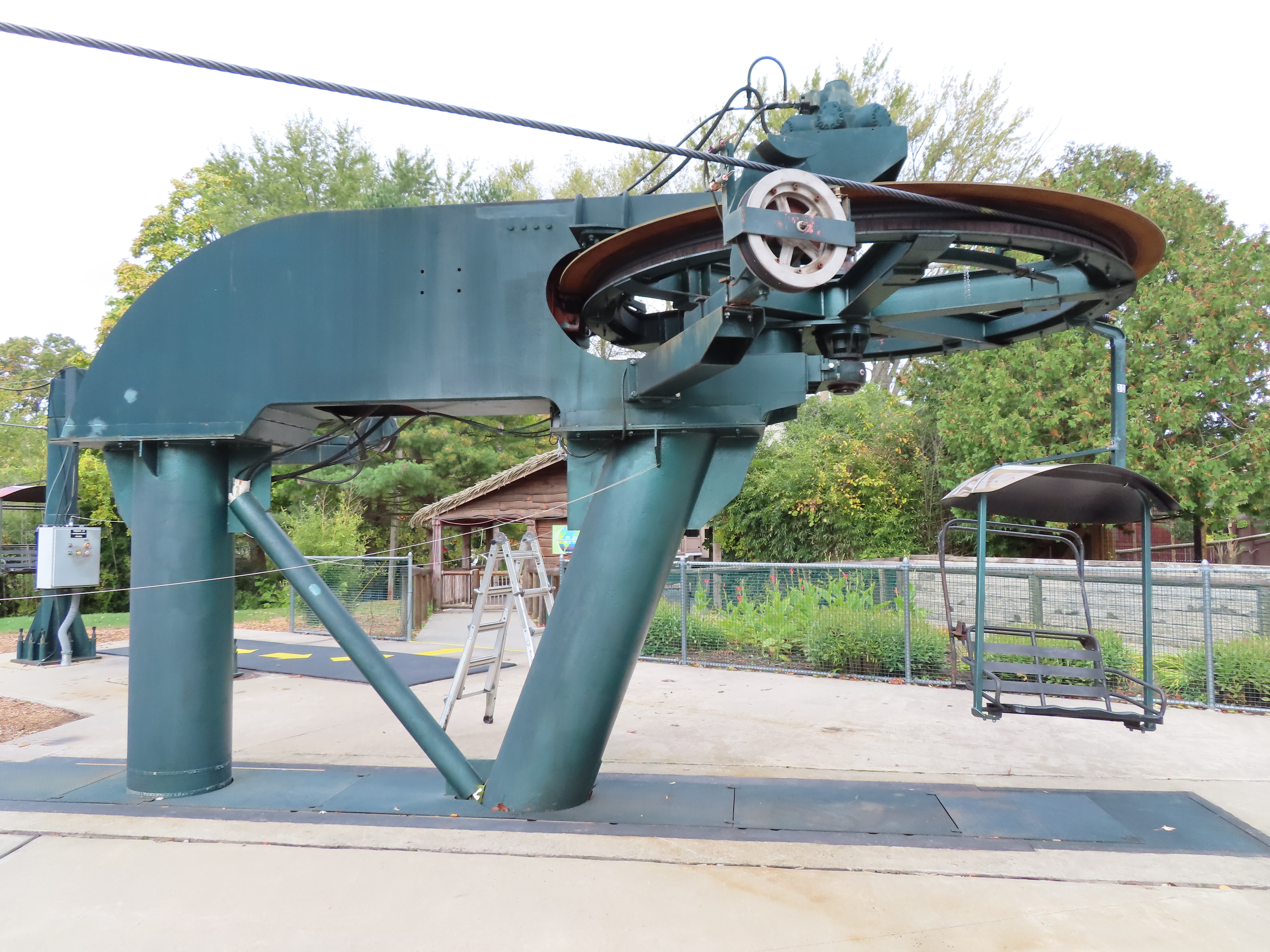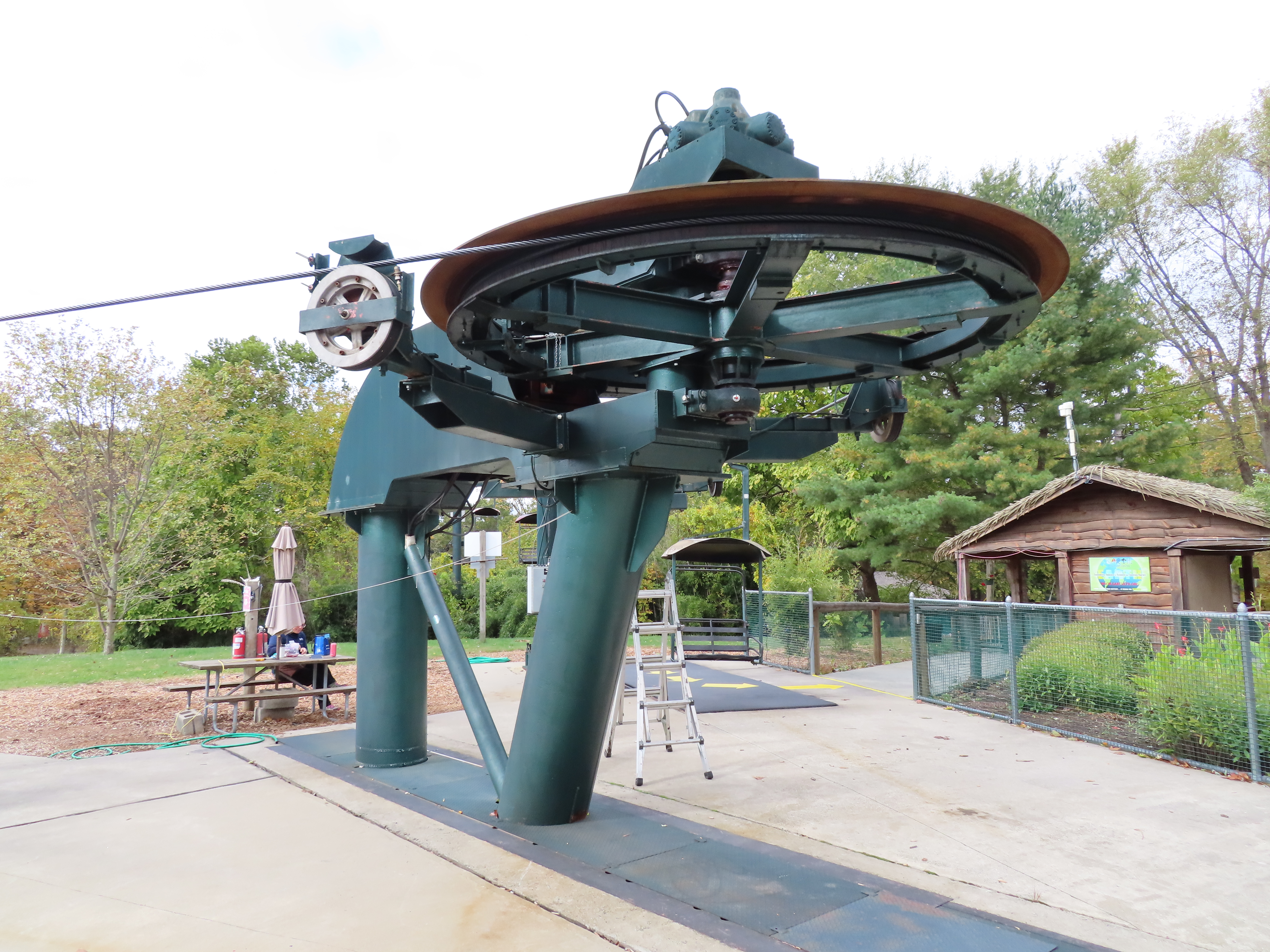 There is one other triangular skyride in Mexico (J.M. Romo), a Hopkins, that is tensioned by two bullwheels at the drive station. One is driven and the other one isn’t. Each one rides on its own tension carriage.
