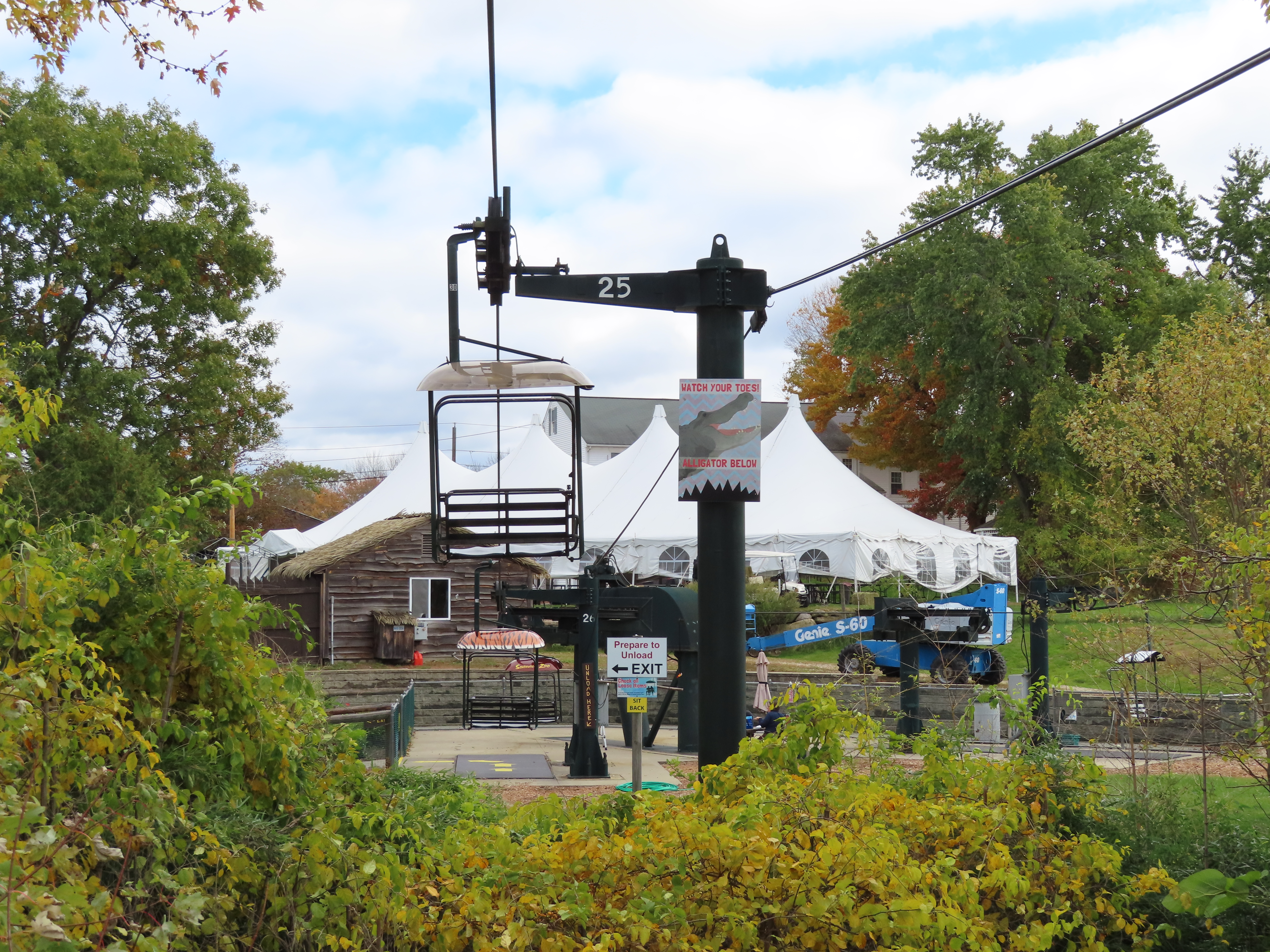 This very unique chairlift operates in a one way triangle with one loading station and two non-loading turn stations.