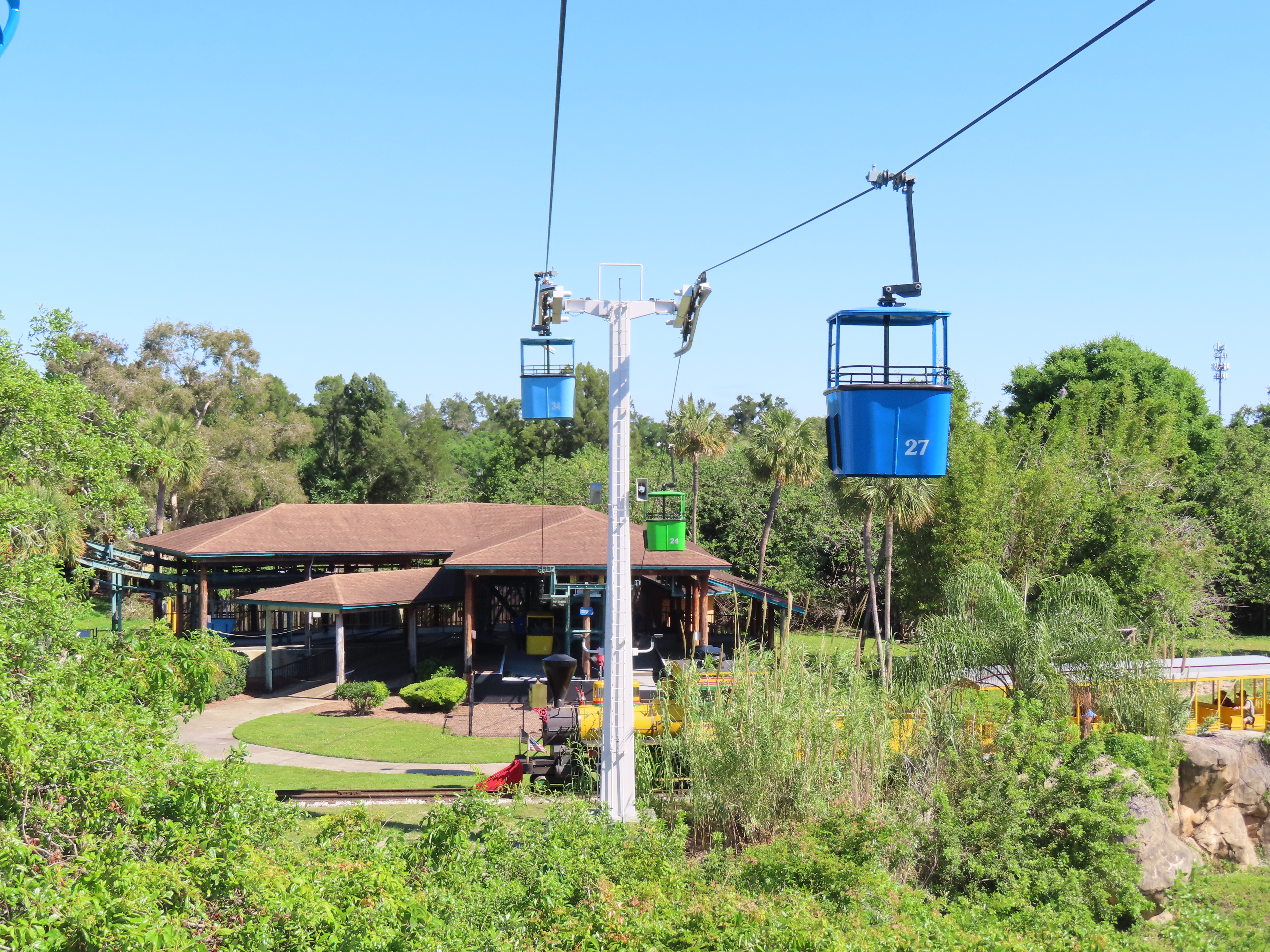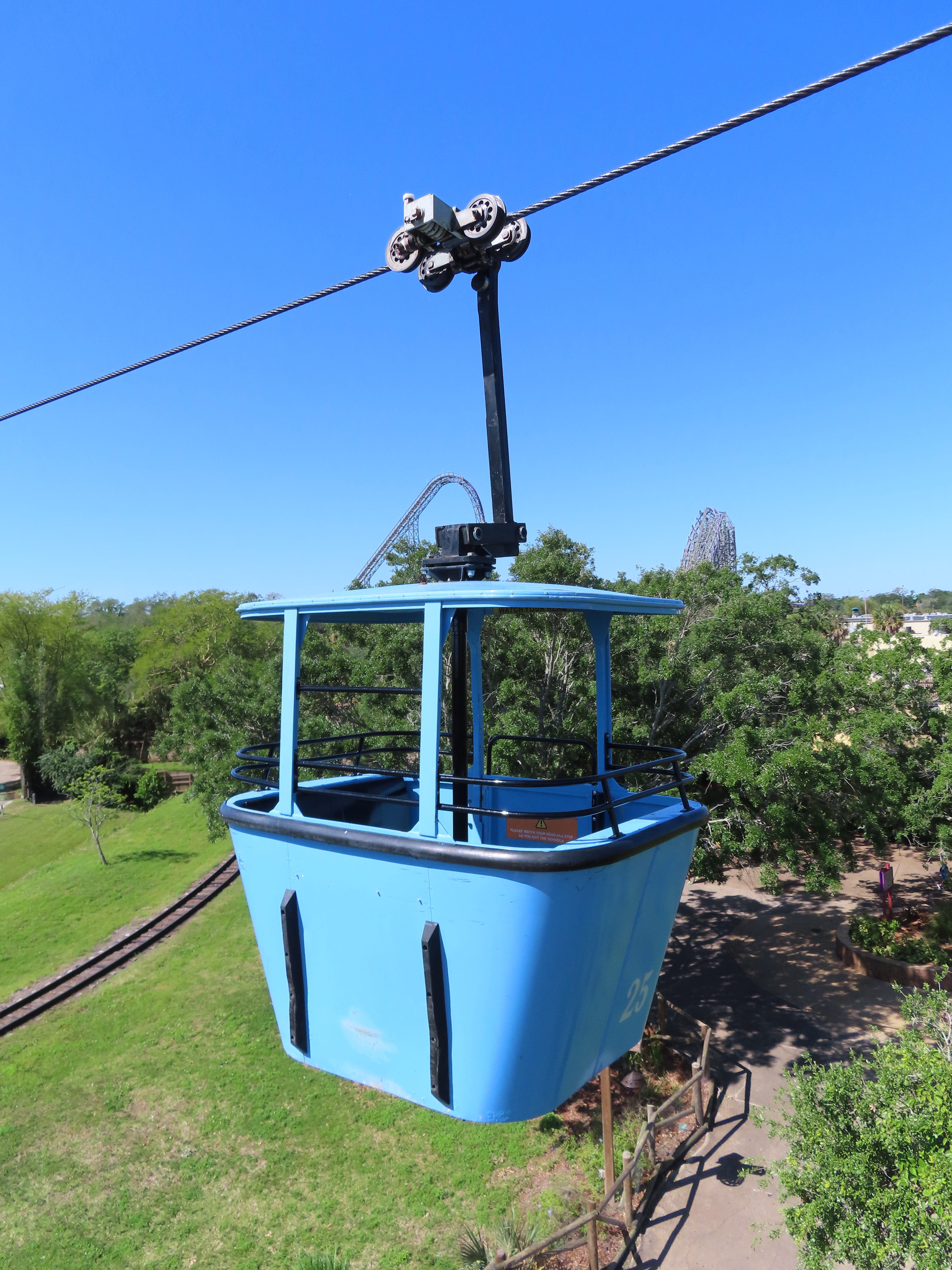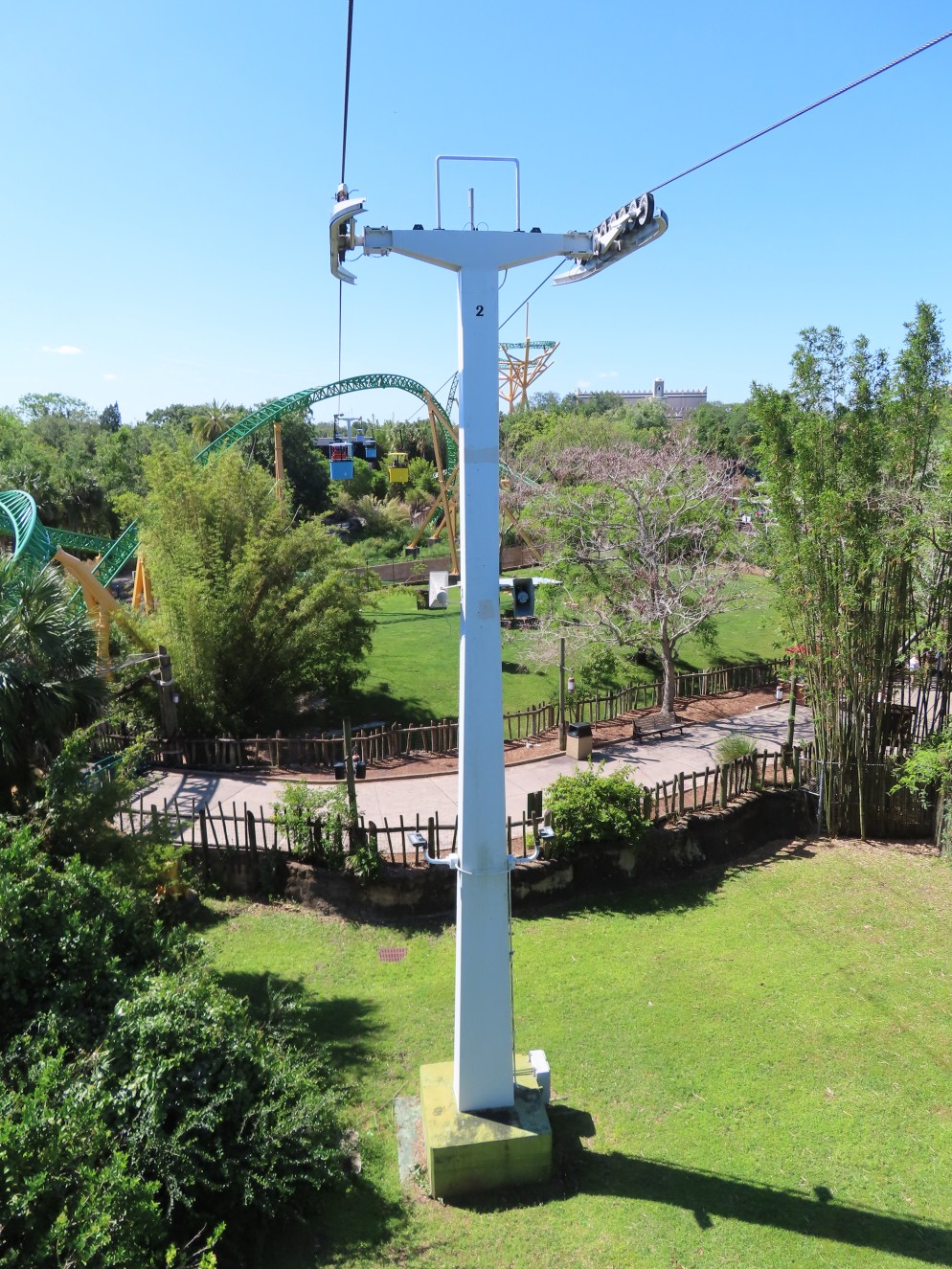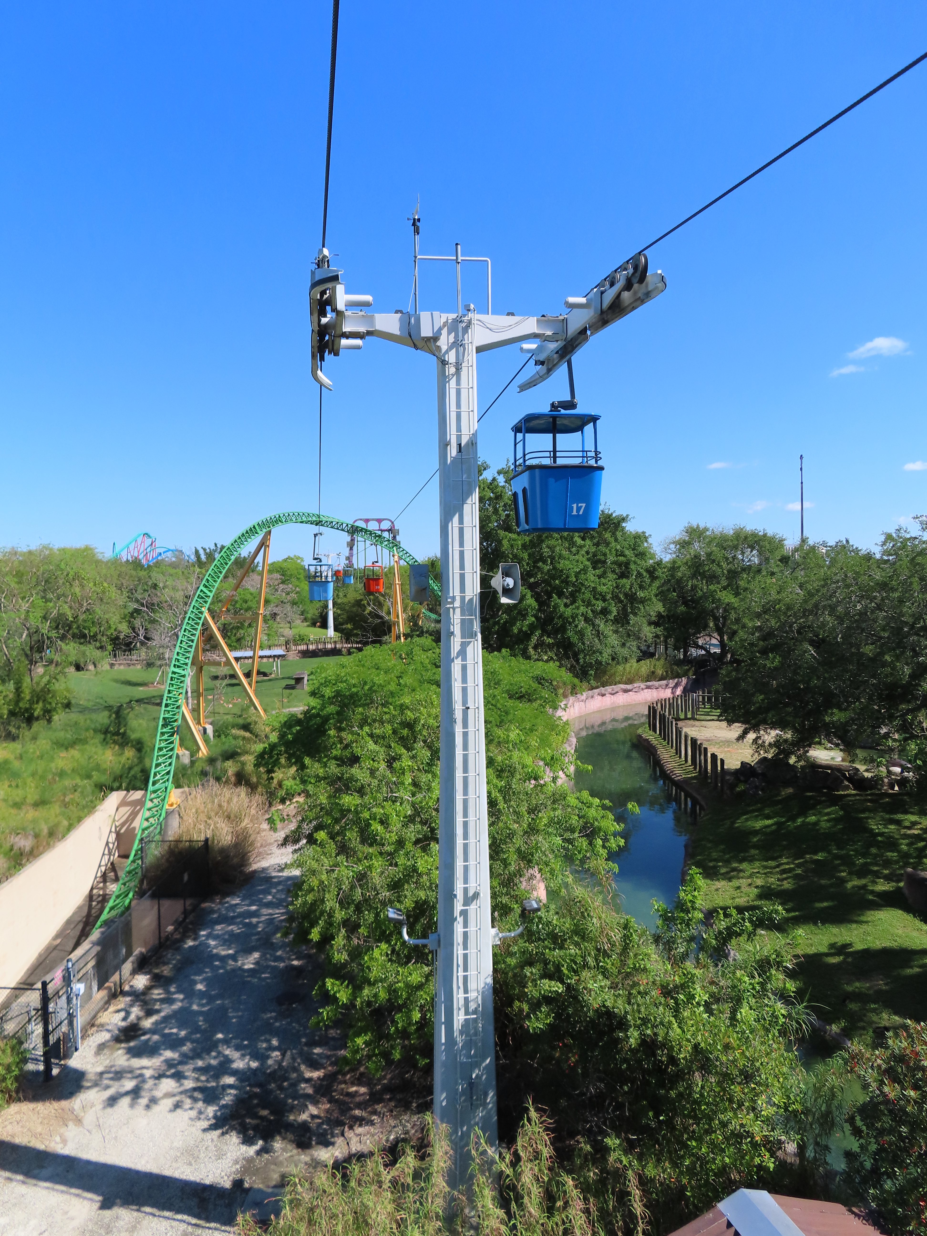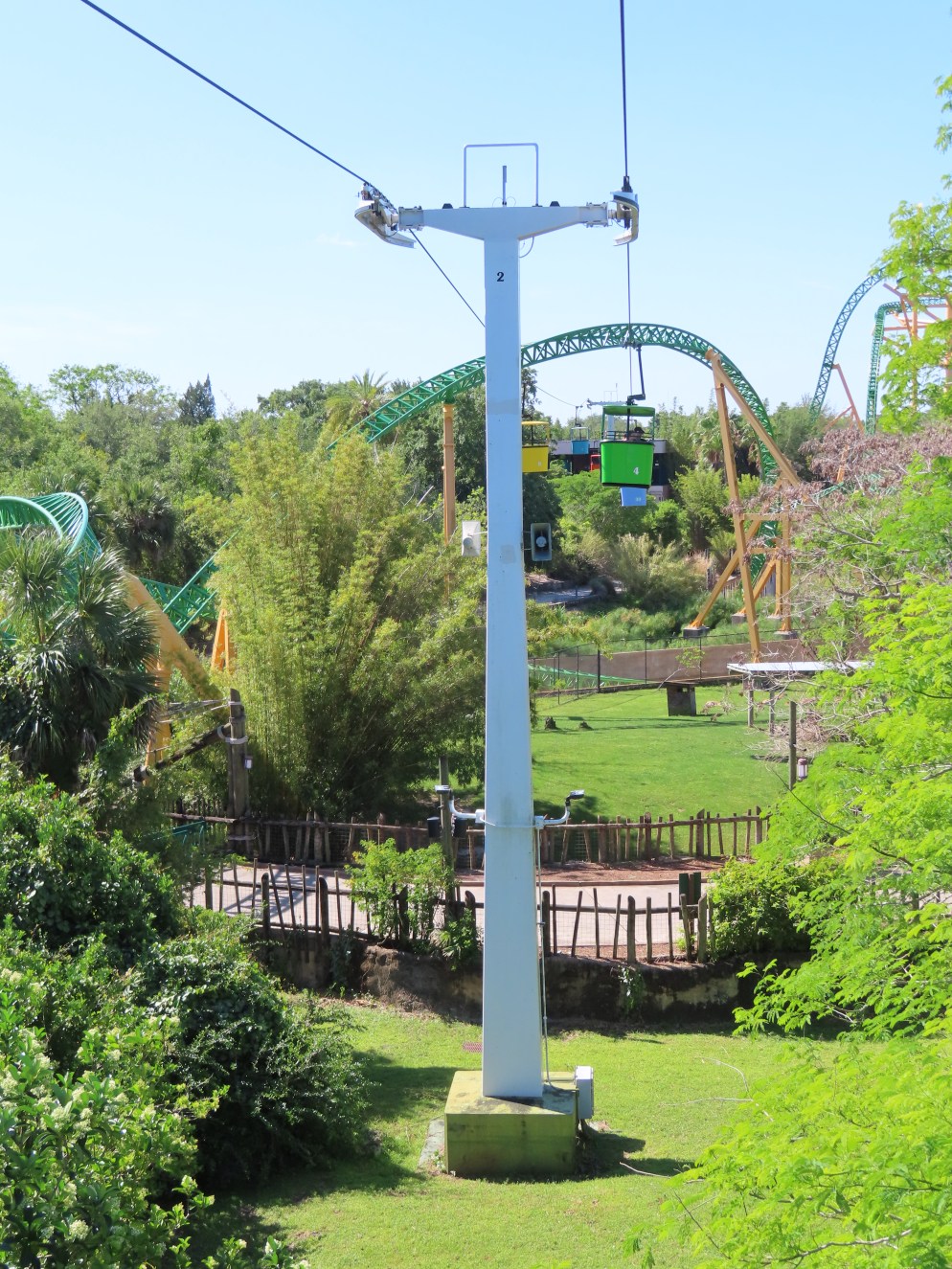 This two section VonRoll sky ride opened at Busch Gardens in 1974.The drive station above the Cheetah Hunt roller coaster station.The roller coaster that starts below the sky ride passes over and under it between towers 1 and 2.Combination Cheetah Hunt and Sky Ride station.Tower 2.The ride passes beside numerous other rides and attractions.A turn station between towers 5 and 6 does not allow loading or unloading.The angle sharp station.The haul rope is deflected by three horizontal bullwheels in this station.Middle section of the shorter Jungala segment.Tower 6.View riding toward Jungala Station.Tower 7.A grip passing through a sheave assembly.Support tower 8.Another view of T8.Arriving at Jungala.Return bullwheel with counterweight tensioning.A cabin leaving the return station.A cabin in the Jungala station.As of 2024, this ride costs $5 each way.A cabin passing tower 7.Arriving at the turn station from Jungala.Leaving the angle station headed toward Egypt.A cabin on the line with a new roller coaster under construction.Side view of a VonRoll carrier.Tower 2.The Cheetah Hunt crossover.Arriving at the drive terminal.Deceleration zone at the drive.Another view of the angle station.Cabins here turn more than 90 degrees.Tower 6.A tall tower mid line.Roller coaster train passing below the gondola.Cabins out on the line.Side view of a lift tower.Cabins on the shorter segment.Another view of Jungala station.Tower 8.
