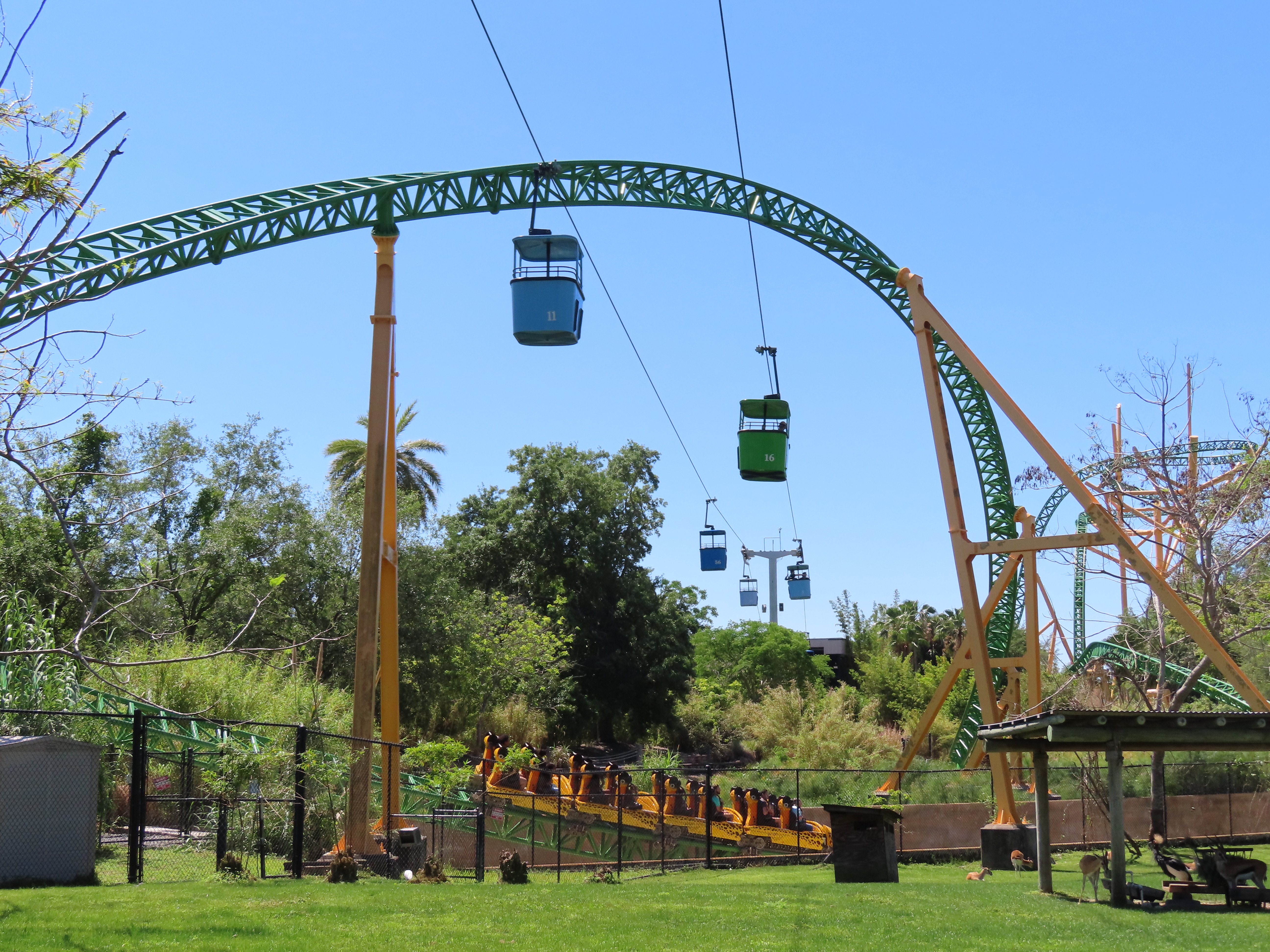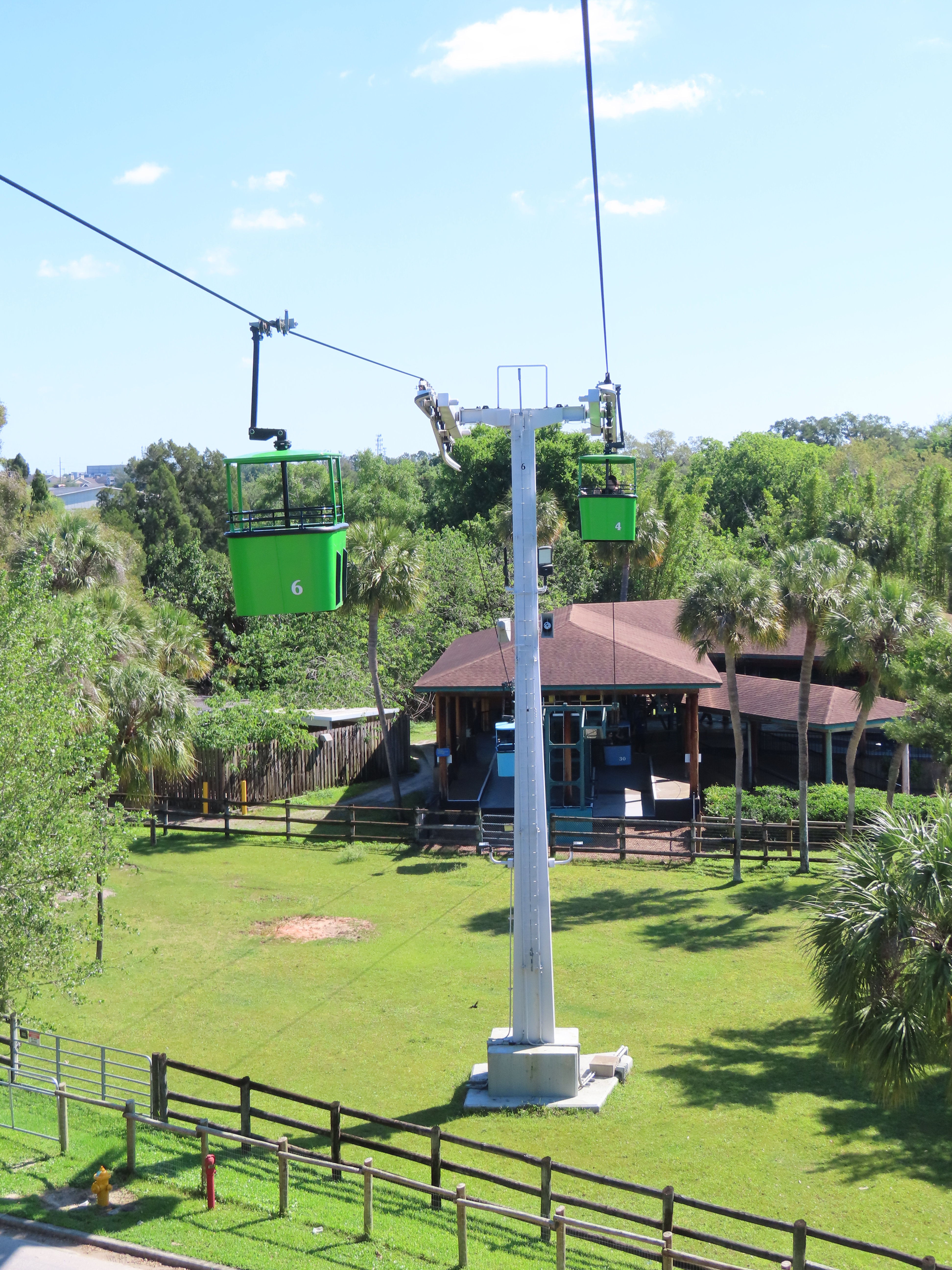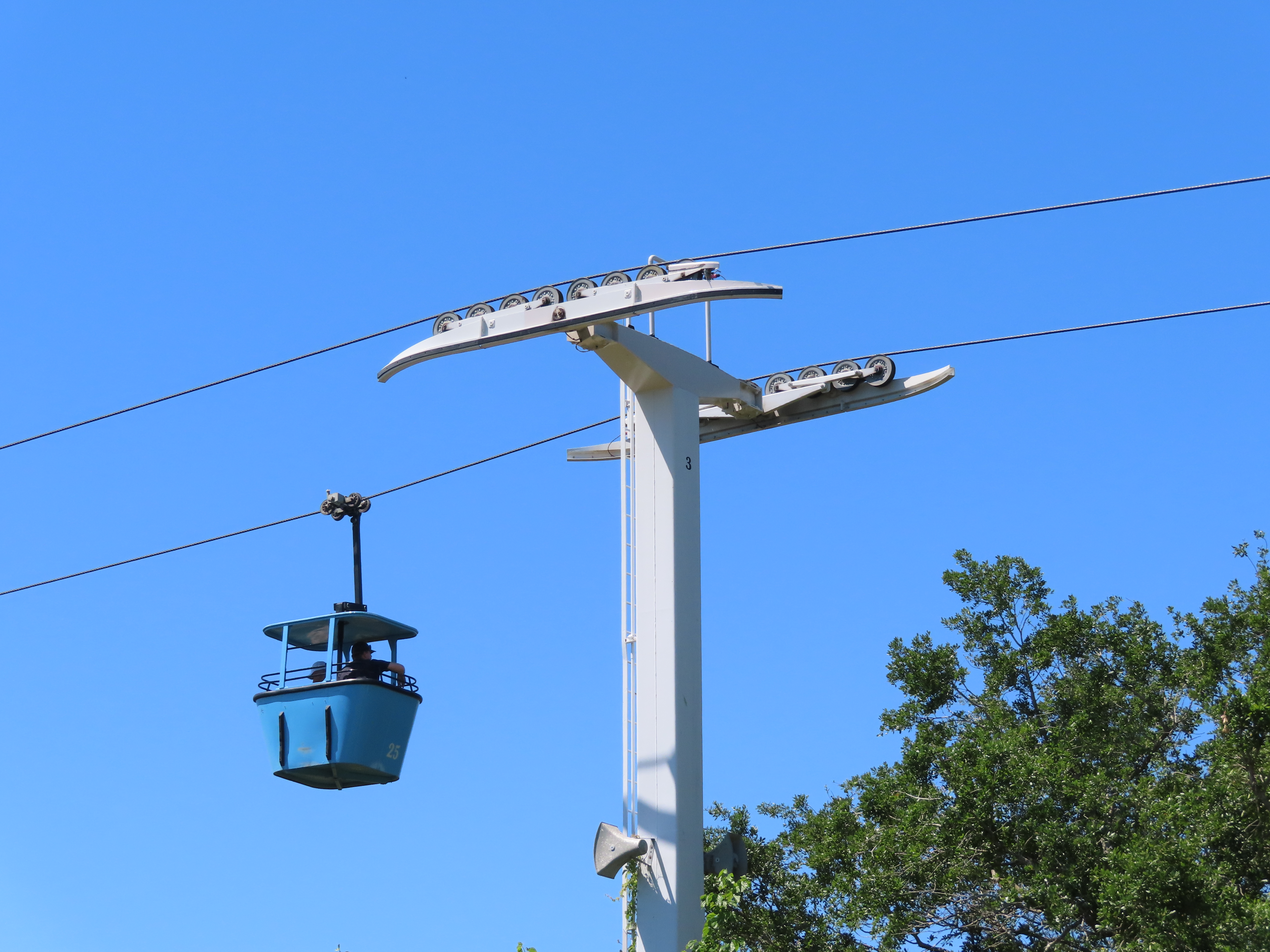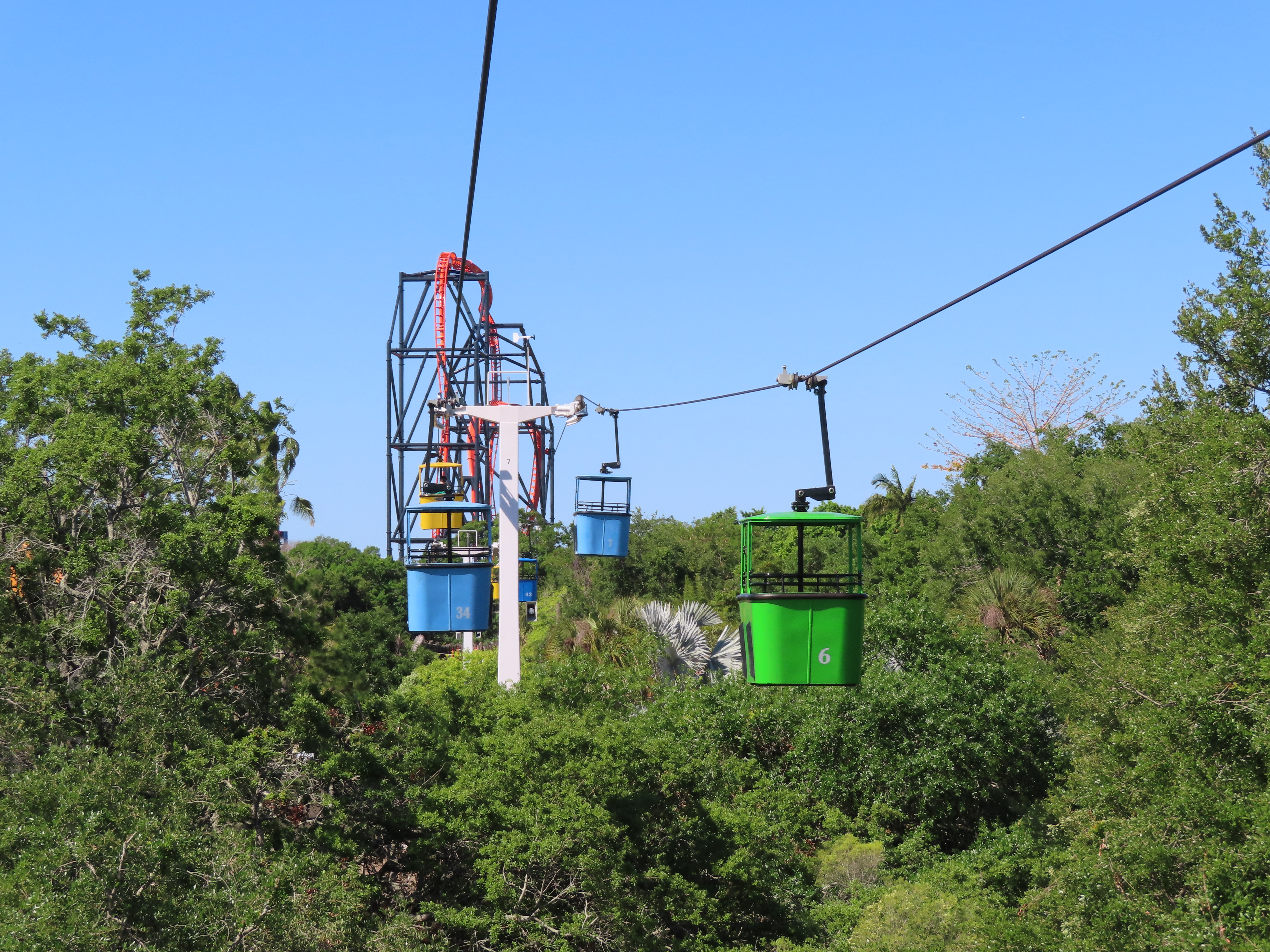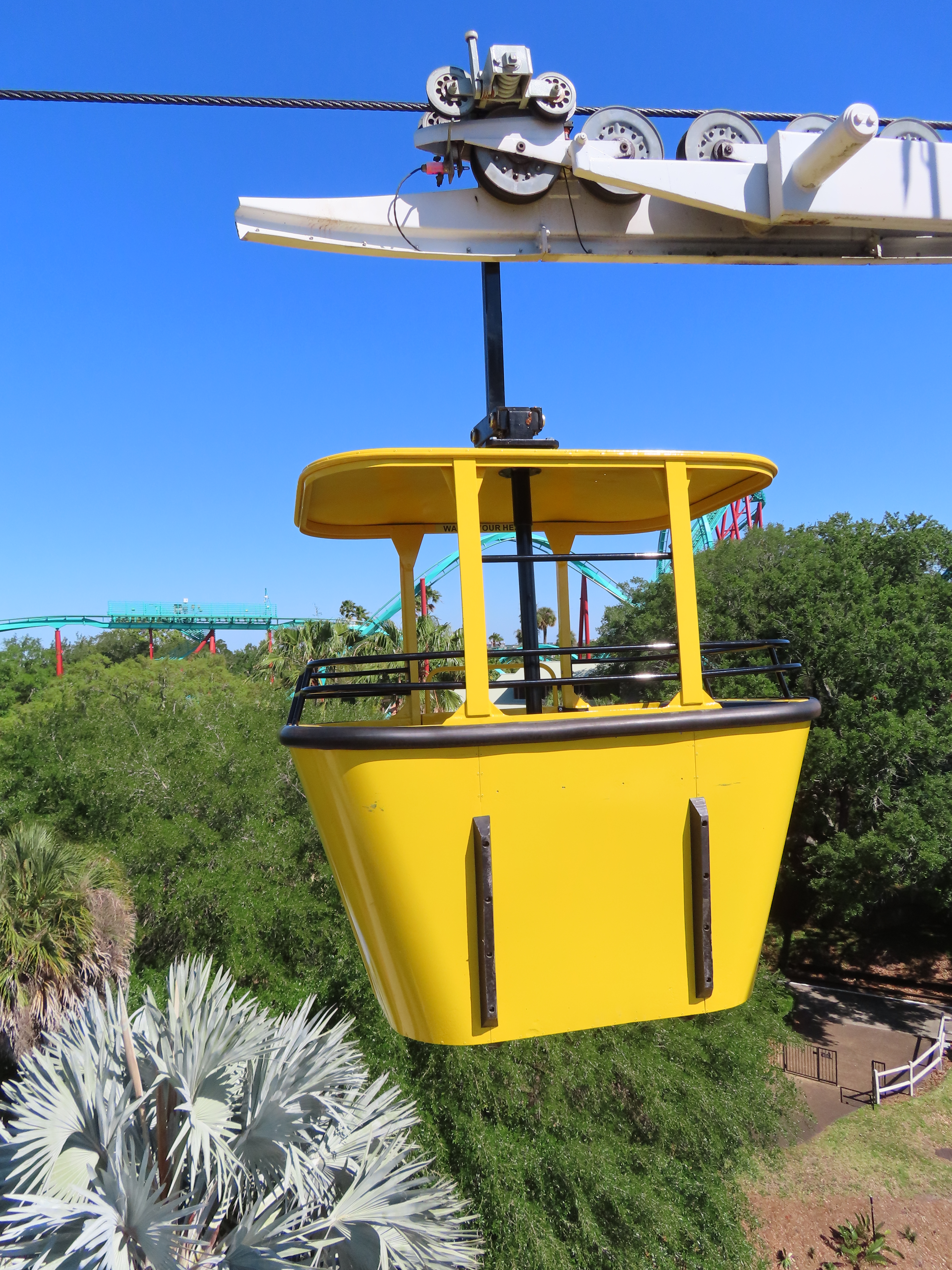 This two section VonRoll sky ride opened at Busch Gardens in 1974.The drive station above the Cheetah Hunt roller coaster station.The roller coaster that starts below the sky ride passes over and under it between towers 1 and 2.Combination Cheetah Hunt and Sky Ride station.Tower 2.The ride passes beside numerous other rides and attractions.A turn station between towers 5 and 6 does not allow loading or unloading.The angle sharp station.The haul rope is deflected by three horizontal bullwheels in this station.Middle section of the shorter Jungala segment.Tower 6.View riding toward Jungala Station.Tower 7.A grip passing through a sheave assembly.Support tower 8.Another view of T8.Arriving at Jungala.Return bullwheel with counterweight tensioning.A cabin leaving the return station.A cabin in the Jungala station.As of 2024, this ride costs $5 each way.A cabin passing tower 7.Arriving at the turn station from Jungala.Leaving the angle station headed toward Egypt.A cabin on the line with a new roller coaster under construction.Side view of a VonRoll carrier.Tower 2.The Cheetah Hunt crossover.Arriving at the drive terminal.Deceleration zone at the drive.Another view of the angle station.Cabins here turn more than 90 degrees.Tower 6.A tall tower mid line.Roller coaster train passing below the gondola.Cabins out on the line.Side view of a lift tower.Cabins on the shorter segment.Another view of Jungala station.Tower 8.