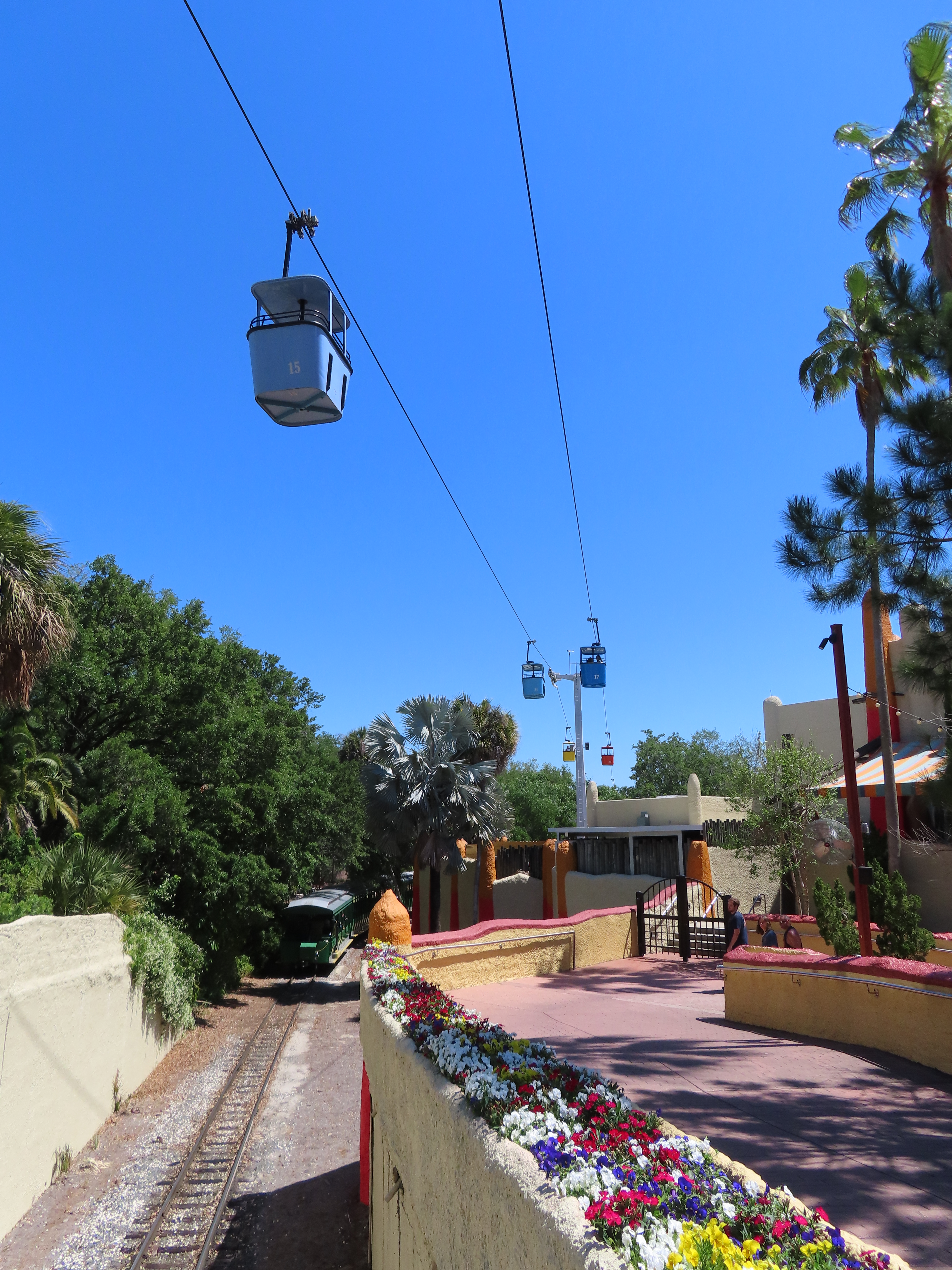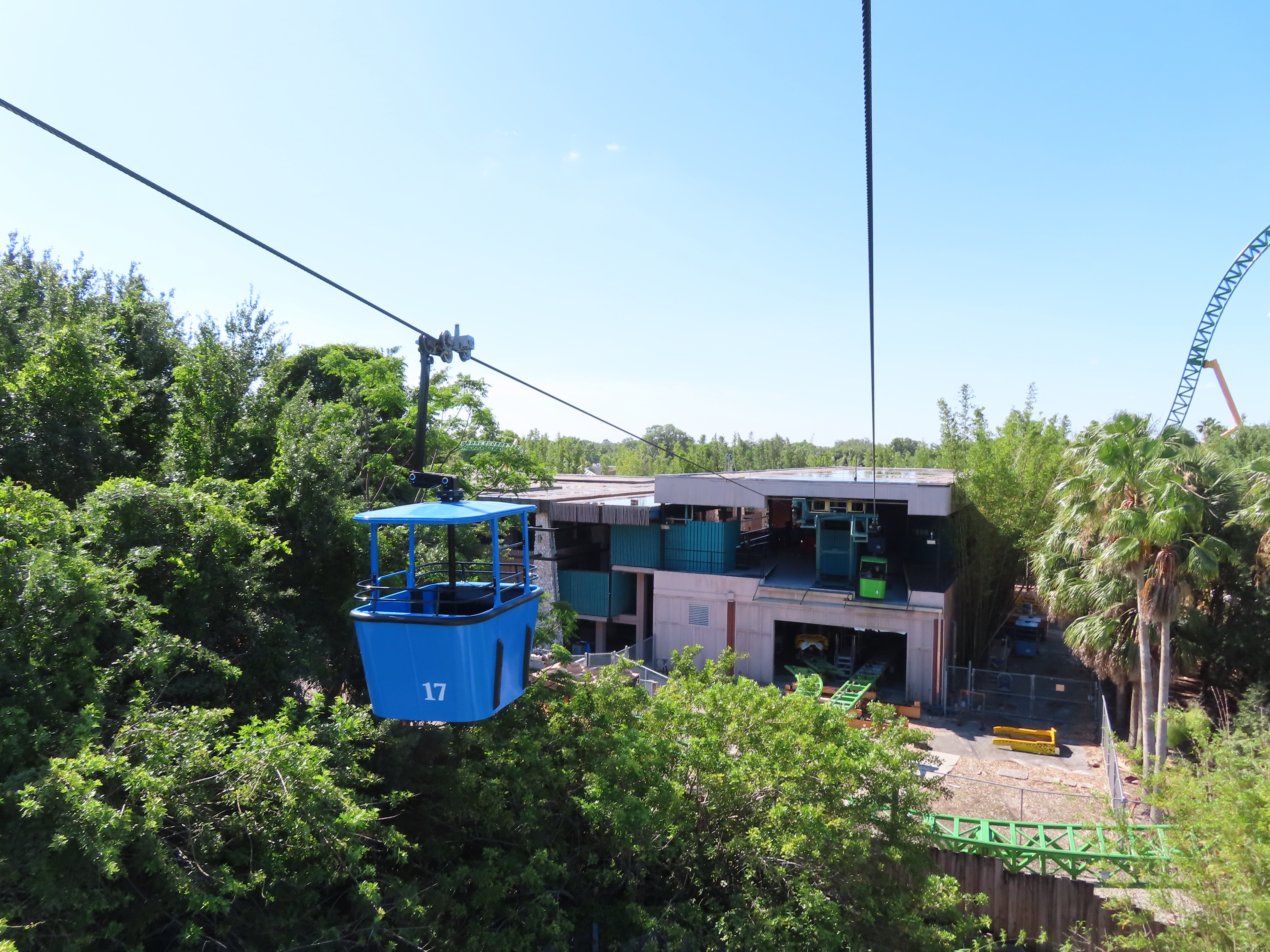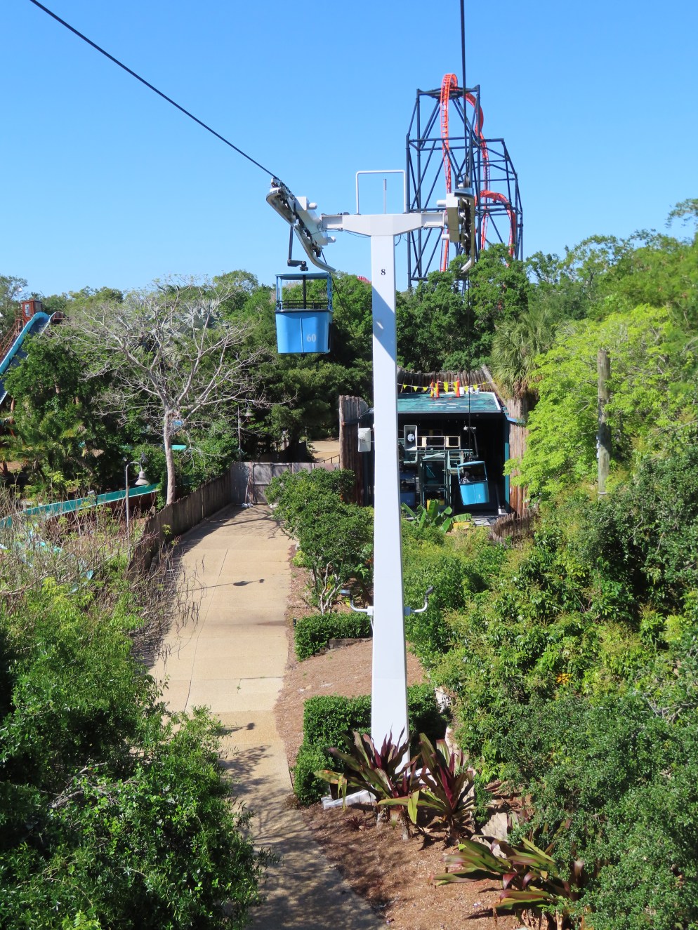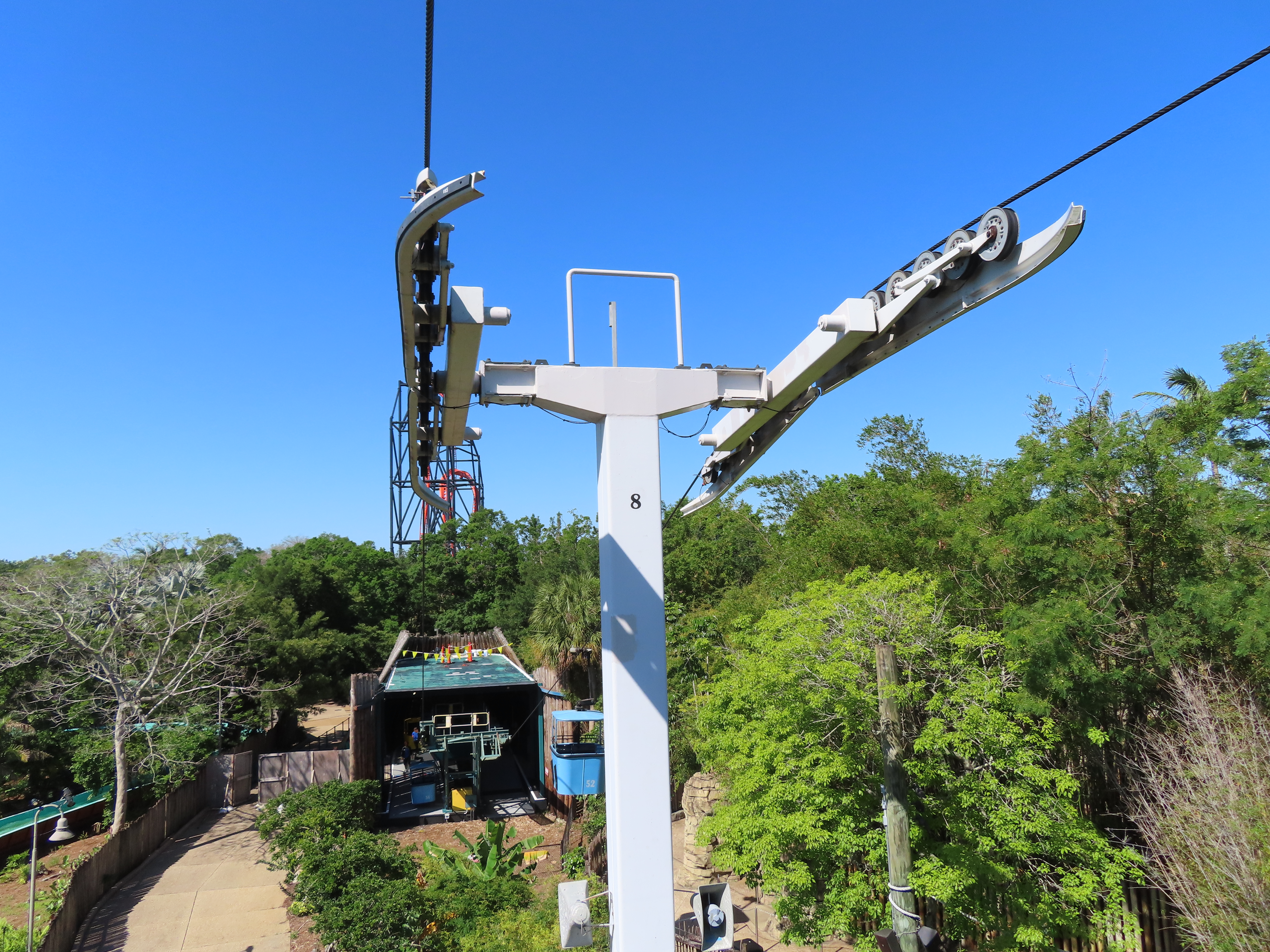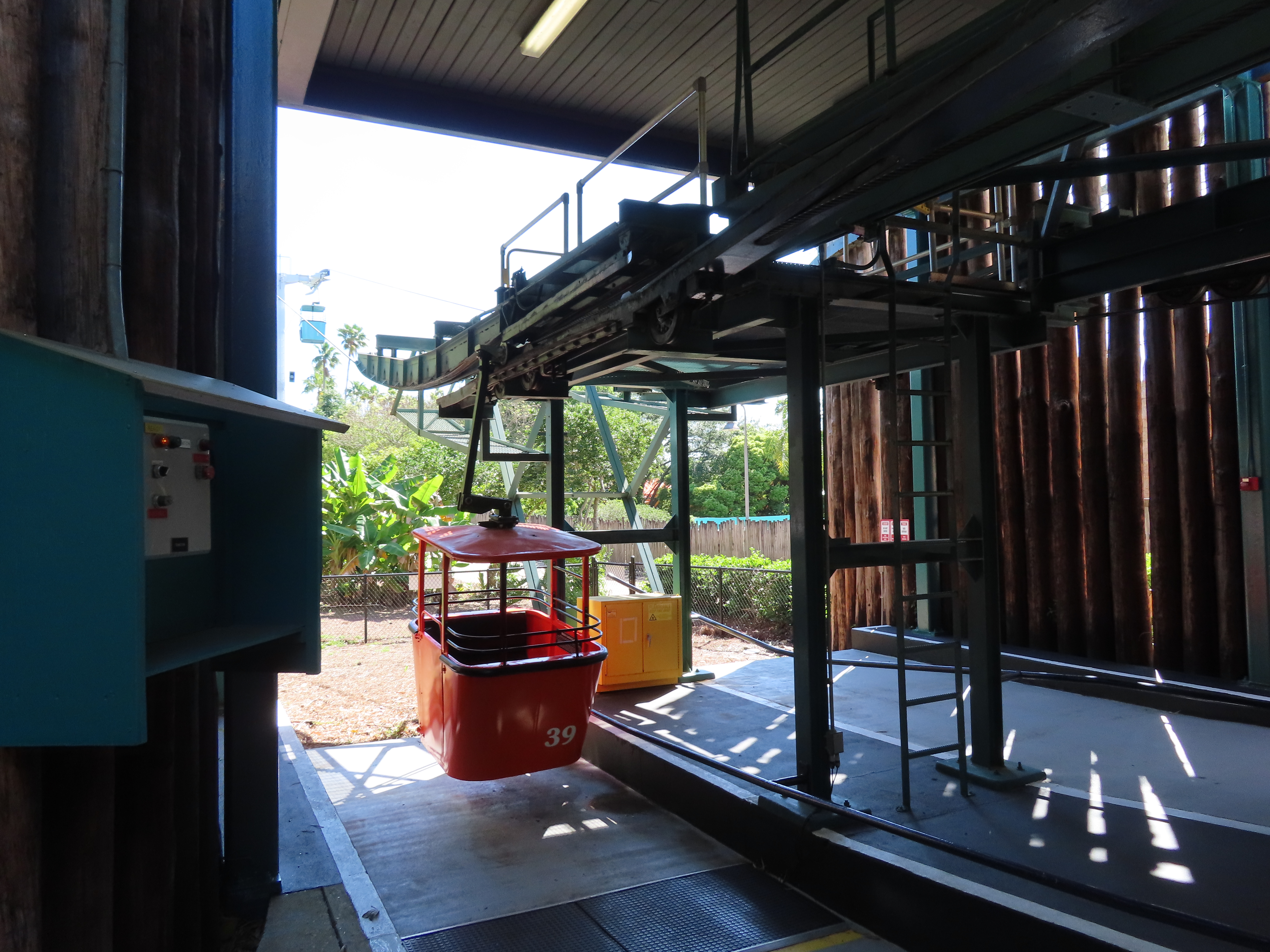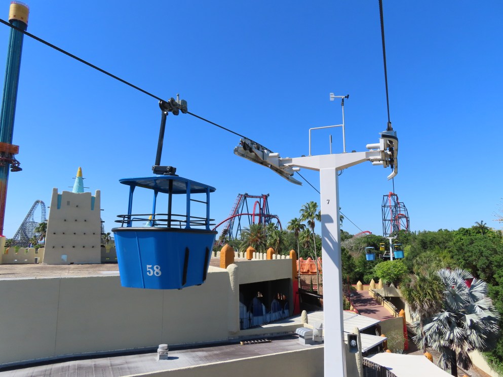 This two section VonRoll sky ride opened at Busch Gardens in 1974.The drive station above the Cheetah Hunt roller coaster station.The roller coaster that starts below the sky ride passes over and under it between towers 1 and 2.Combination Cheetah Hunt and Sky Ride station.Tower 2.The ride passes beside numerous other rides and attractions.A turn station between towers 5 and 6 does not allow loading or unloading.The angle sharp station.The haul rope is deflected by three horizontal bullwheels in this station.Middle section of the shorter Jungala segment.Tower 6.View riding toward Jungala Station.Tower 7.A grip passing through a sheave assembly.Support tower 8.Another view of T8.Arriving at Jungala.Return bullwheel with counterweight tensioning.A cabin leaving the return station.A cabin in the Jungala station.As of 2024, this ride costs $5 each way.A cabin passing tower 7.Arriving at the turn station from Jungala.Leaving the angle station headed toward Egypt.A cabin on the line with a new roller coaster under construction.Side view of a VonRoll carrier.Tower 2.The Cheetah Hunt crossover.Arriving at the drive terminal.Deceleration zone at the drive.Another view of the angle station.Cabins here turn more than 90 degrees.Tower 6.A tall tower mid line.Roller coaster train passing below the gondola.Cabins out on the line.Side view of a lift tower.Cabins on the shorter segment.Another view of Jungala station.Tower 8.