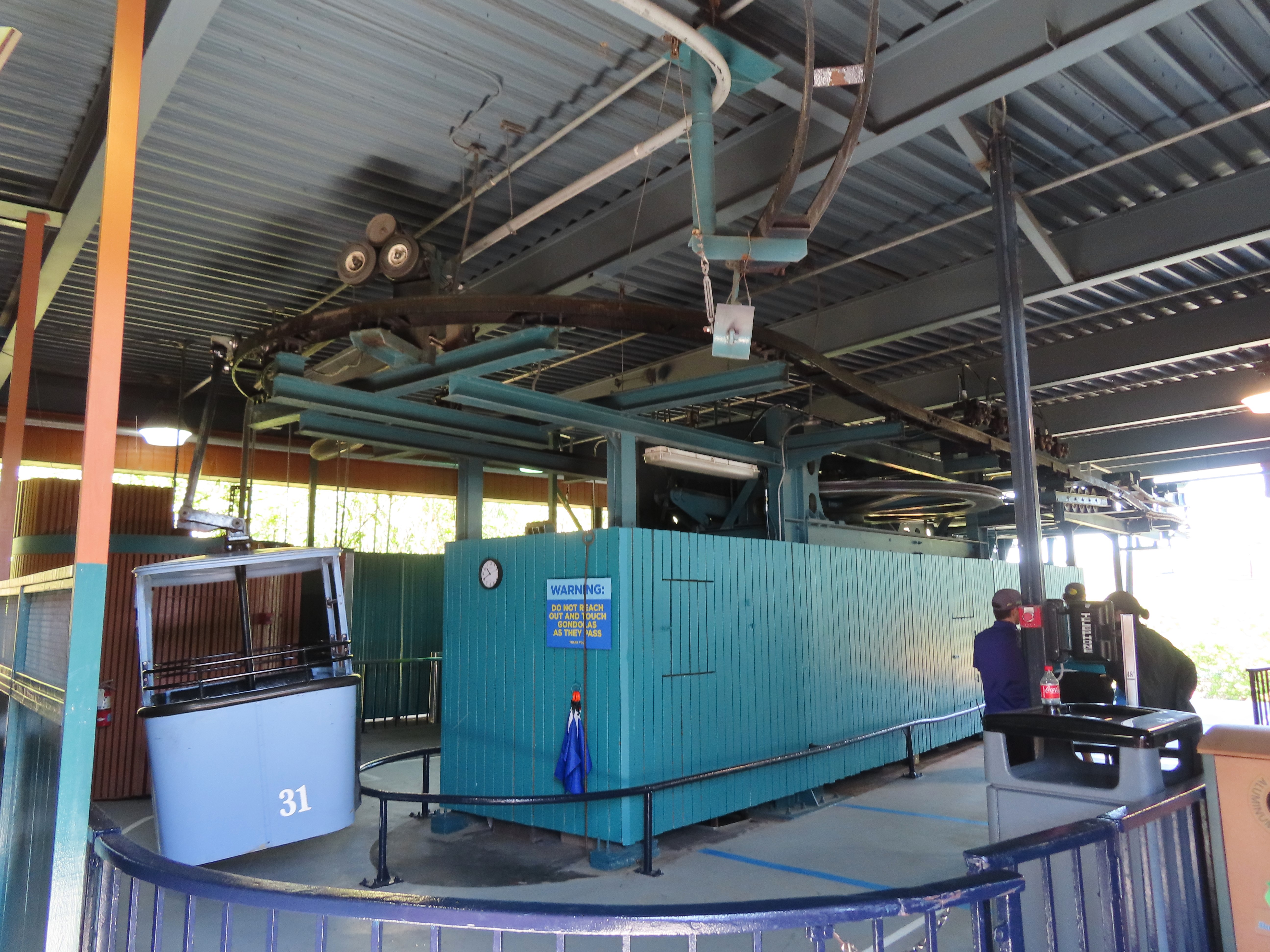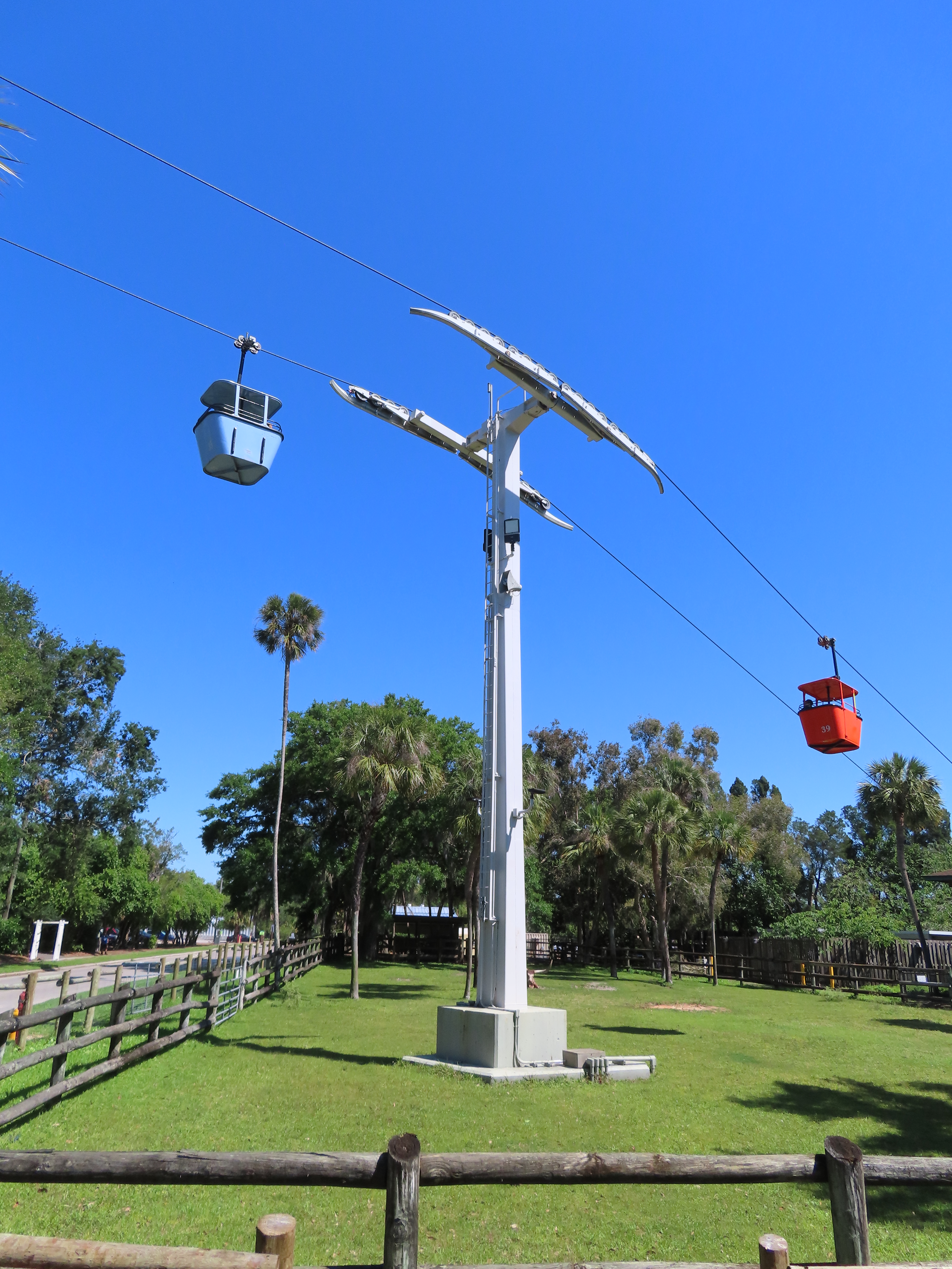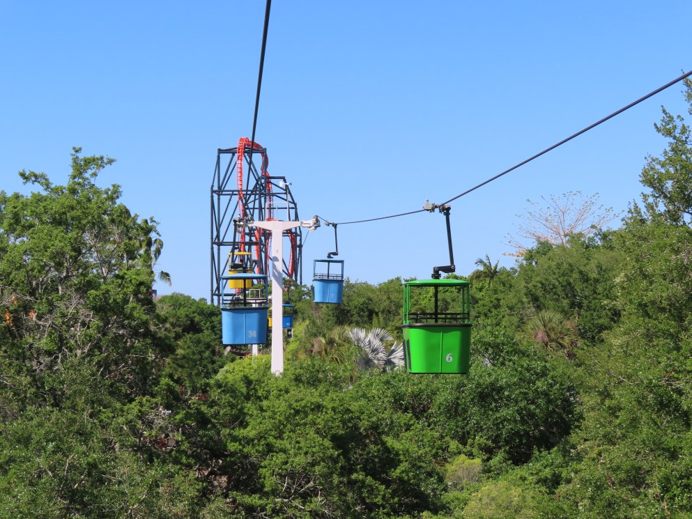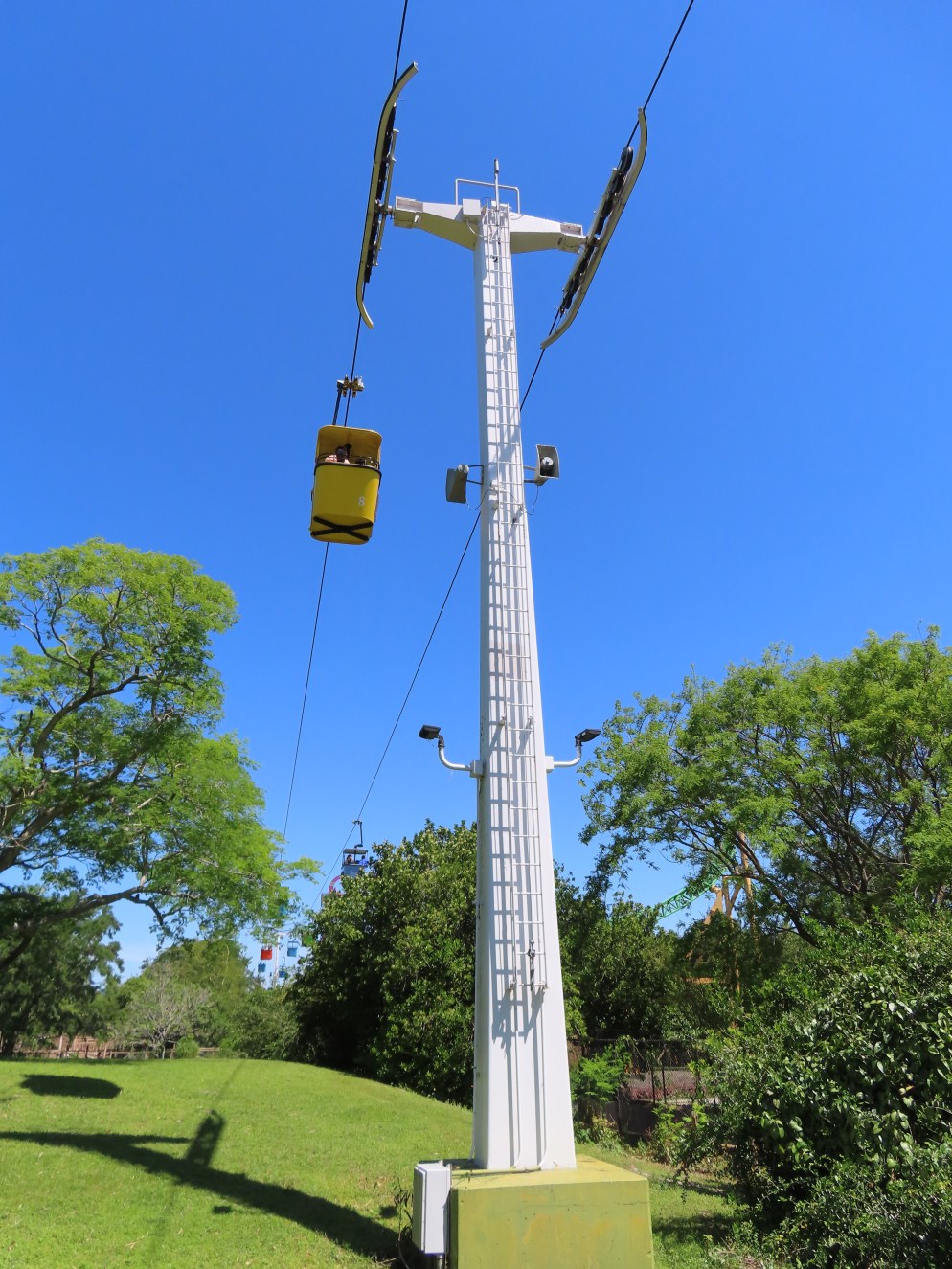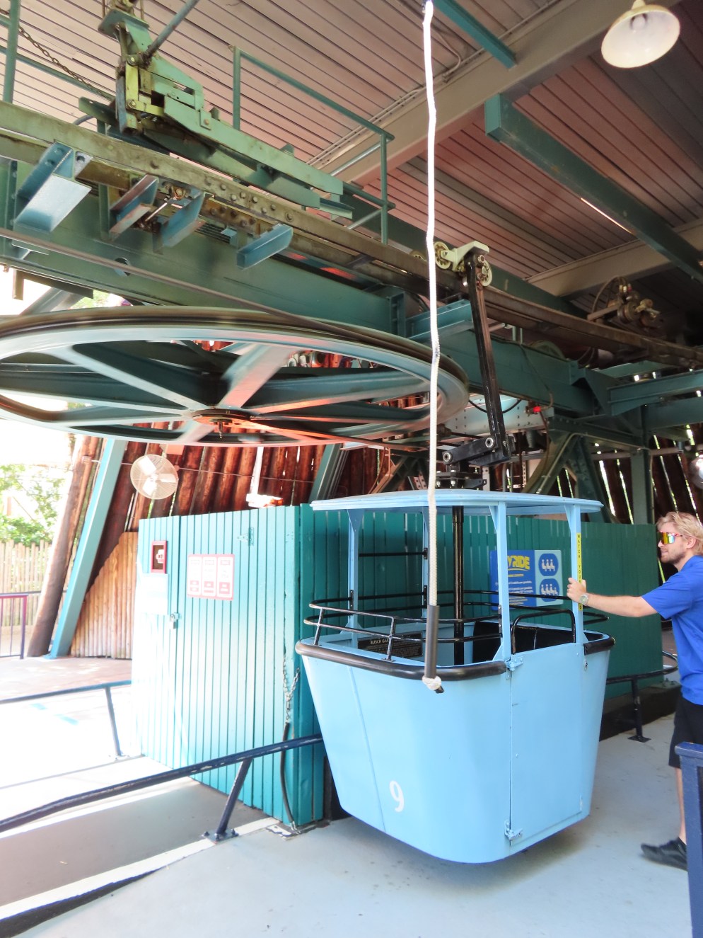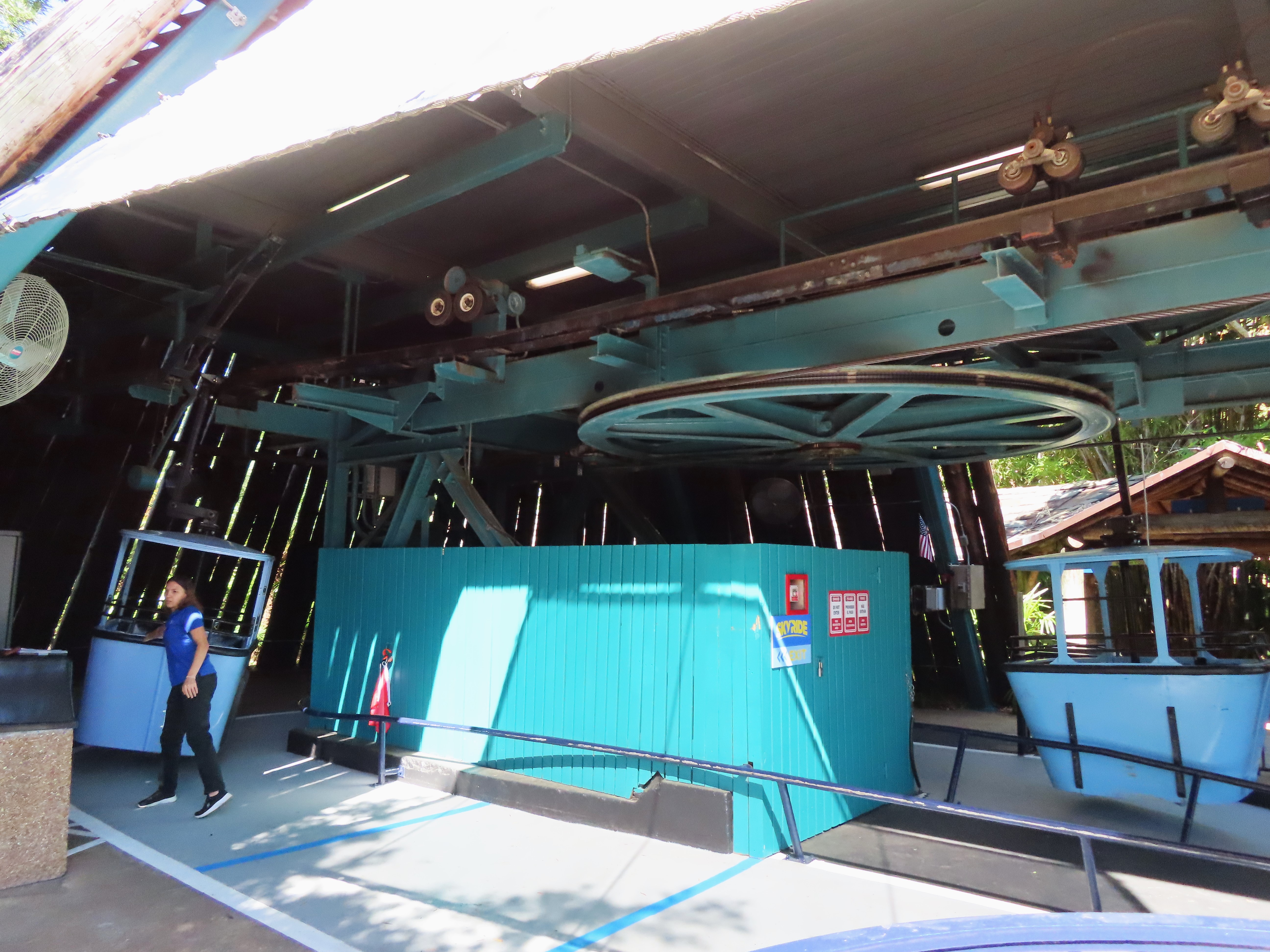 This two section VonRoll sky ride opened at Busch Gardens in 1974.The drive station above the Cheetah Hunt roller coaster station.The roller coaster that starts below the sky ride passes over and under it between towers 1 and 2.Combination Cheetah Hunt and Sky Ride station.Tower 2.The ride passes beside numerous other rides and attractions.A turn station between towers 5 and 6 does not allow loading or unloading.The angle sharp station.The haul rope is deflected by three horizontal bullwheels in this station.Middle section of the shorter Jungala segment.Tower 6.View riding toward Jungala Station.Tower 7.A grip passing through a sheave assembly.Support tower 8.Another view of T8.Arriving at Jungala.Return bullwheel with counterweight tensioning.A cabin leaving the return station.A cabin in the Jungala station.As of 2024, this ride costs $5 each way.A cabin passing tower 7.Arriving at the turn station from Jungala.Leaving the angle station headed toward Egypt.A cabin on the line with a new roller coaster under construction.Side view of a VonRoll carrier.Tower 2.The Cheetah Hunt crossover.Arriving at the drive terminal.Deceleration zone at the drive.Another view of the angle station.Cabins here turn more than 90 degrees.Tower 6.A tall tower mid line.Roller coaster train passing below the gondola.Cabins out on the line.Side view of a lift tower.Cabins on the shorter segment.Another view of Jungala station.Tower 8.