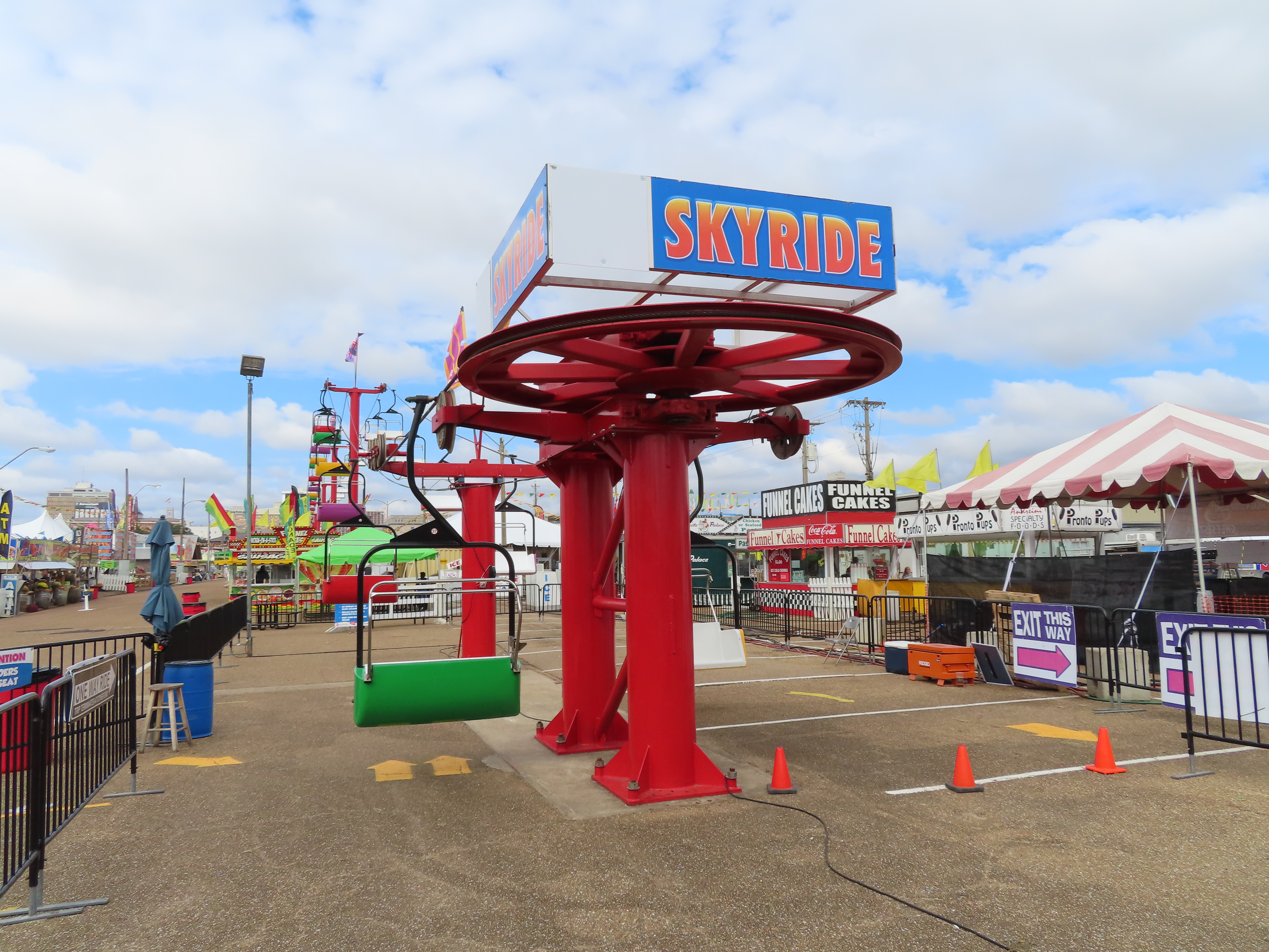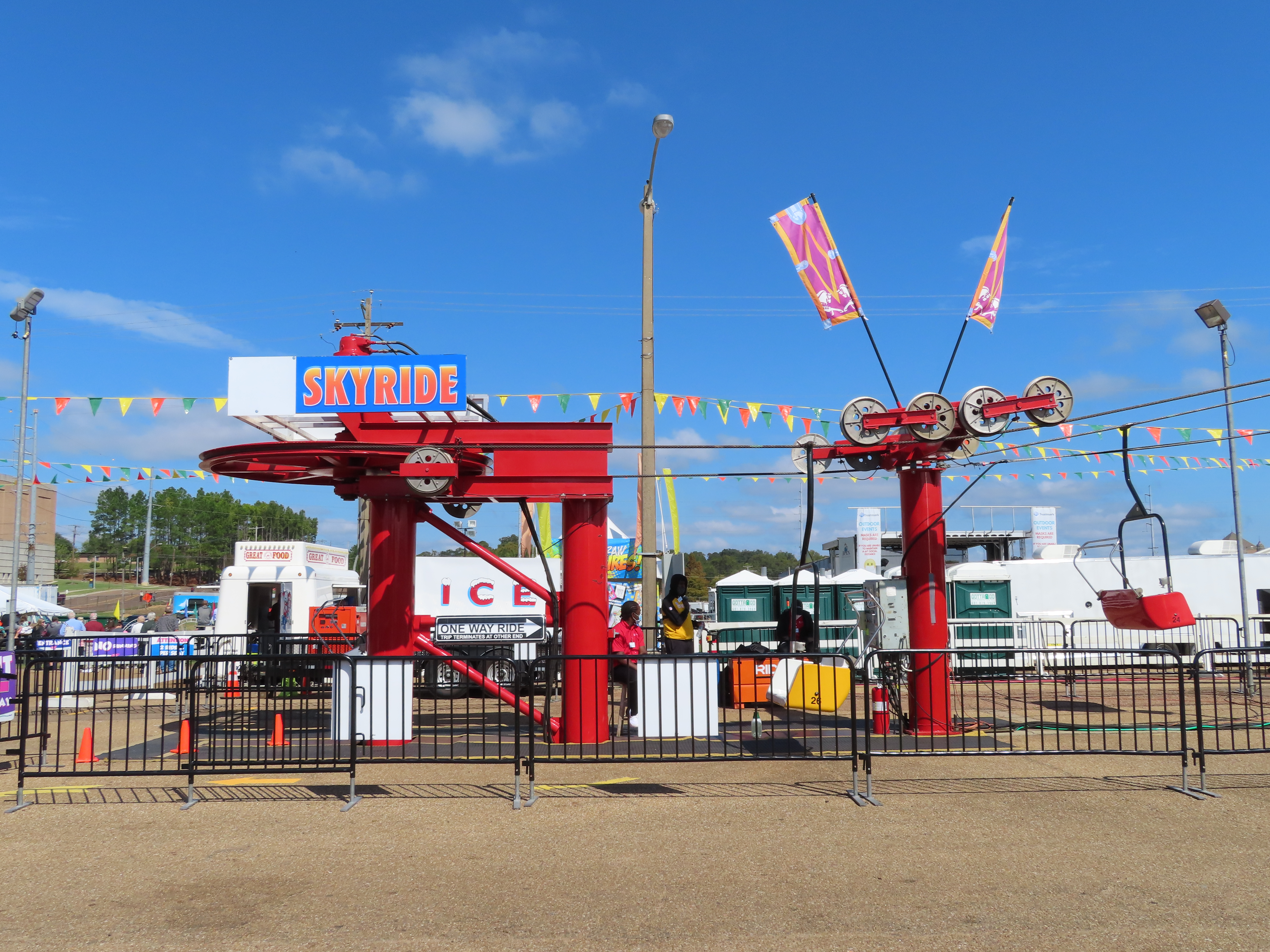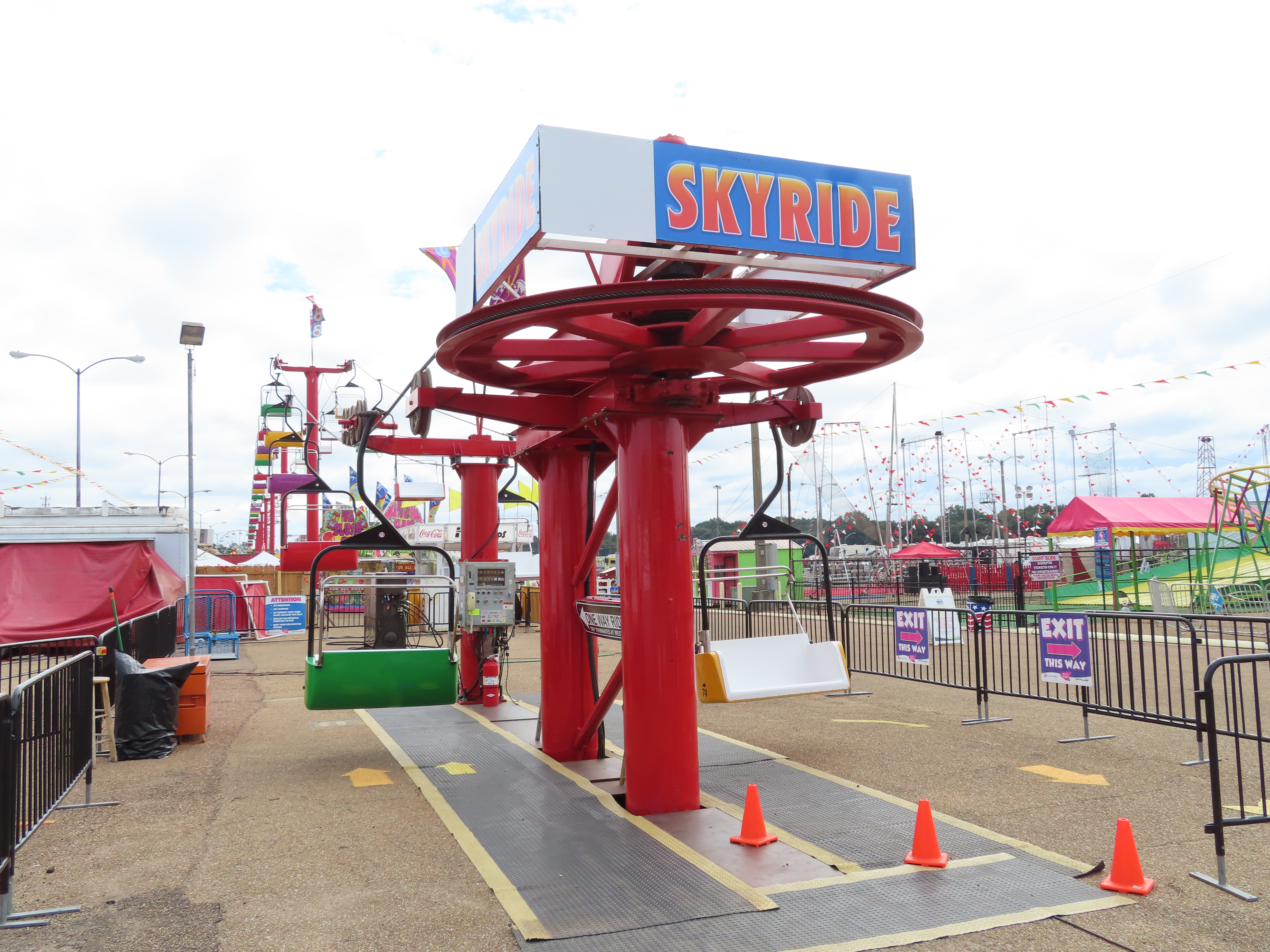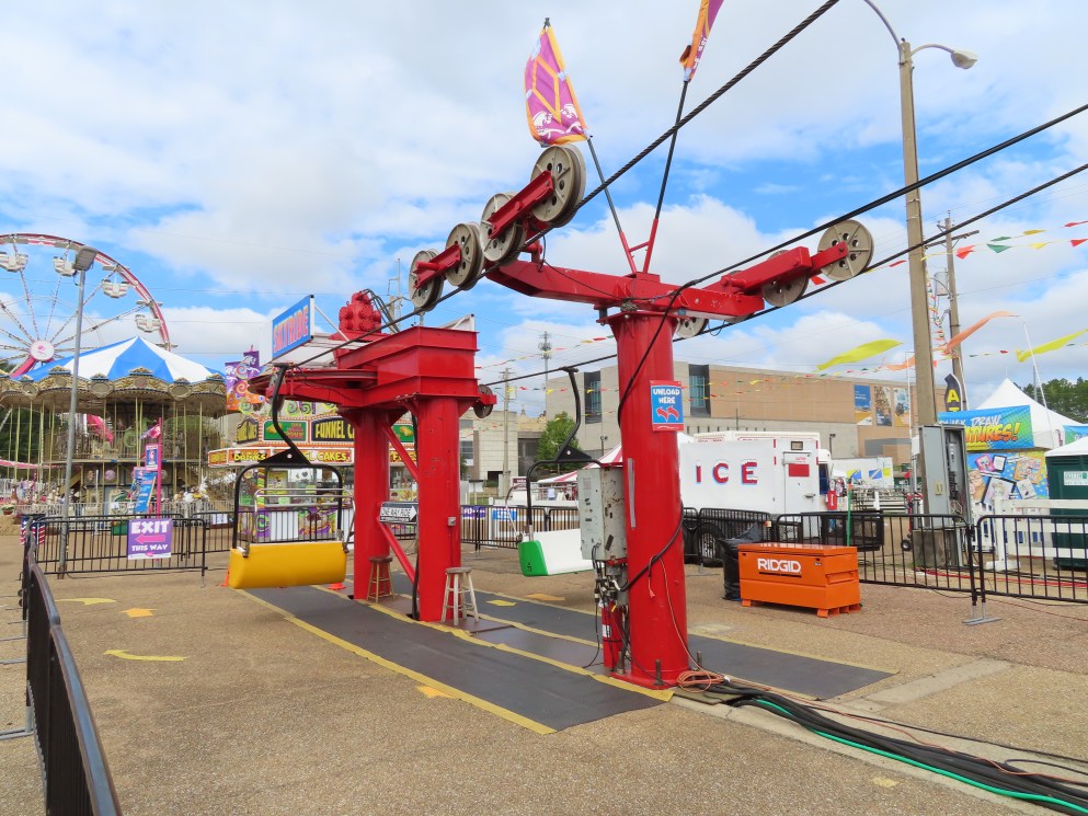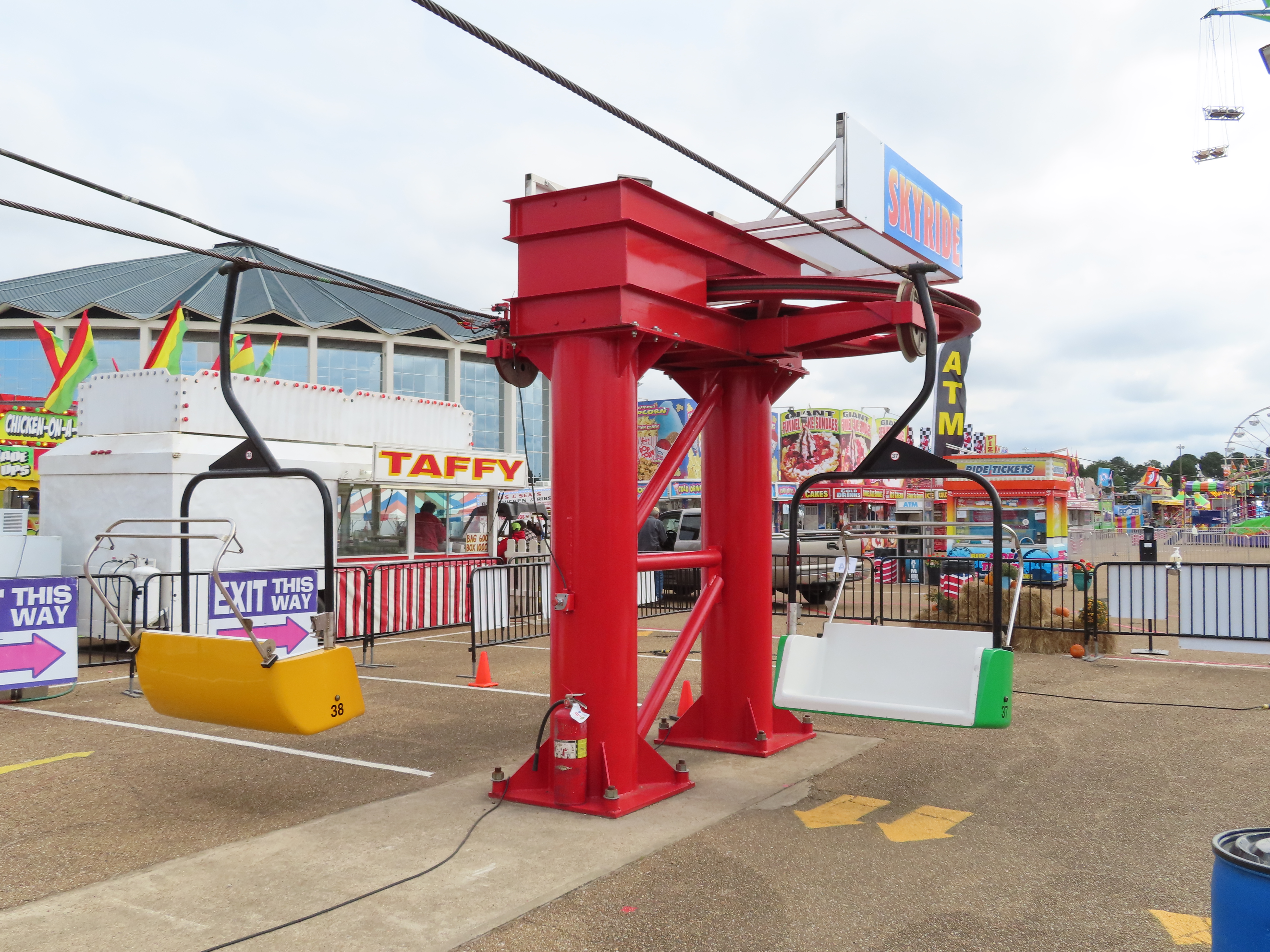 North American Midway Entertainment operates this Hopkins skyride at the Mississippi State Fair as well as the Miami-Dade County Fair and Indiana State Fair.Fixed return terminal.Tower 7.Tall towers over the midway.Tower 1 and the drive terminal.Mobile hydraulic equipment for driving the lift as well as tensioning.West loading area.Controls.Lift line overview.East loading area.Side view of the drive-tension station.These towers are moved twice every year.Tower 2.View down the line.Arriving at the drive station.Looking east.