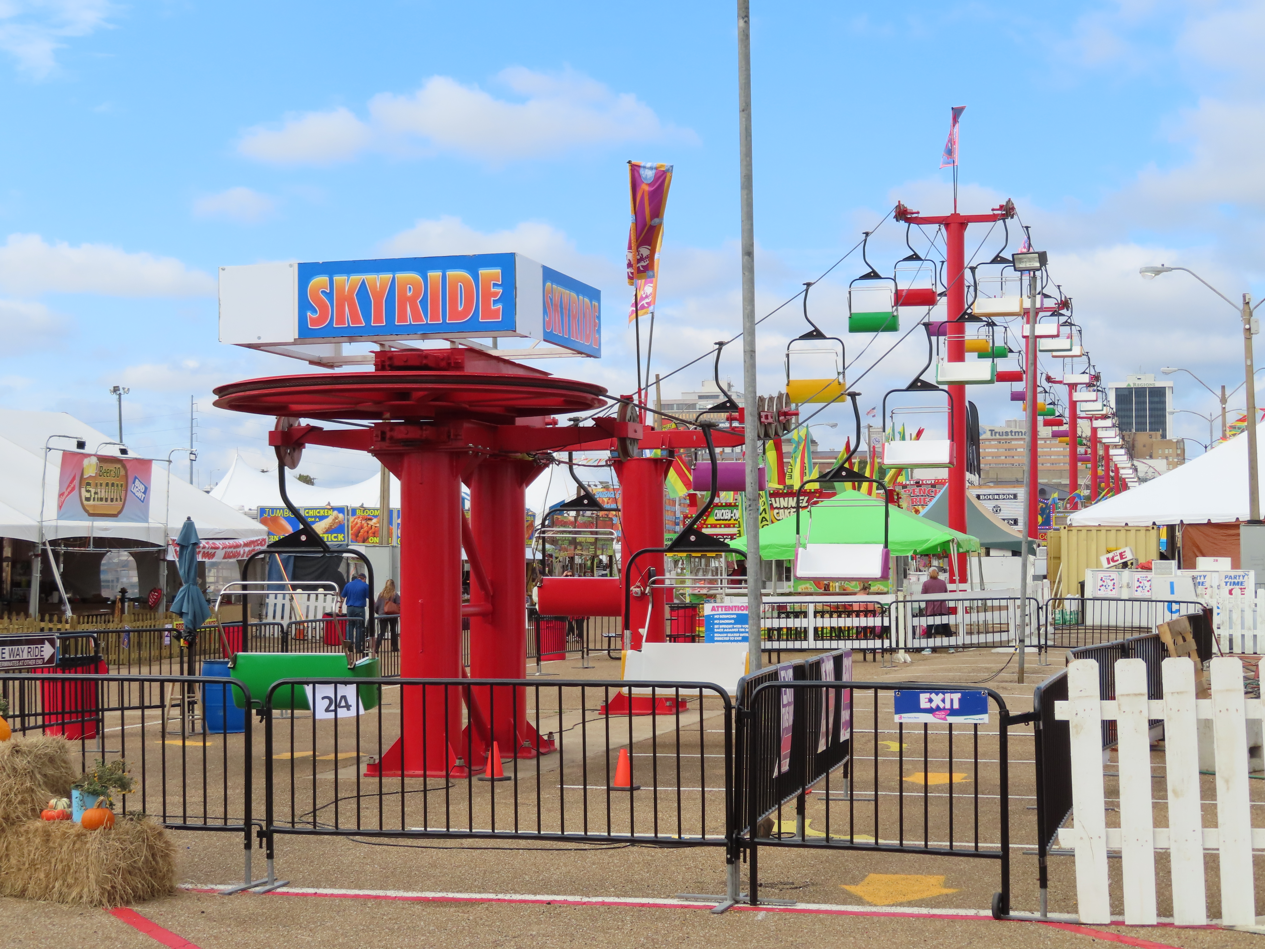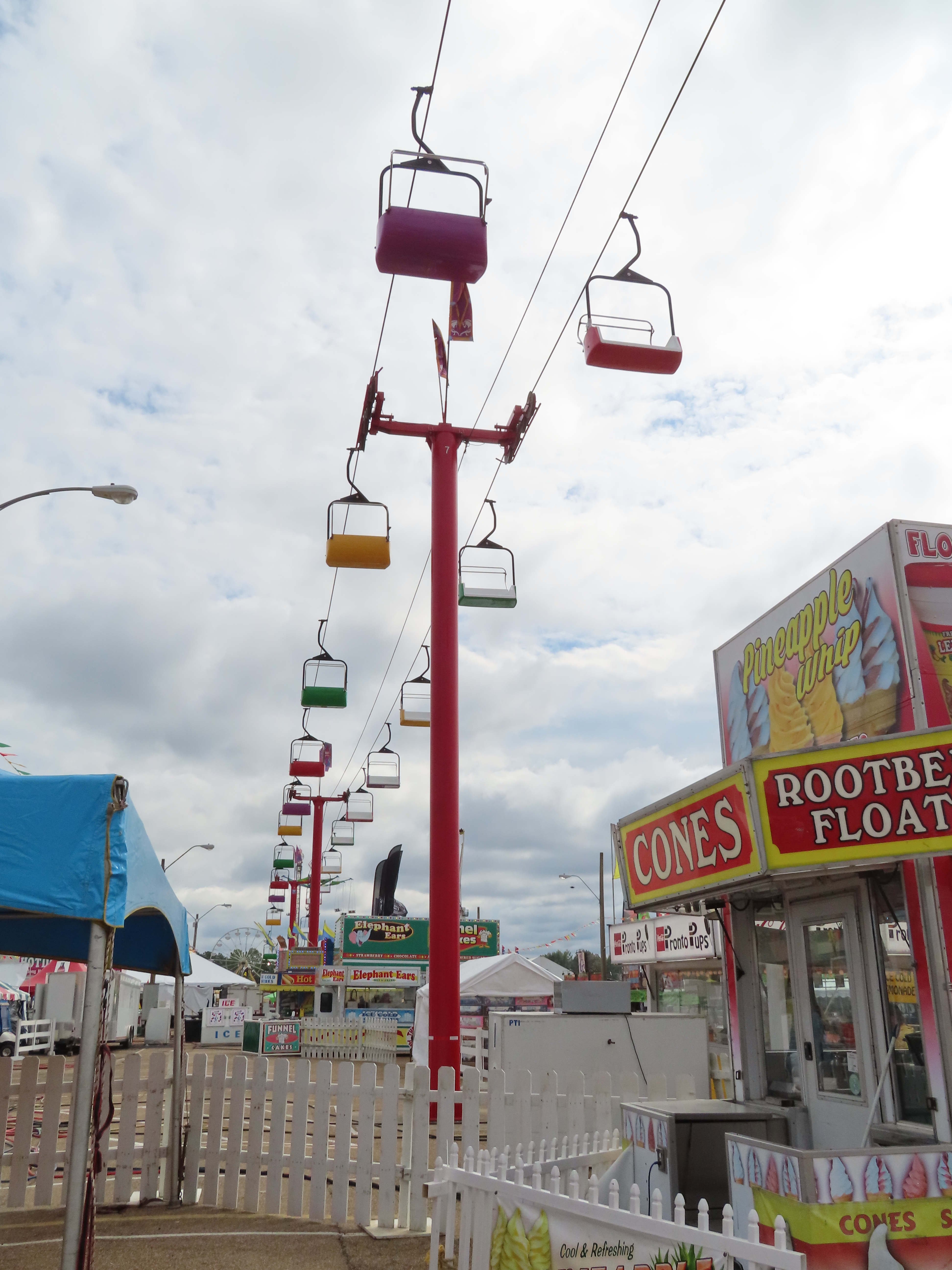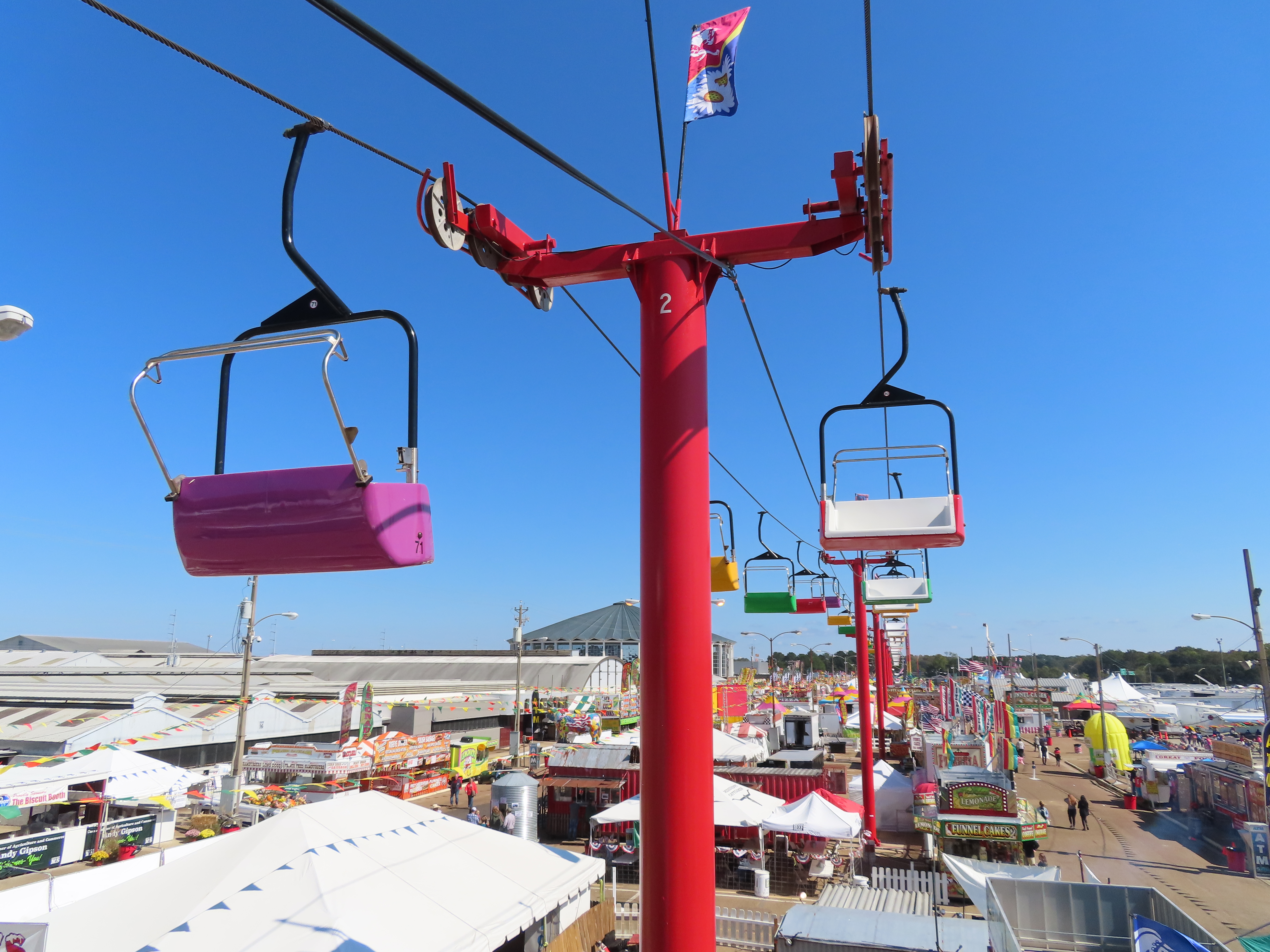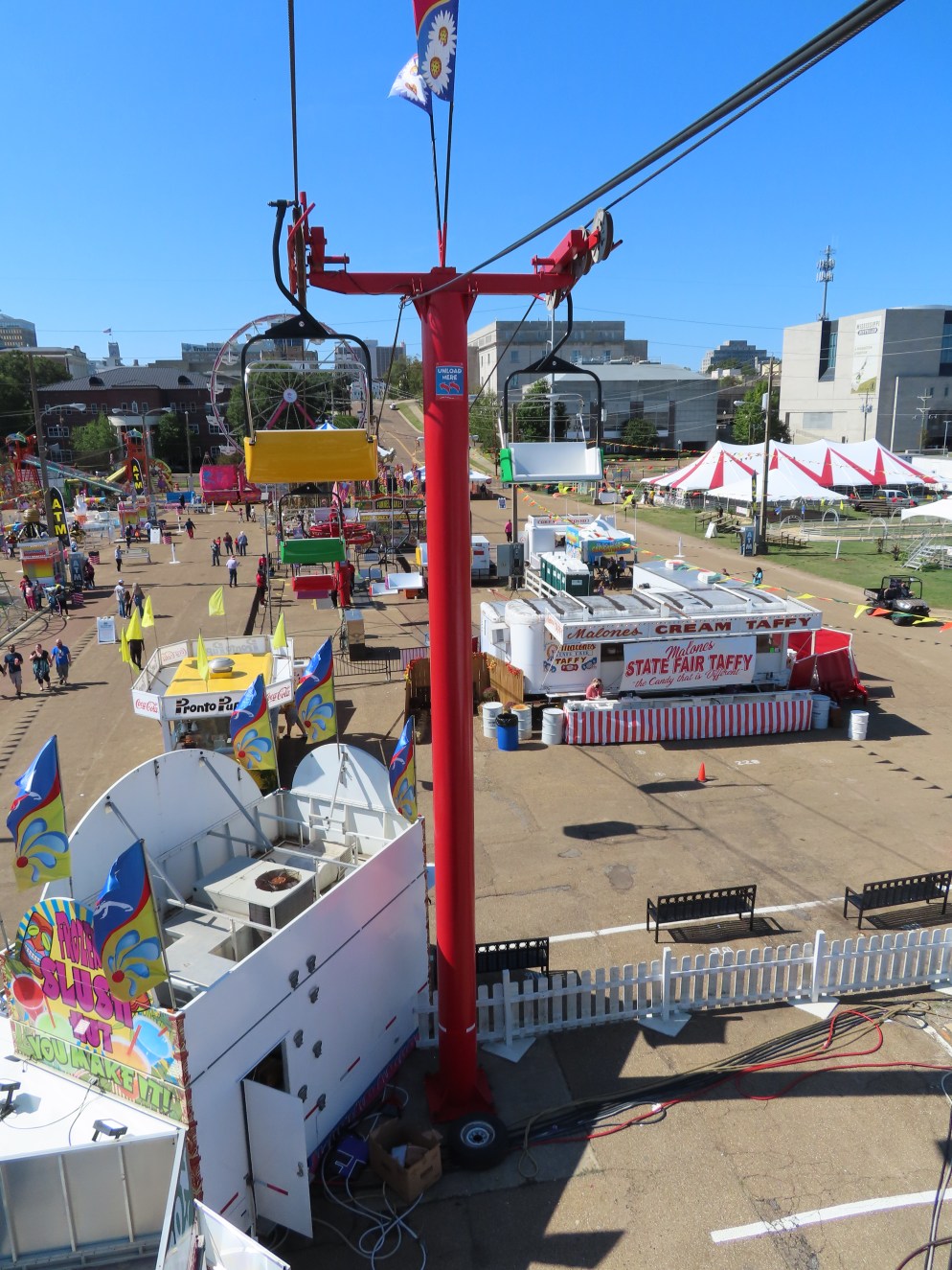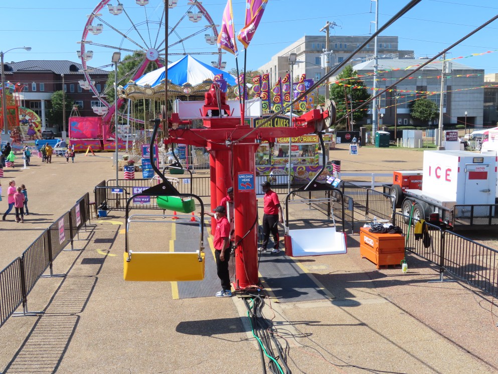 North American Midway Entertainment operates this Hopkins skyride at the Mississippi State Fair as well as the Miami-Dade County Fair and Indiana State Fair.Fixed return terminal.Tower 7.Tall towers over the midway.Tower 1 and the drive terminal.Mobile hydraulic equipment for driving the lift as well as tensioning.West loading area.Controls.Lift line overview.East loading area.Side view of the drive-tension station.These towers are moved twice every year.Tower 2.View down the line.Arriving at the drive station.Looking east.