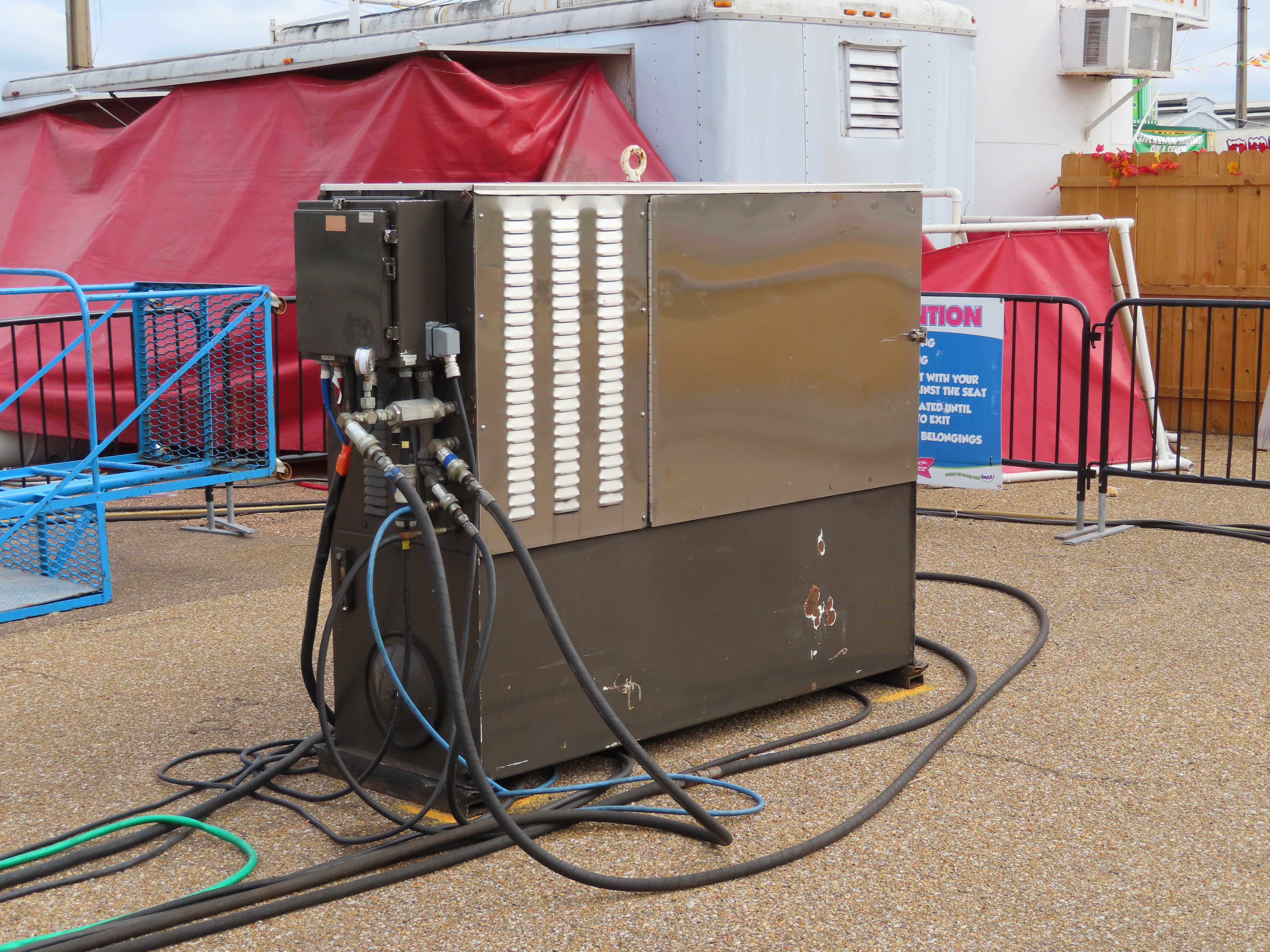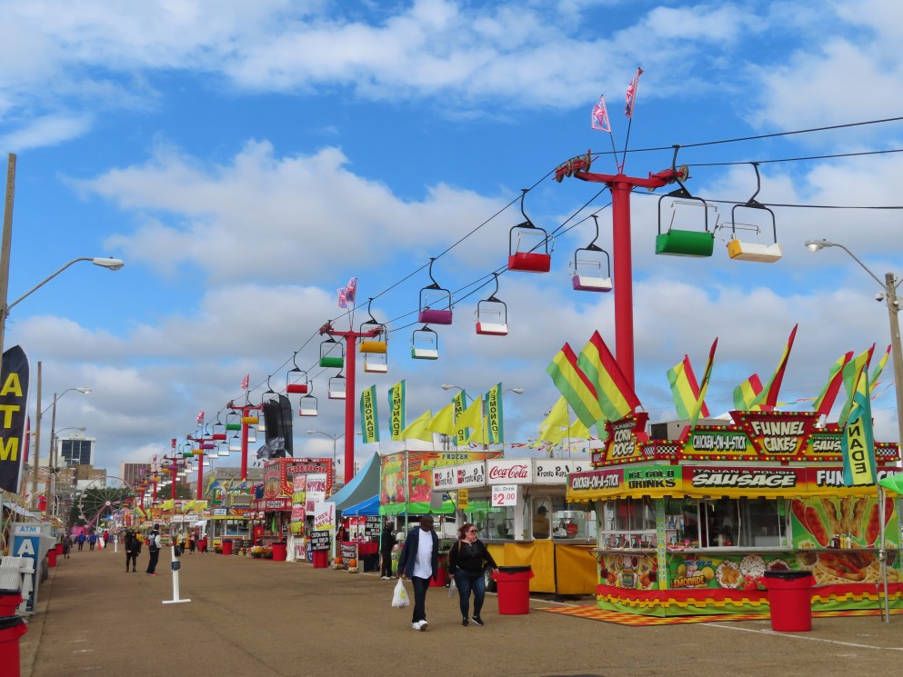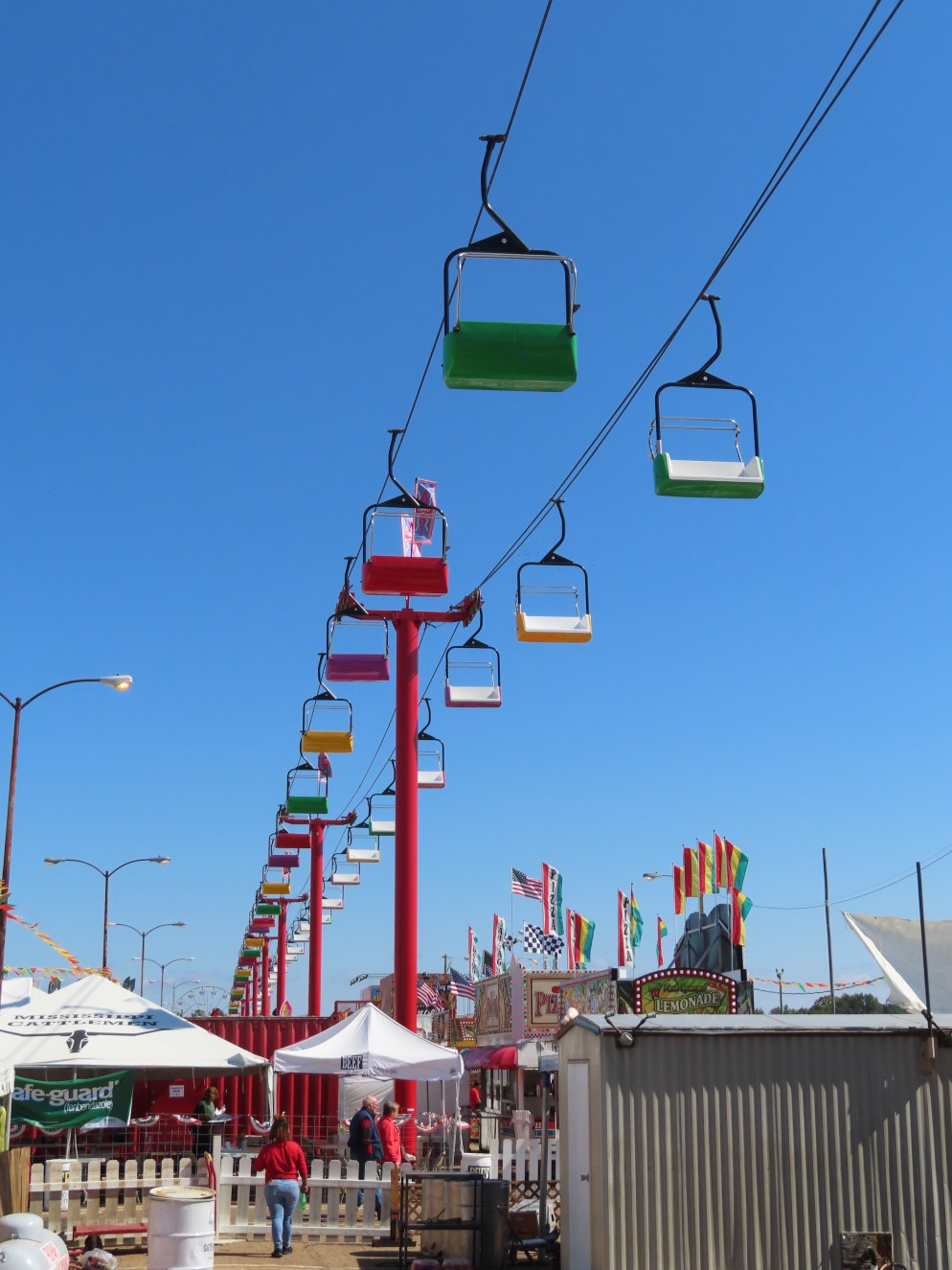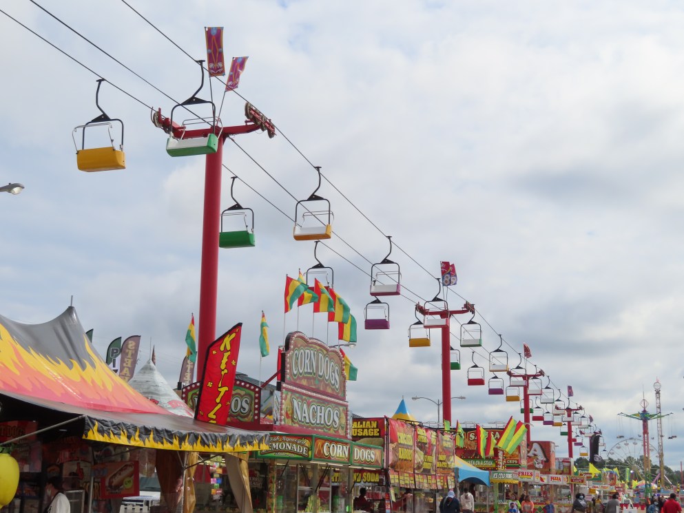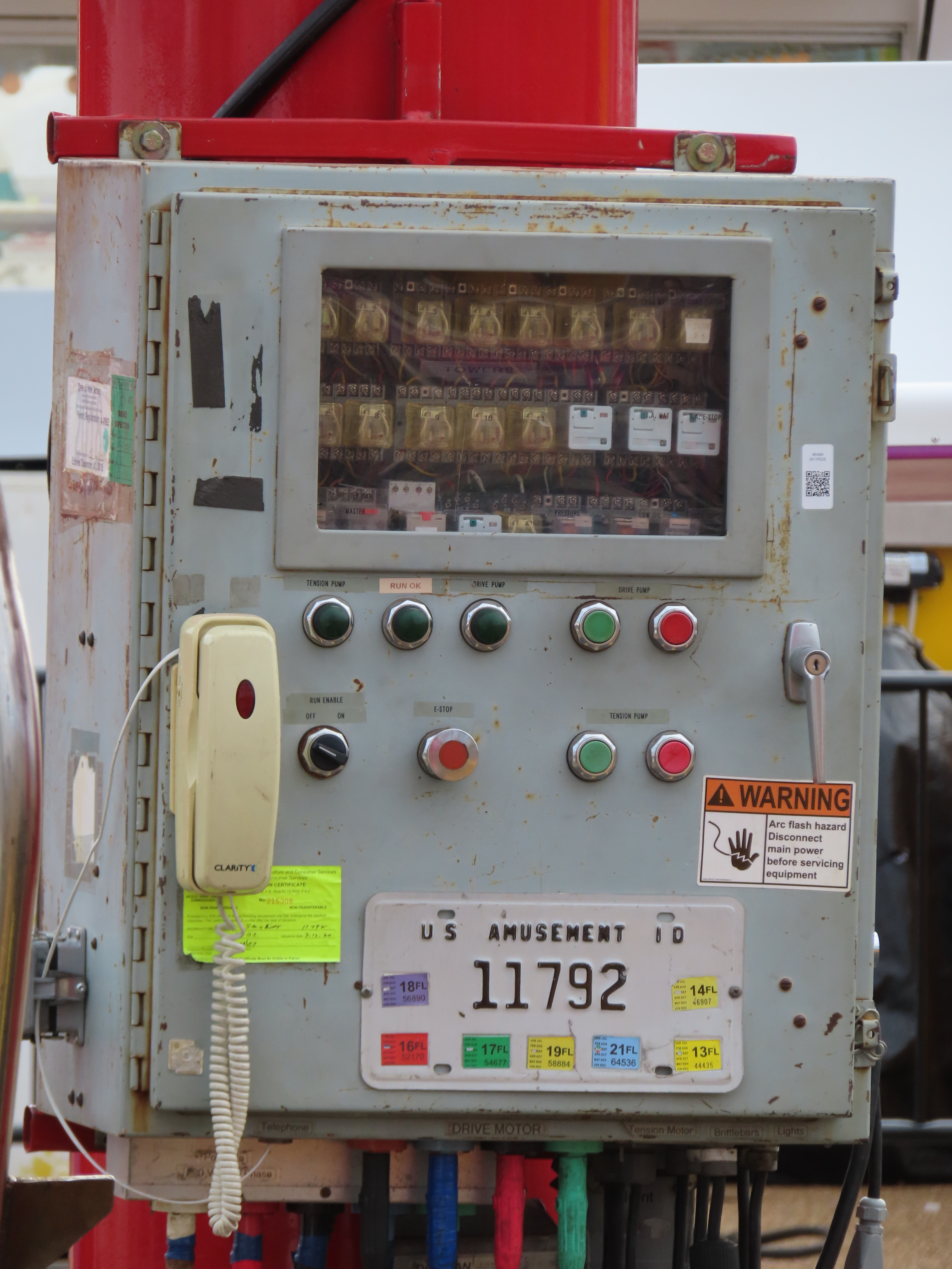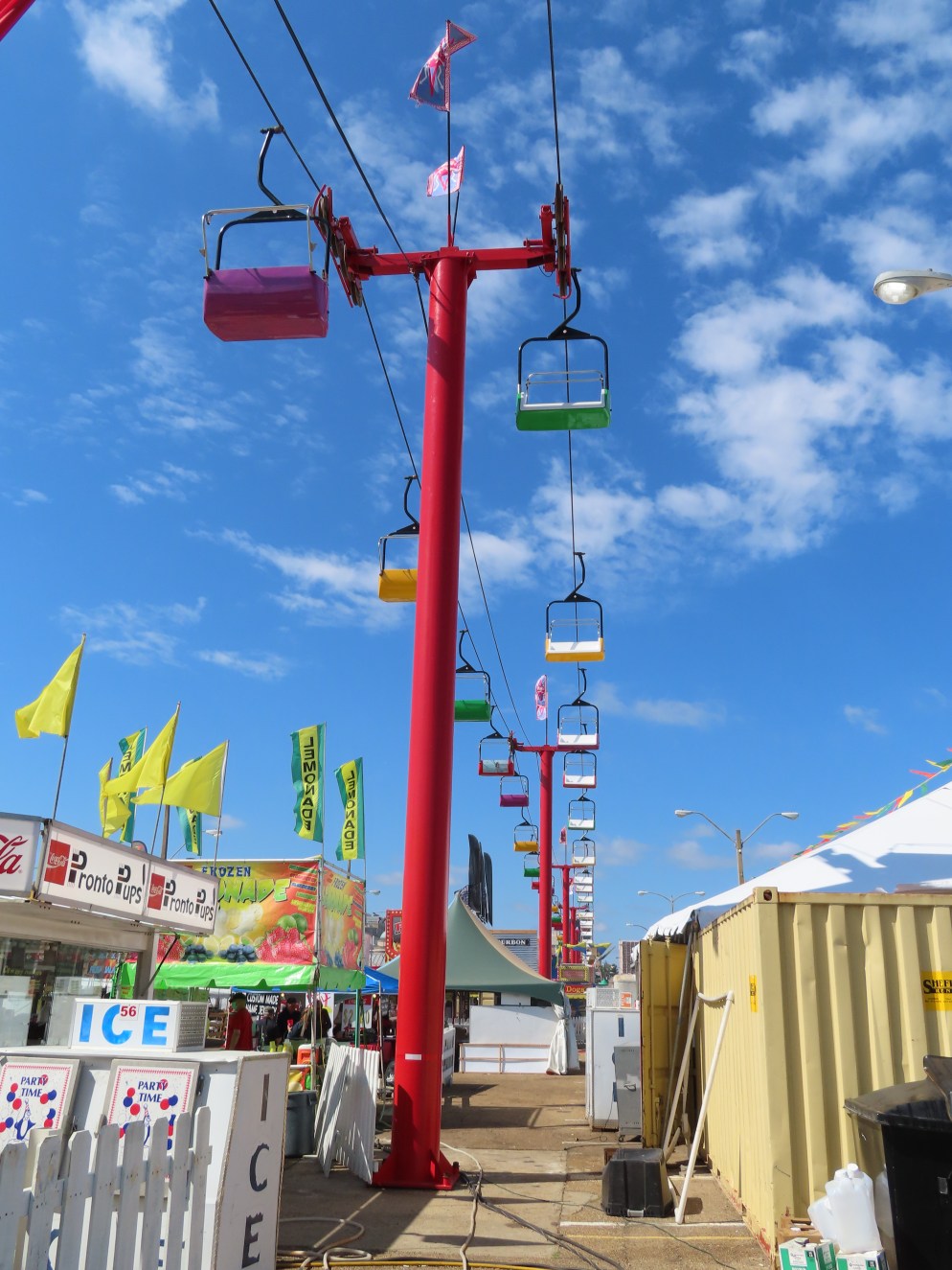 North American Midway Entertainment operates this Hopkins skyride at the Mississippi State Fair as well as the Miami-Dade County Fair and Indiana State Fair.Fixed return terminal.Tower 7.Tall towers over the midway.Tower 1 and the drive terminal.Mobile hydraulic equipment for driving the lift as well as tensioning.West loading area.Controls.Lift line overview.East loading area.Side view of the drive-tension station.These towers are moved twice every year.Tower 2.View down the line.Arriving at the drive station.Looking east.