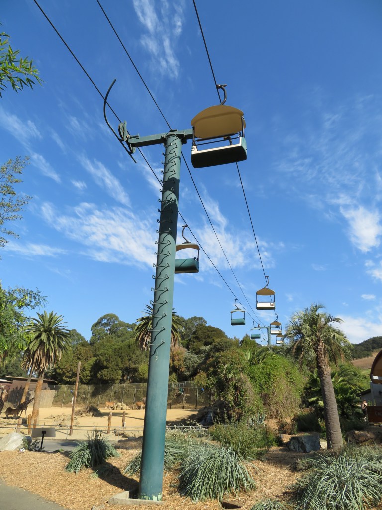 With the opening of a new gondola, this chairlift at the Oakland Zoo only operates at peak times.Lift line.Bottom bullwheel.The ride is out and back as there is no offloading at the opposite end.Loading area.VonRoll tower.Top station seen from the gondola.