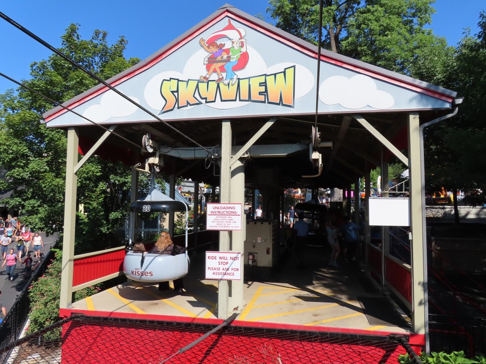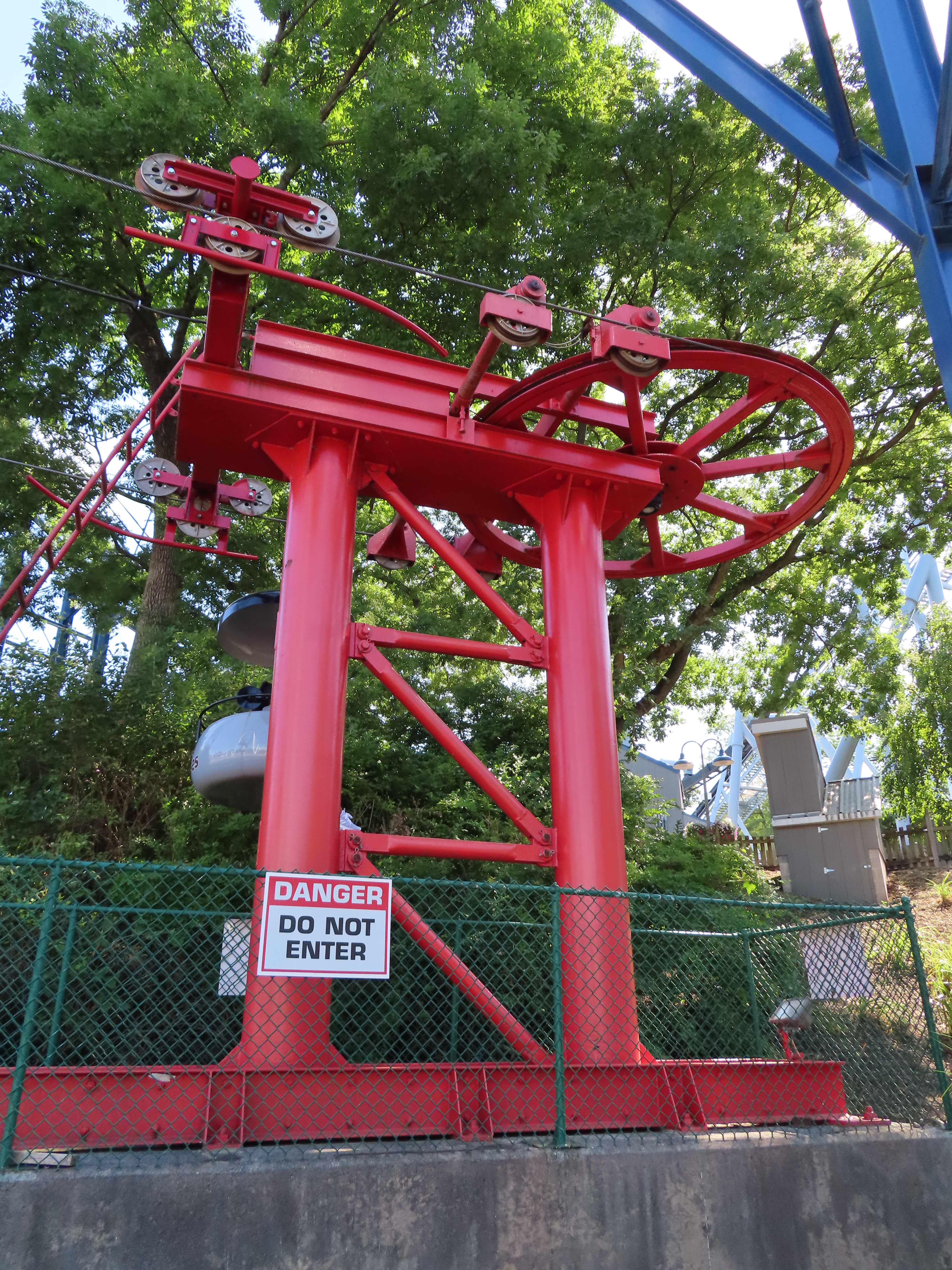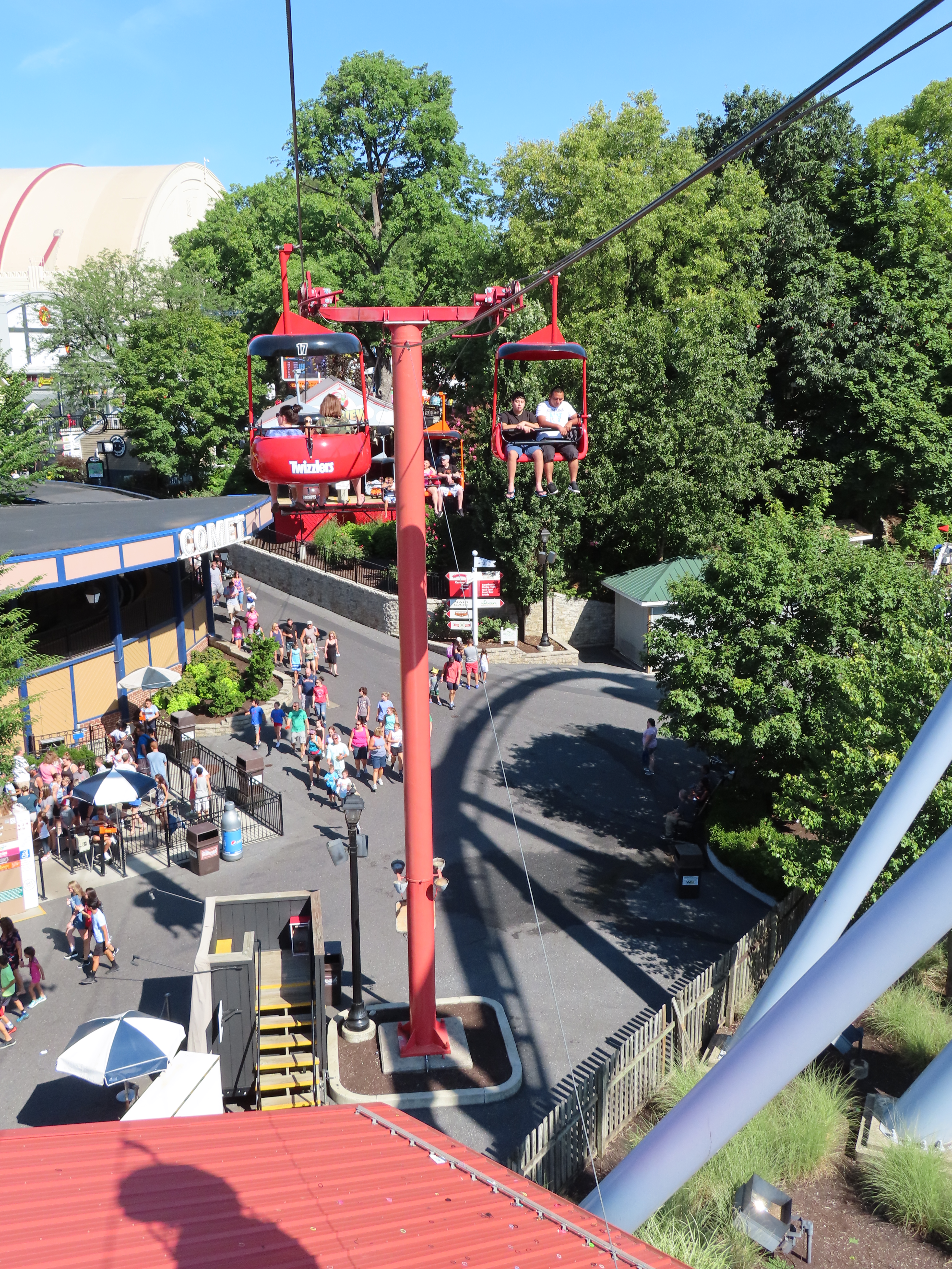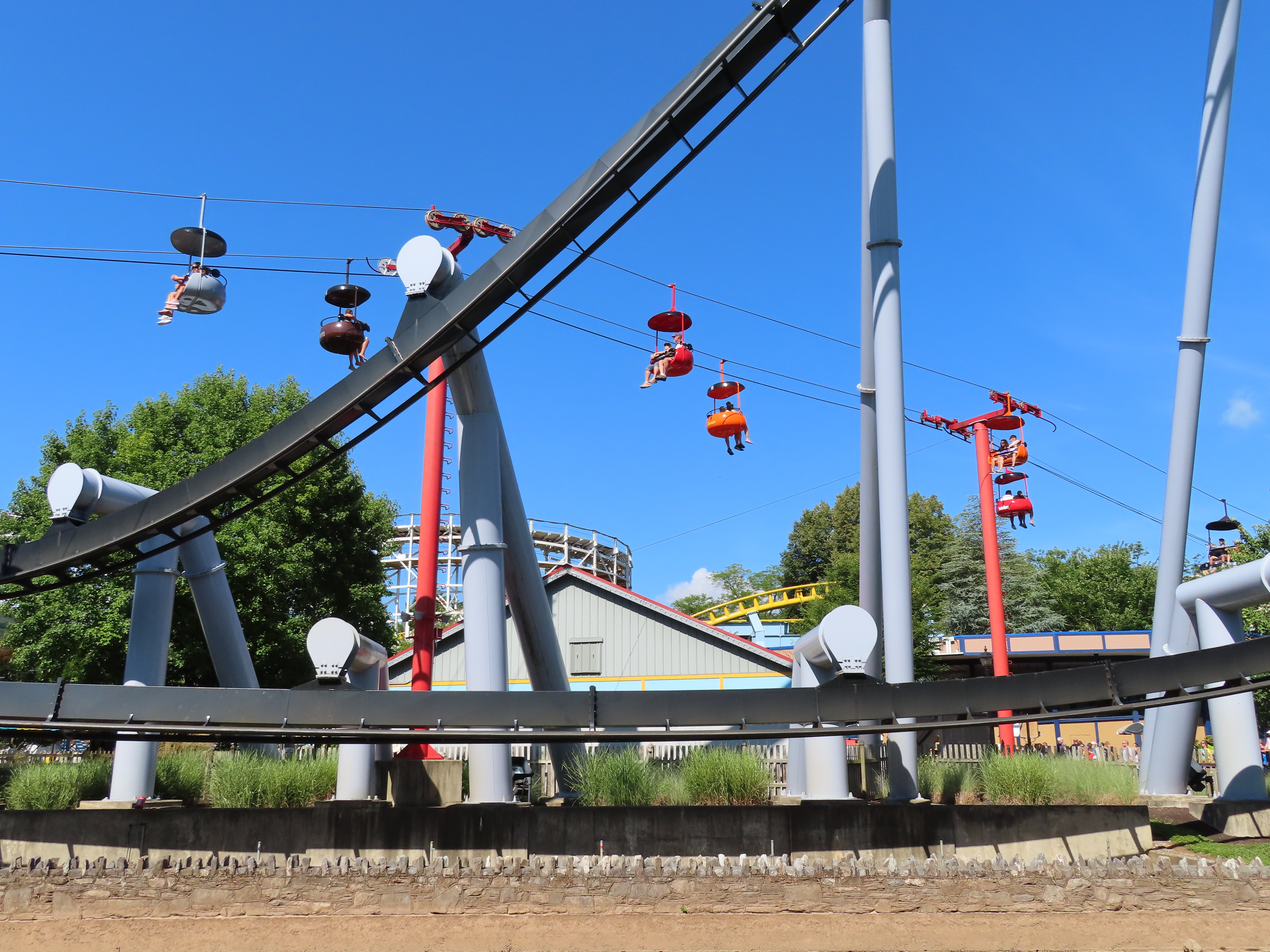 This skyride pre-dates both Great Bear and SooperDooperLooper. You can tell that B&M had to get creative when it came to designing Great Bear and having it maneuver around the existing rides (given it interacts with SooperDooperLooper and the Coal Cracker log flume, and the skyride passes over the entrance and exit to the Immelman loop); that’s how you get unusual features like that helix after the lift hill but before the first drop, or rather unusually designed supports as the track runs along Spring Creek so as not to have any support footers in the water proper.