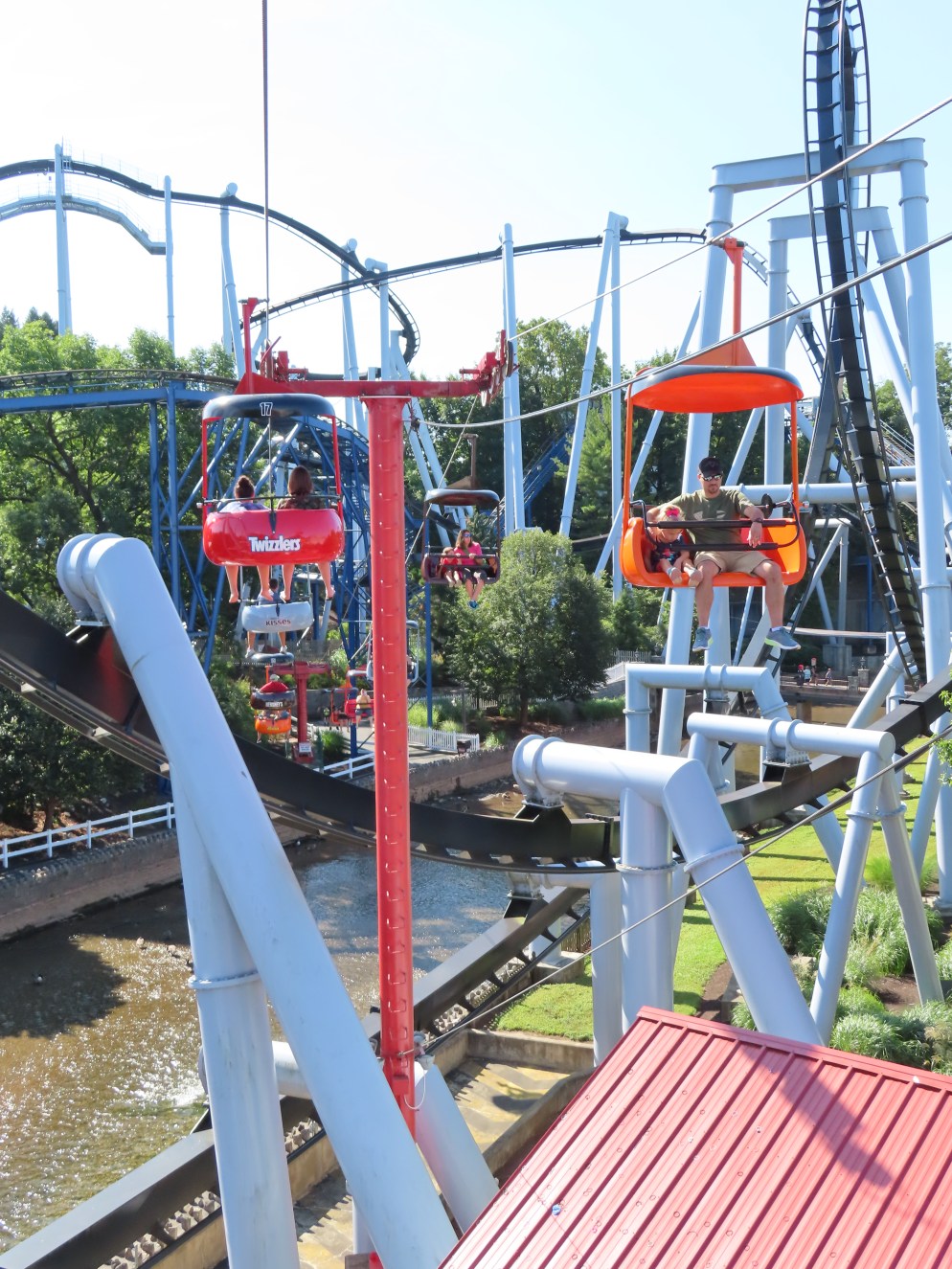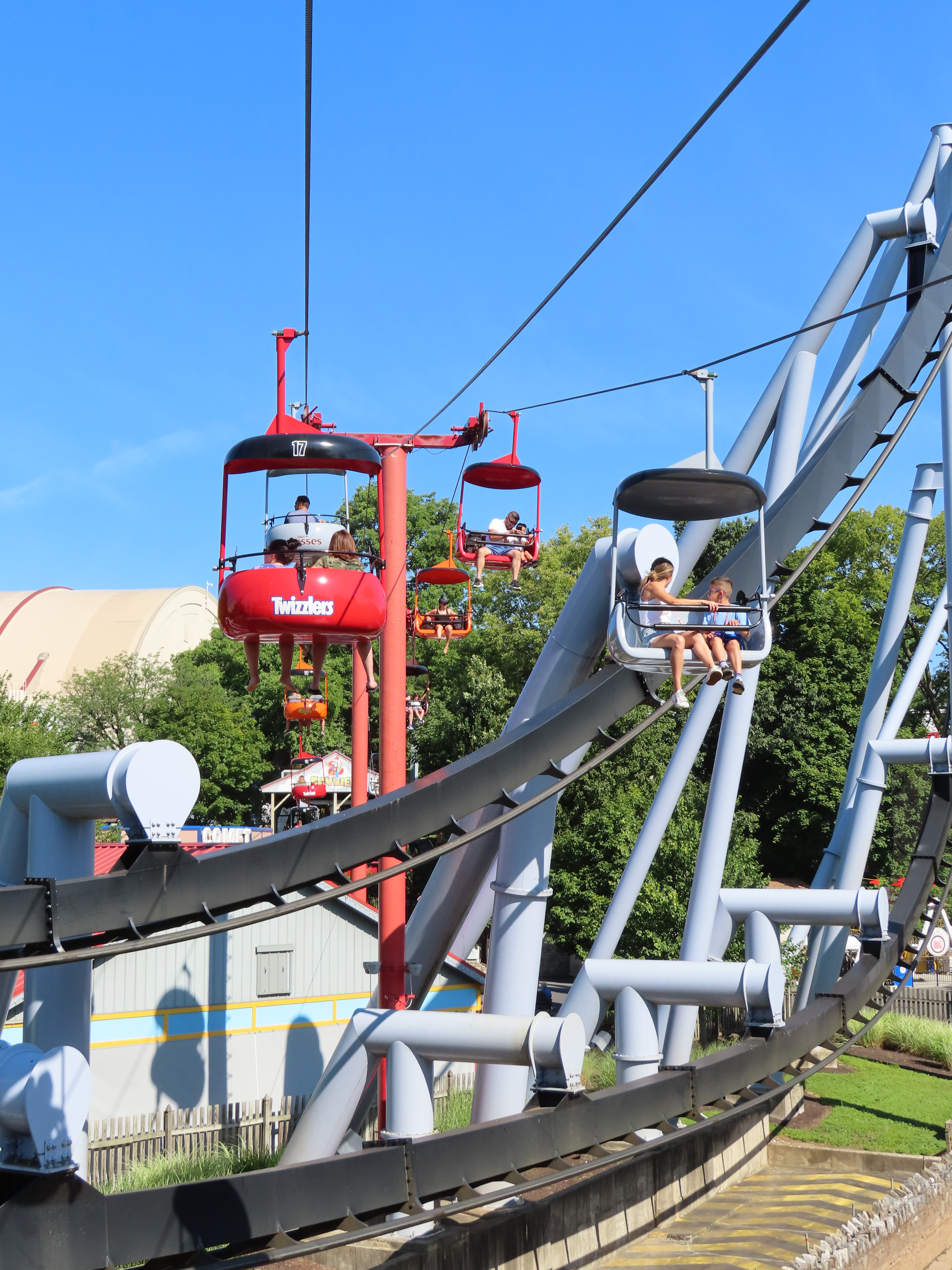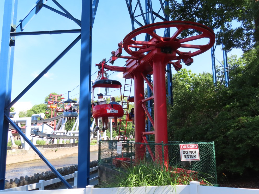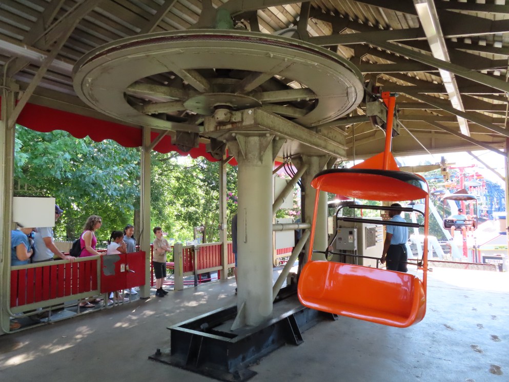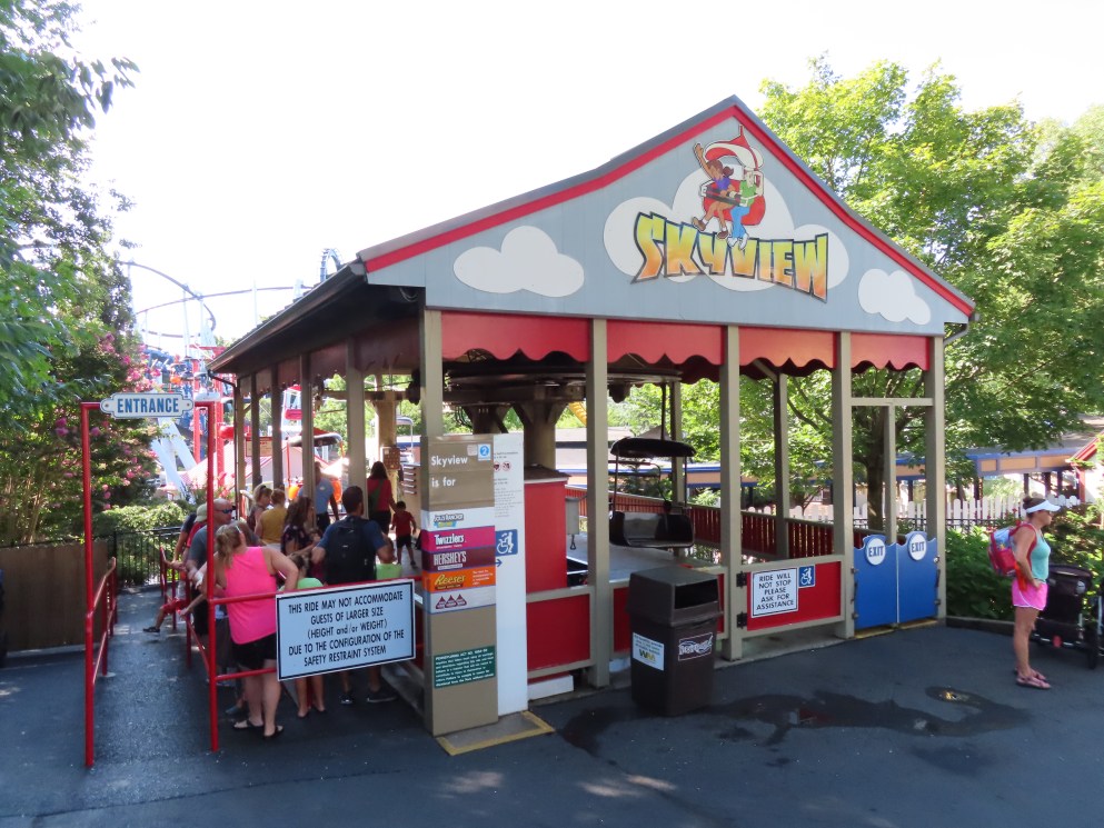 This skyride pre-dates both Great Bear and SooperDooperLooper. You can tell that B&M had to get creative when it came to designing Great Bear and having it maneuver around the existing rides (given it interacts with SooperDooperLooper and the Coal Cracker log flume, and the skyride passes over the entrance and exit to the Immelman loop); that’s how you get unusual features like that helix after the lift hill but before the first drop, or rather unusually designed supports as the track runs along Spring Creek so as not to have any support footers in the water proper.