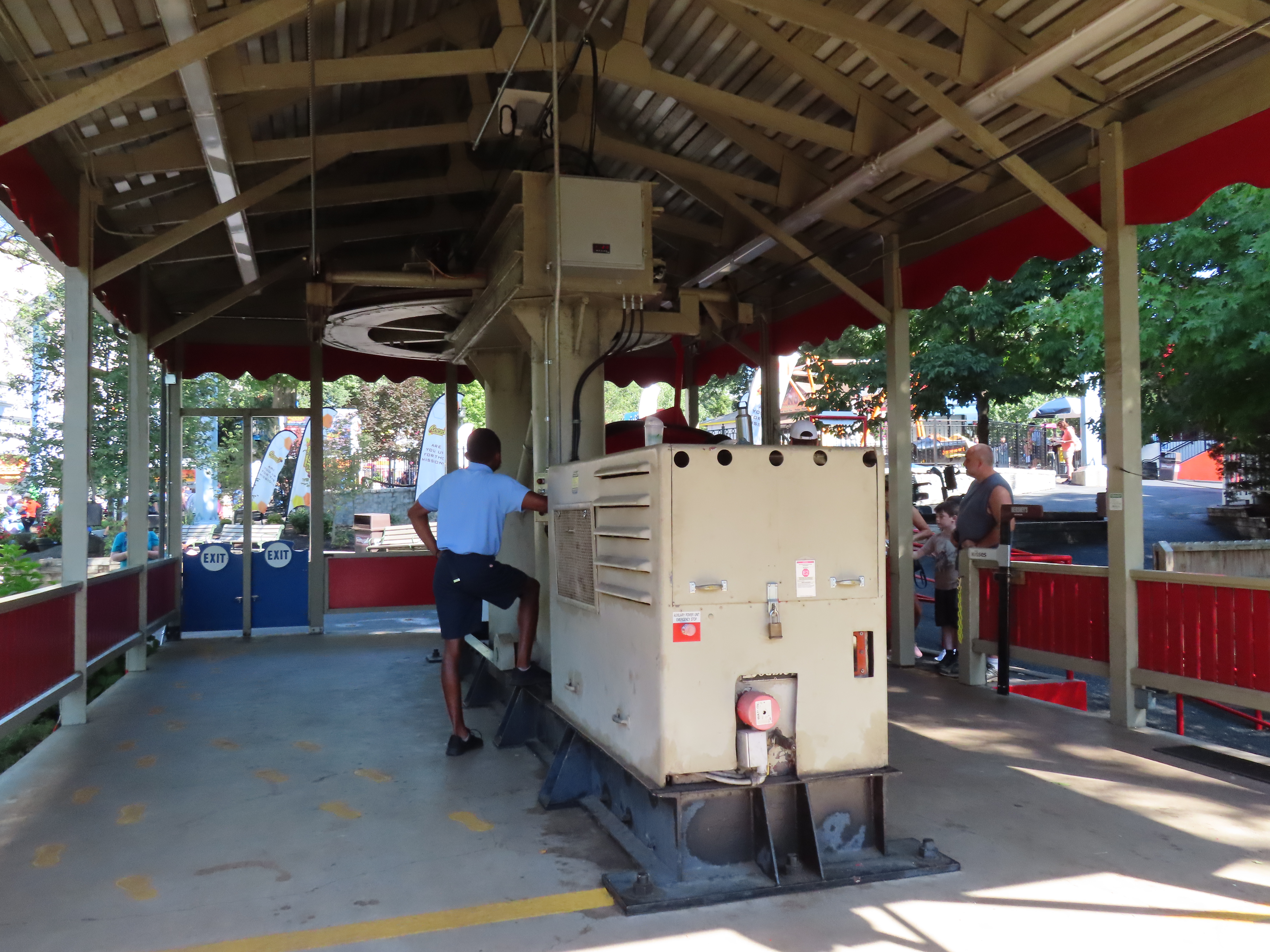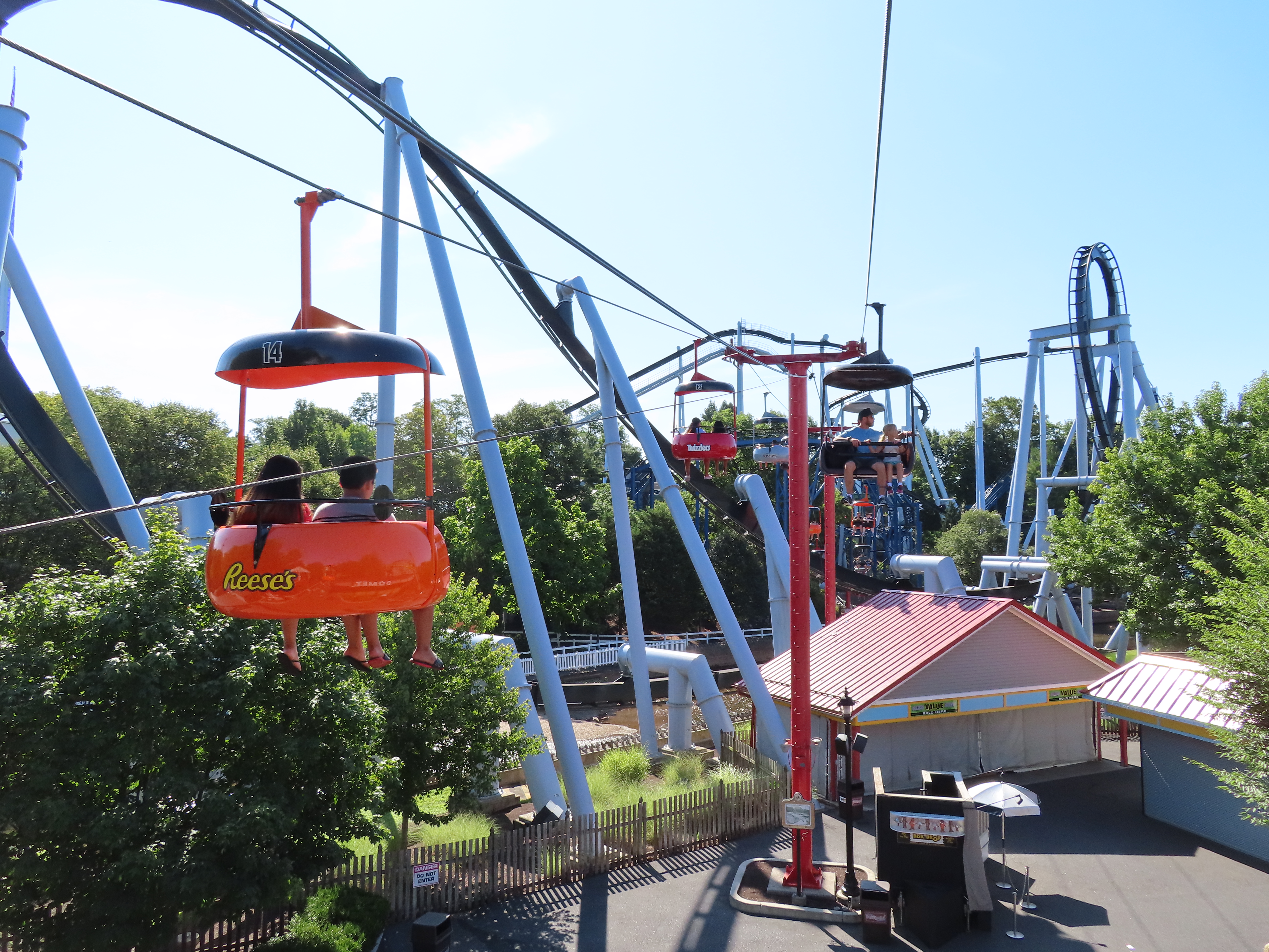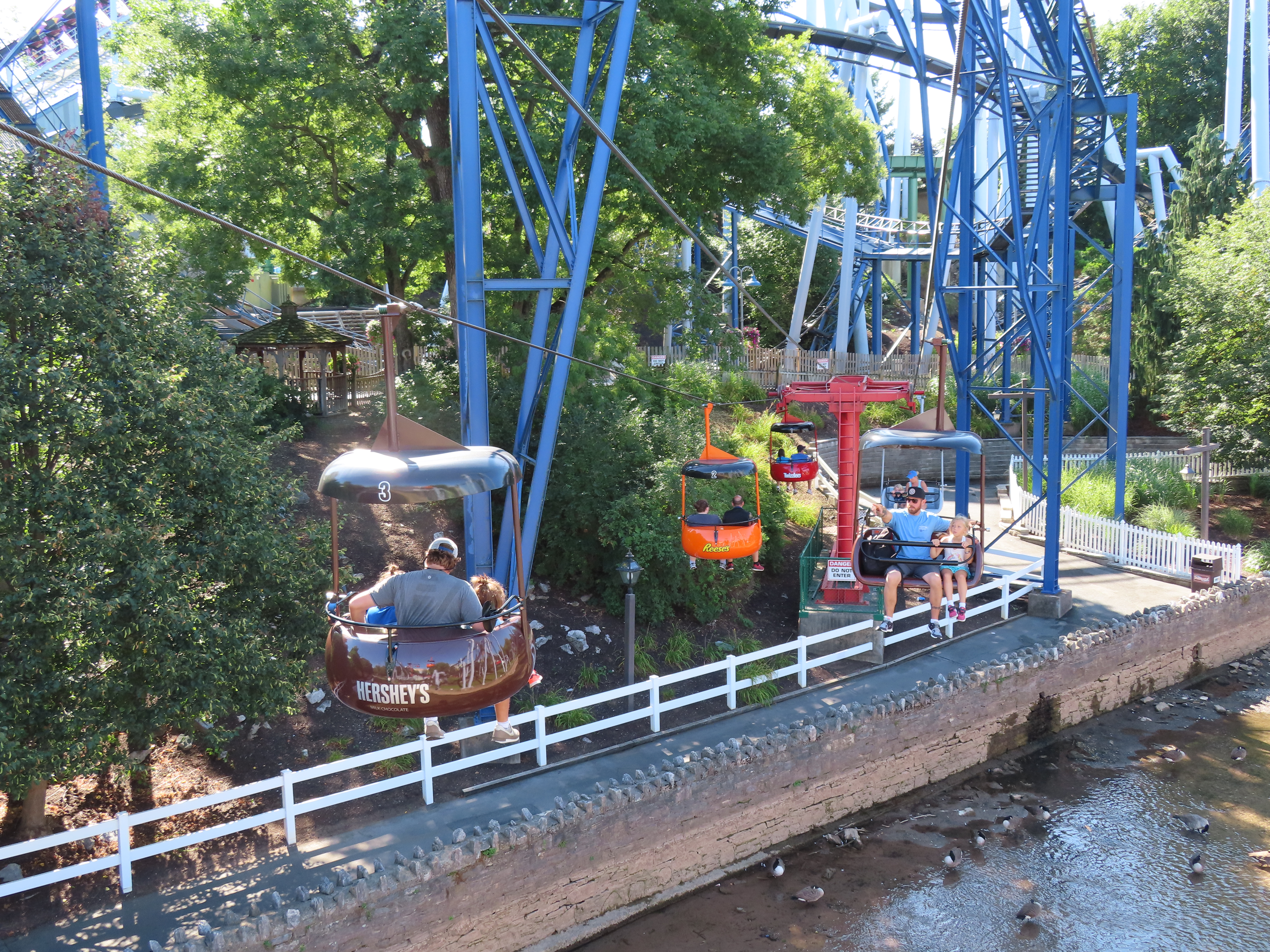 This short chairlift provides a round trip ride over the center part of Hersheypark.Drive bullwheel.Station building.Each carrier is themed with a different Hershey’s candy brand.Return bullwheel.There are only two towers outside of the stations.Crossing over a river.Tower 2.The lift crosses over a roller coaster as well.Drive equipment.Loading area.Towers 2 and 3.Return terminal structure.Lift overview.