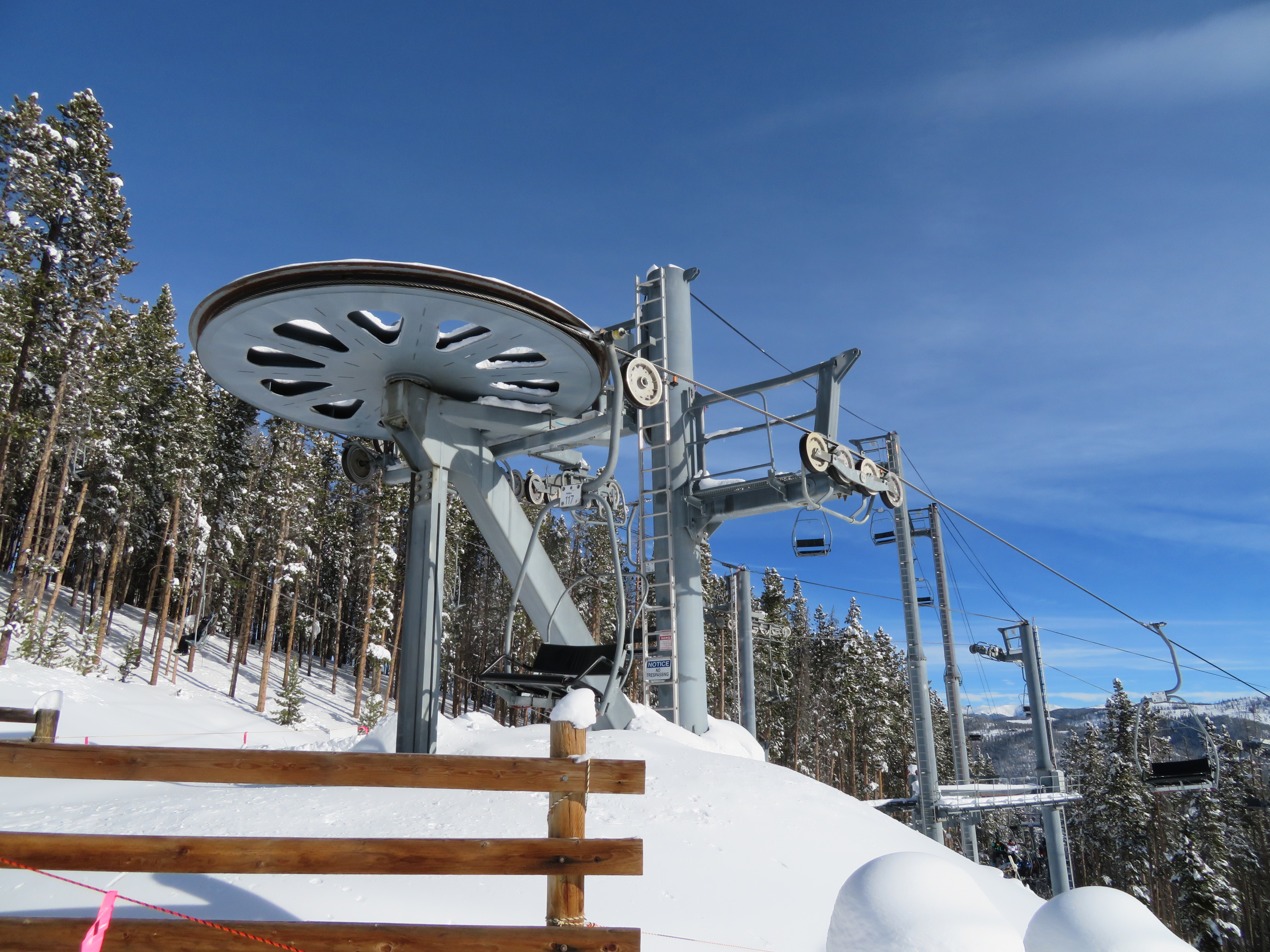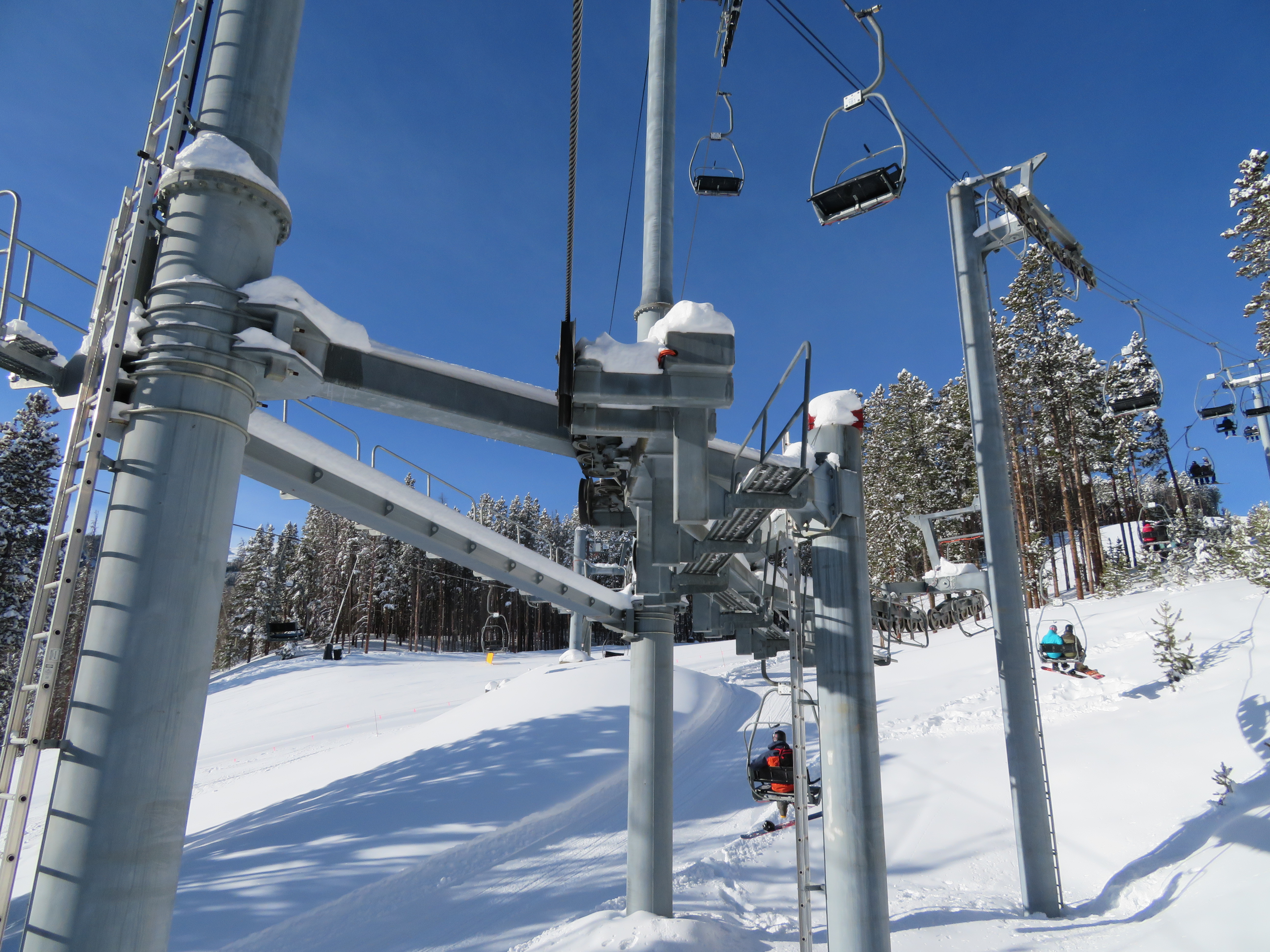 This is one of the most unique lifts in North America, with a mid-station and a 70-degree turn accomplished through two bullwheels and horizontal sheaves.