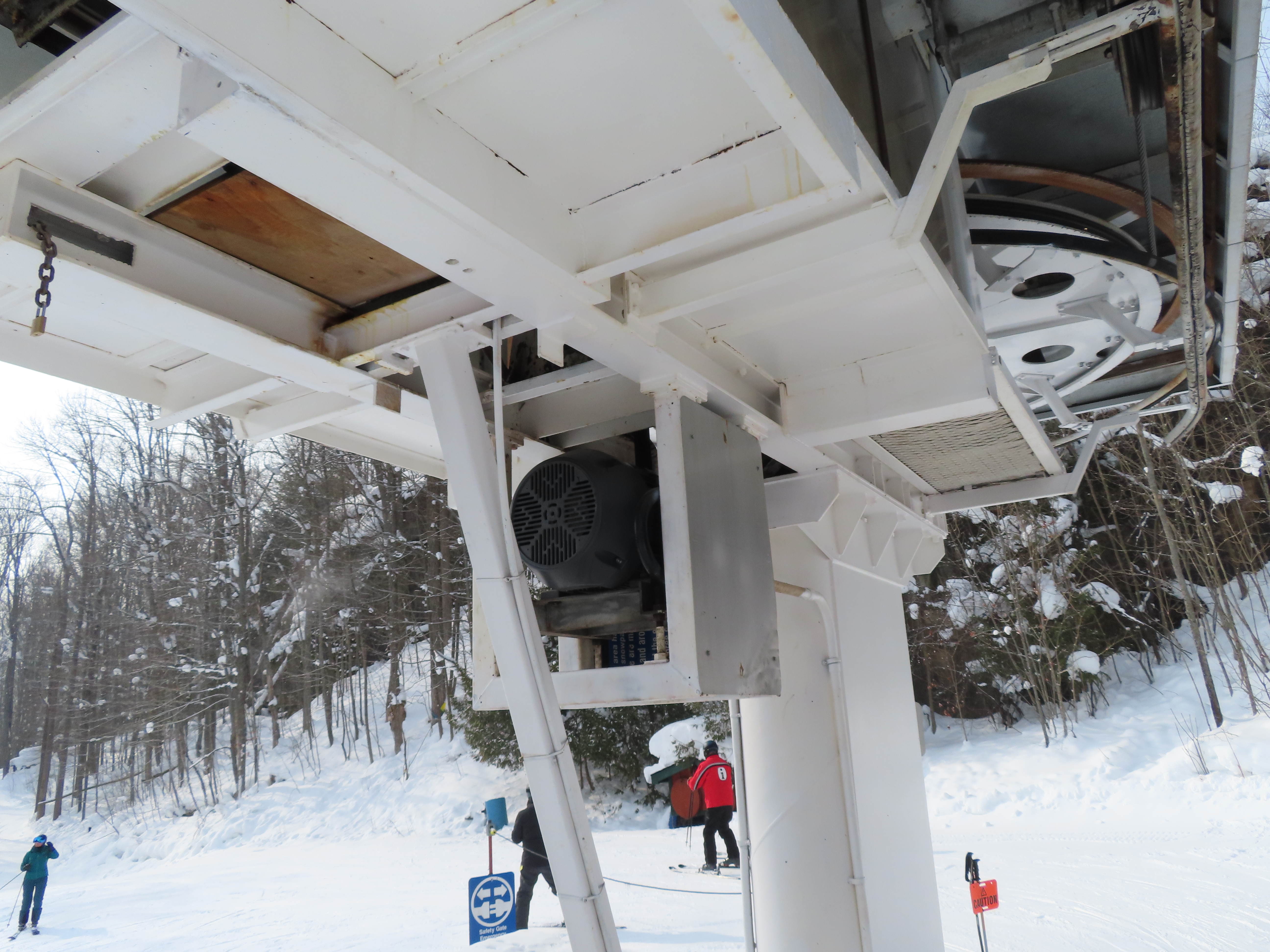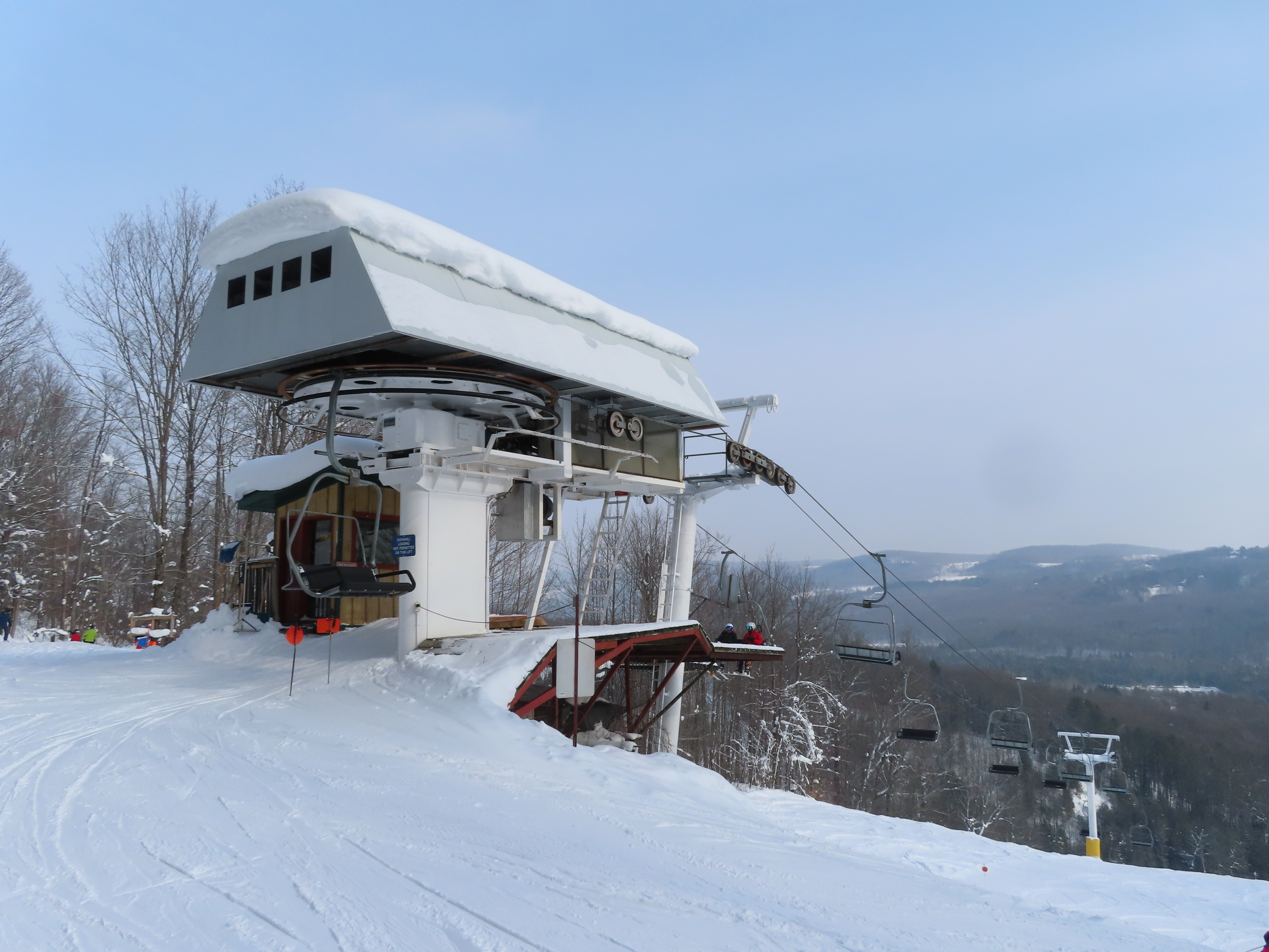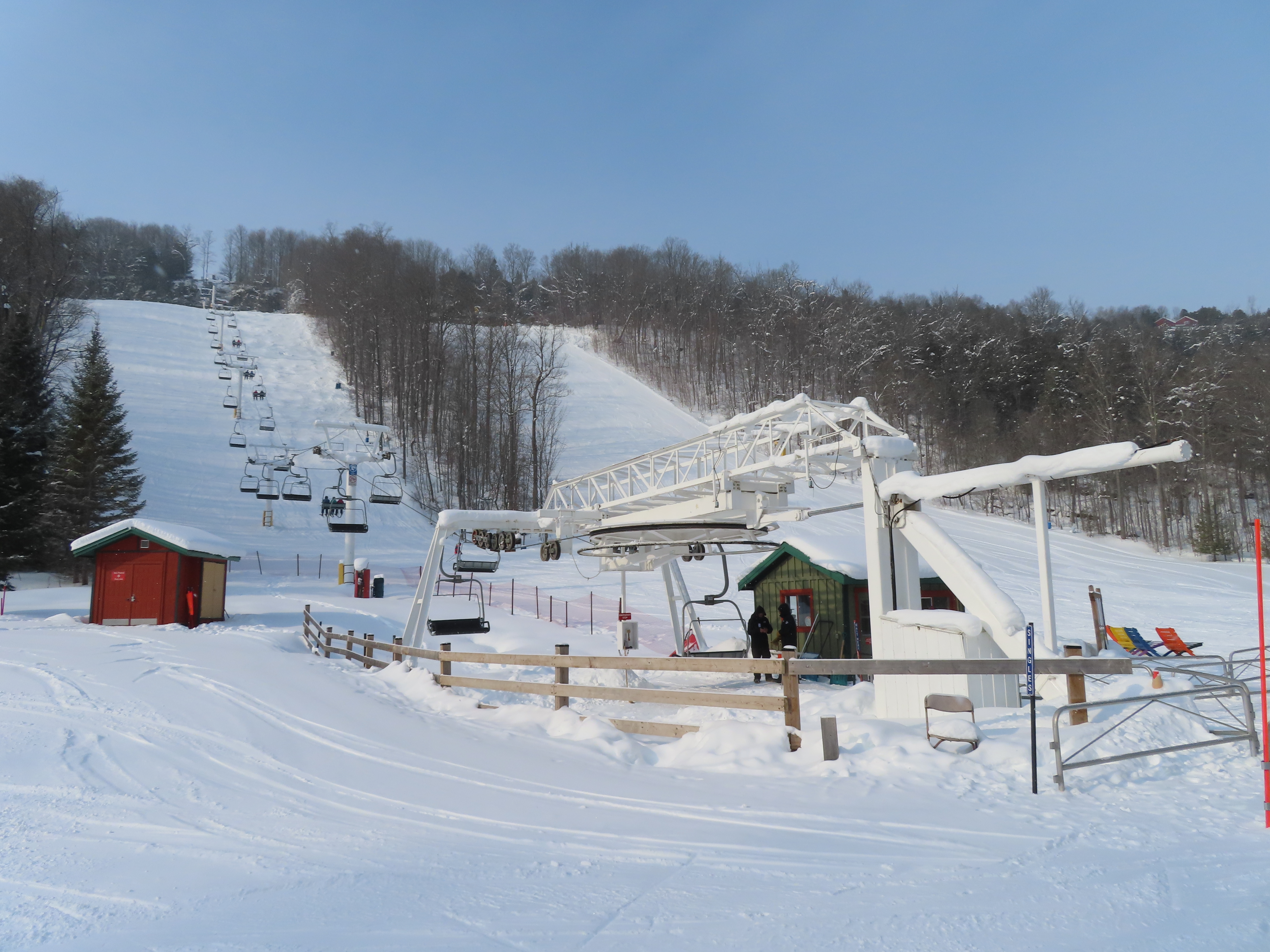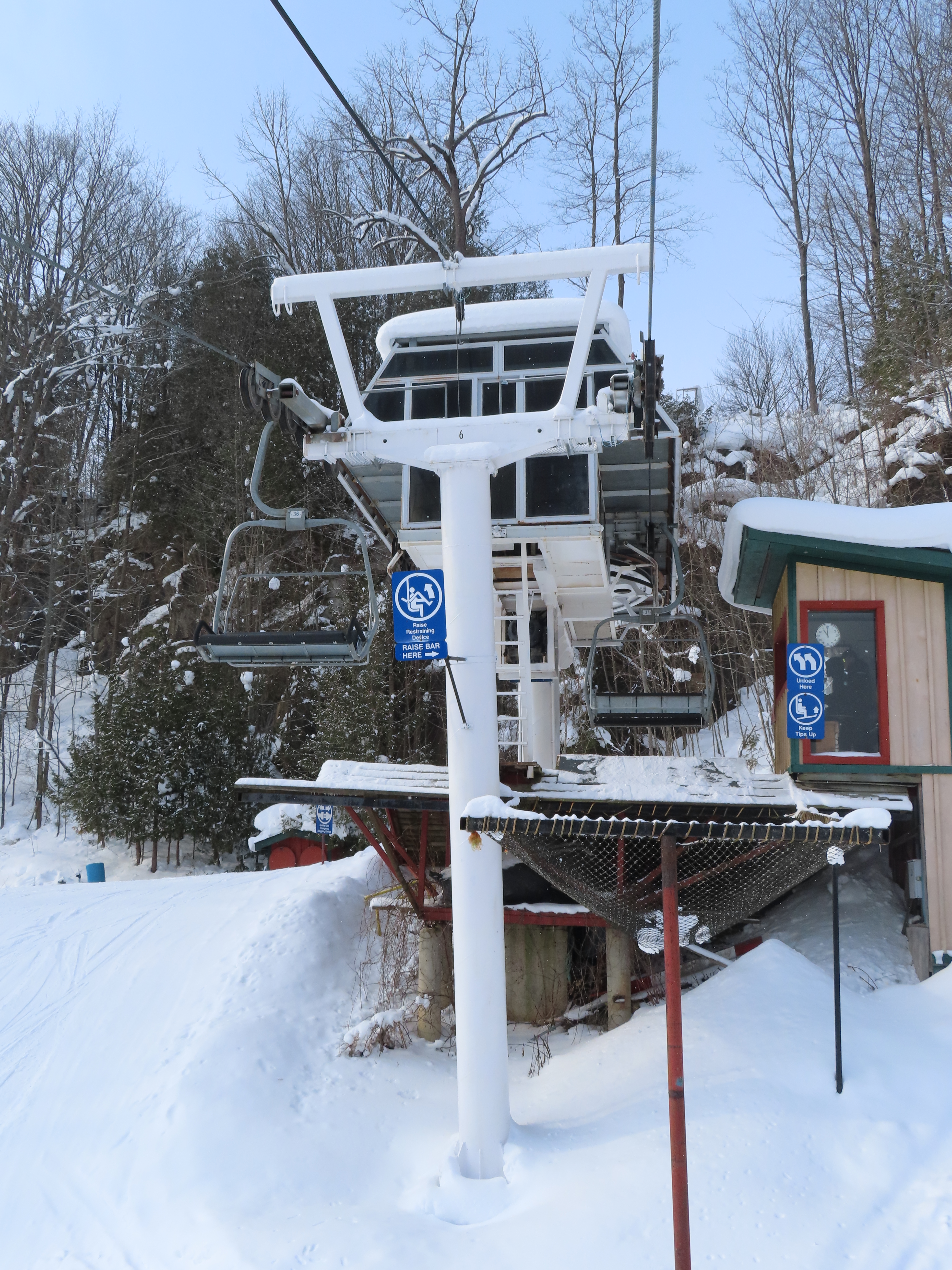 This Doppelmayr triple dates back to 1973 and started life at Snoasis, Saskatchewan.Hydraulic tensioning and new chairs were added in 2000.Original chairs were of center pole style.Tower 6 and the top terminal.Old station with new cover.Upper line overview.Upper station with drive systems.View down the short, steep lift line.Lower lift line.1973 return station.View back down the line.75 HP electric motor tucked below the bullwheel.