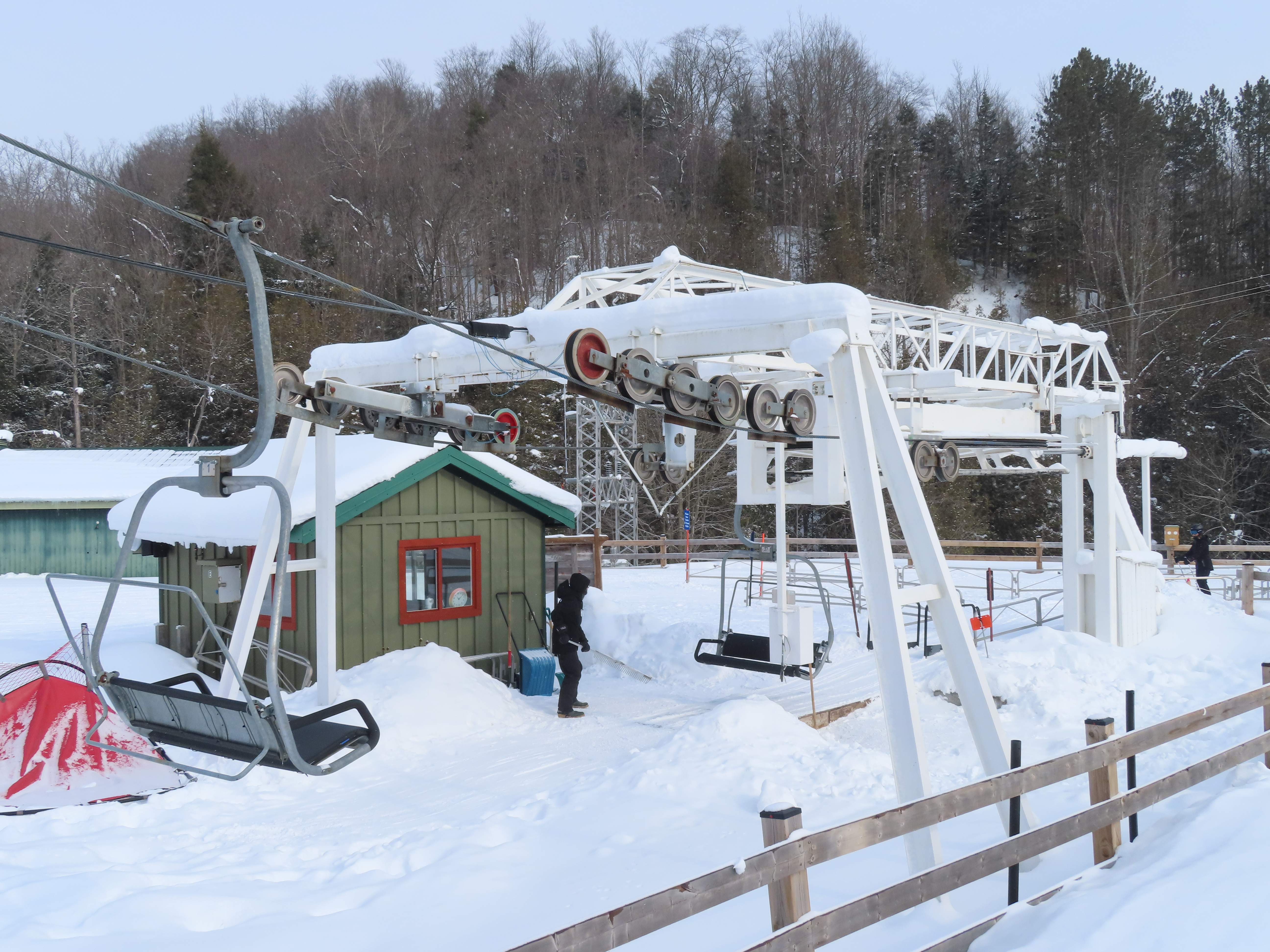 The twin to this lift went to Blackstrap in Saskatchewan in 1985. It was switched to bottom drive with the large tension terminal on the top of the mound. The lift had a mix of Doppelmayr center-pole triple chairs and bail-style chairs. The ski hill closed around 2007, and the lift was removed by 2024.