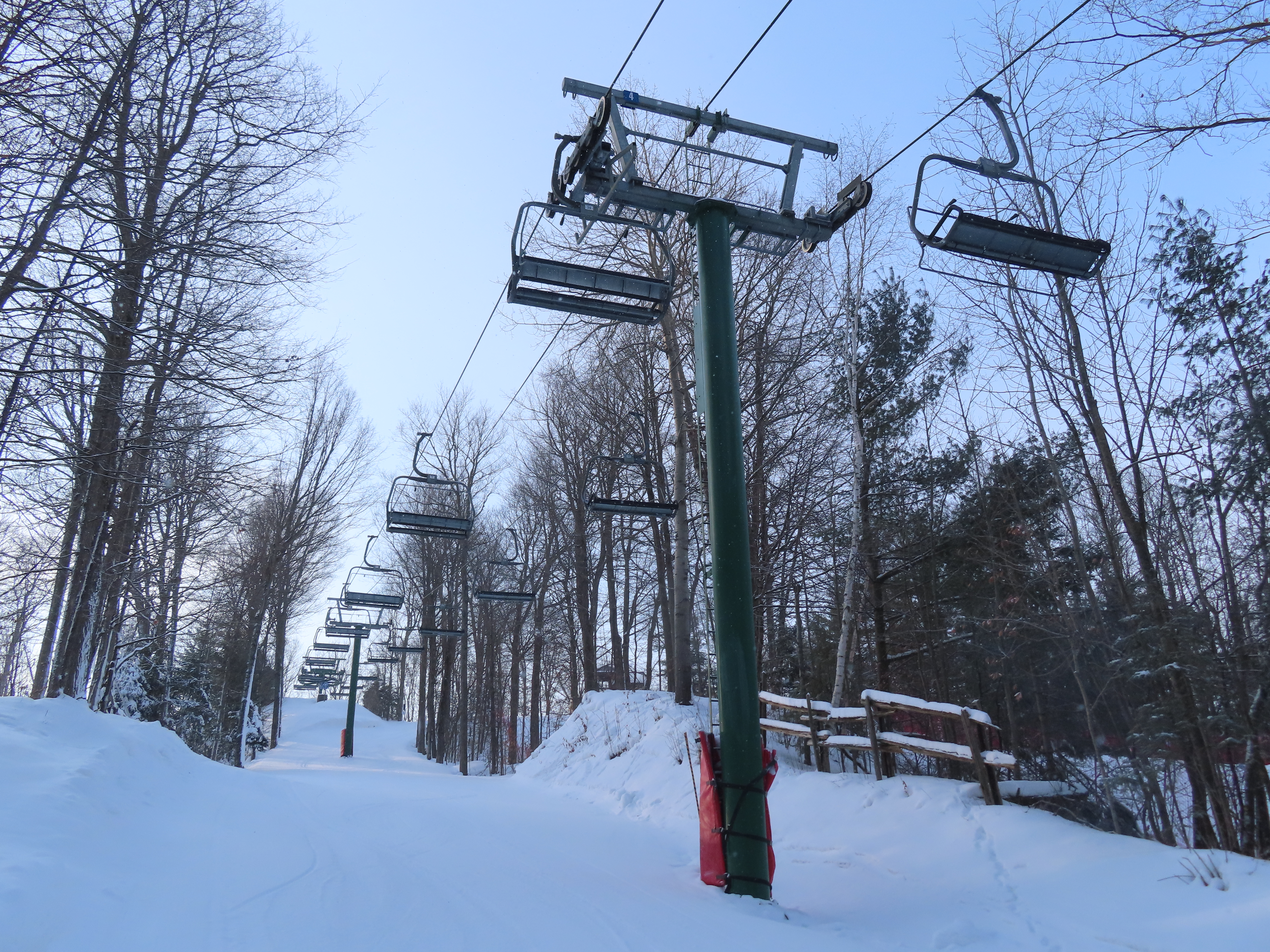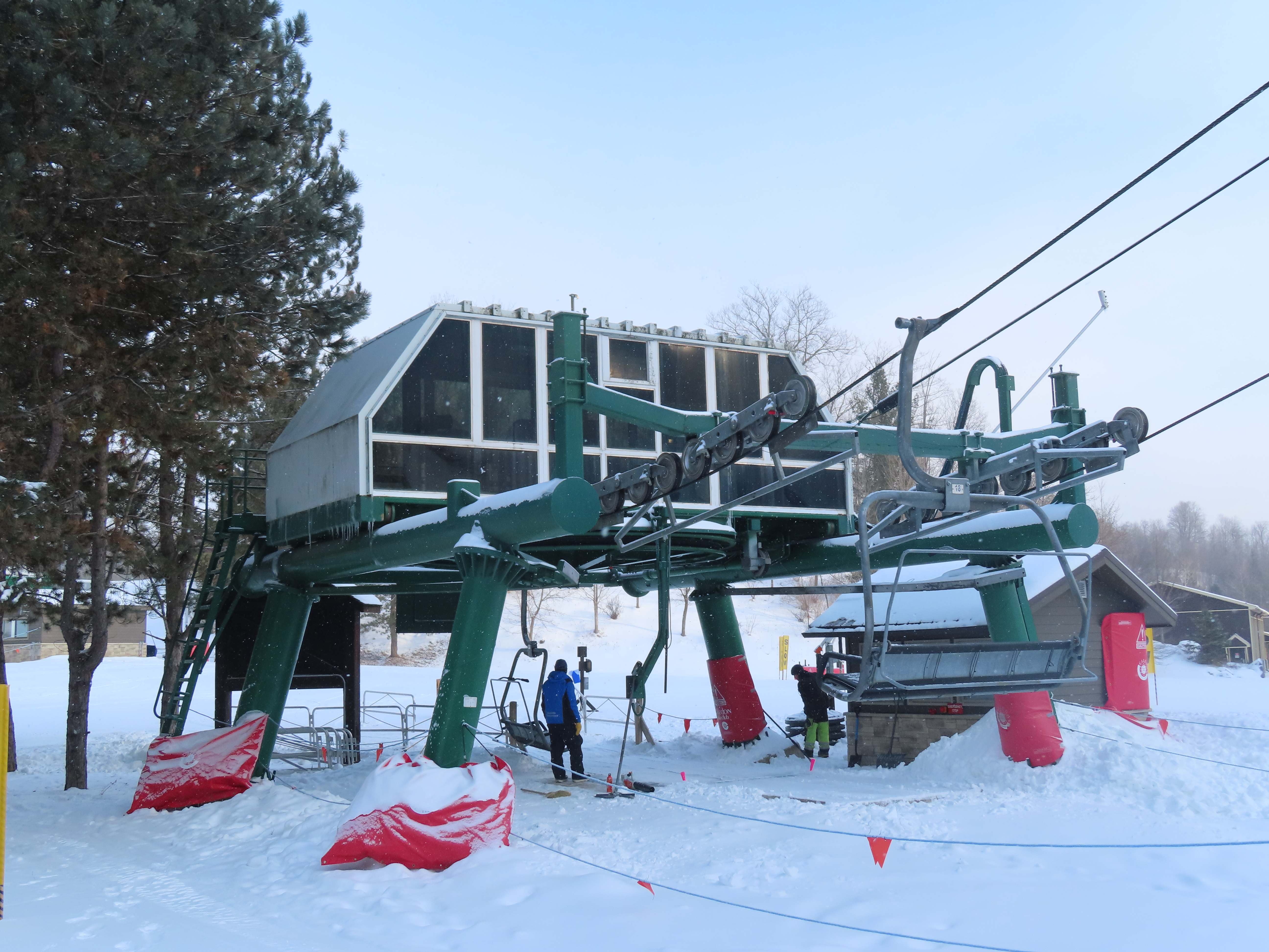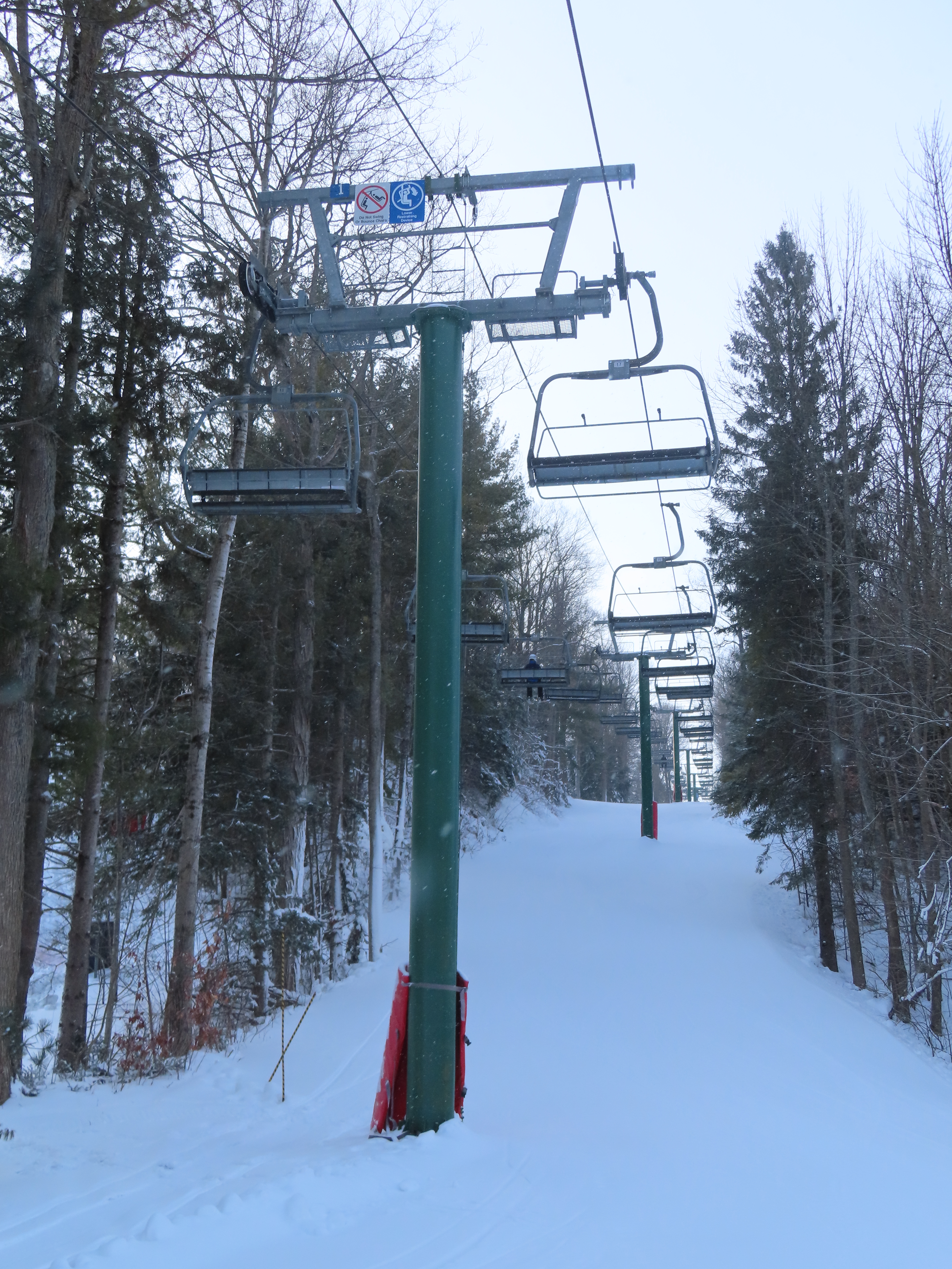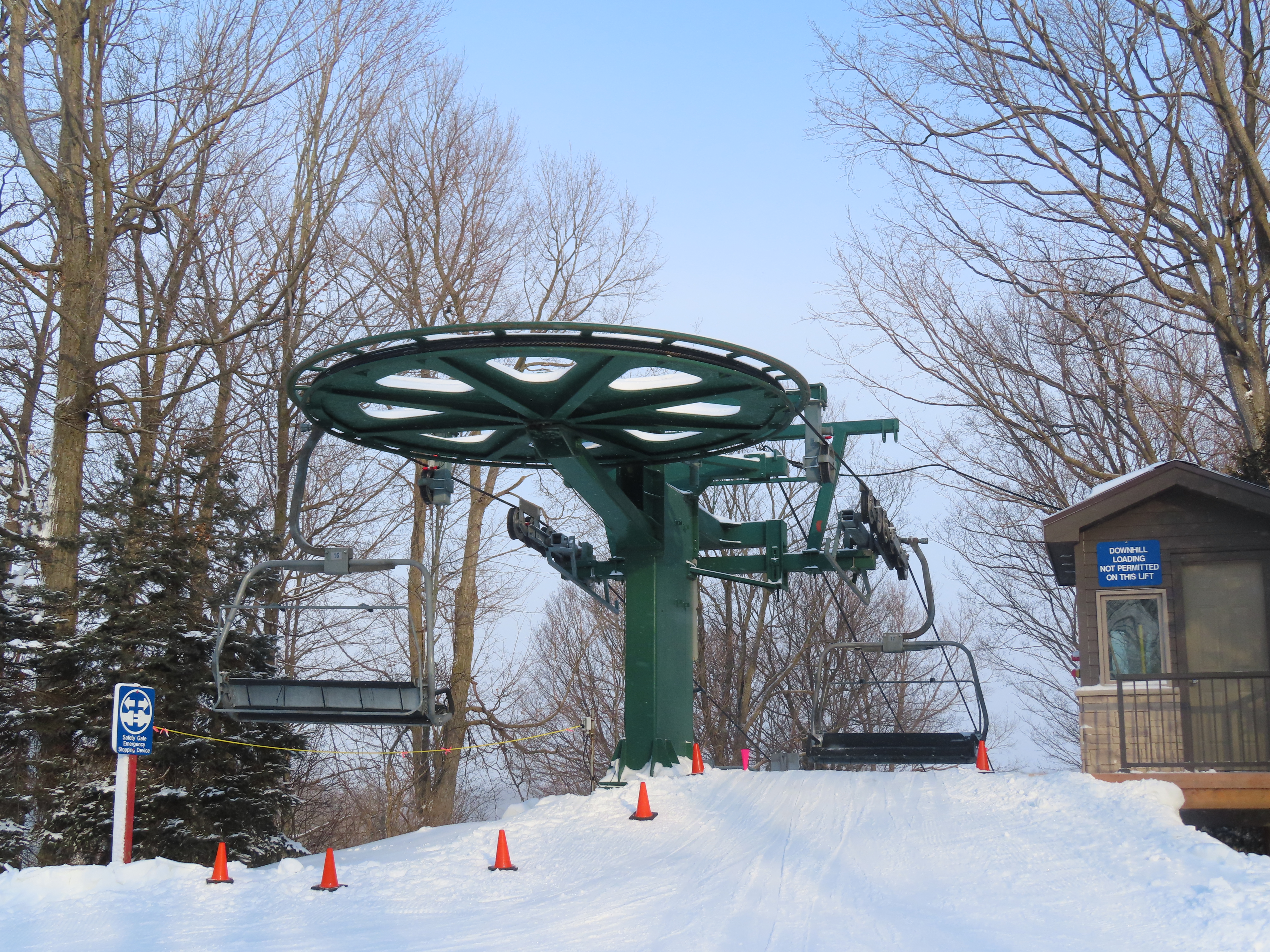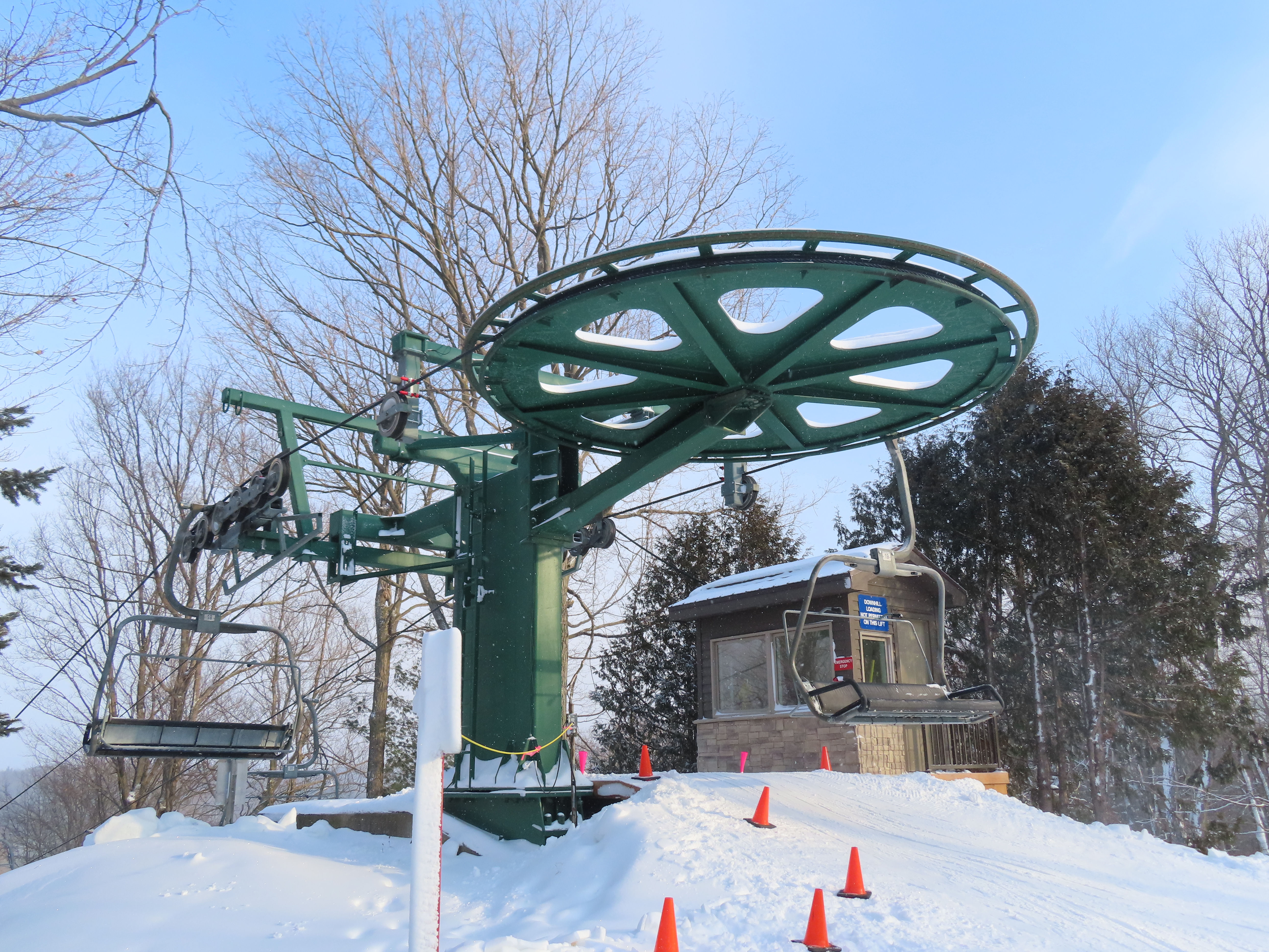 This lift services a wooded terrain pod and is the second longest lift on the mountain.View back to the bottom terminal with the Caledon Express in the background.Top bullwheel amid the trees.This is one of three very similar lifts at Caledon.View down the lift line.Upper lift line.Tower 1.Loading area.Doppelmayr Worldbook entry along with sister lift North.