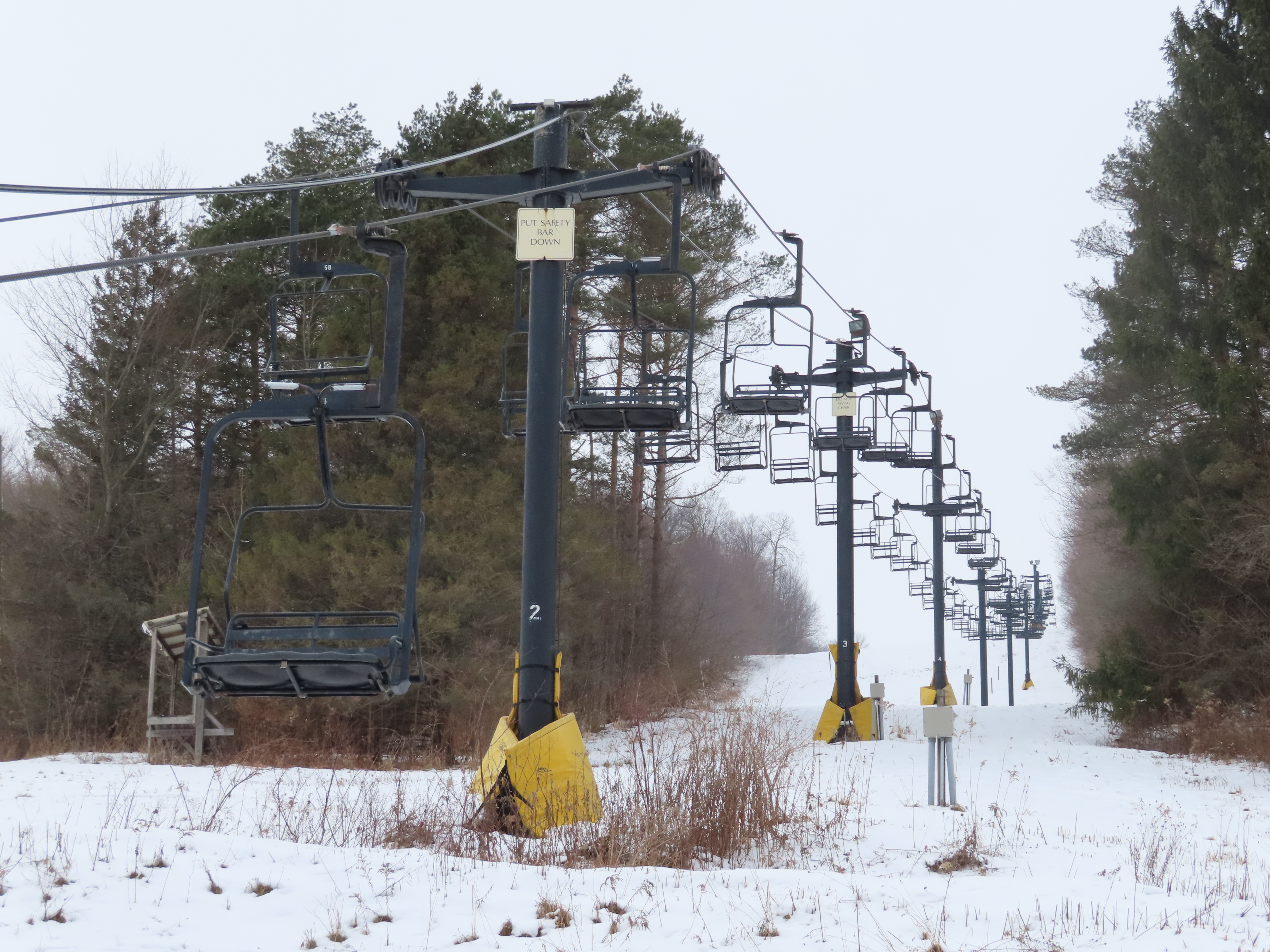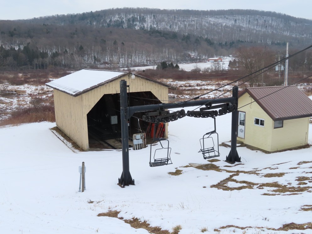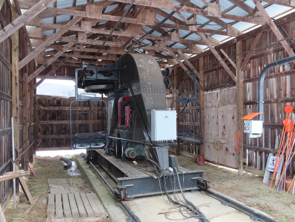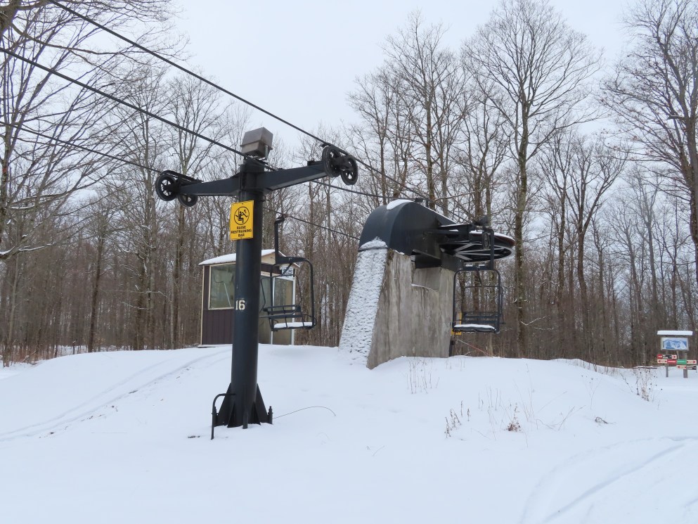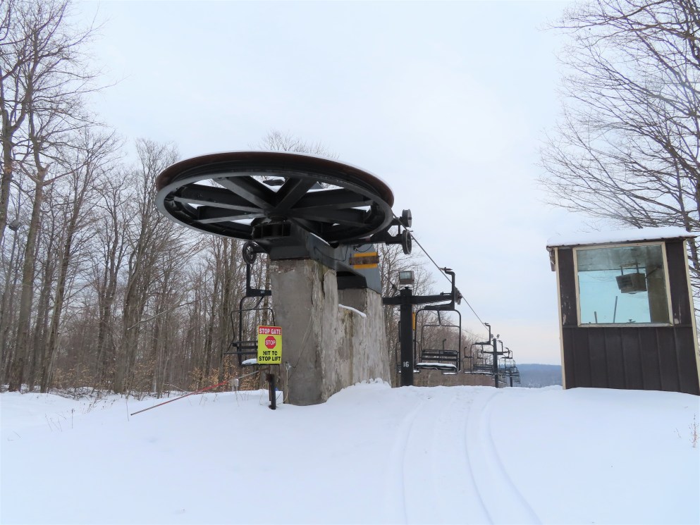 As the name suggests, this lift services trails south of the main mountain.Unloading area.View from the summit.Middle part of the lift line.Lower lift line.Bottom terminal area.Drive equipment under a wooden roof.View up from the lower station.Counterweight.