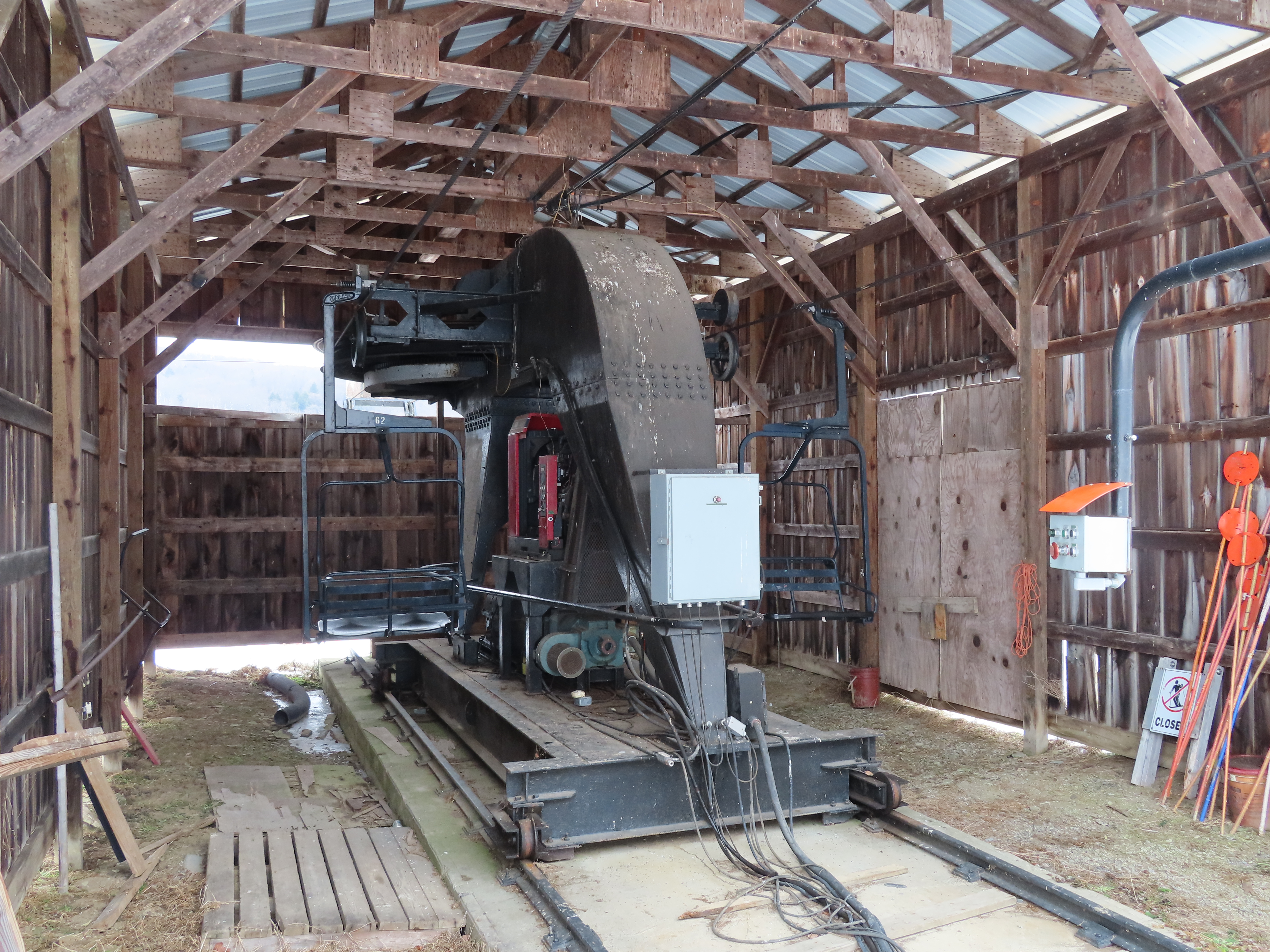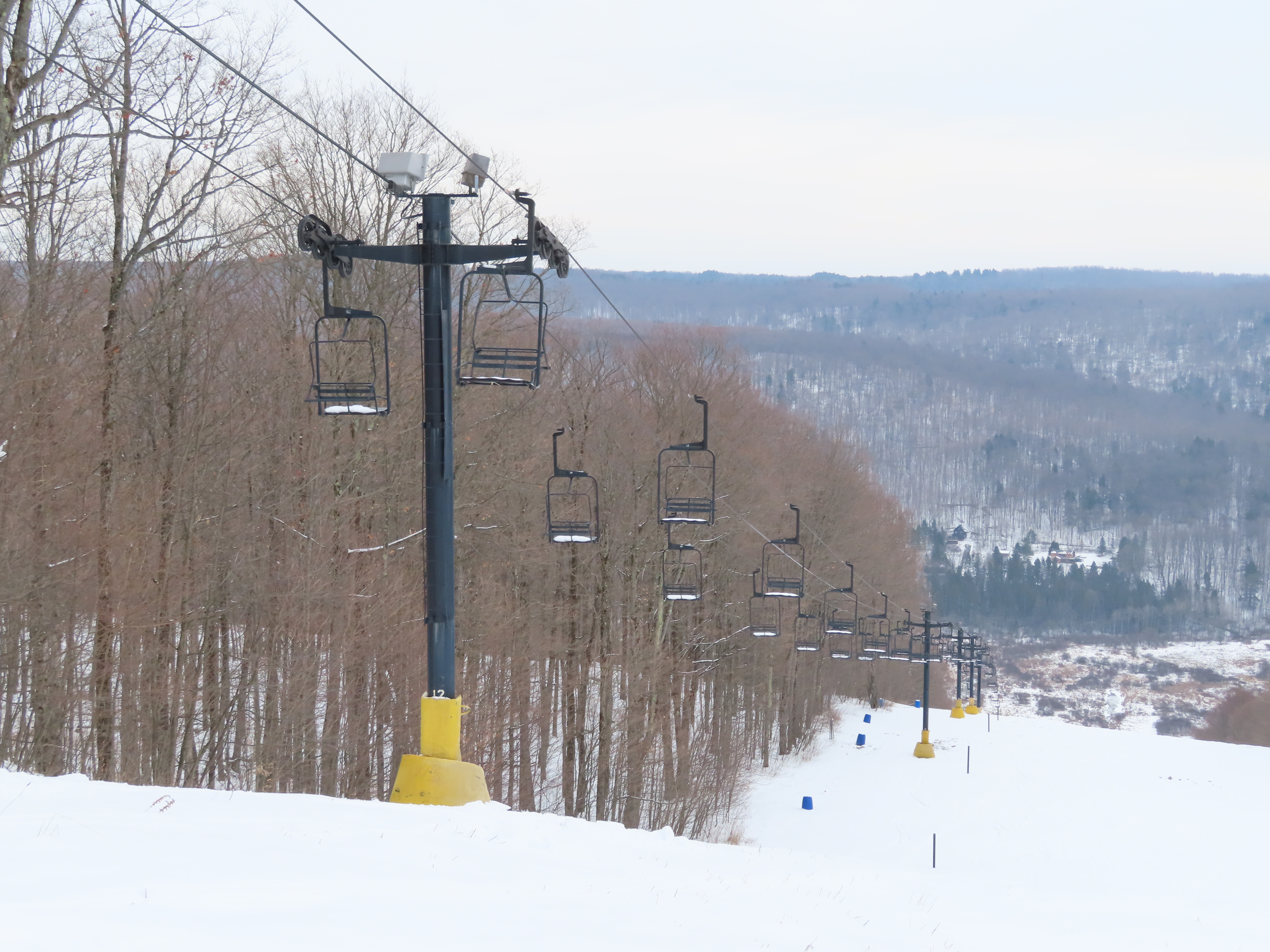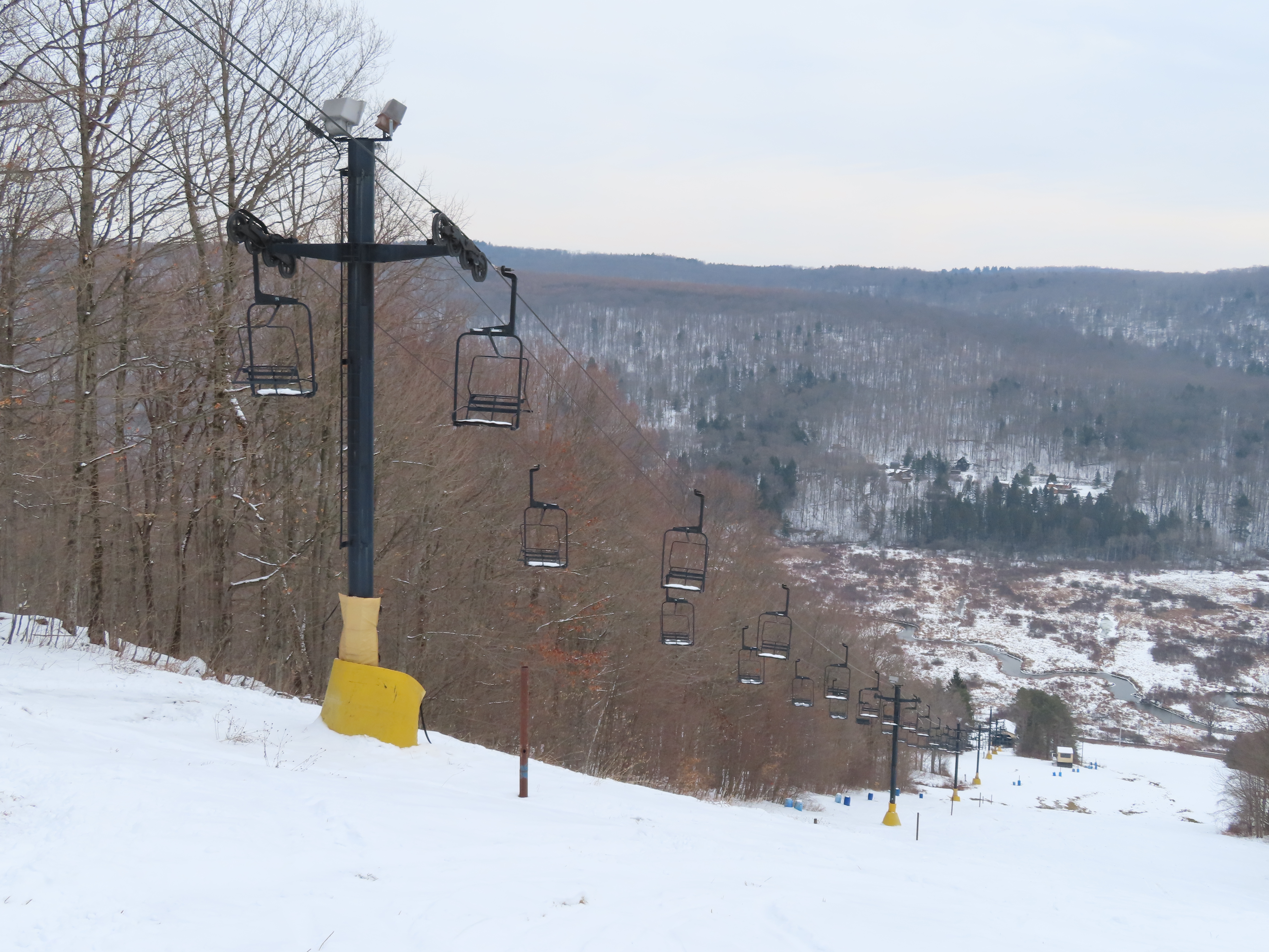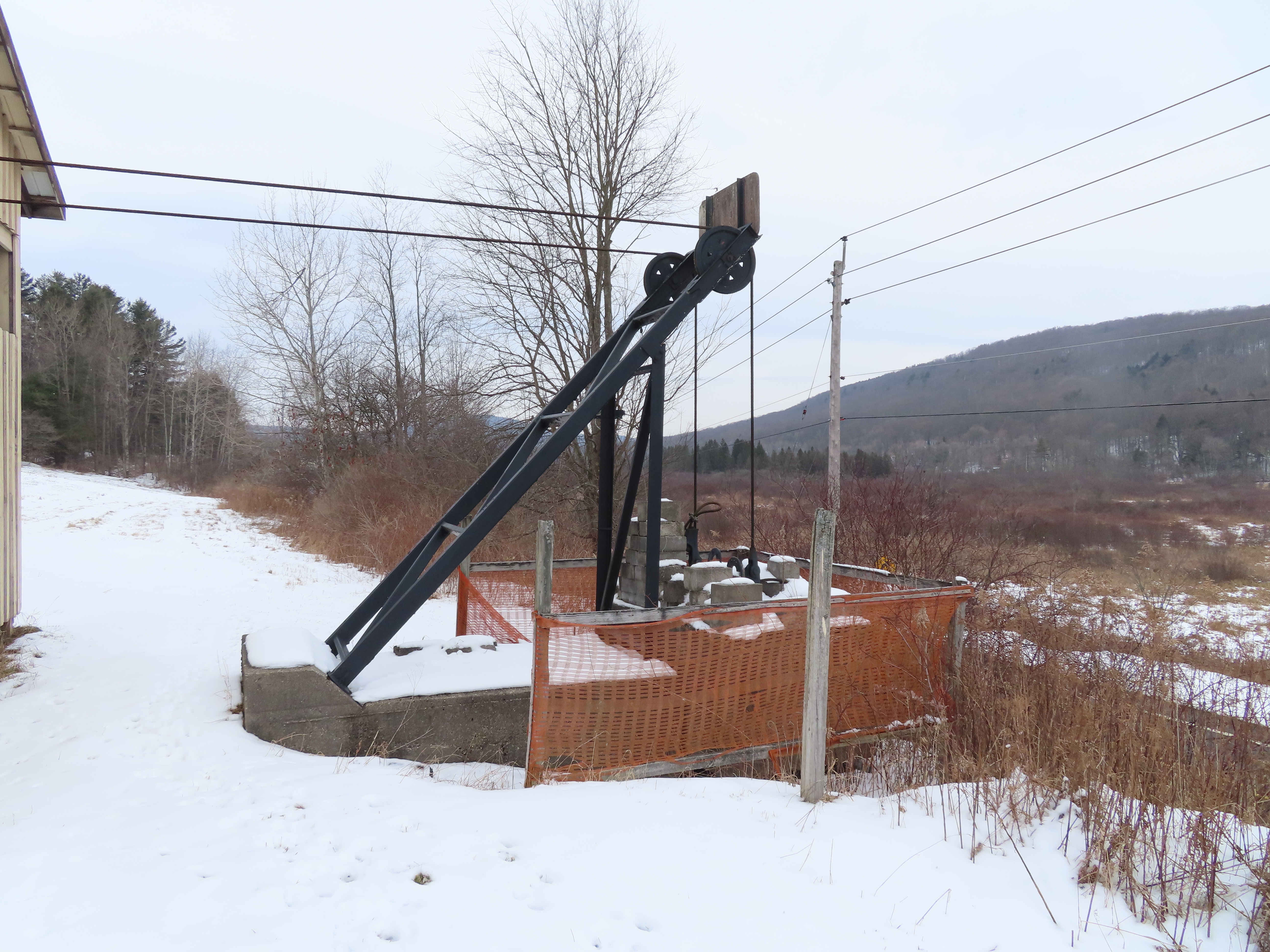 As the name suggests, this lift services trails south of the main mountain.Unloading area.View from the summit.Middle part of the lift line.Lower lift line.Bottom terminal area.Drive equipment under a wooden roof.View up from the lower station.Counterweight.