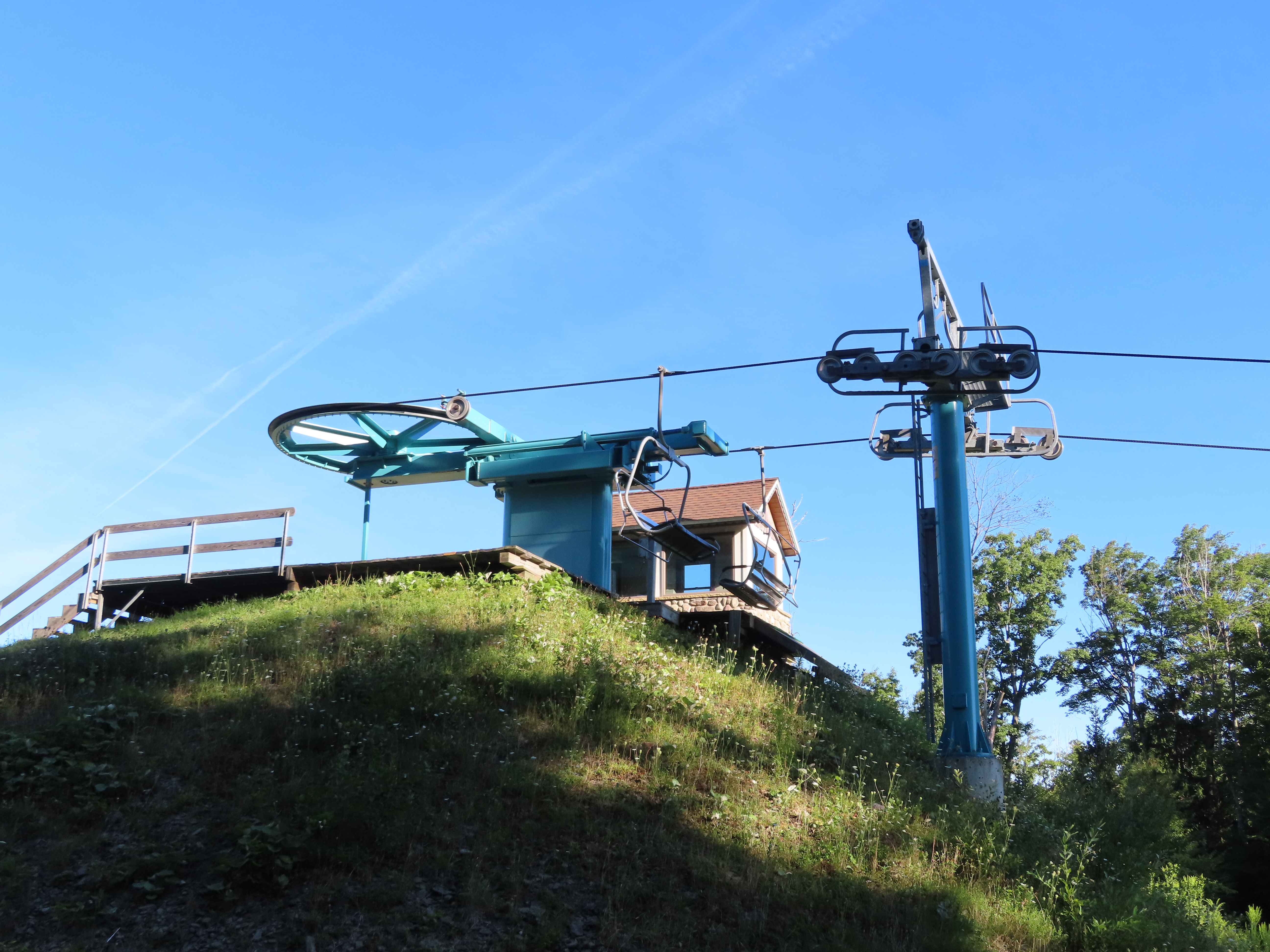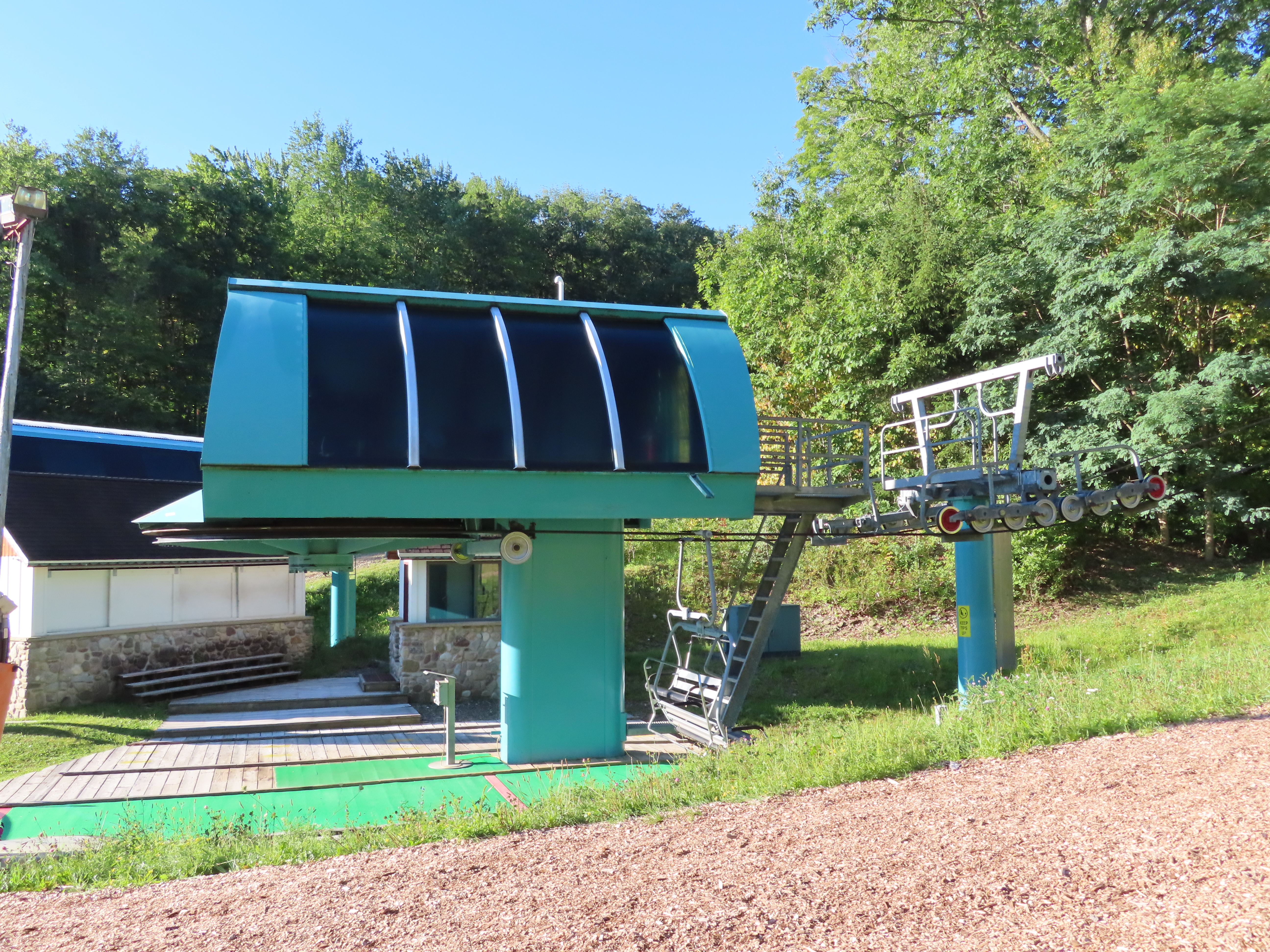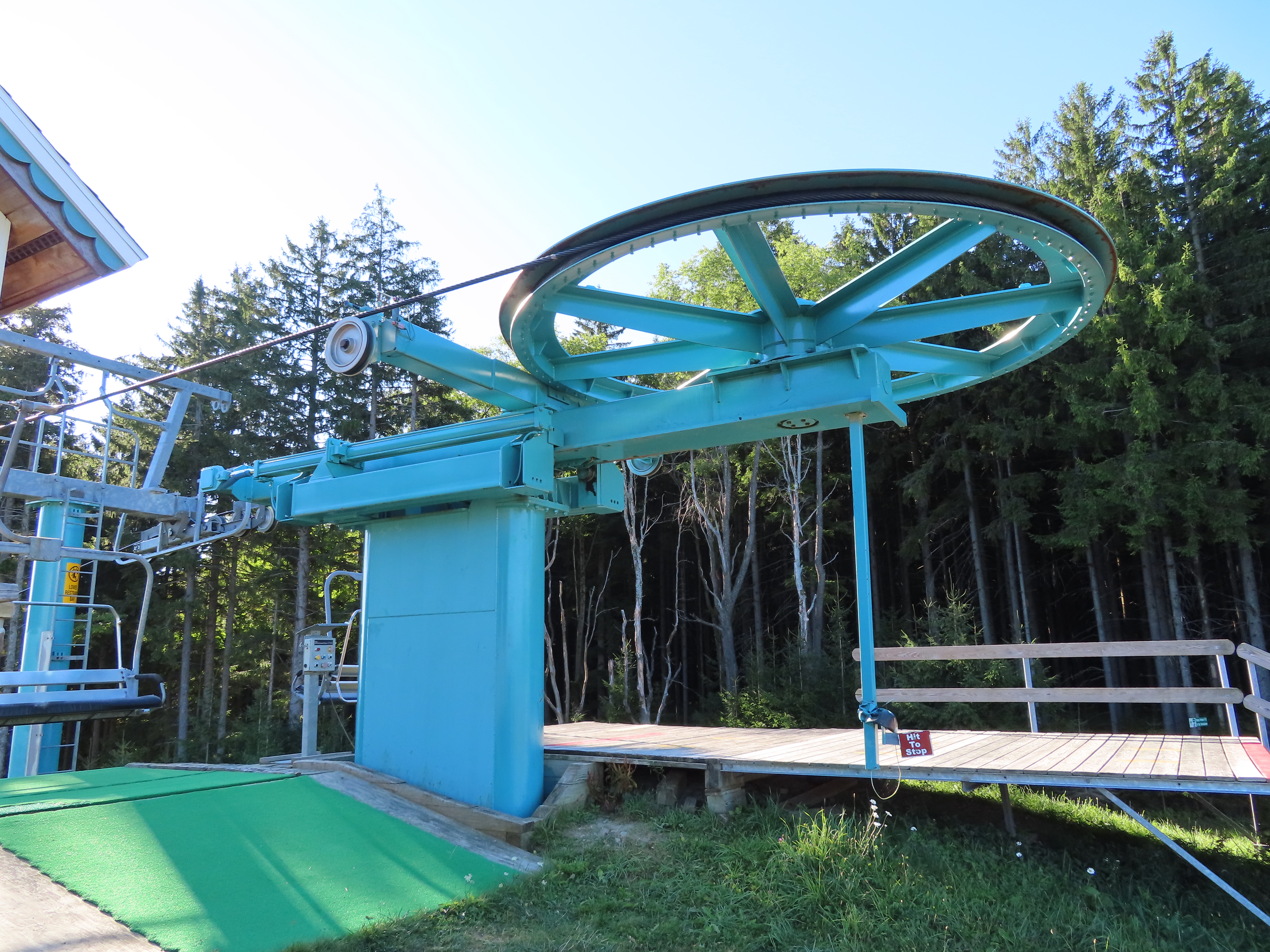 The Spruce Lake expansion area opened in 2007 with this Doppelmayr CTEC quad.Uni-Star drive station.Tower 1 is right up against the bottom terminal.A mountain coaster lift hill parallels almost the entire line.View up the lift line.Nearing the summit.View down the line.The final few towers.Looking down.The top terminal has a hydraulic tensioning system.Return bullwheel.Top terminal set up for summer.Doppelmayr Worldbook entry.