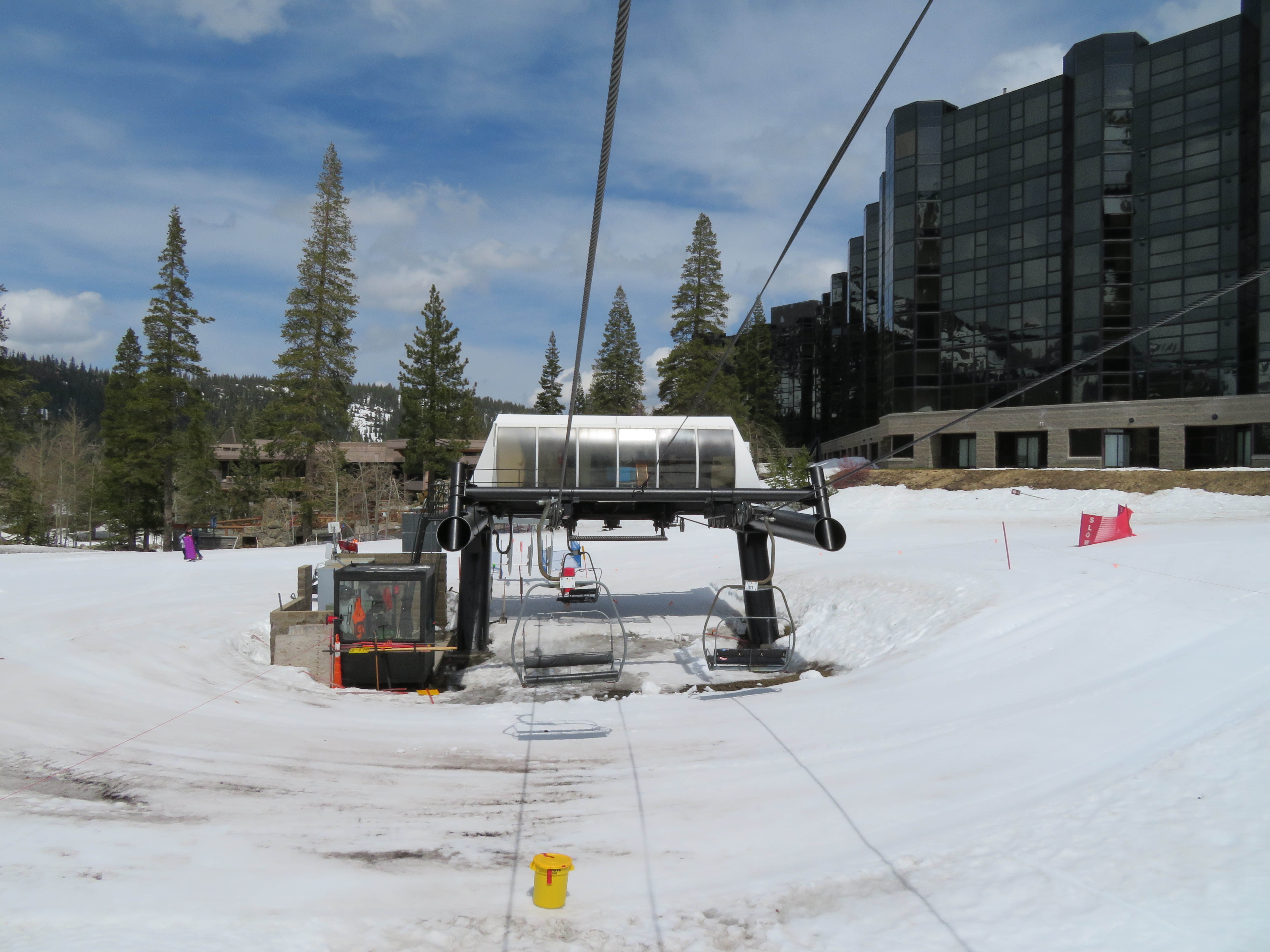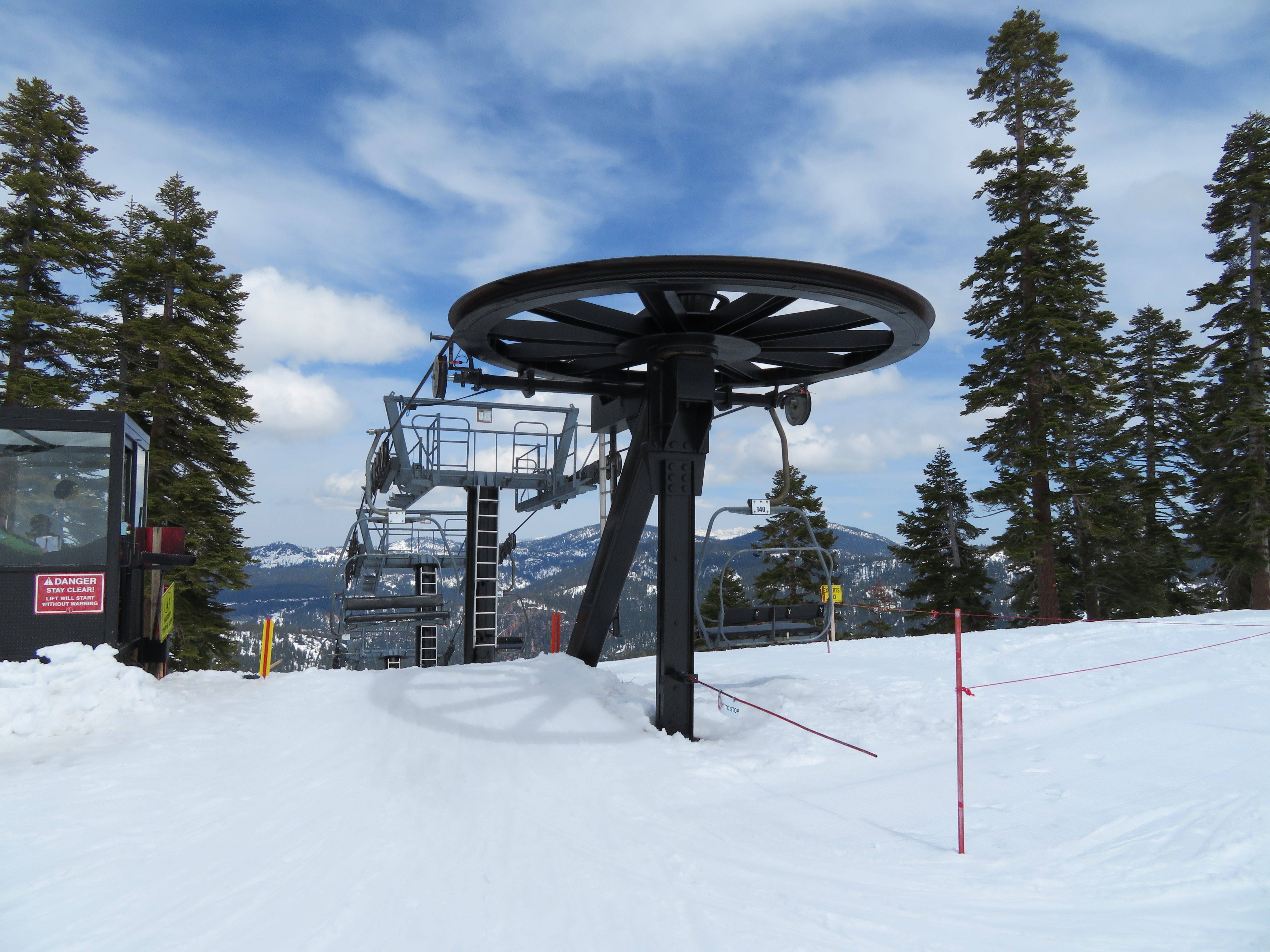 Top station next to an identical one for Red Dog.Top station overview.View down the very long lift line.Half tower and light side flyover near the summit.Middle part of the lift line.Looking up the line from the Resort at Squaw Creek.Poma Alpha drive with hydraulic tension system.Lift overview.Leaving the base.View back down the line.Tower 11.Upper part of the line.Light side and heavy side diverging.Tower 18 up top.