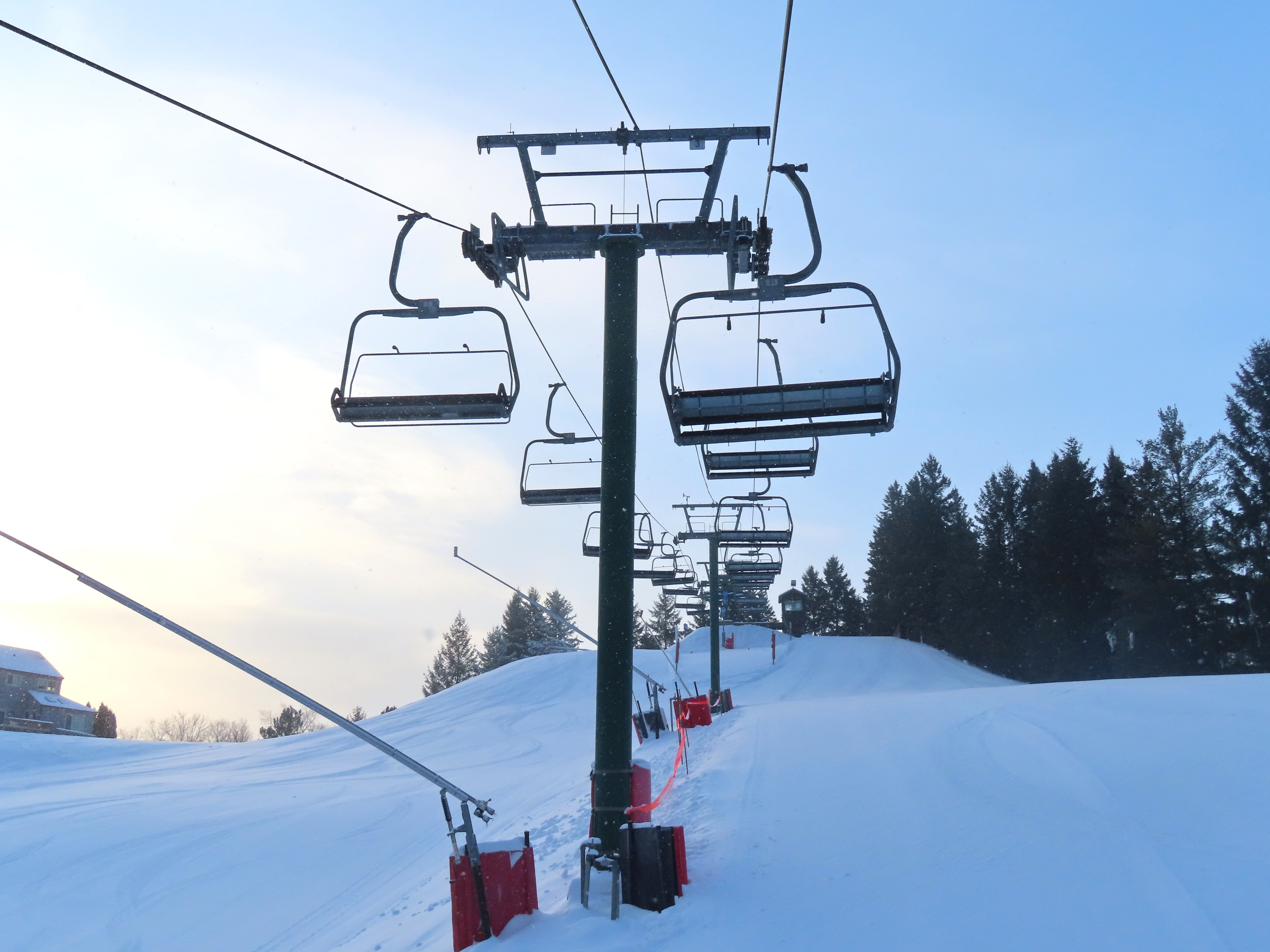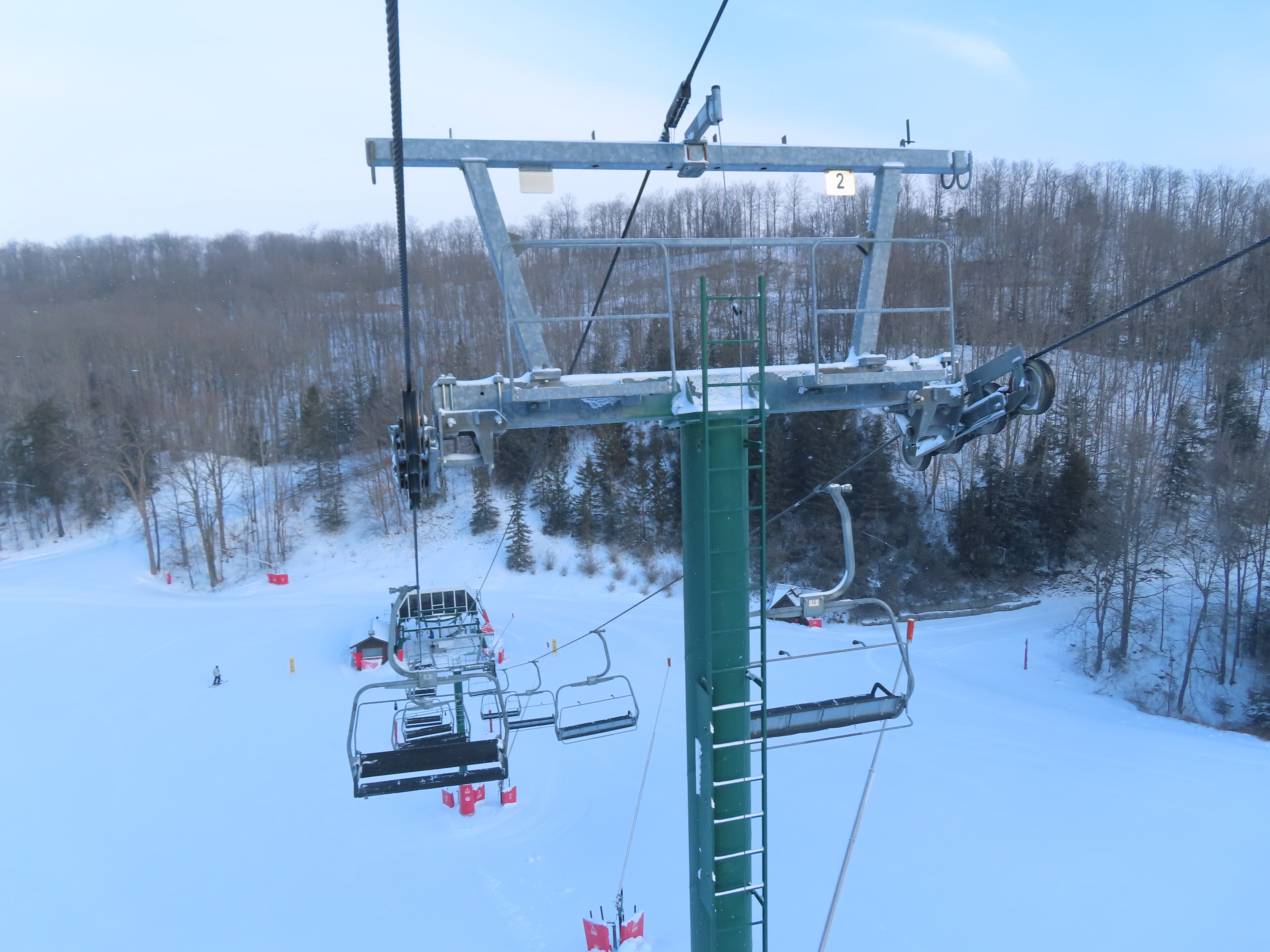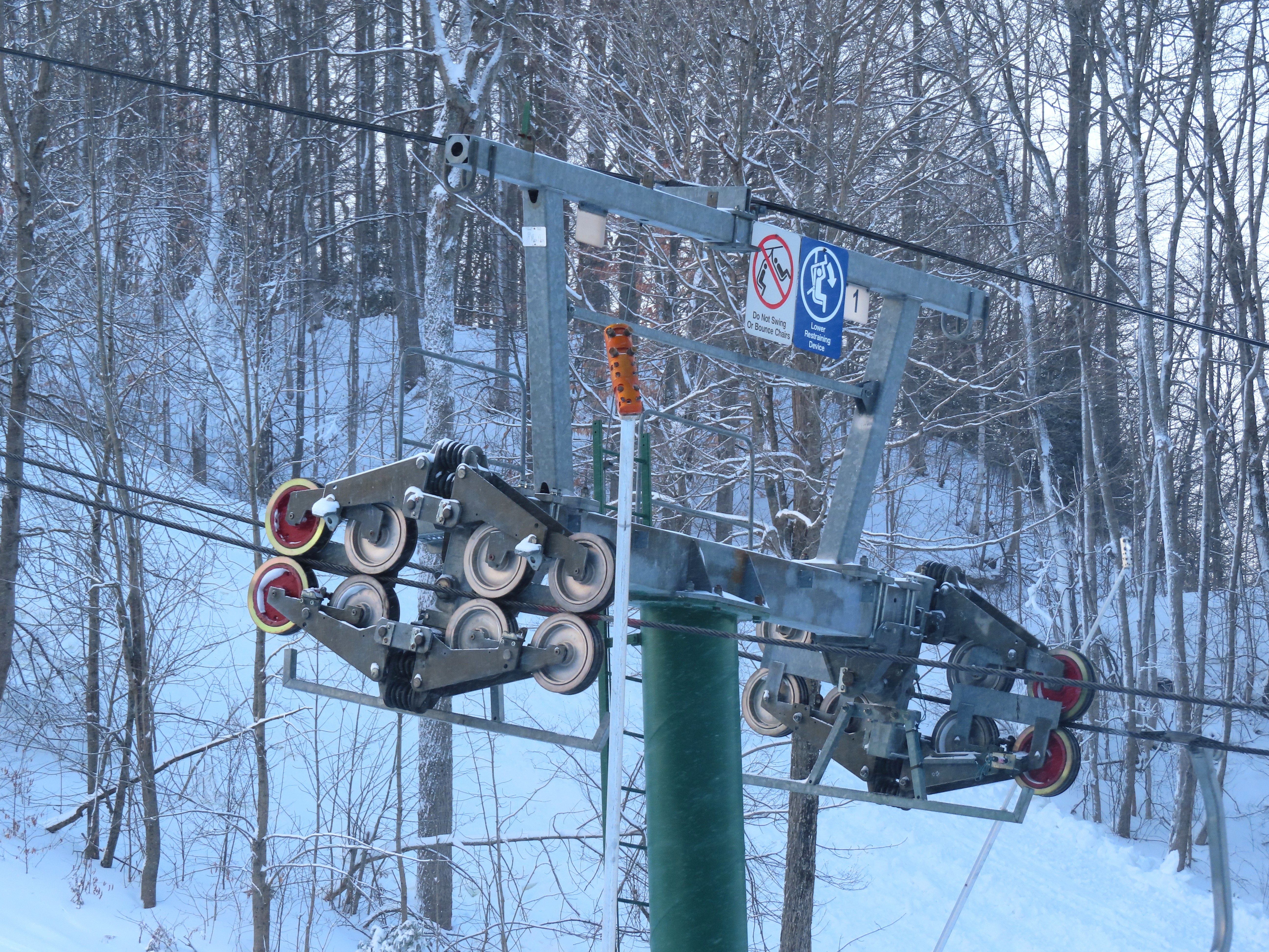 This lift followed two other similar Doppelmayr projects and replaced a Hall triple.View riding up the line.Upper station.Side view of the top terminal.View down from the summit.Lower part of the lift line.Combination assemblies.Side view of the drive terminal.Loading area and motor room.Tower 2.Middle section of the line.