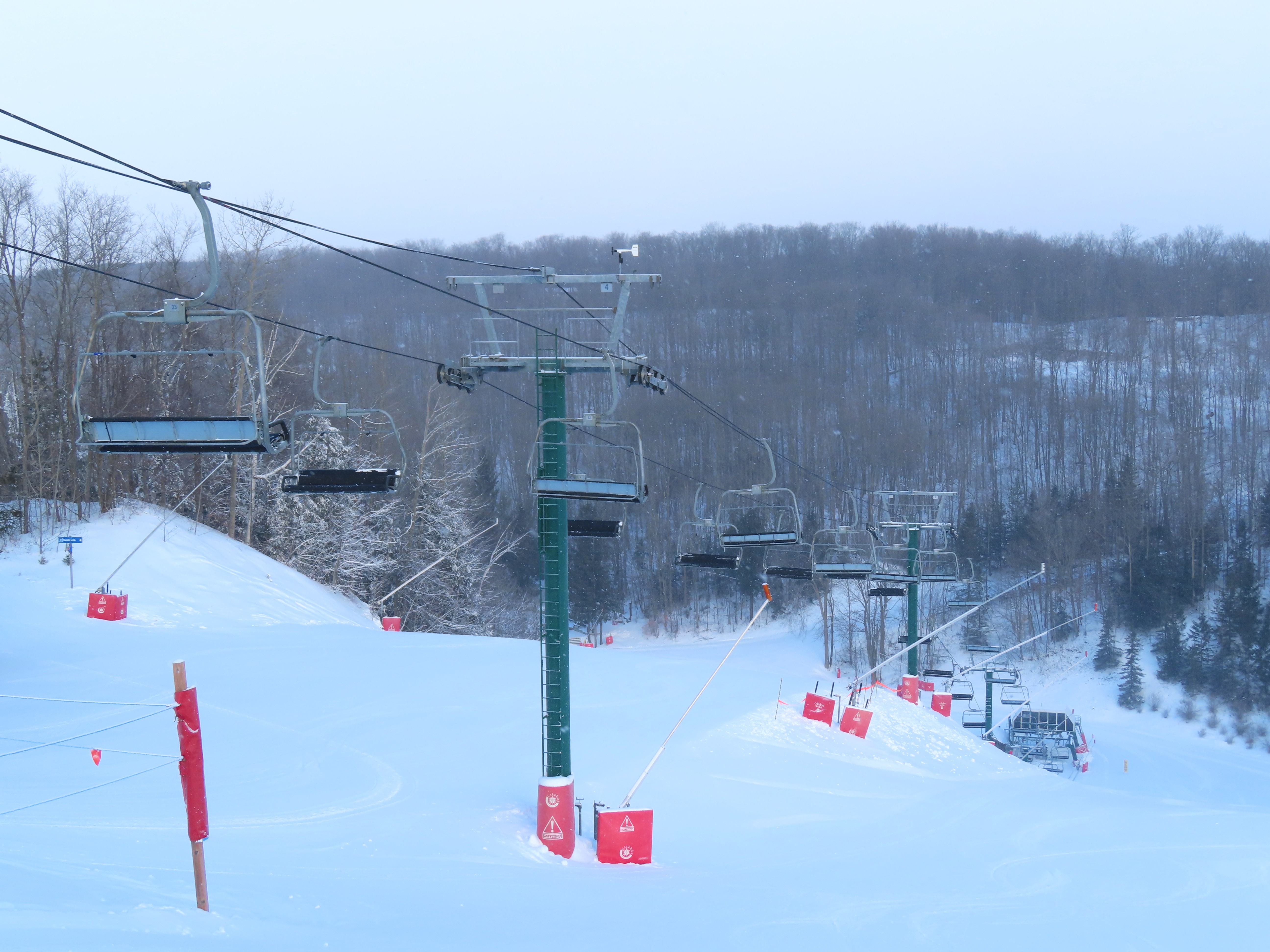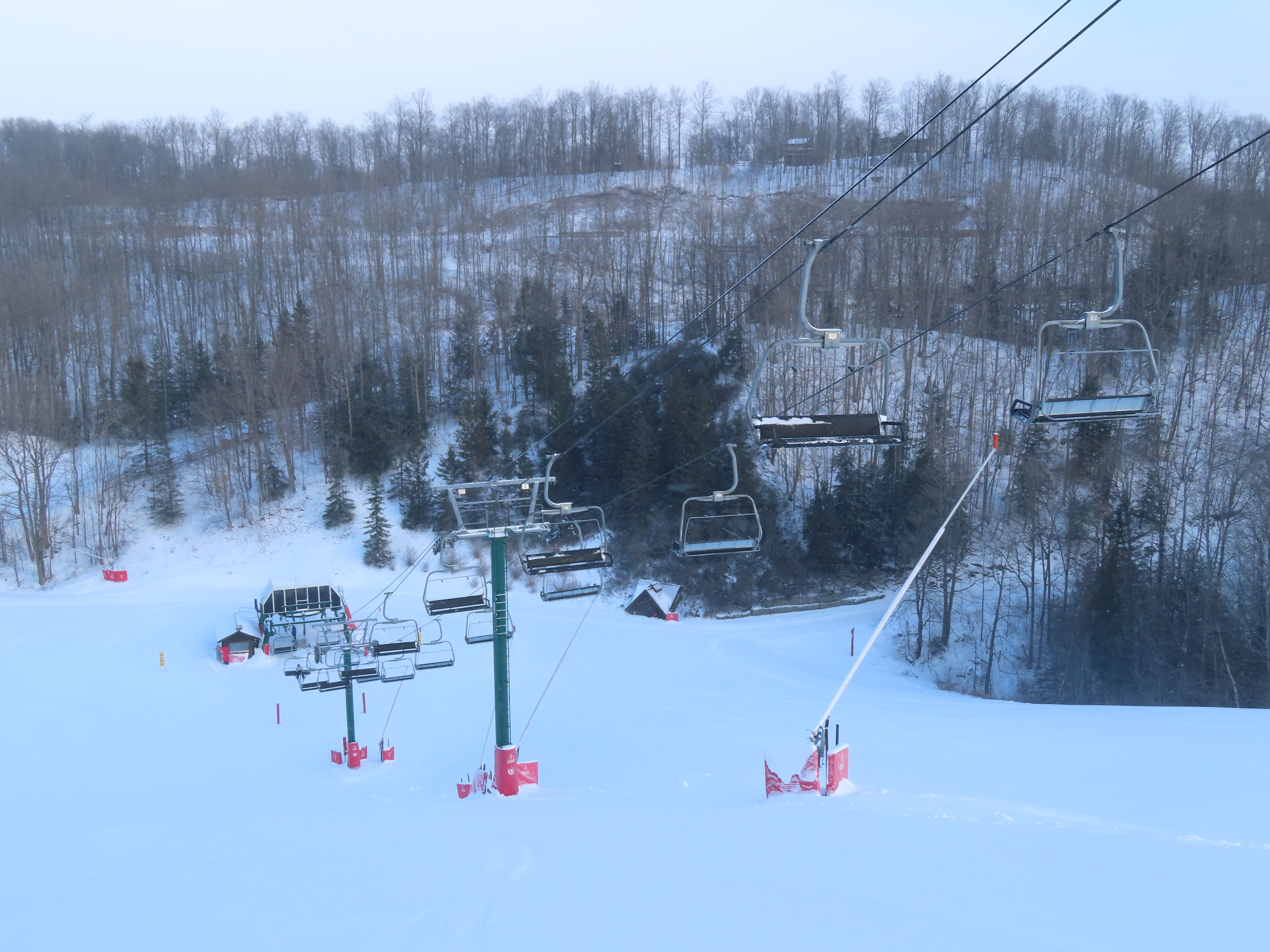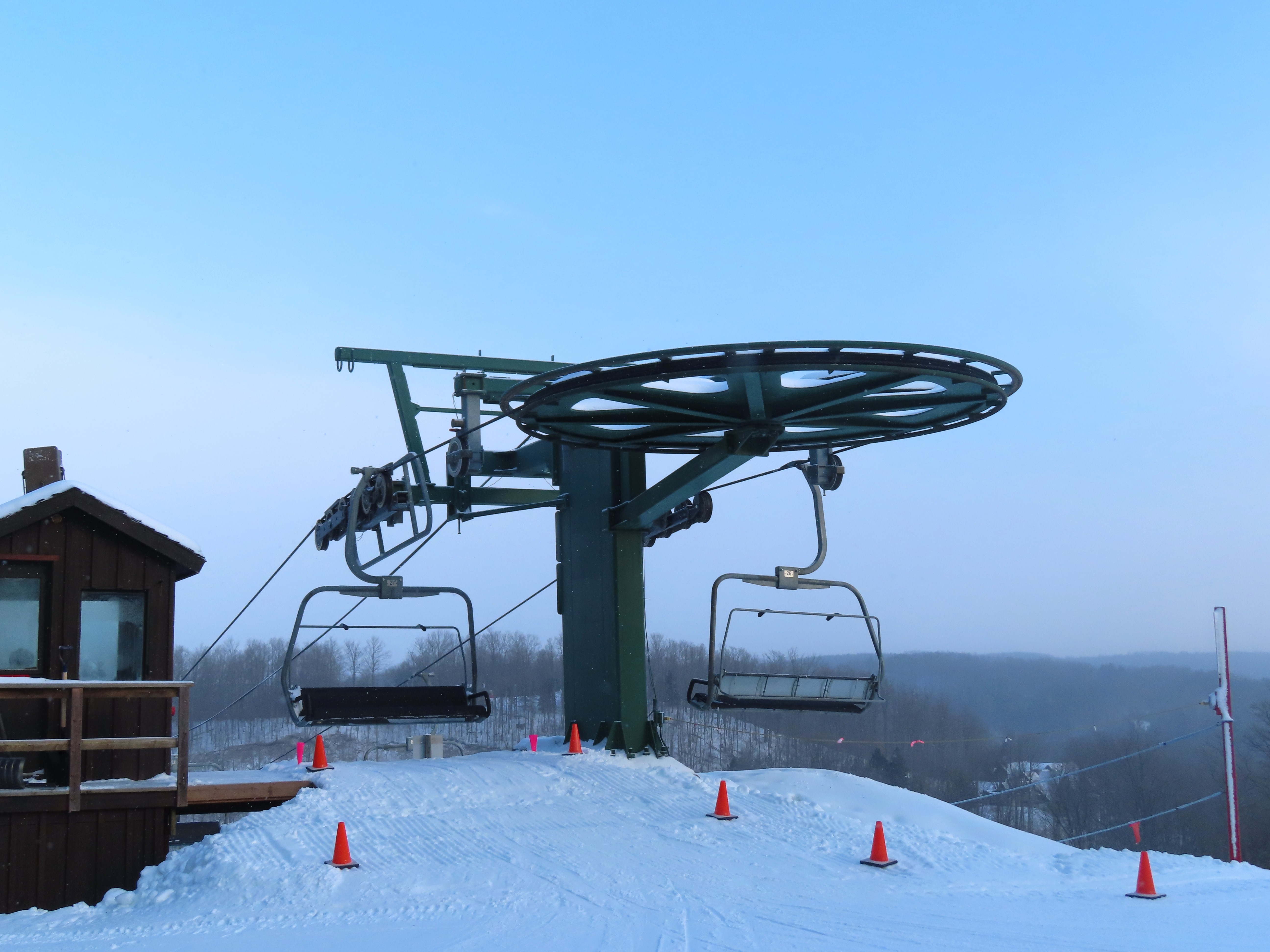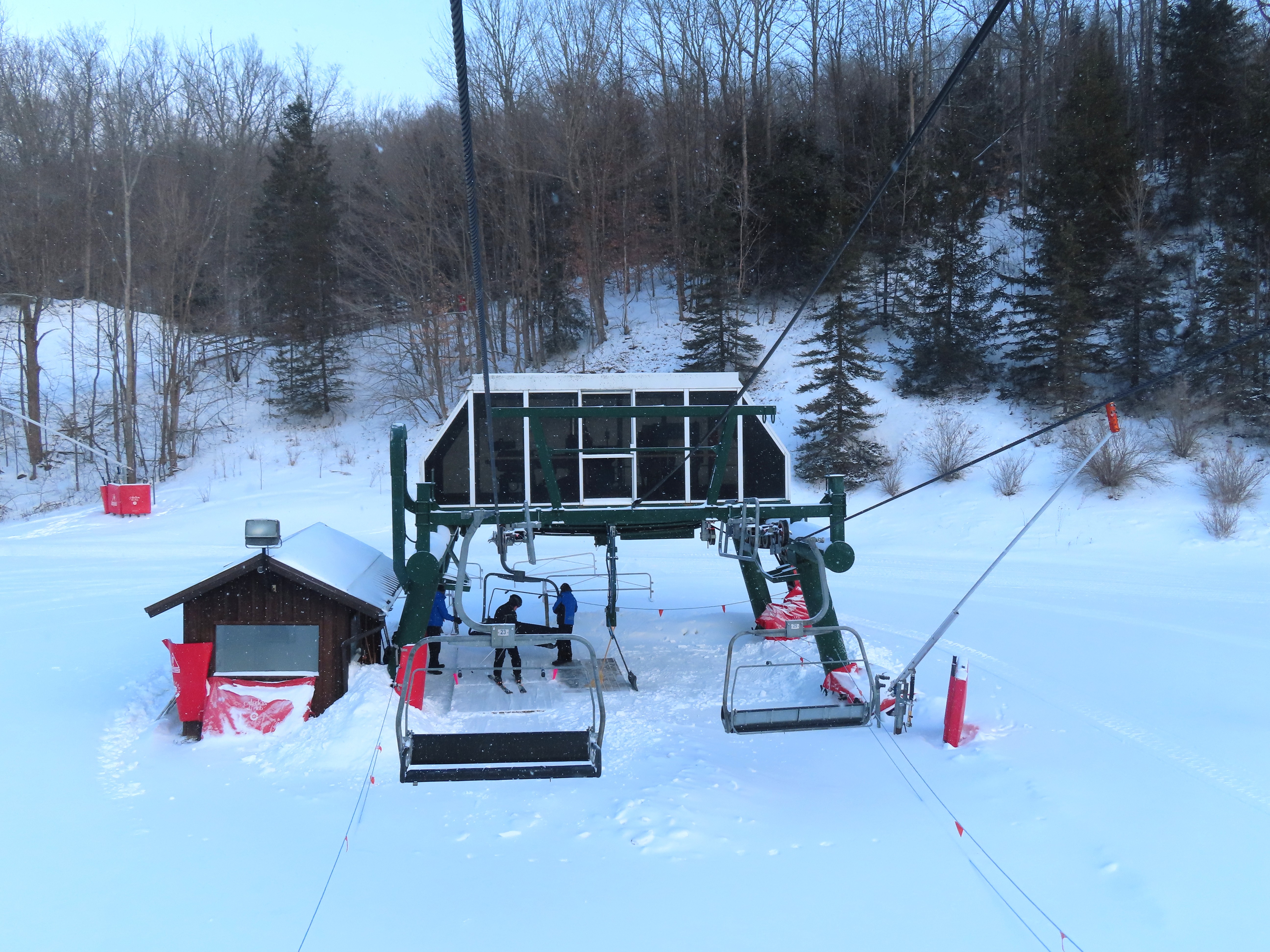 This lift followed two other similar Doppelmayr projects and replaced a Hall triple.View riding up the line.Upper station.Side view of the top terminal.View down from the summit.Lower part of the lift line.Combination assemblies.Side view of the drive terminal.Loading area and motor room.Tower 2.Middle section of the line.
