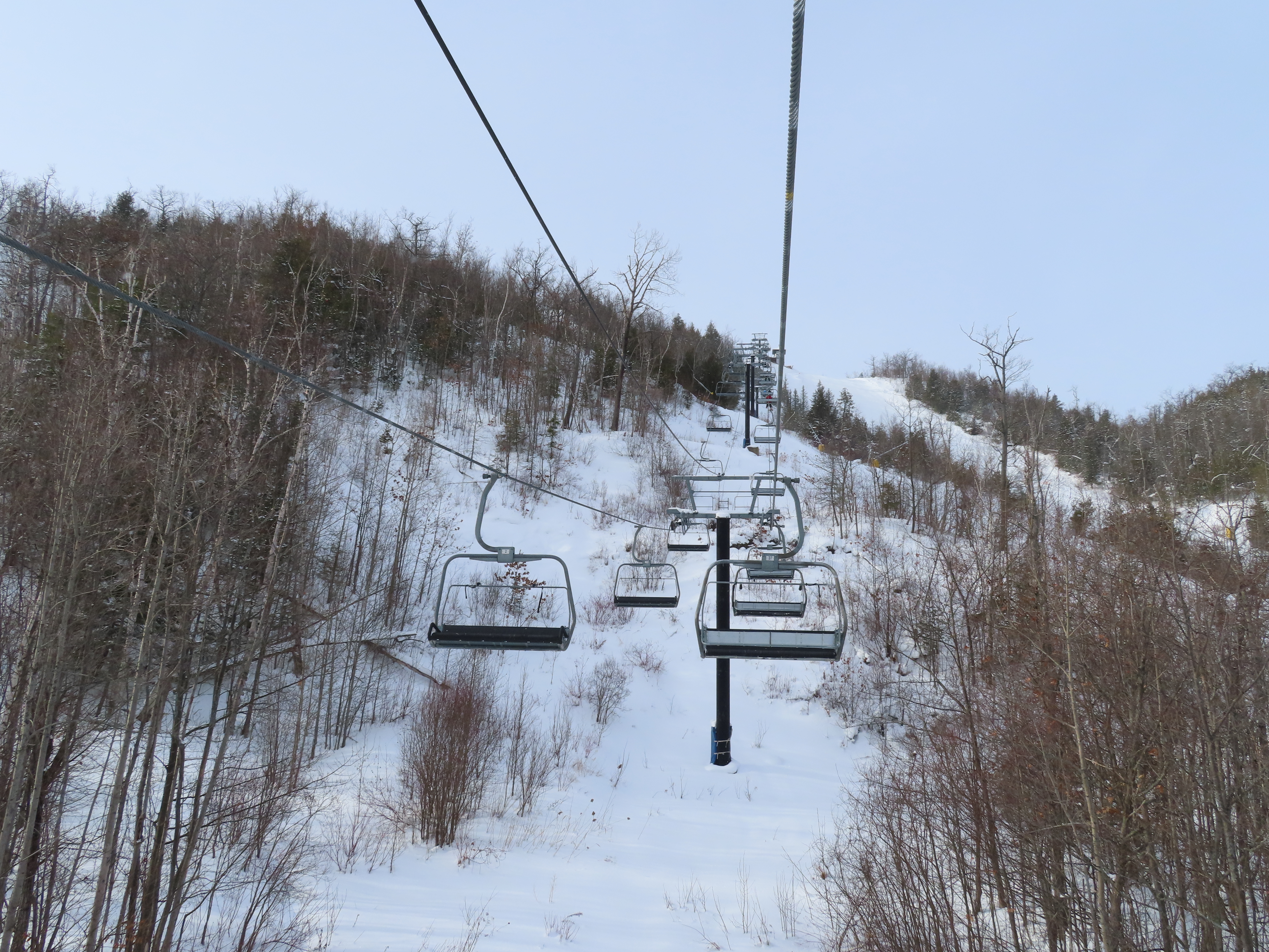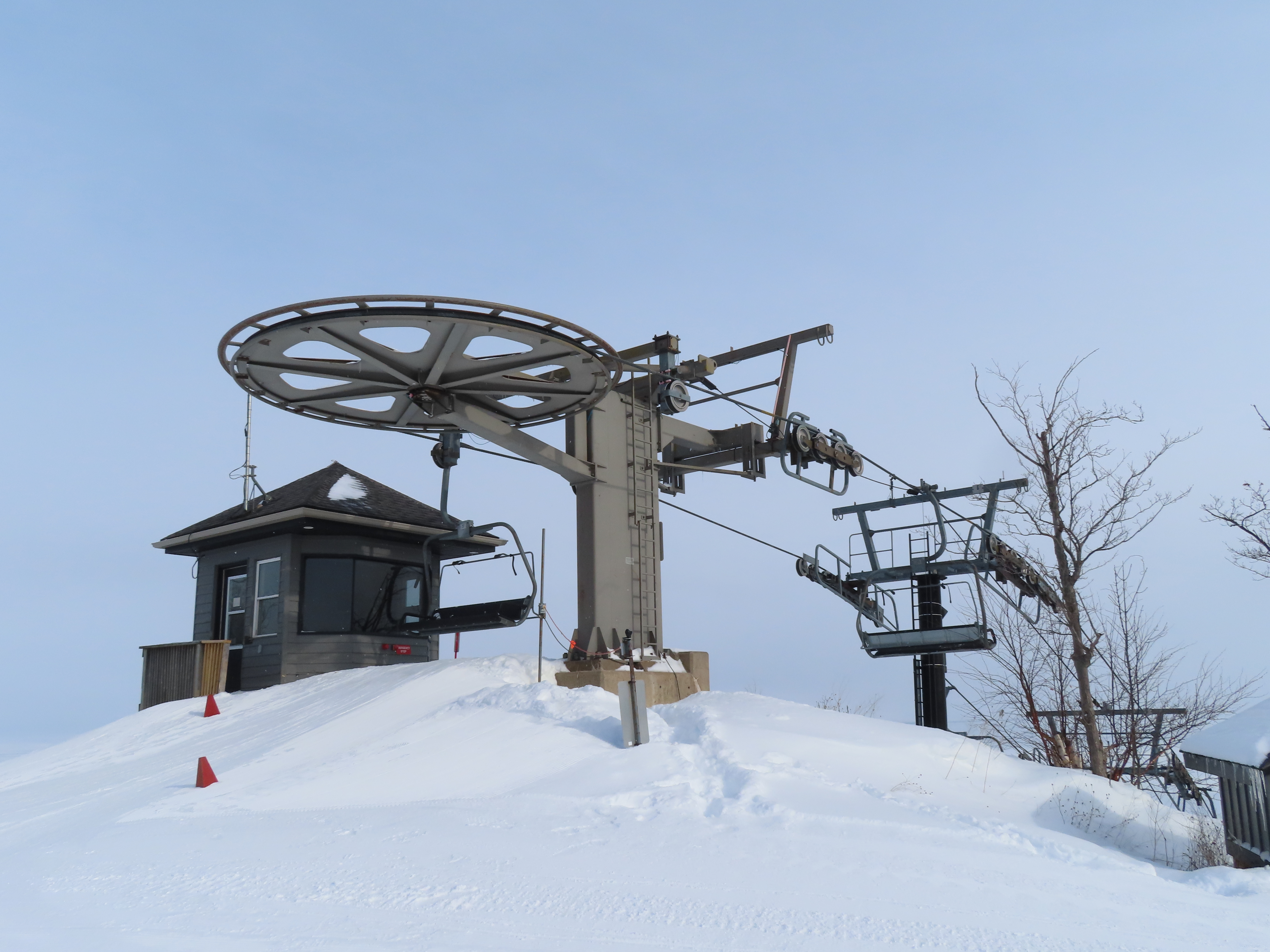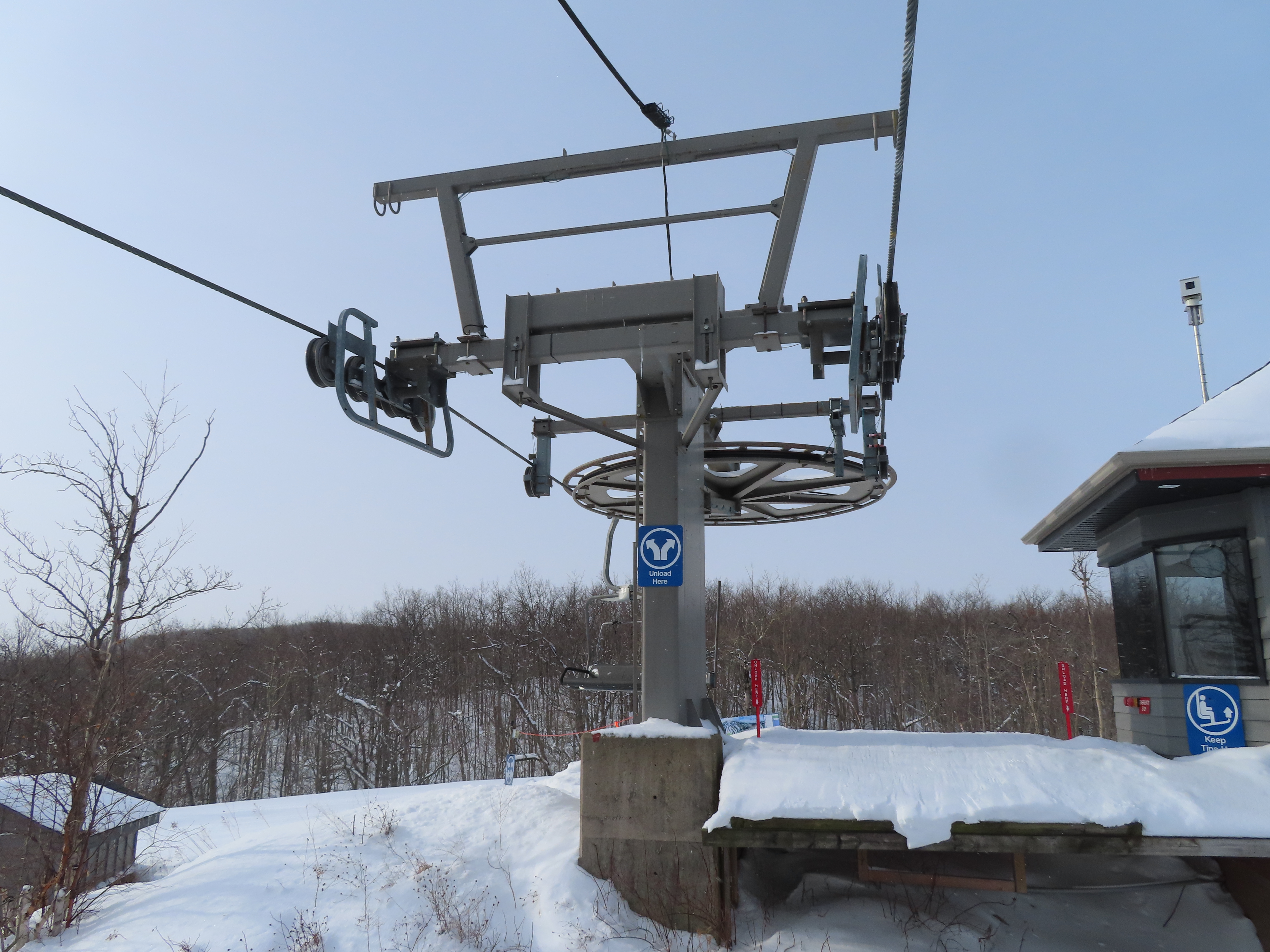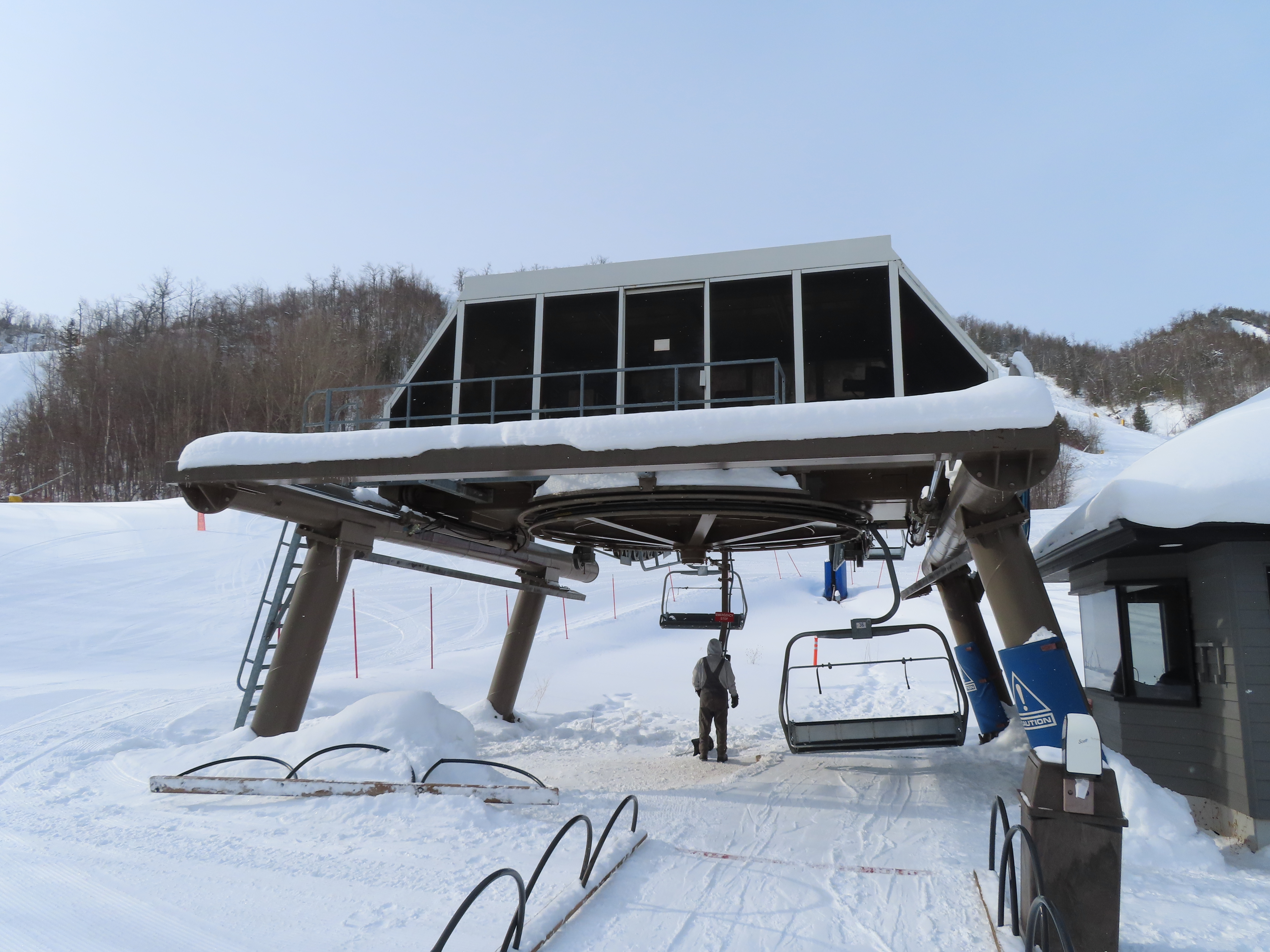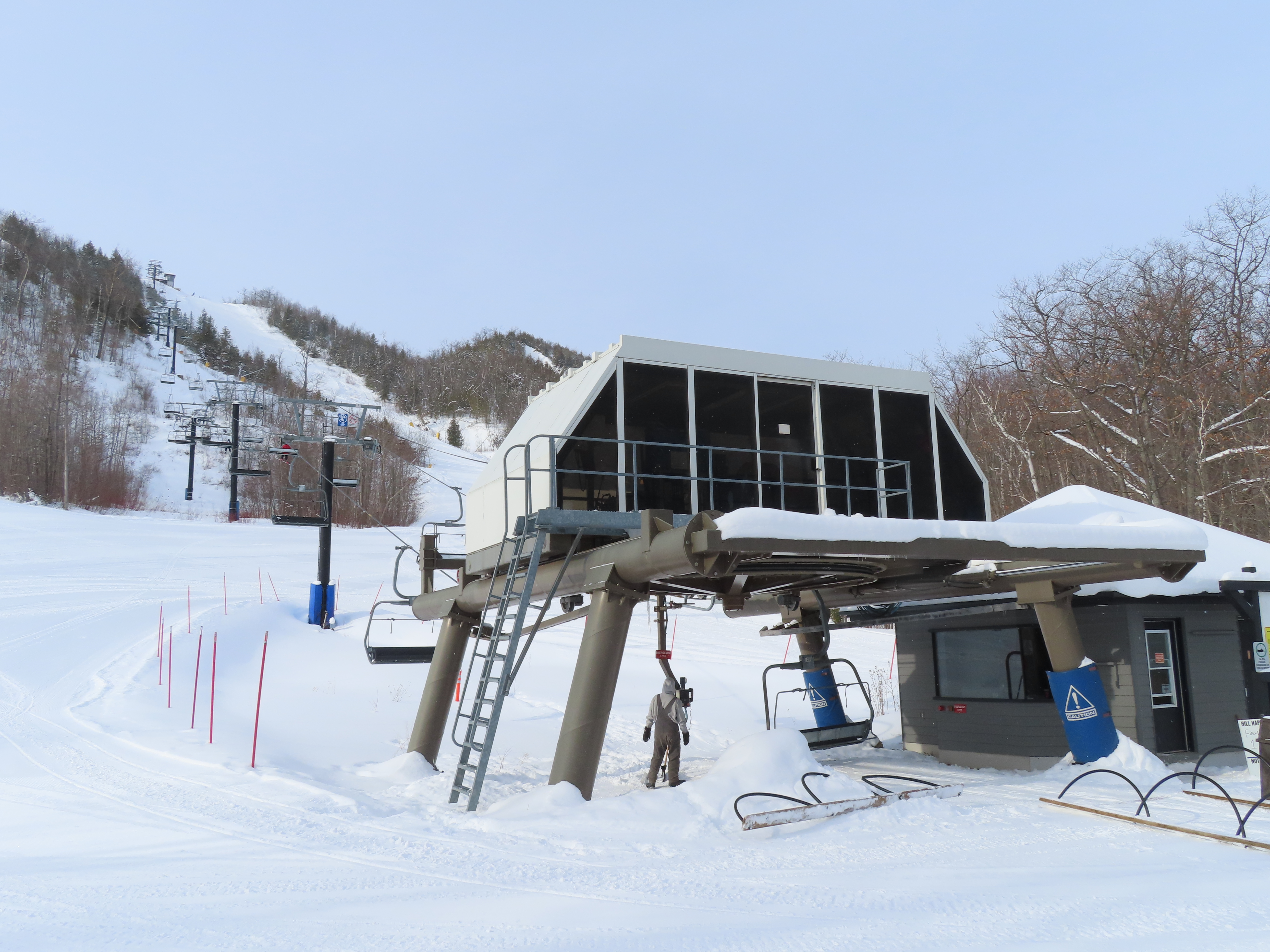 This expansion opened in 2004 with a short but steep quad chair.Side view of the Doppelmayr drive station.Lift overview.Loading area and motor room.Most of the lift line is not open for skiing due to topography.Hold down tower 3.View back down the first pitch of the line.Tower 5.Breakover towers at the summit.View from the top.Arriving at the return terminal.Top station overview.Tower 7.T6.View up the line at tower 2.Side view of the top terminal.Doppelmayr Worldbook entry.