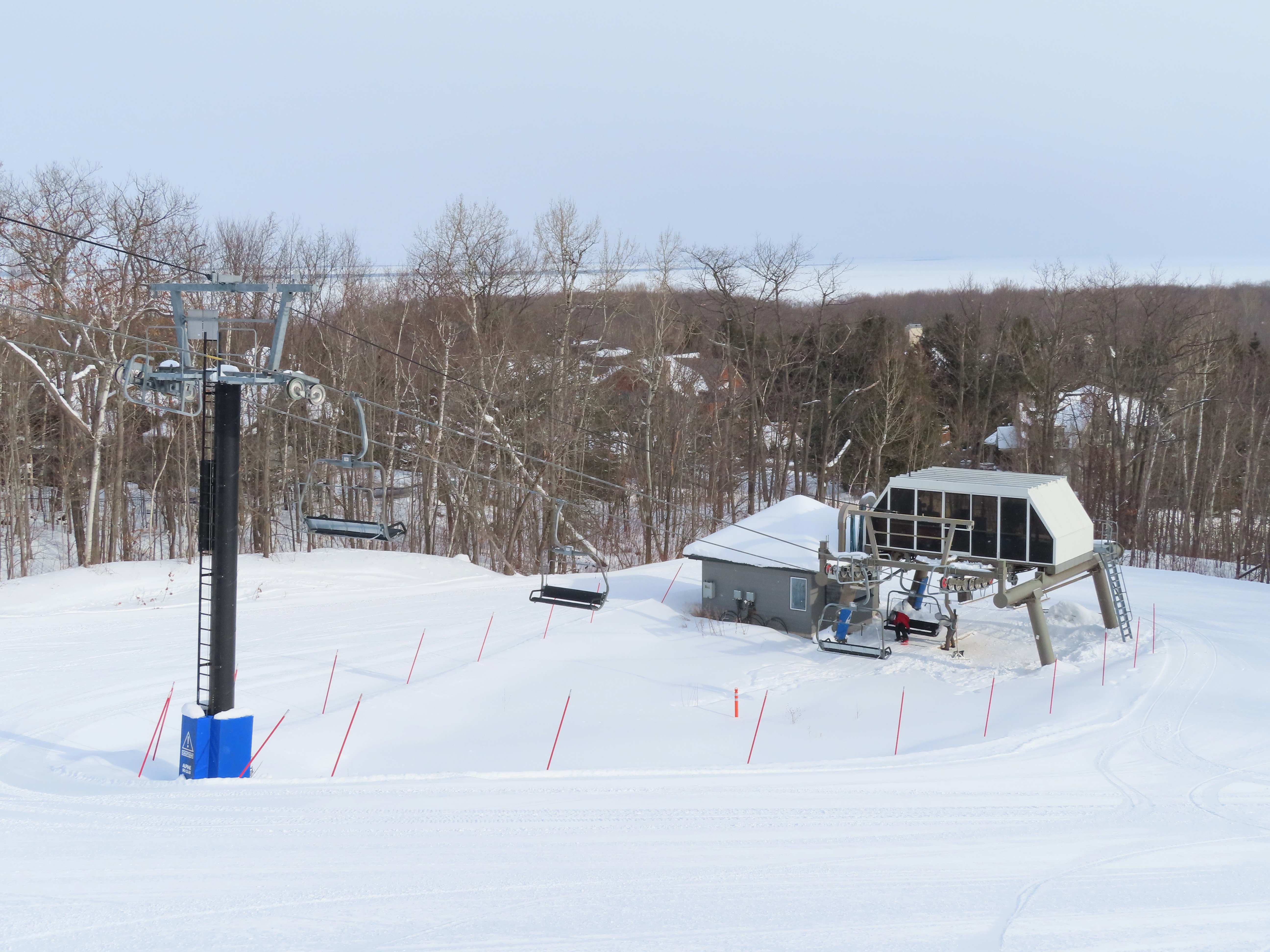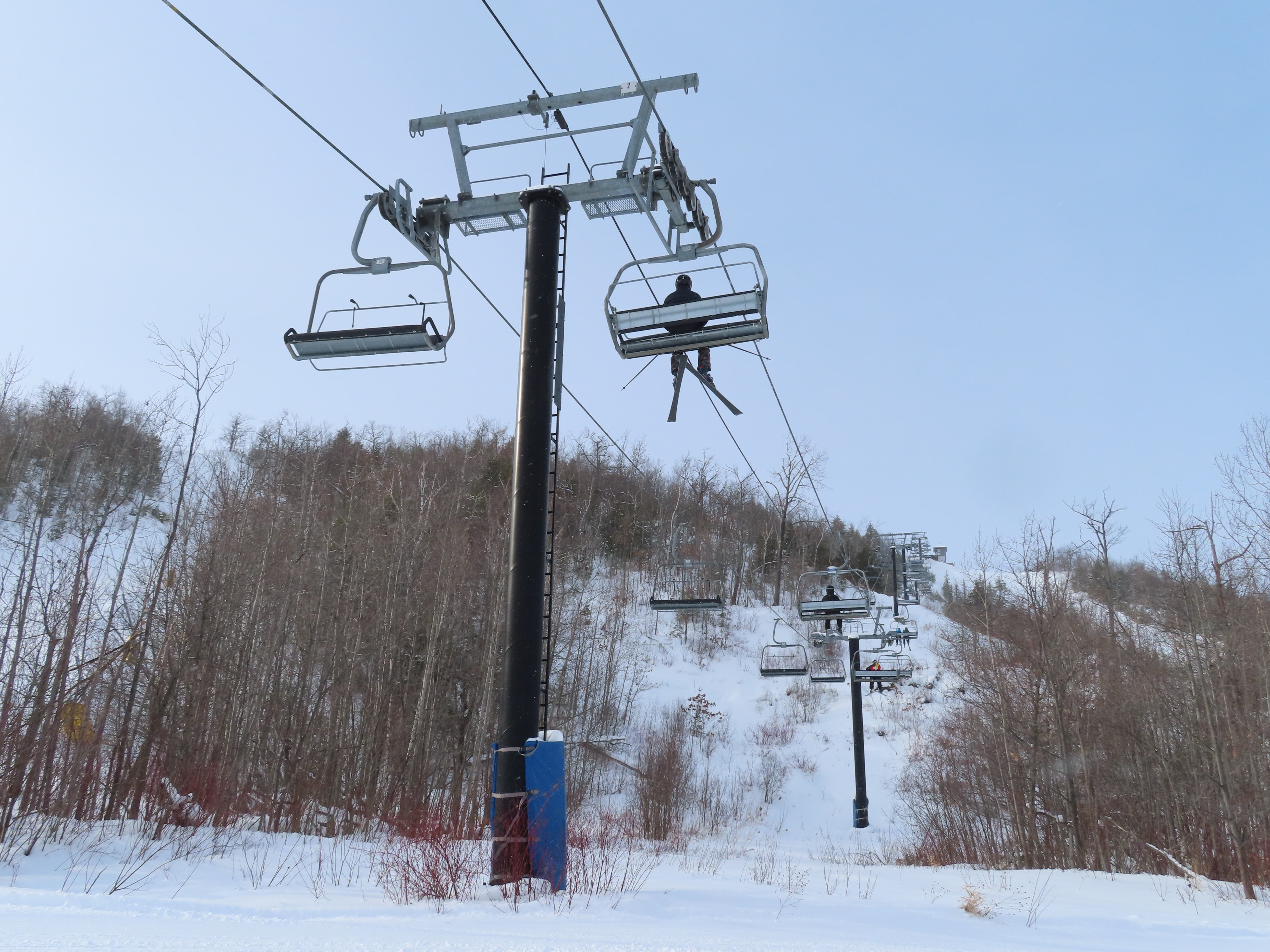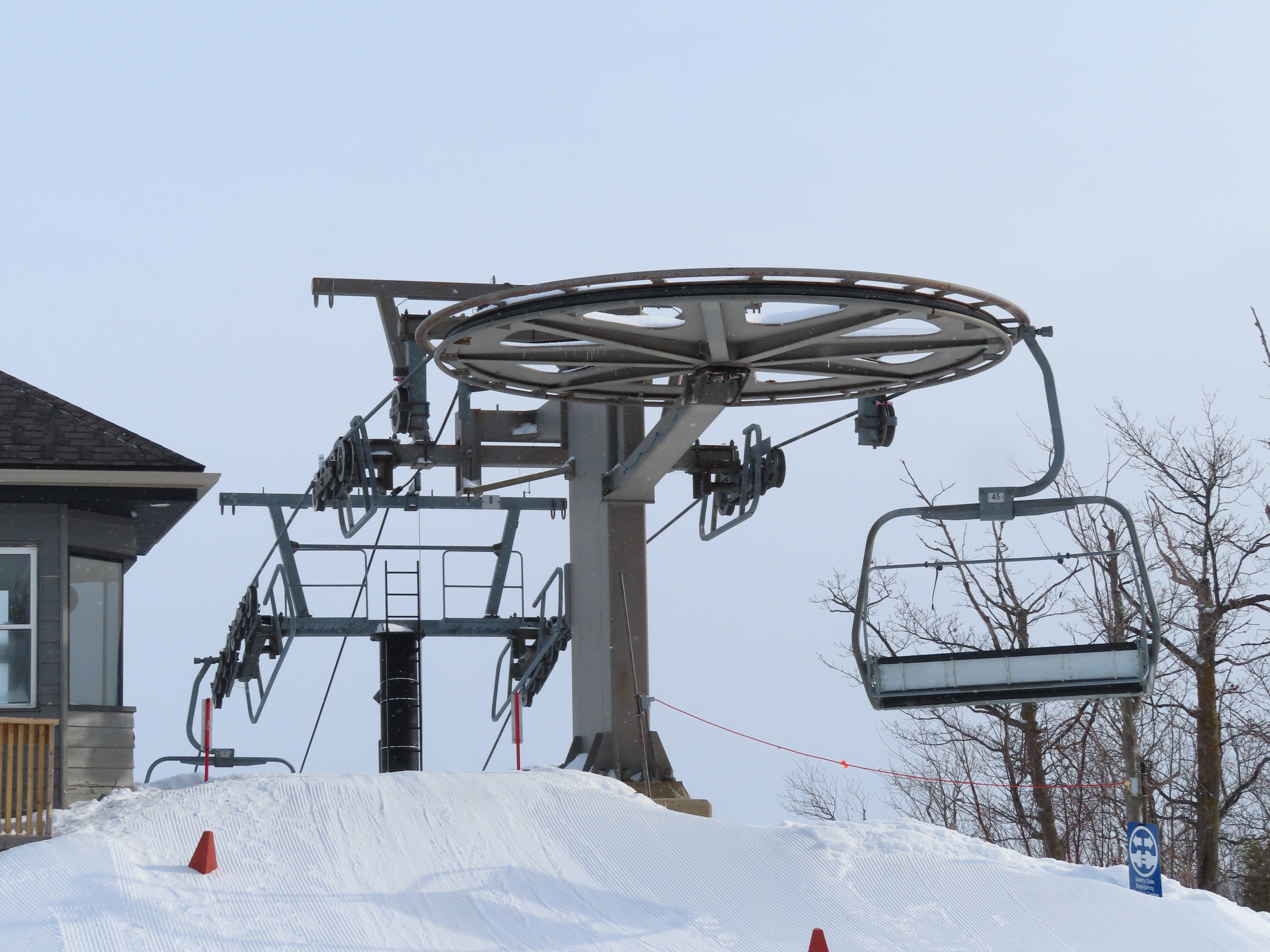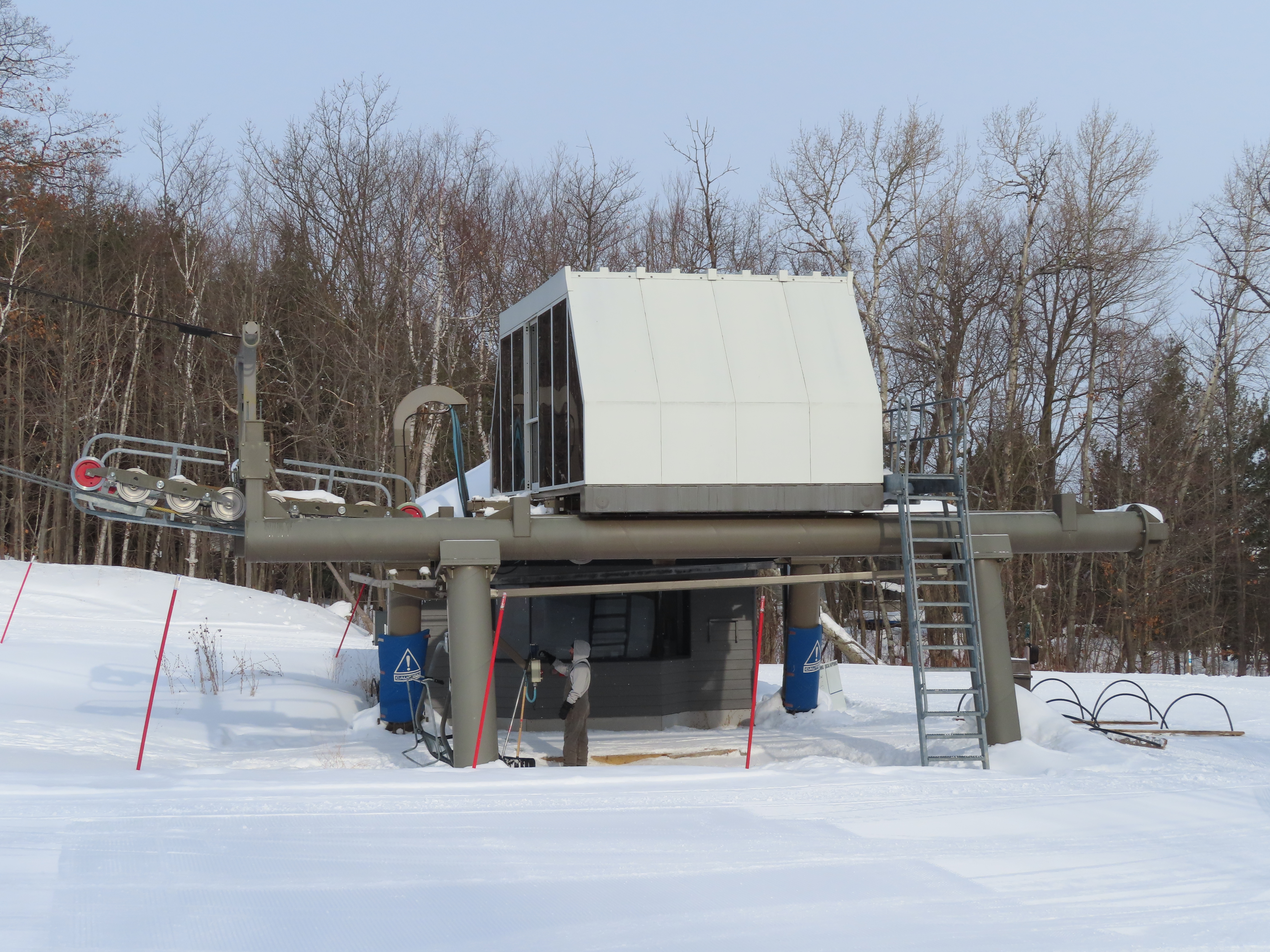 This expansion opened in 2004 with a short but steep quad chair.Side view of the Doppelmayr drive station.Lift overview.Loading area and motor room.Most of the lift line is not open for skiing due to topography.Hold down tower 3.View back down the first pitch of the line.Tower 5.Breakover towers at the summit.View from the top.Arriving at the return terminal.Top station overview.Tower 7.T6.View up the line at tower 2.Side view of the top terminal.Doppelmayr Worldbook entry.