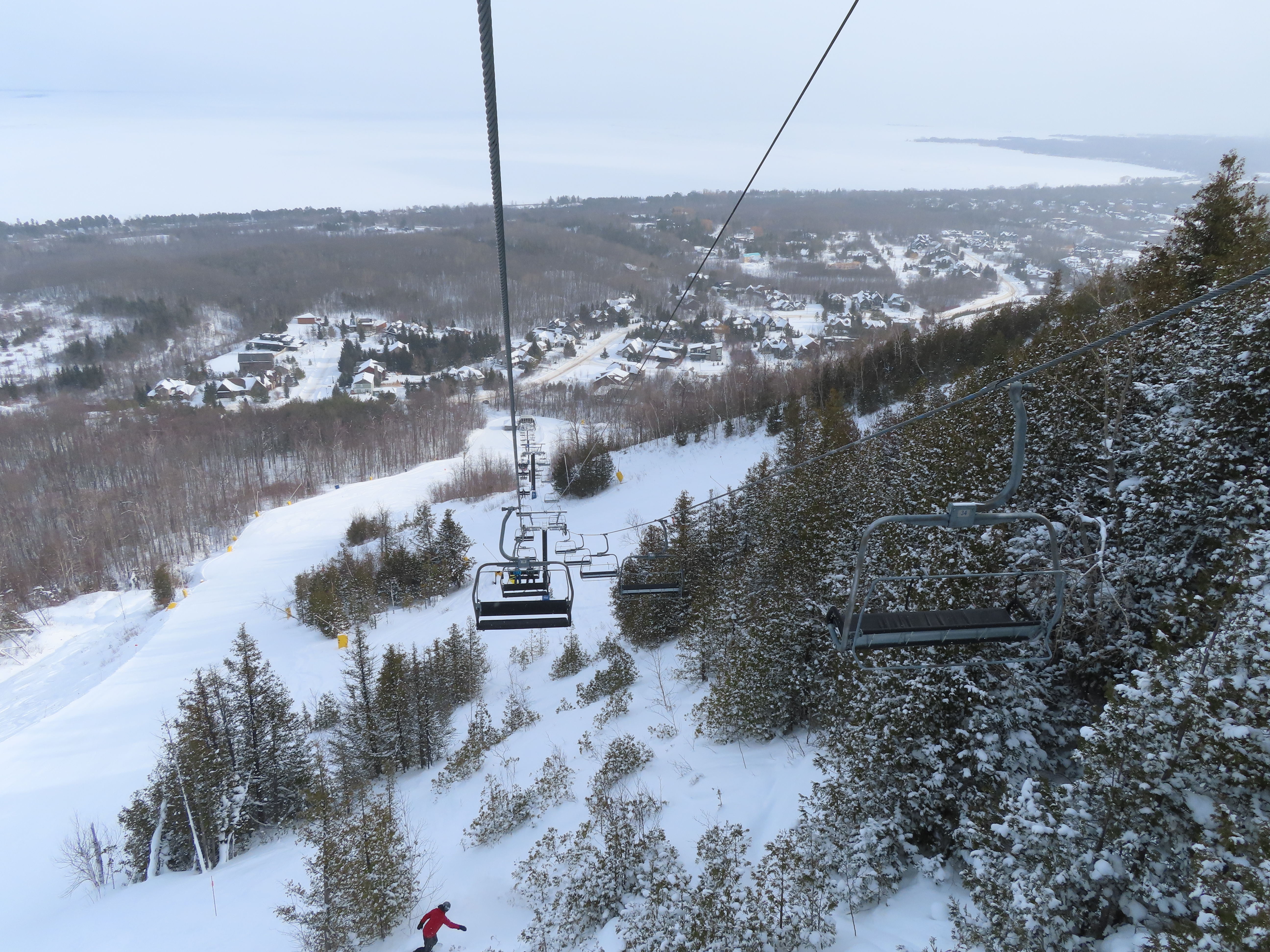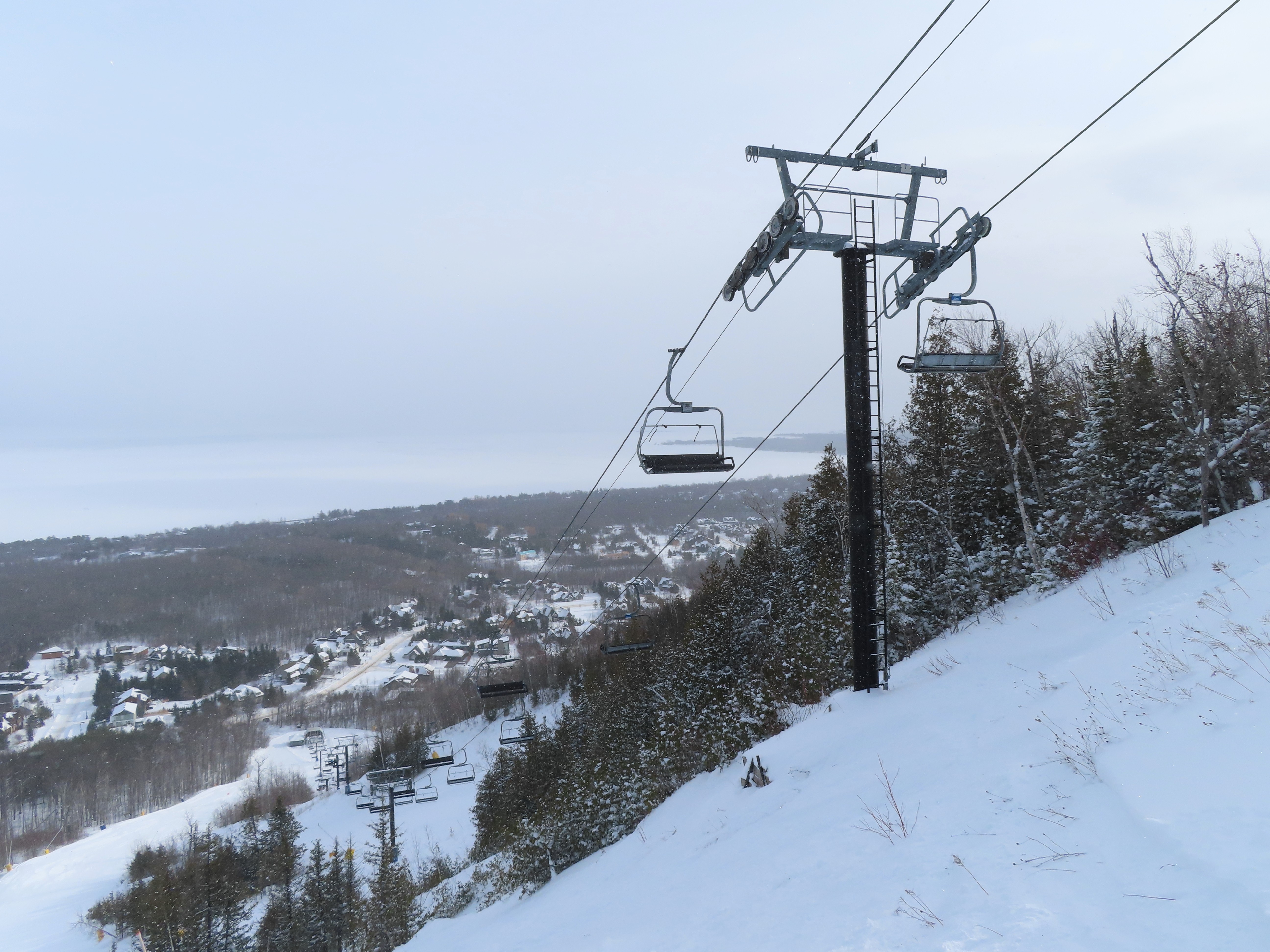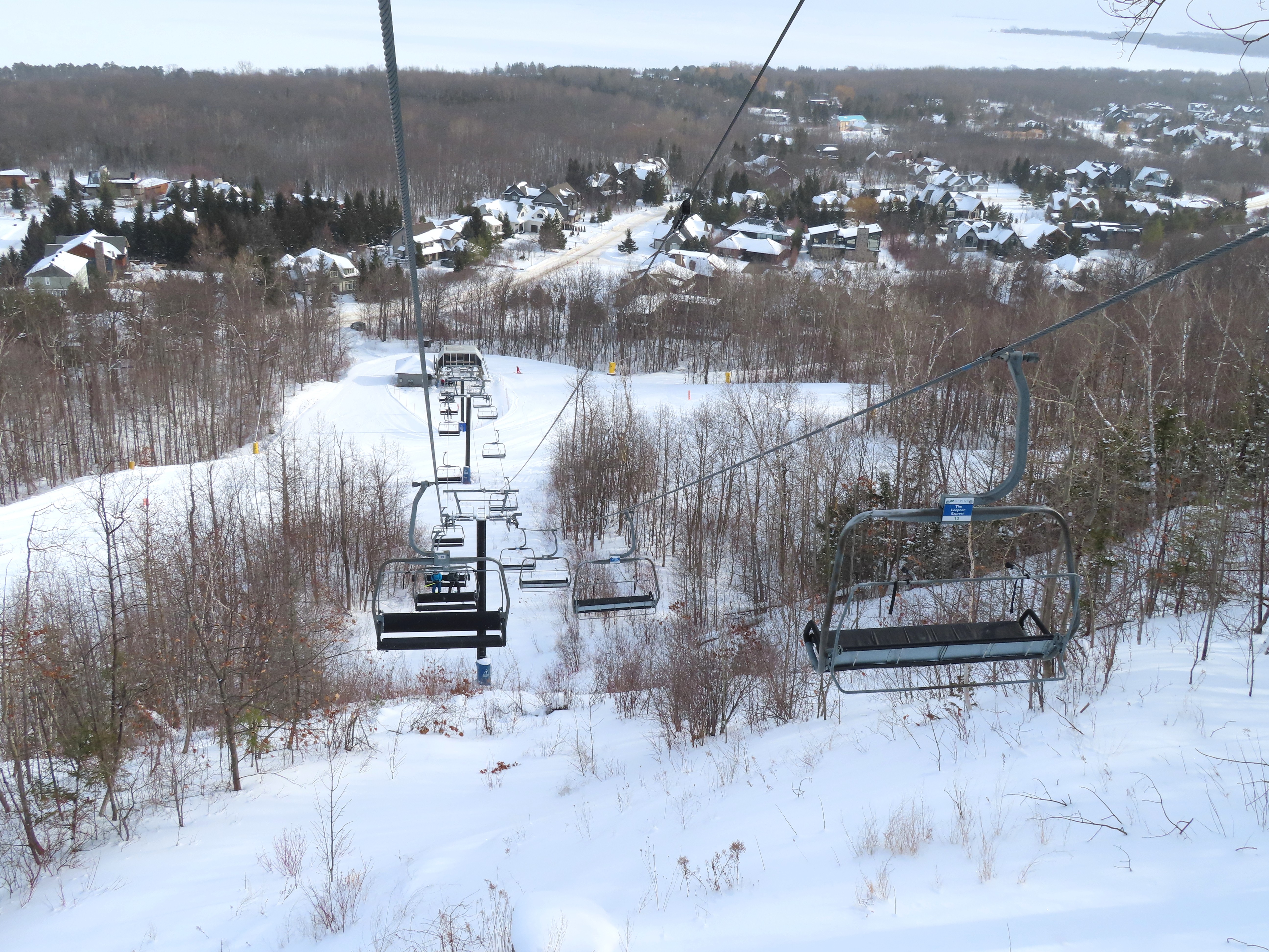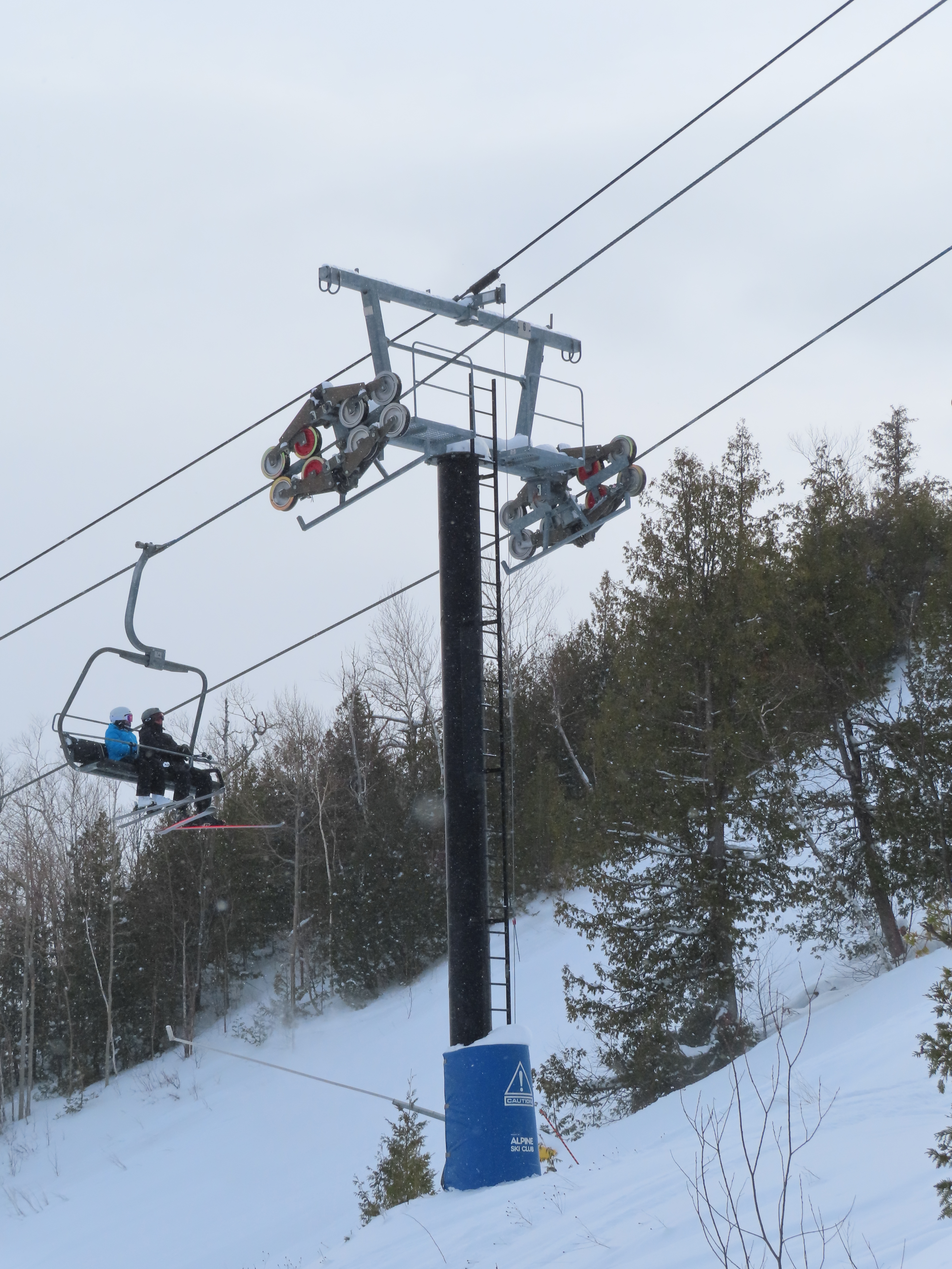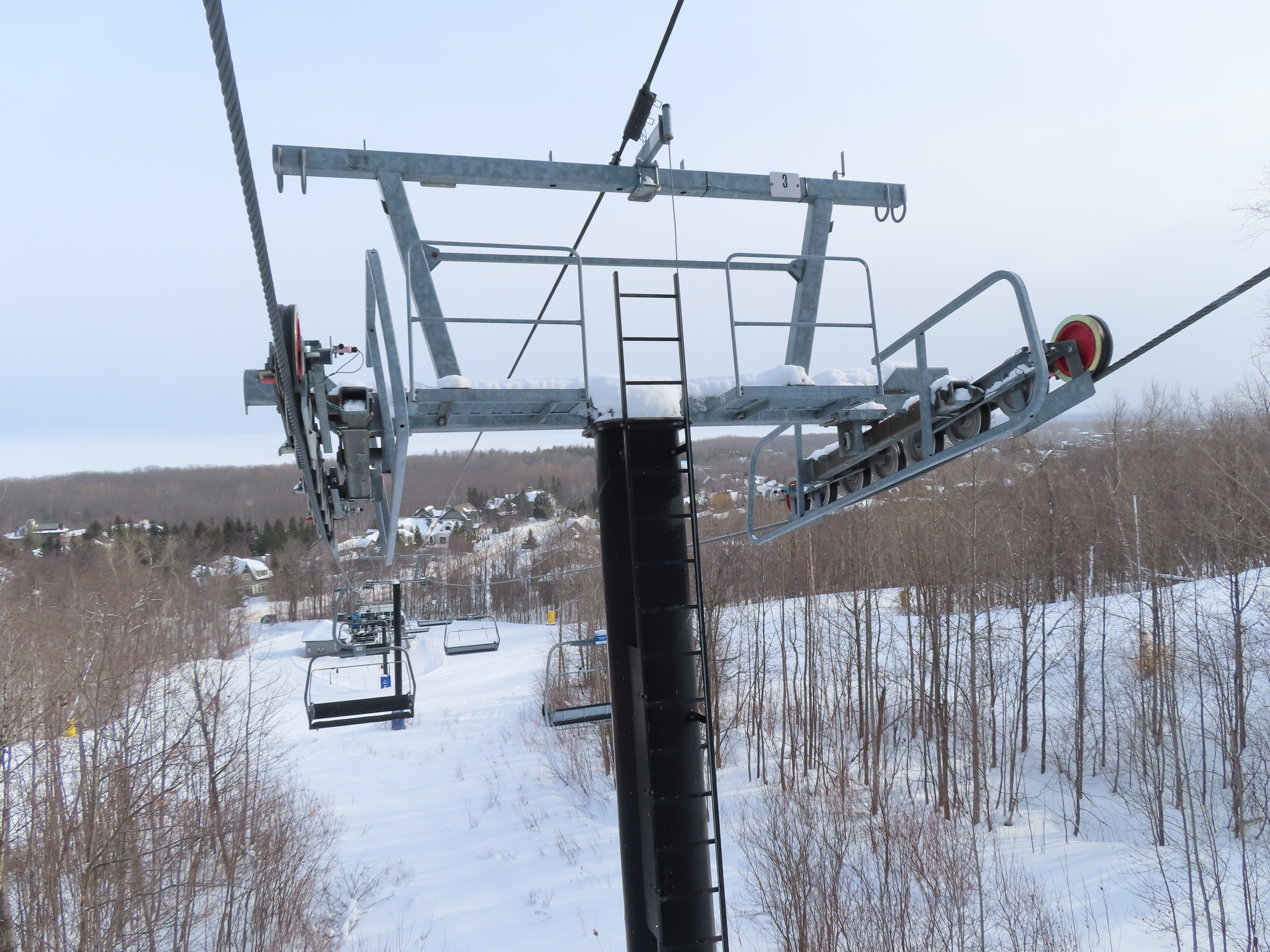 This expansion opened in 2004 with a short but steep quad chair.Side view of the Doppelmayr drive station.Lift overview.Loading area and motor room.Most of the lift line is not open for skiing due to topography.Hold down tower 3.View back down the first pitch of the line.Tower 5.Breakover towers at the summit.View from the top.Arriving at the return terminal.Top station overview.Tower 7.T6.View up the line at tower 2.Side view of the top terminal.Doppelmayr Worldbook entry.