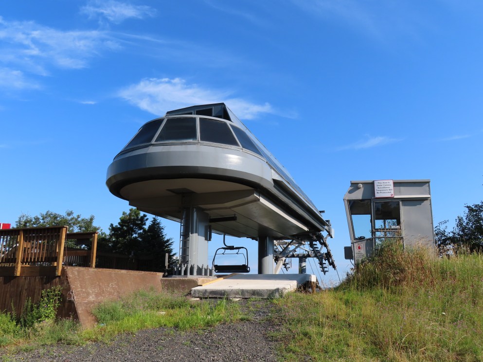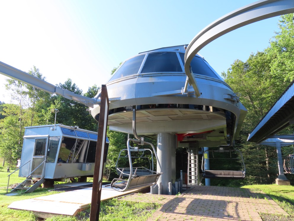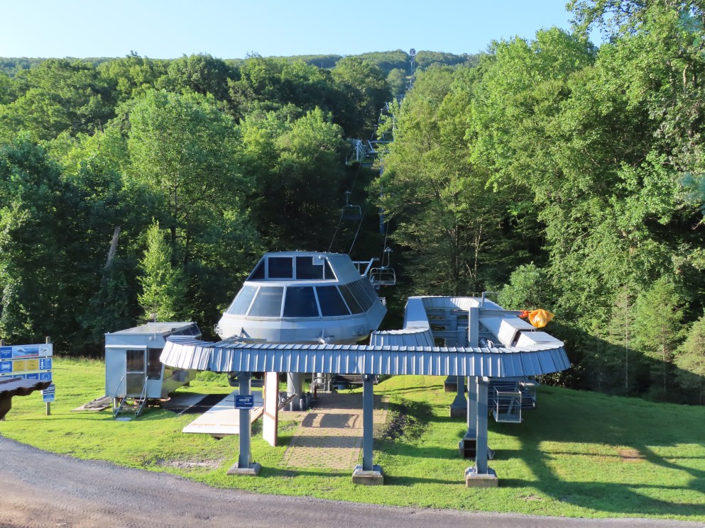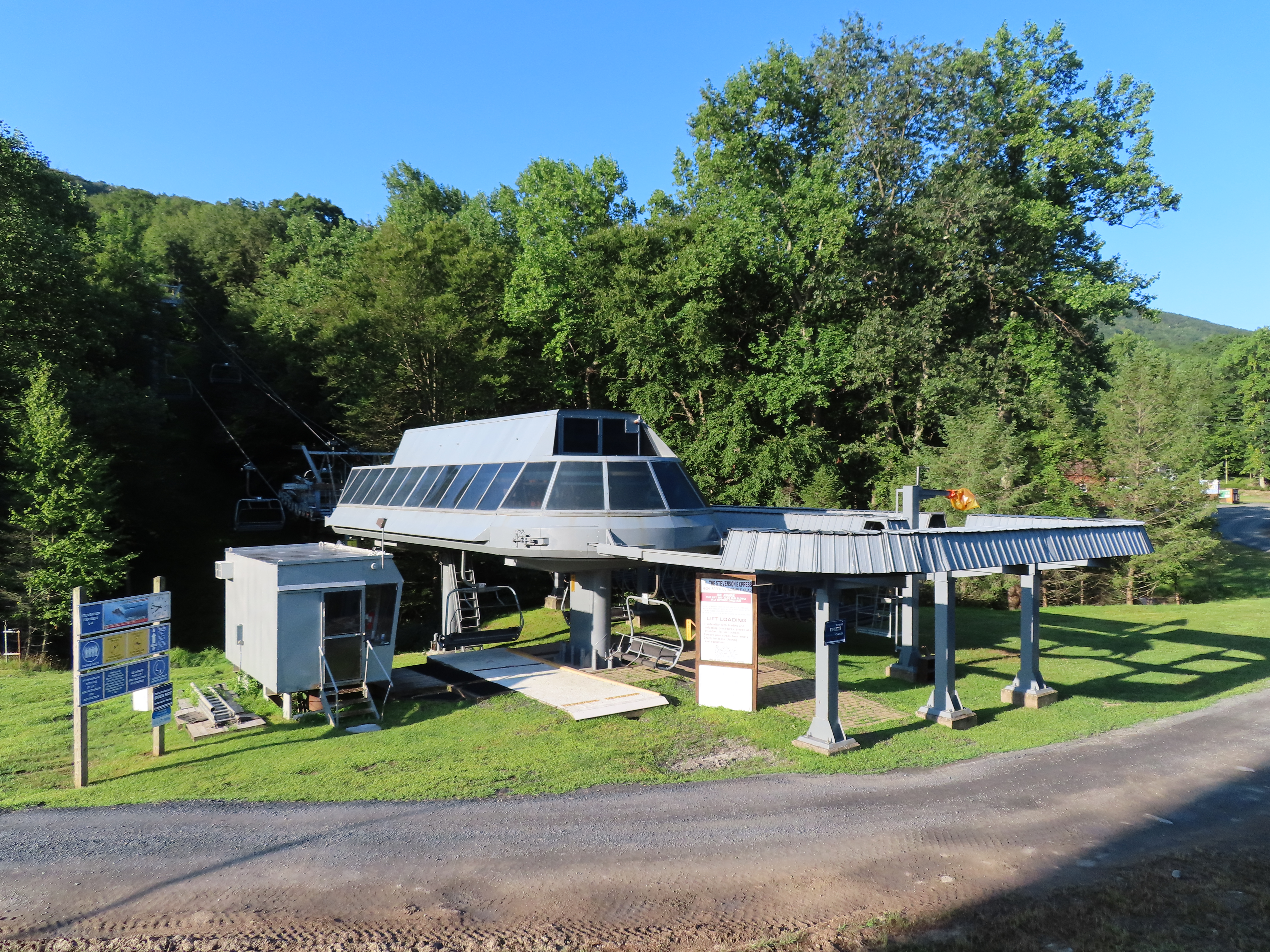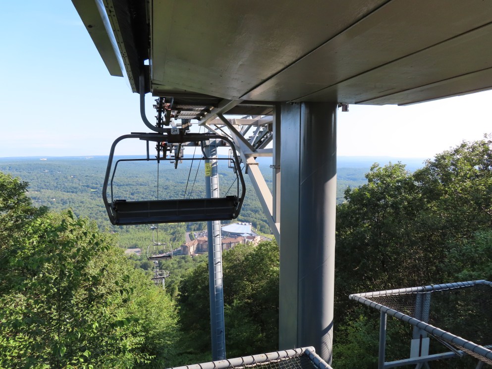 This detachable quad at Camelback services the east side of the mountain.Bottom terminal with full carrier parking.Tower 1.Drive terminal.Chairs parked.Steep upper part of the lift line.Top terminal.View from the return station.Looking down the line.Unloading area.Lift line.Doppelmayr Worldbook entry.