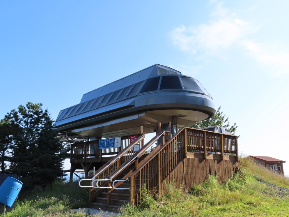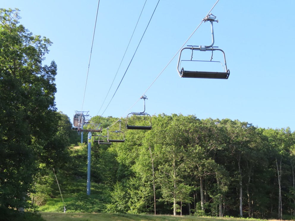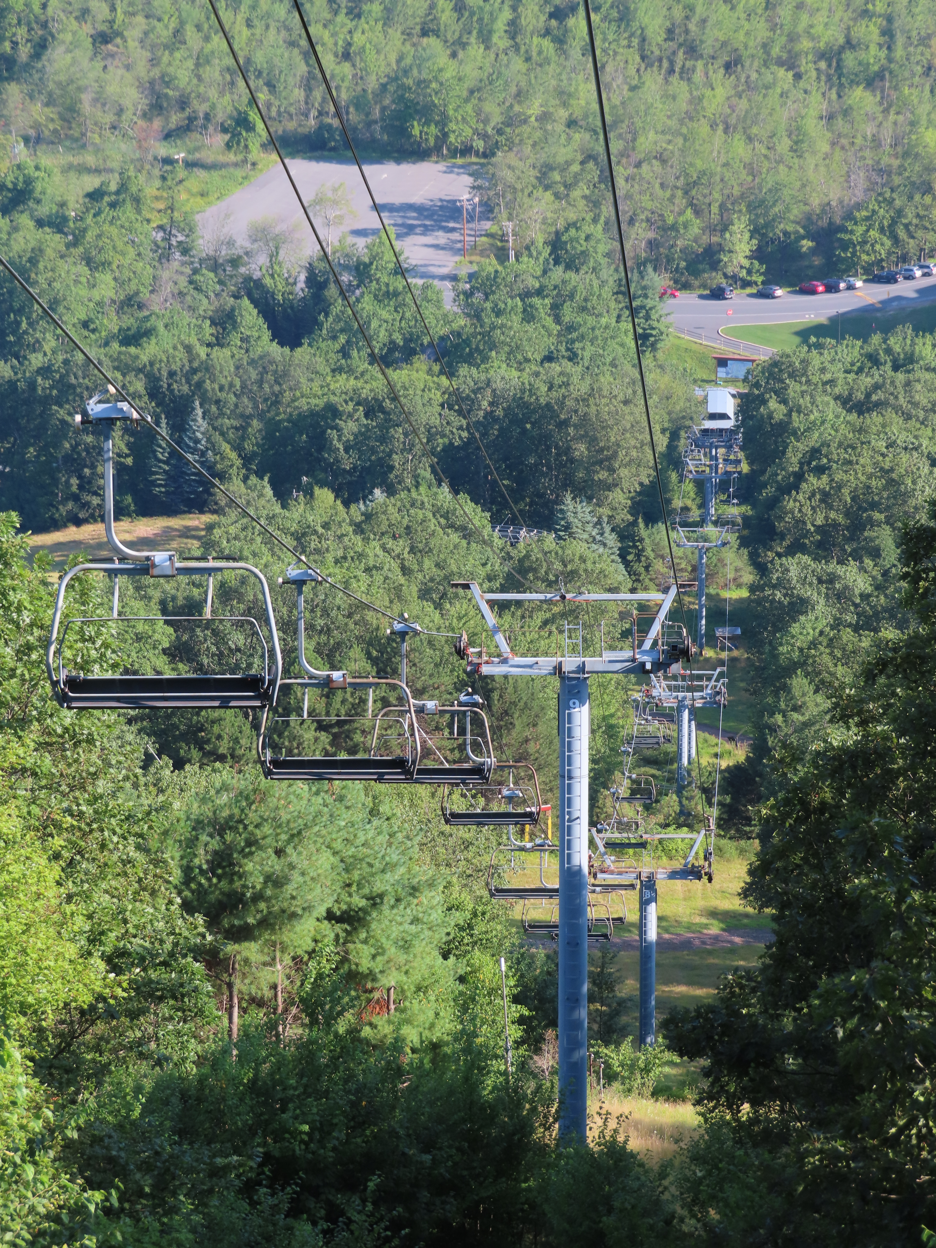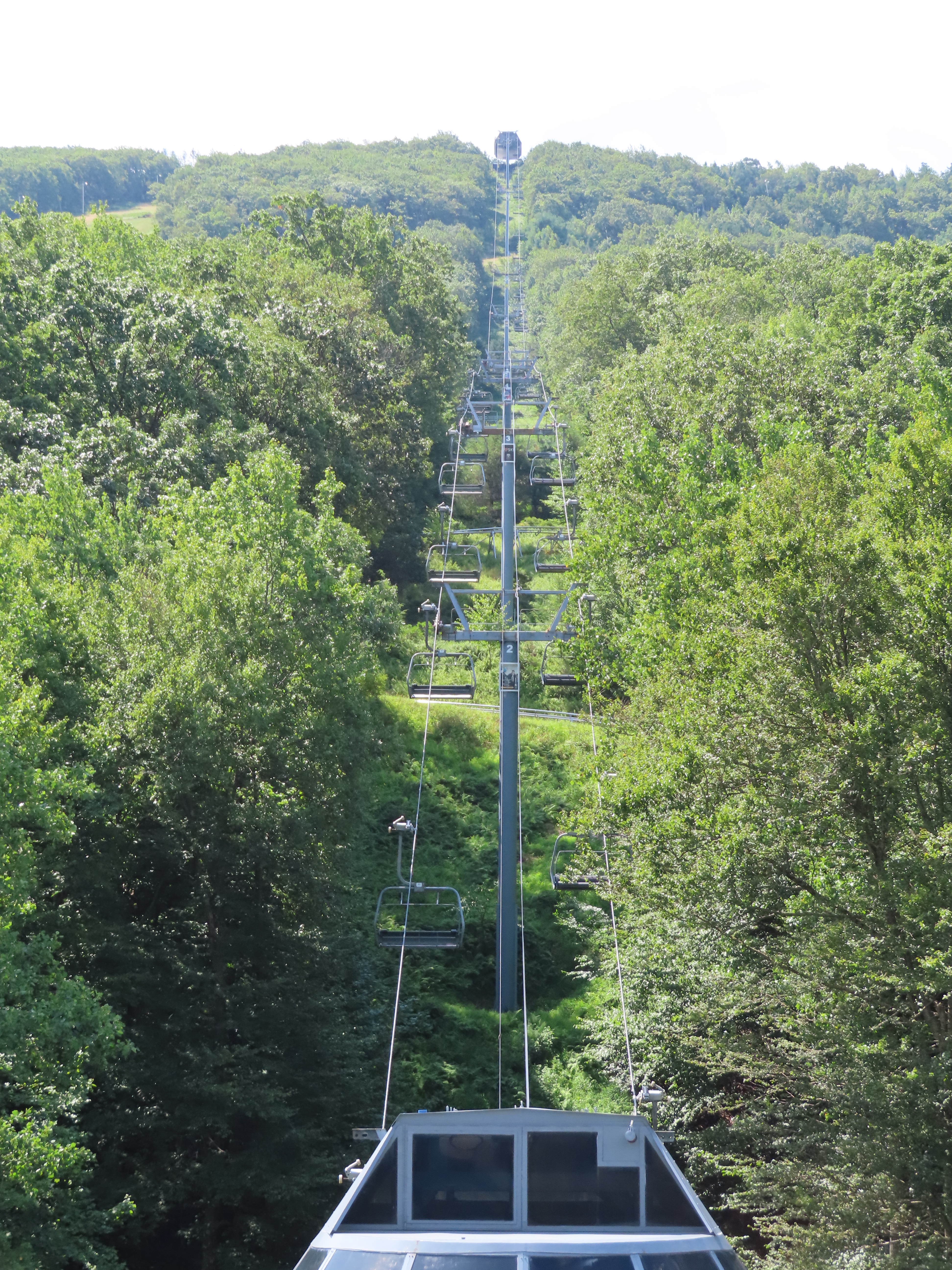 This detachable quad at Camelback services the east side of the mountain.Bottom terminal with full carrier parking.Tower 1.Drive terminal.Chairs parked.Steep upper part of the lift line.Top terminal.View from the return station.Looking down the line.Unloading area.Lift line.Doppelmayr Worldbook entry.