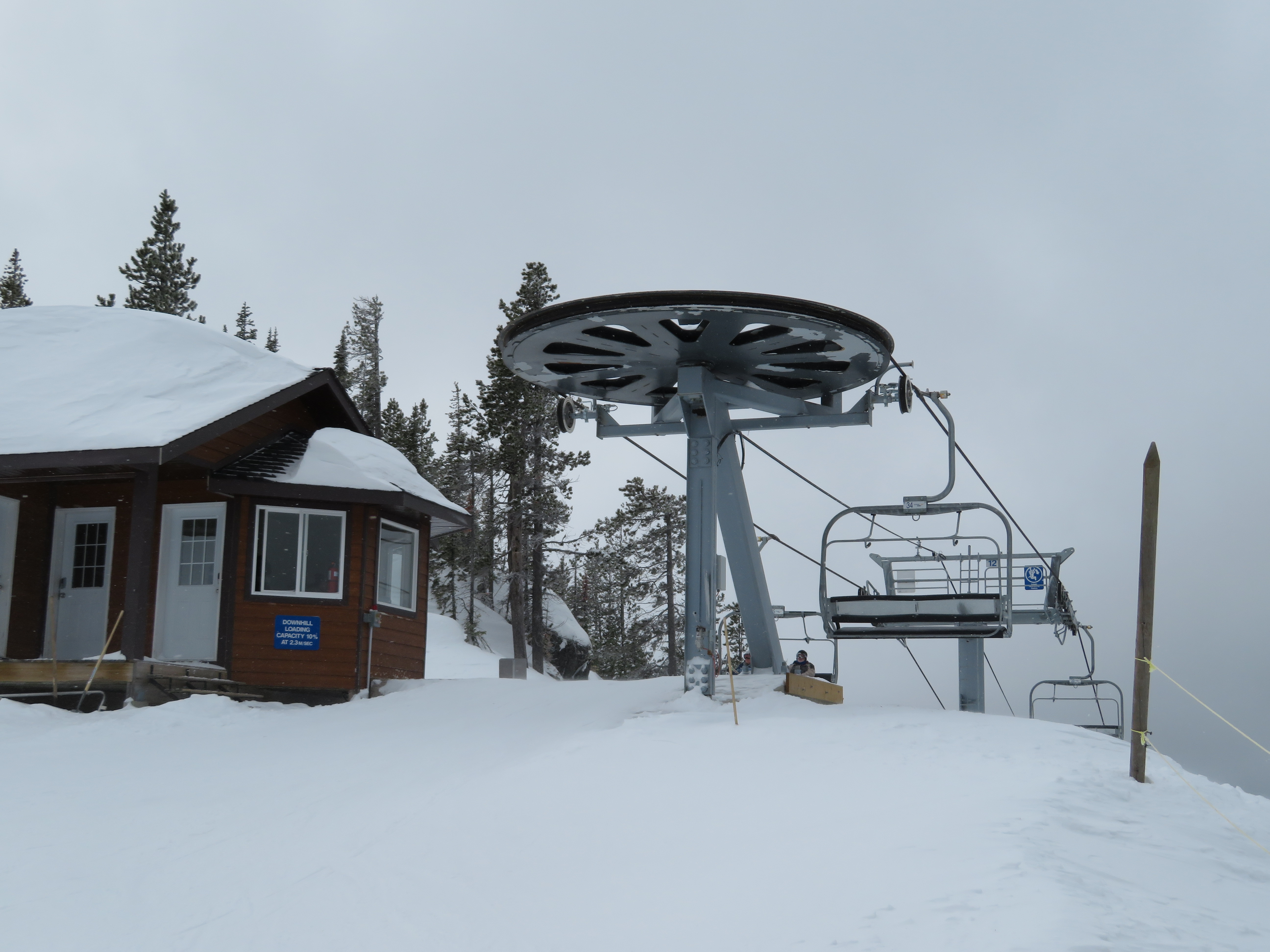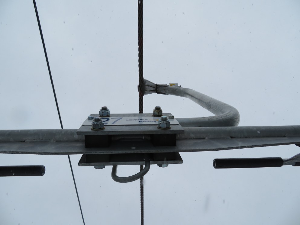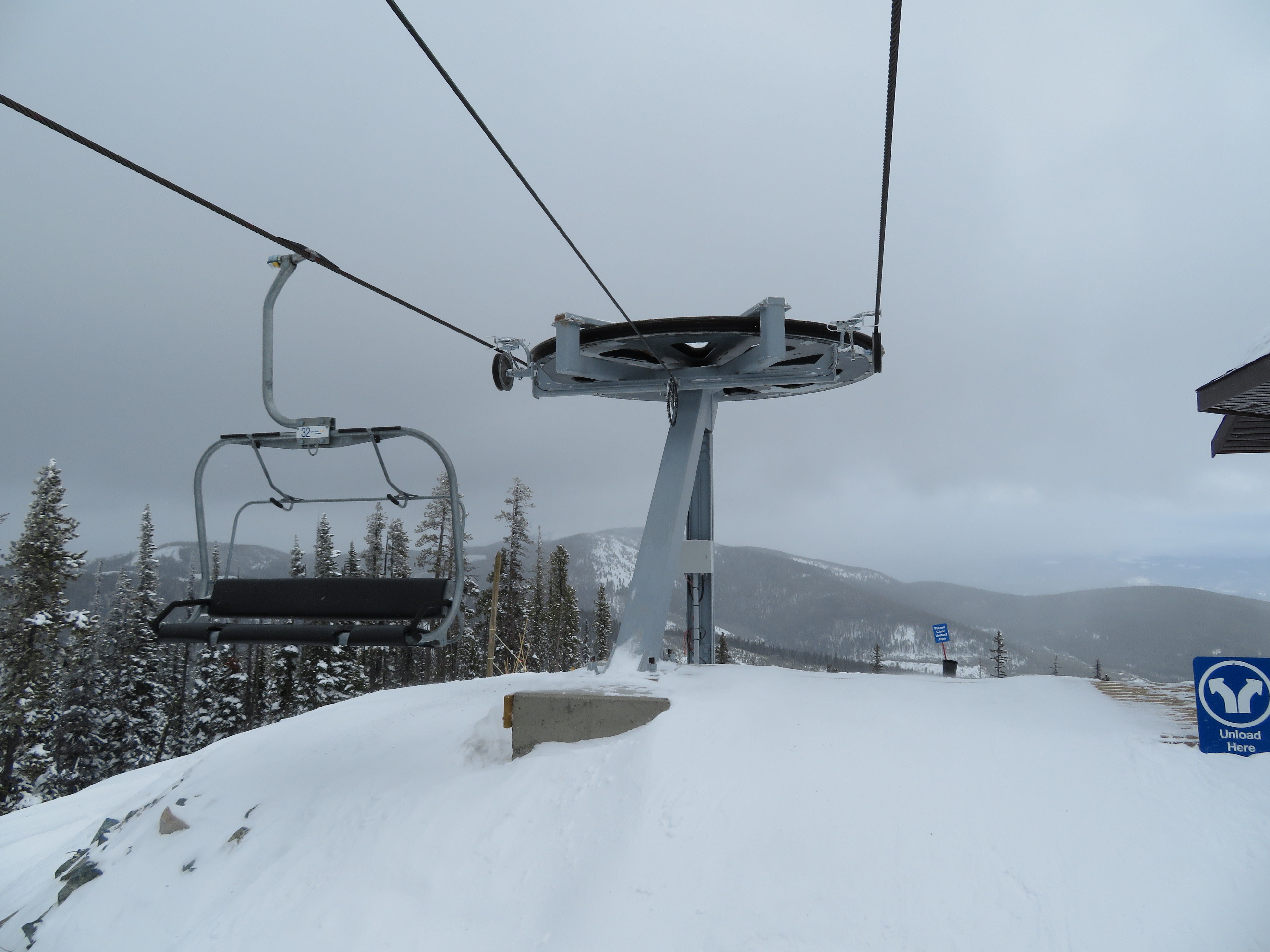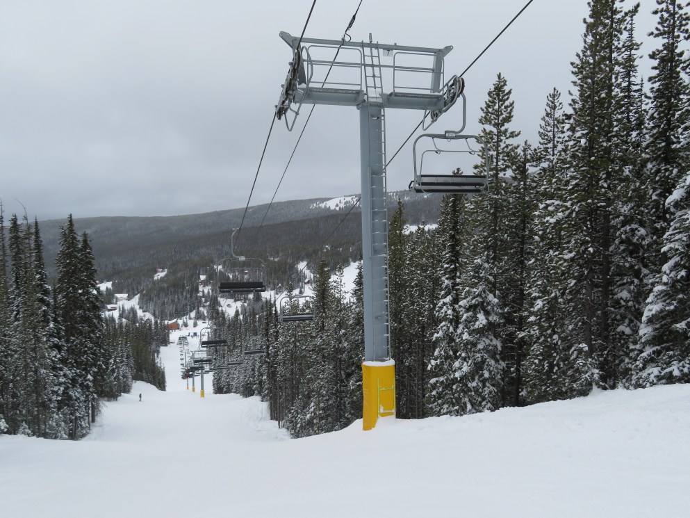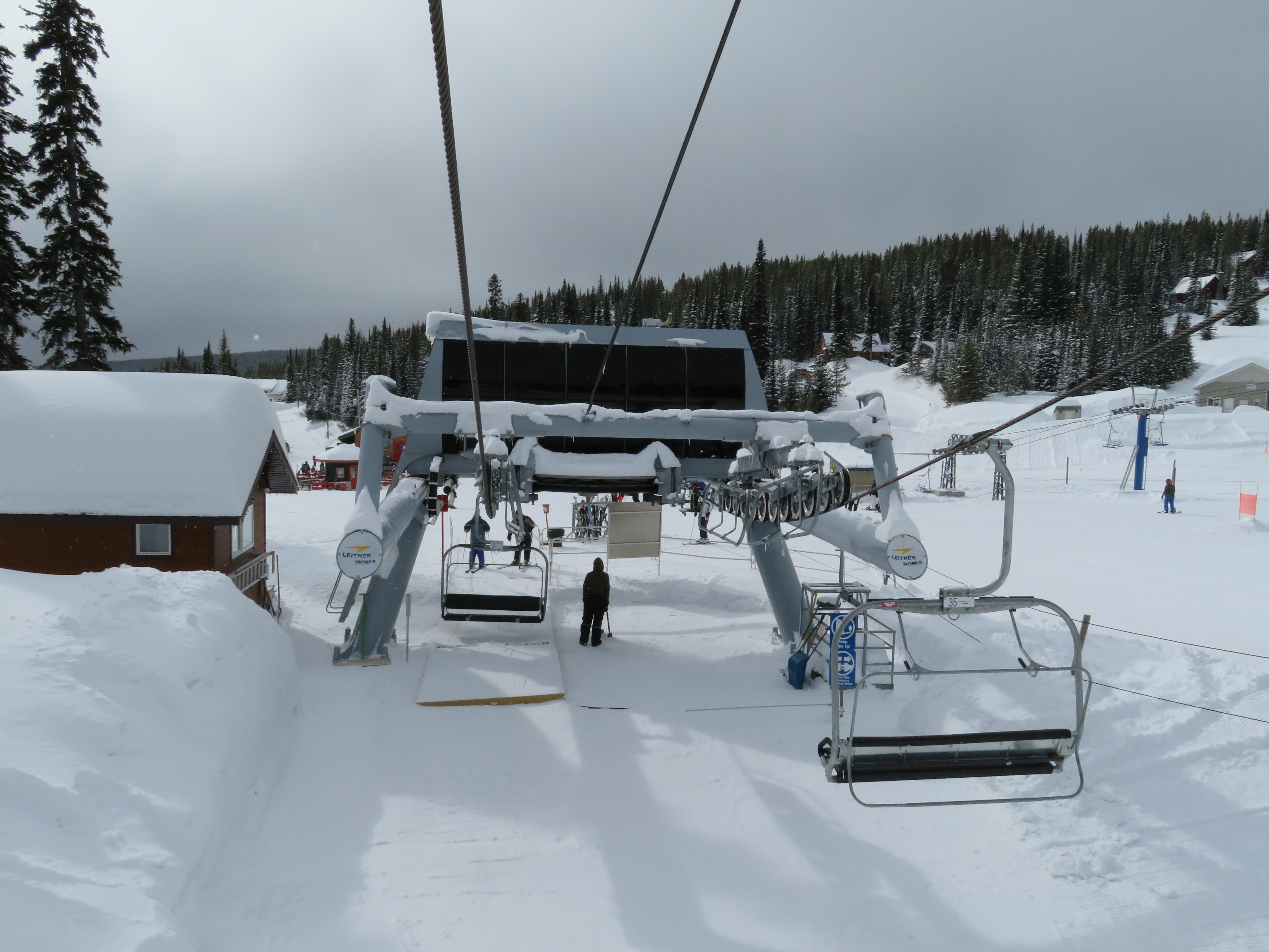 This quad chair opened up an expansion area in 2007, although construction took longer than normal due to late payments to Leitner-Poma.Bottom terminal with an Alpha drive.Riding up the mellow lift line.View back down the lift line.Omega-style tower 7.Nearing the summit.Lift line overview.Fixed return bullwheel at the unload.Top station overview.View down the line from the summit.Looking down at T7.View up from near the base.Drive station light side.Bottom terminal side view.Grip and hanger.