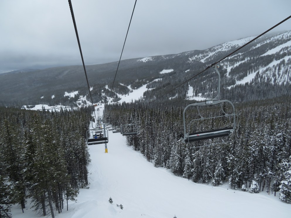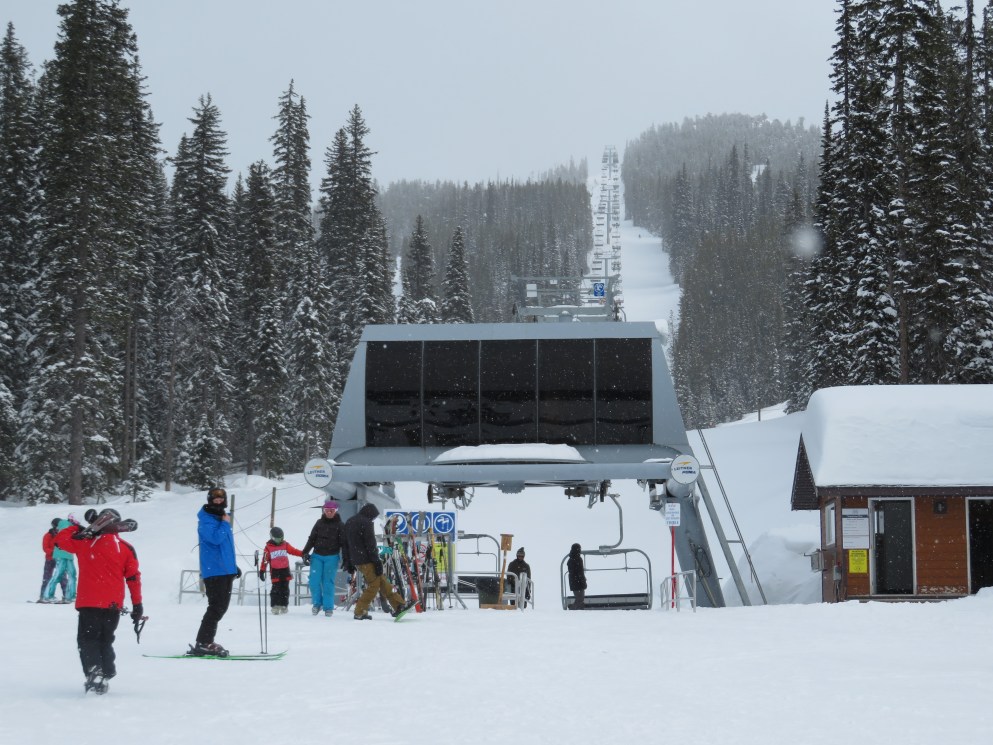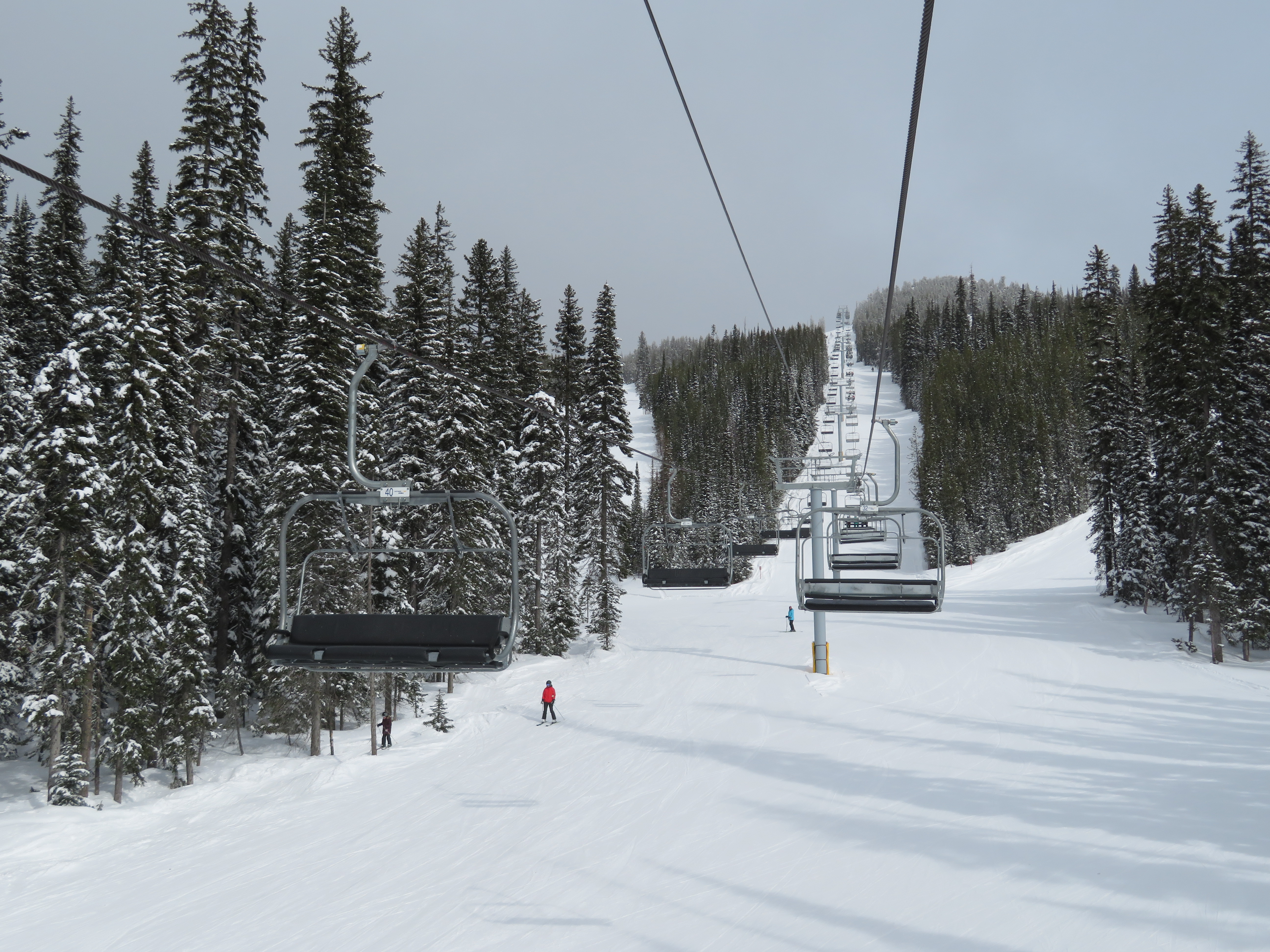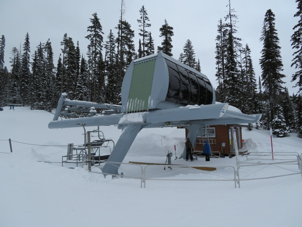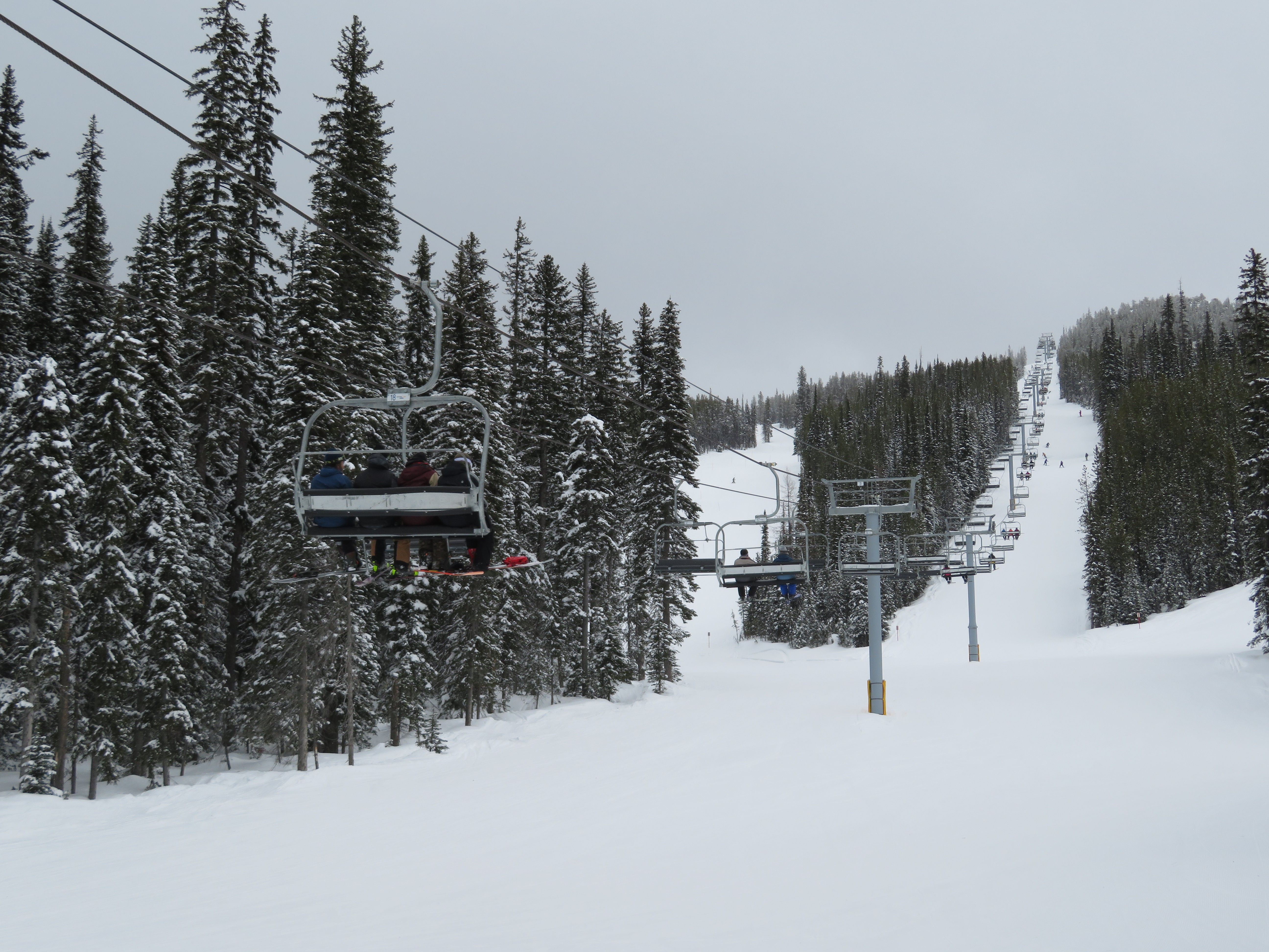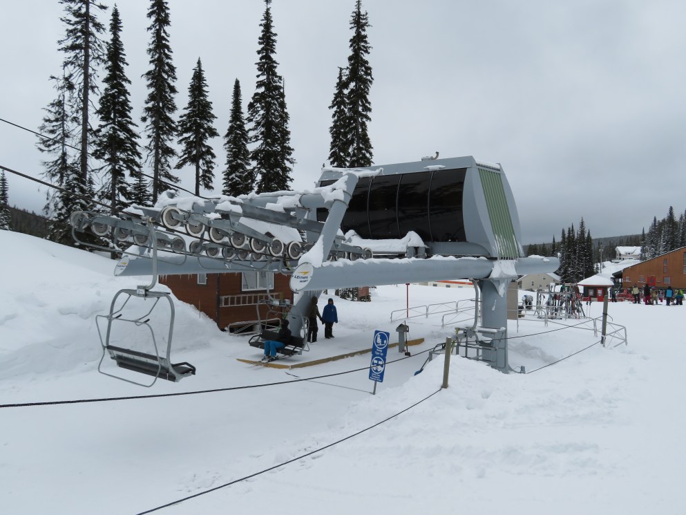 This quad chair opened up an expansion area in 2007, although construction took longer than normal due to late payments to Leitner-Poma.Bottom terminal with an Alpha drive.Riding up the mellow lift line.View back down the lift line.Omega-style tower 7.Nearing the summit.Lift line overview.Fixed return bullwheel at the unload.Top station overview.View down the line from the summit.Looking down at T7.View up from near the base.Drive station light side.Bottom terminal side view.Grip and hanger.