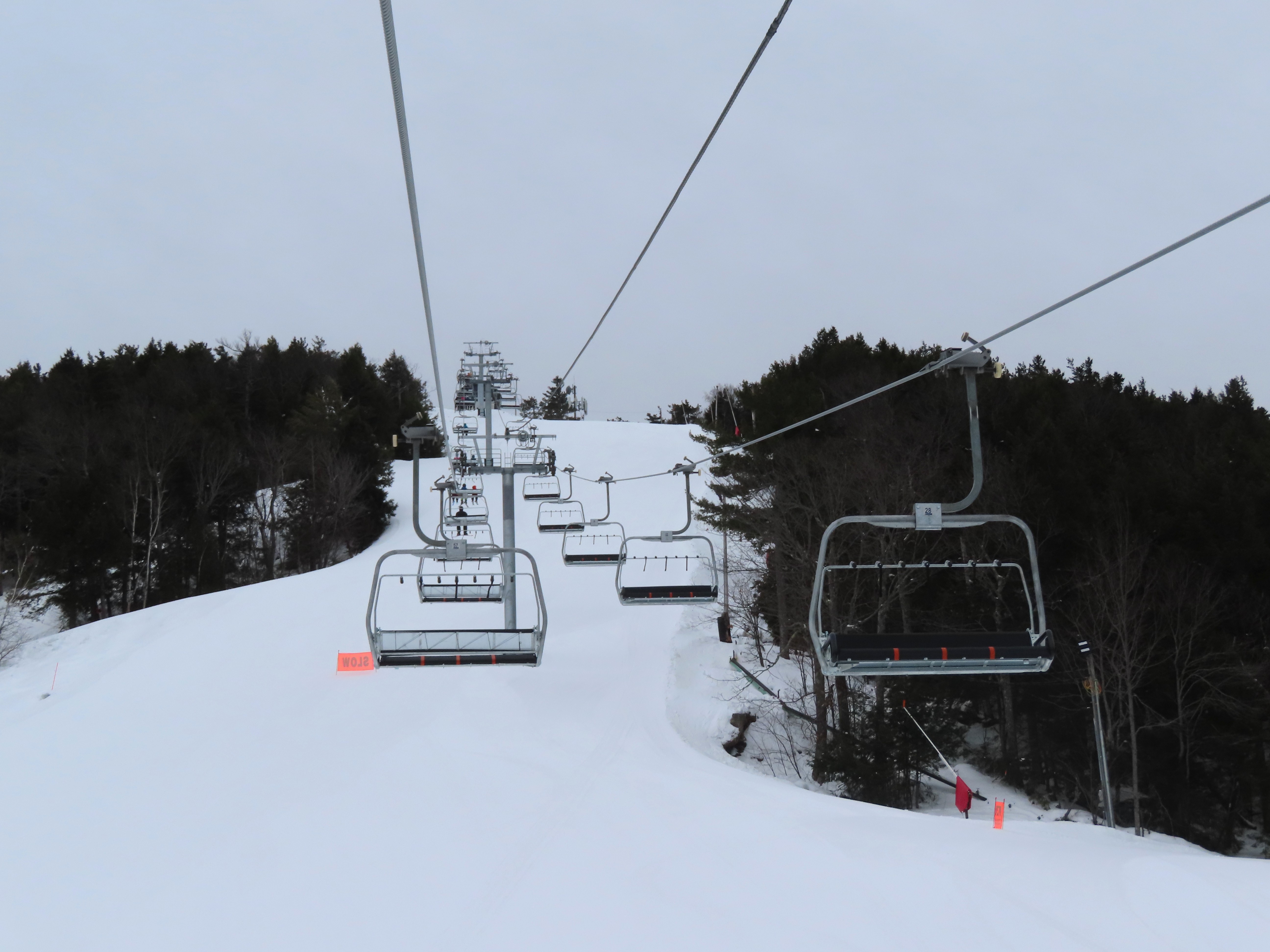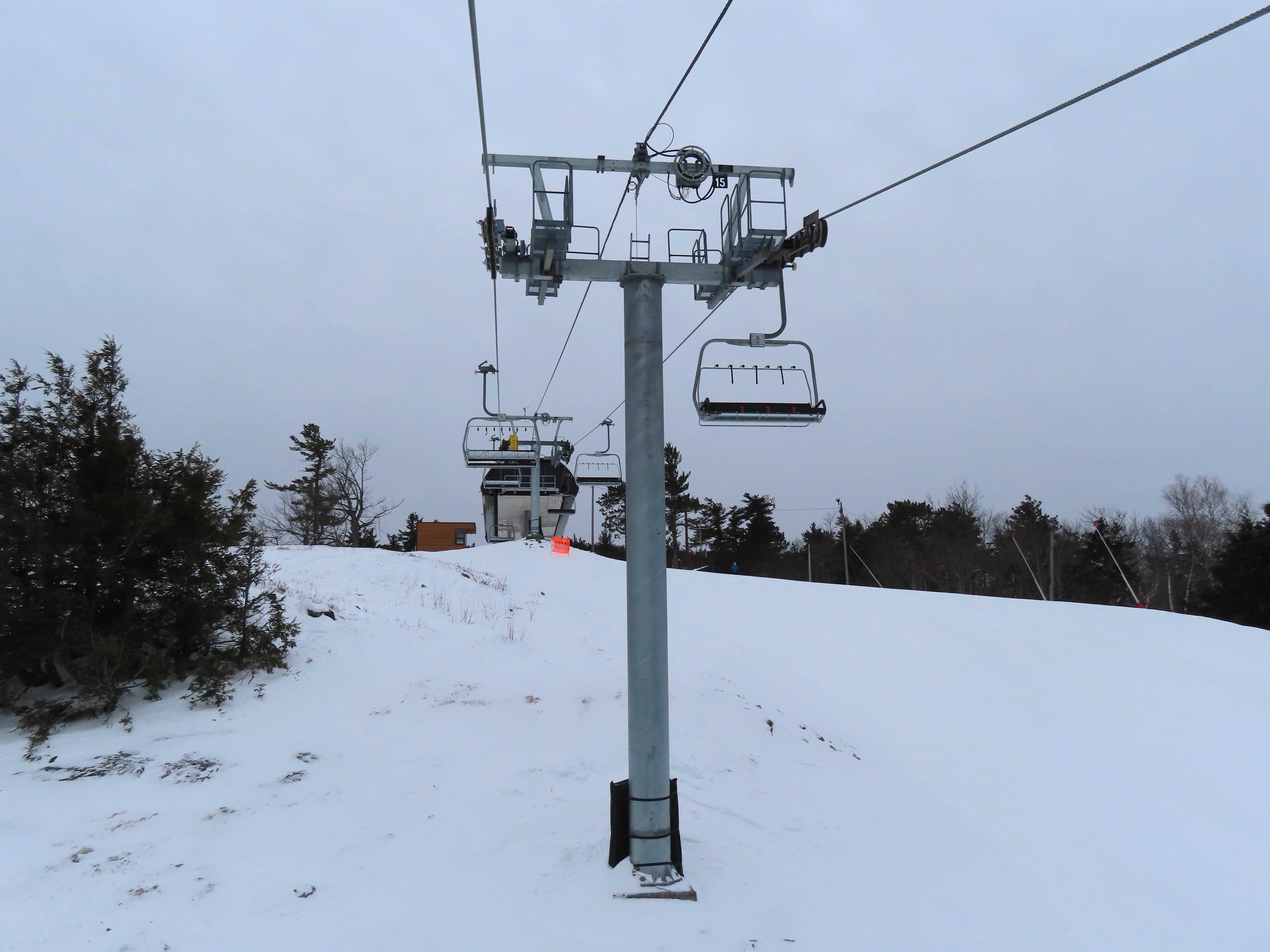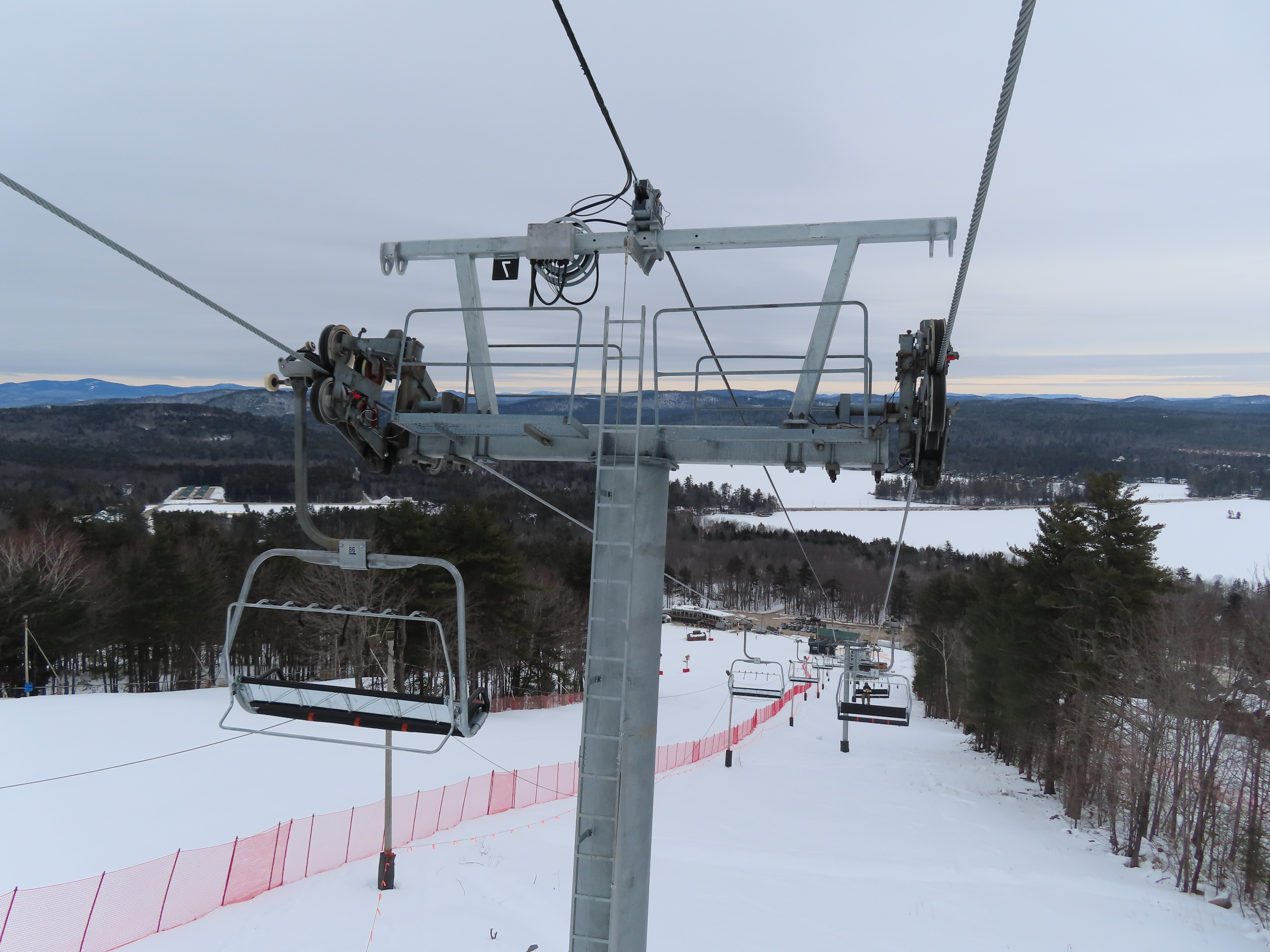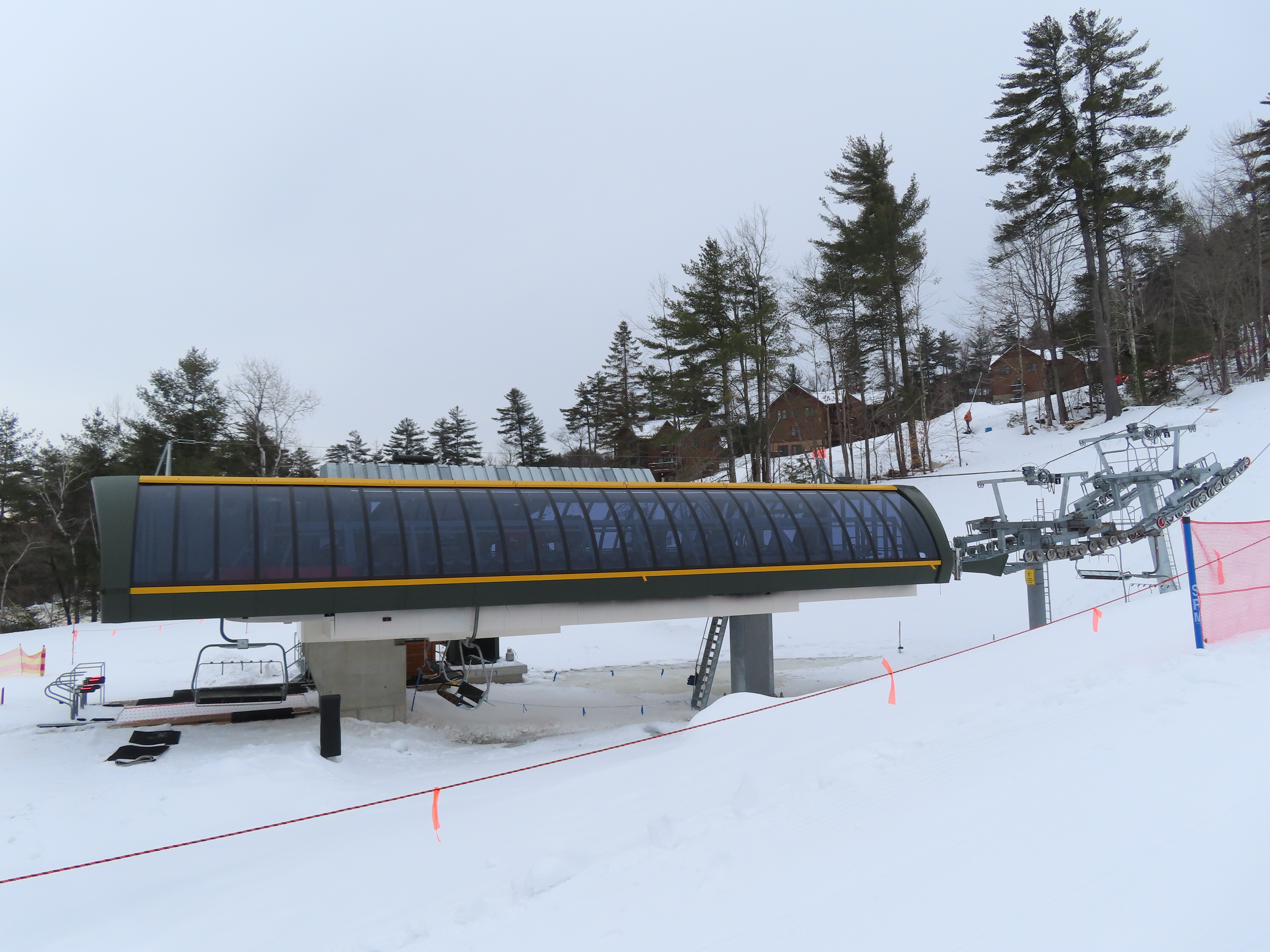 This lift was relocated from Sunday River but completely refurbished to be essentially a new lift.Lift line running approximately the same alignment as a previous triple chair relocated from Loon Mountain.Lift overview.Doppelmayr provided new Uni-G skins for the Uni terminals.Loading area with conveyor and automatic gates.View riding up at tower 3.Combination assemblies on tower 7.Middle section of the lift line.The previous lift featured a mid-station but this one does not.Tower 15.The top unload area.Uni station with all-new exterior.New chair with DS grip.View down at tower 15.Upper lift line.The final few towers near the summit.Middle section of the line closed to skiers.Lower lift line.Side view of the bottom station with one new tower and one re-used tower.Arriving at the summit.Another view of the bottom station in the main base area.Queuing gates and loading conveyor from Chairkit.Tower 16 with new and used parts.Tower 13.