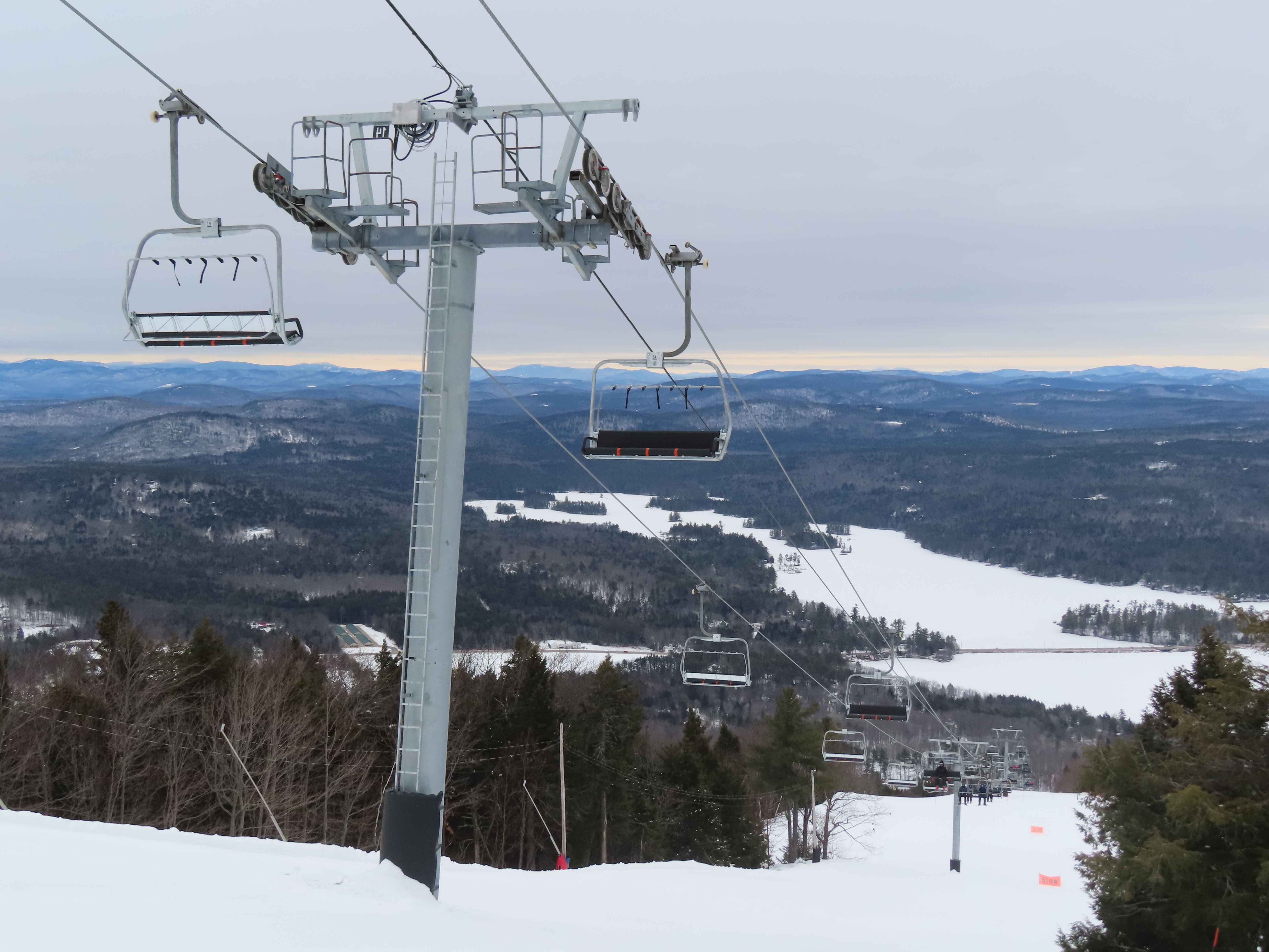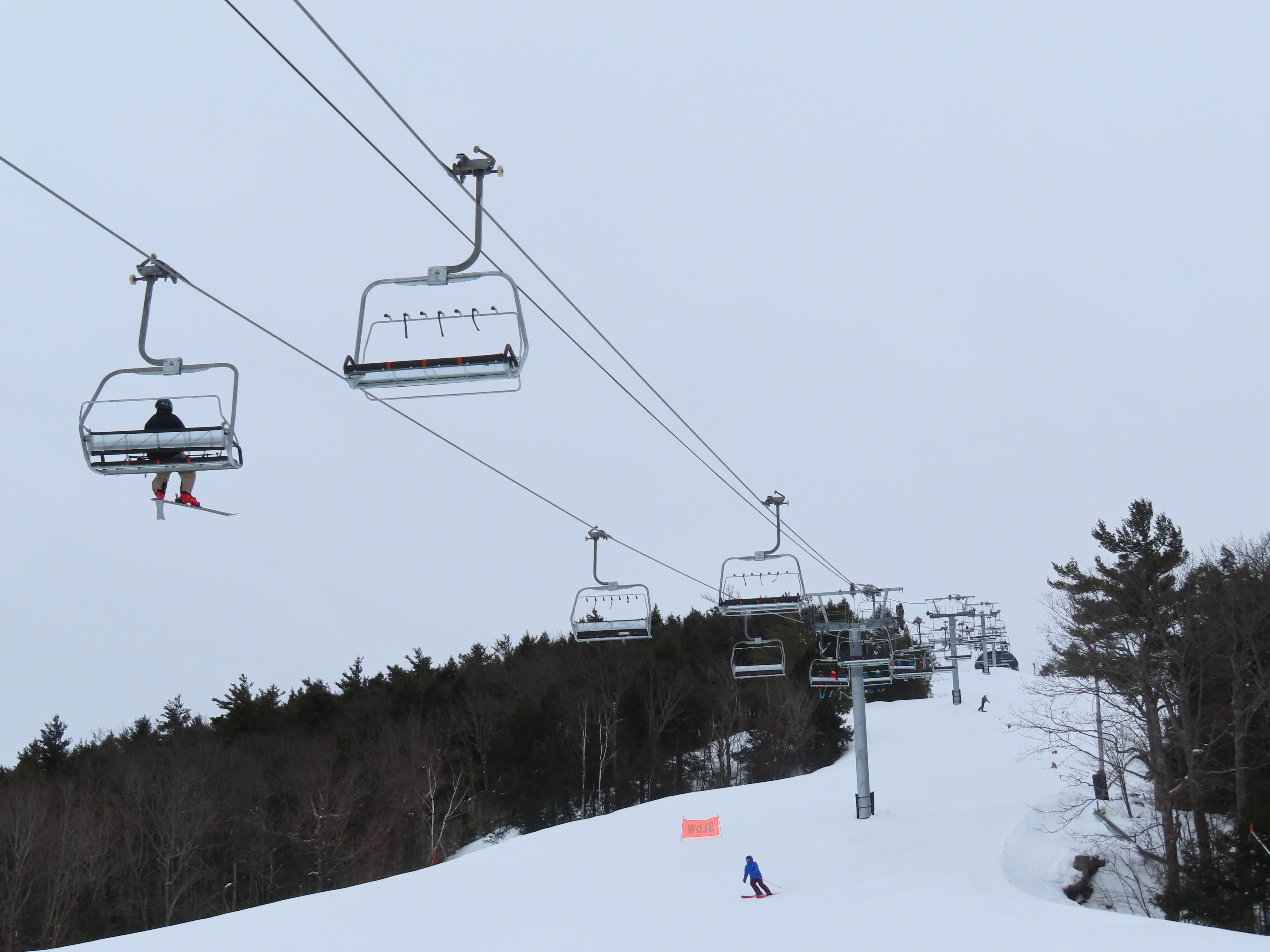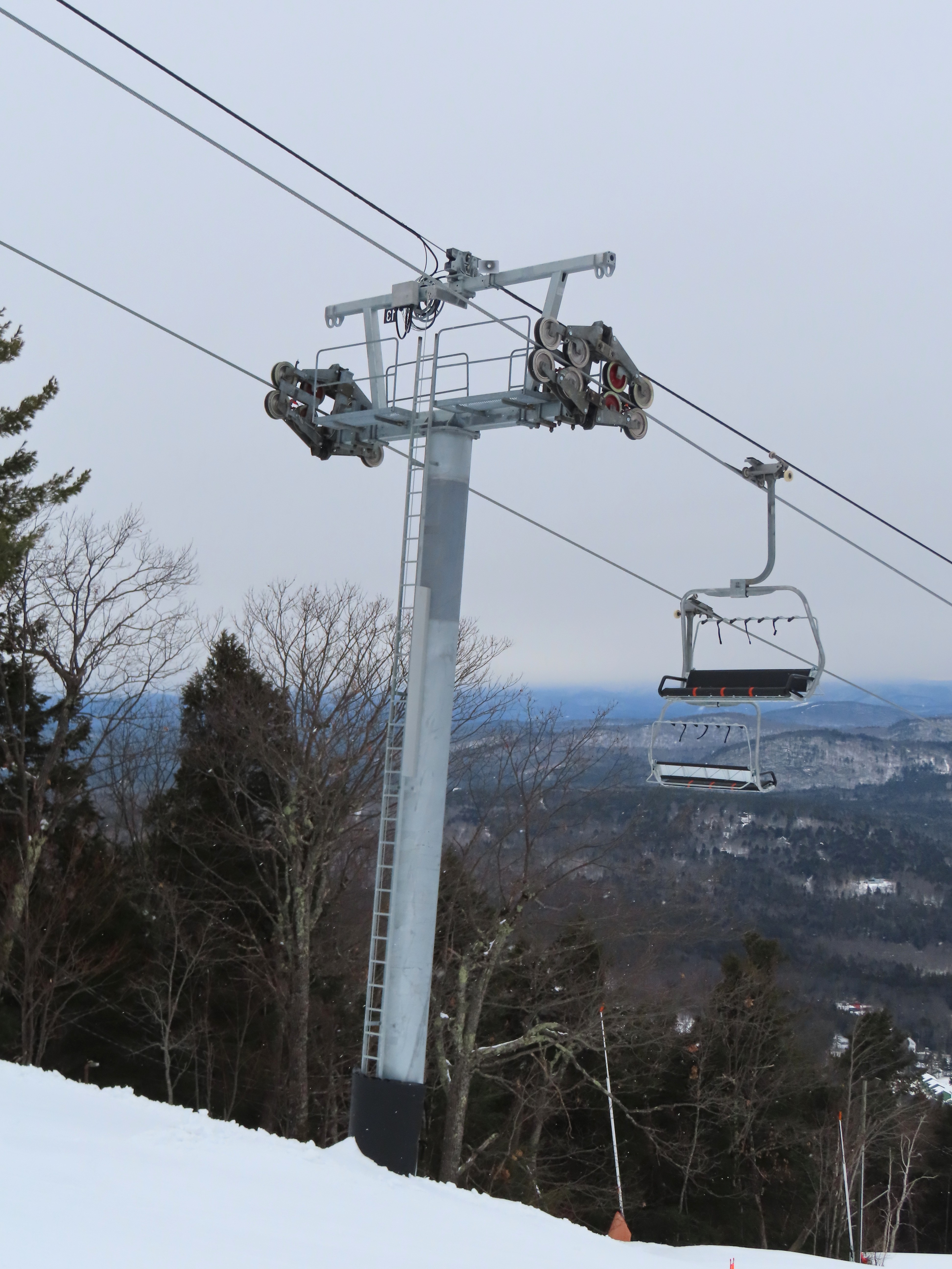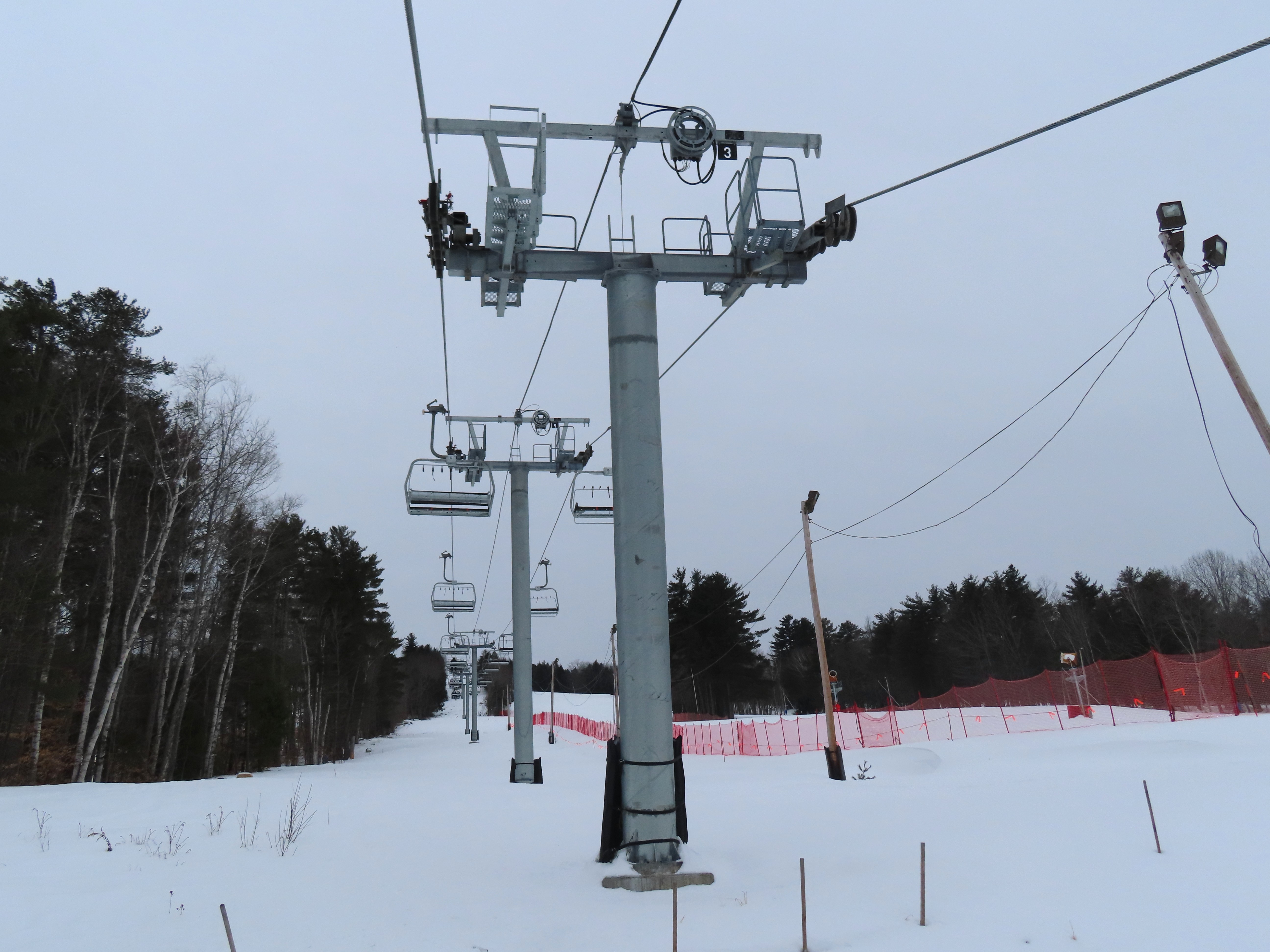 This lift was relocated from Sunday River but completely refurbished to be essentially a new lift.Lift line running approximately the same alignment as a previous triple chair relocated from Loon Mountain.Lift overview.Doppelmayr provided new Uni-G skins for the Uni terminals.Loading area with conveyor and automatic gates.View riding up at tower 3.Combination assemblies on tower 7.Middle section of the lift line.The previous lift featured a mid-station but this one does not.Tower 15.The top unload area.Uni station with all-new exterior.New chair with DS grip.View down at tower 15.Upper lift line.The final few towers near the summit.Middle section of the line closed to skiers.Lower lift line.Side view of the bottom station with one new tower and one re-used tower.Arriving at the summit.Another view of the bottom station in the main base area.Queuing gates and loading conveyor from Chairkit.Tower 16 with new and used parts.Tower 13.