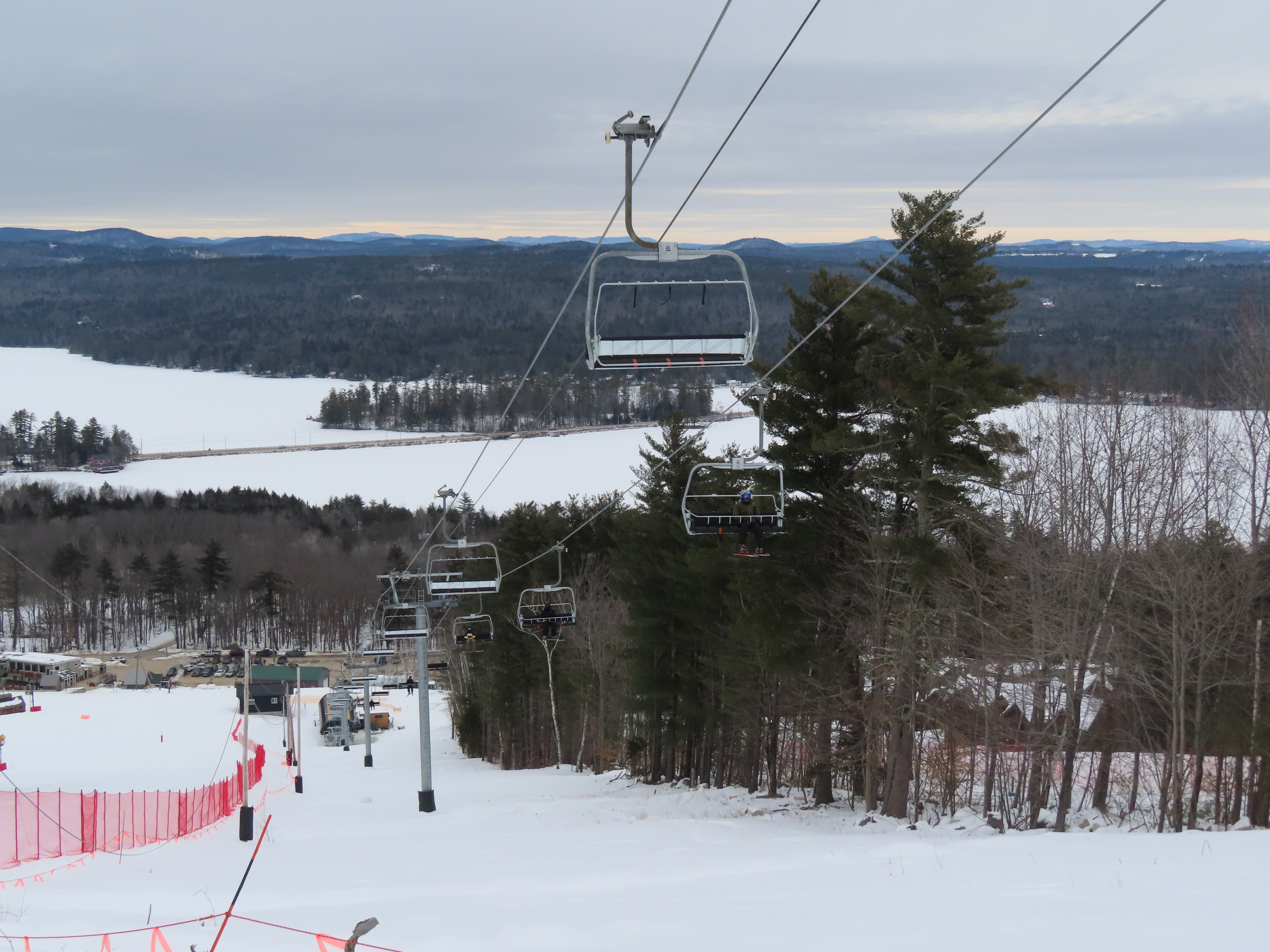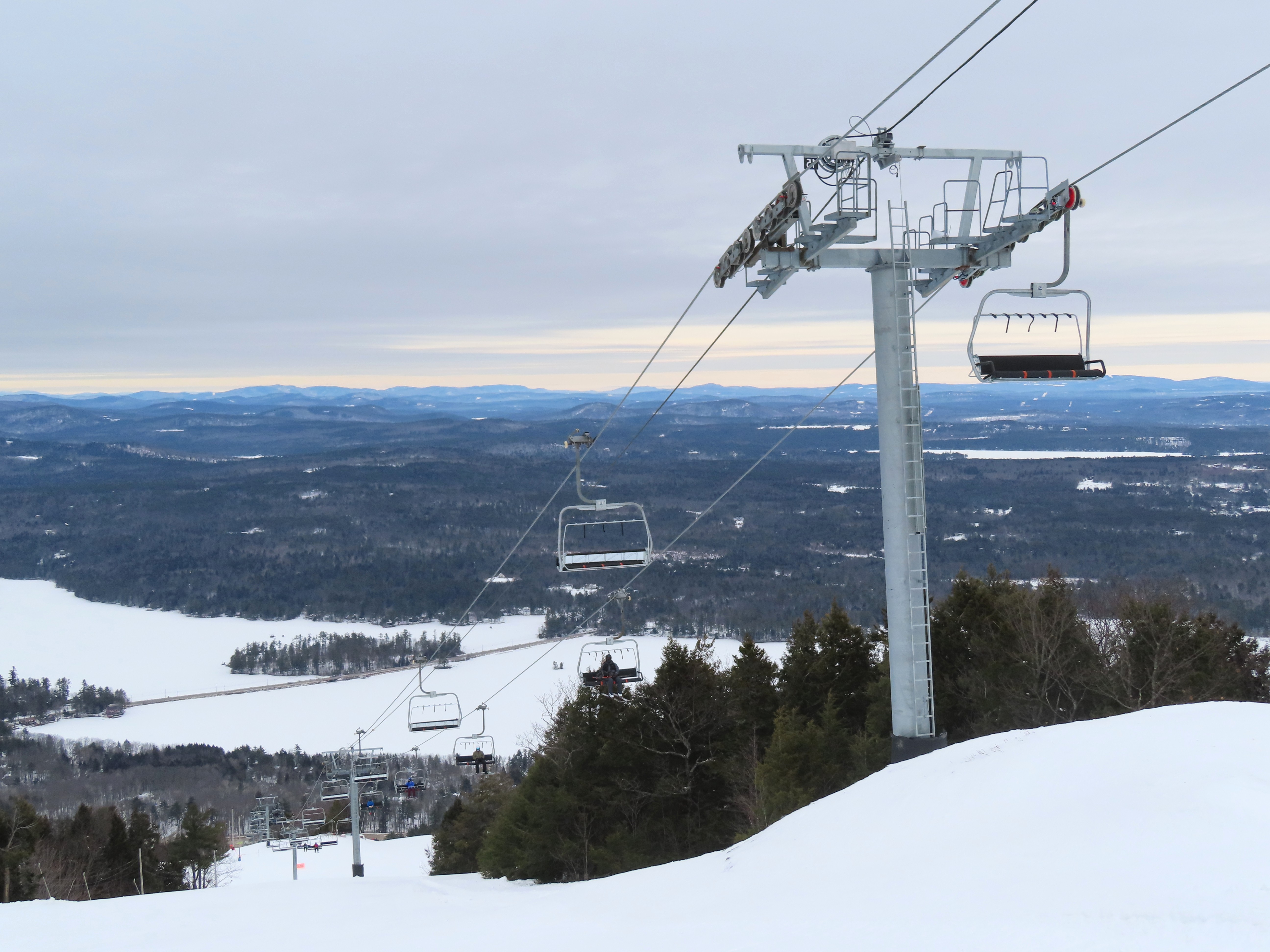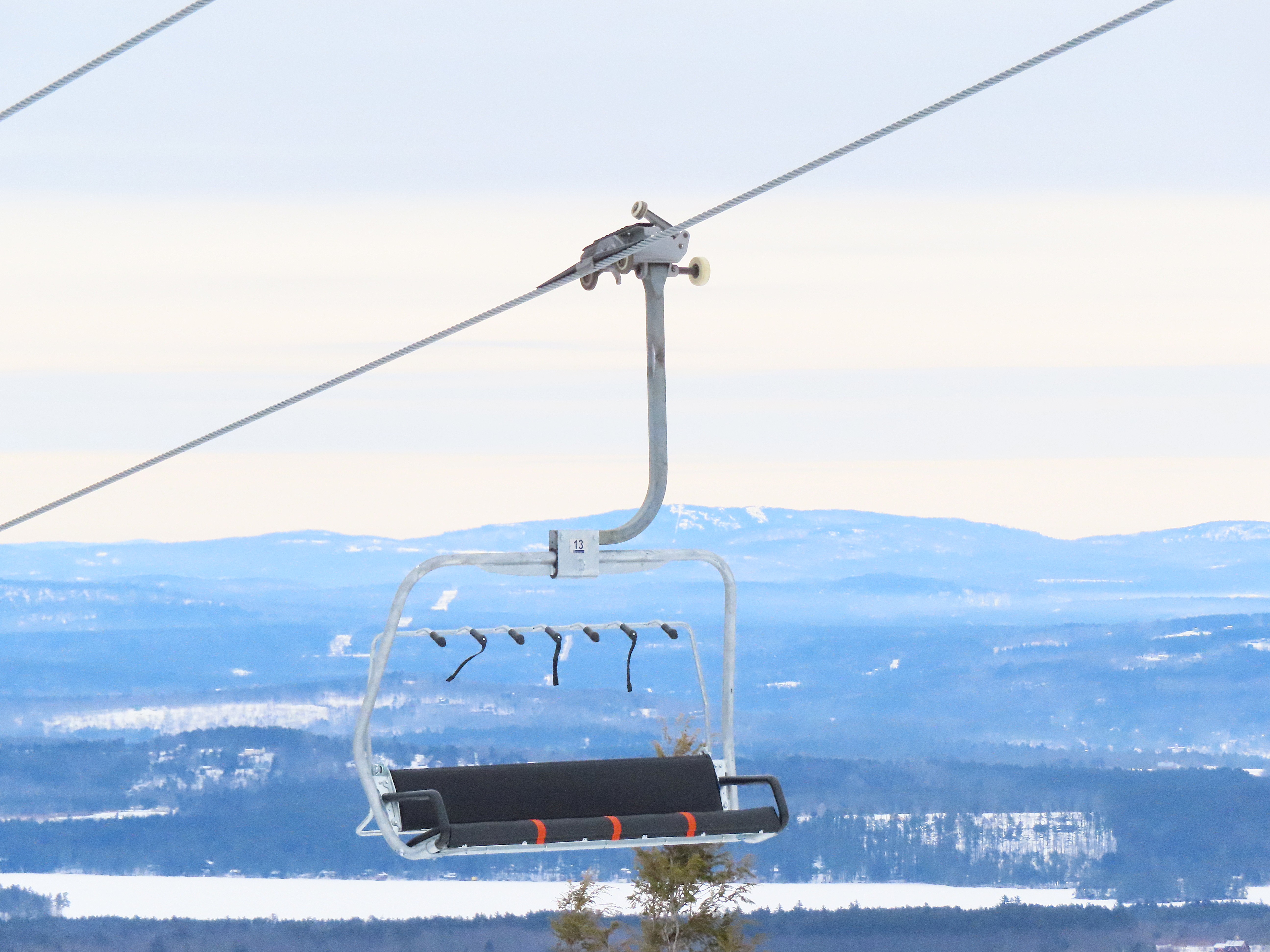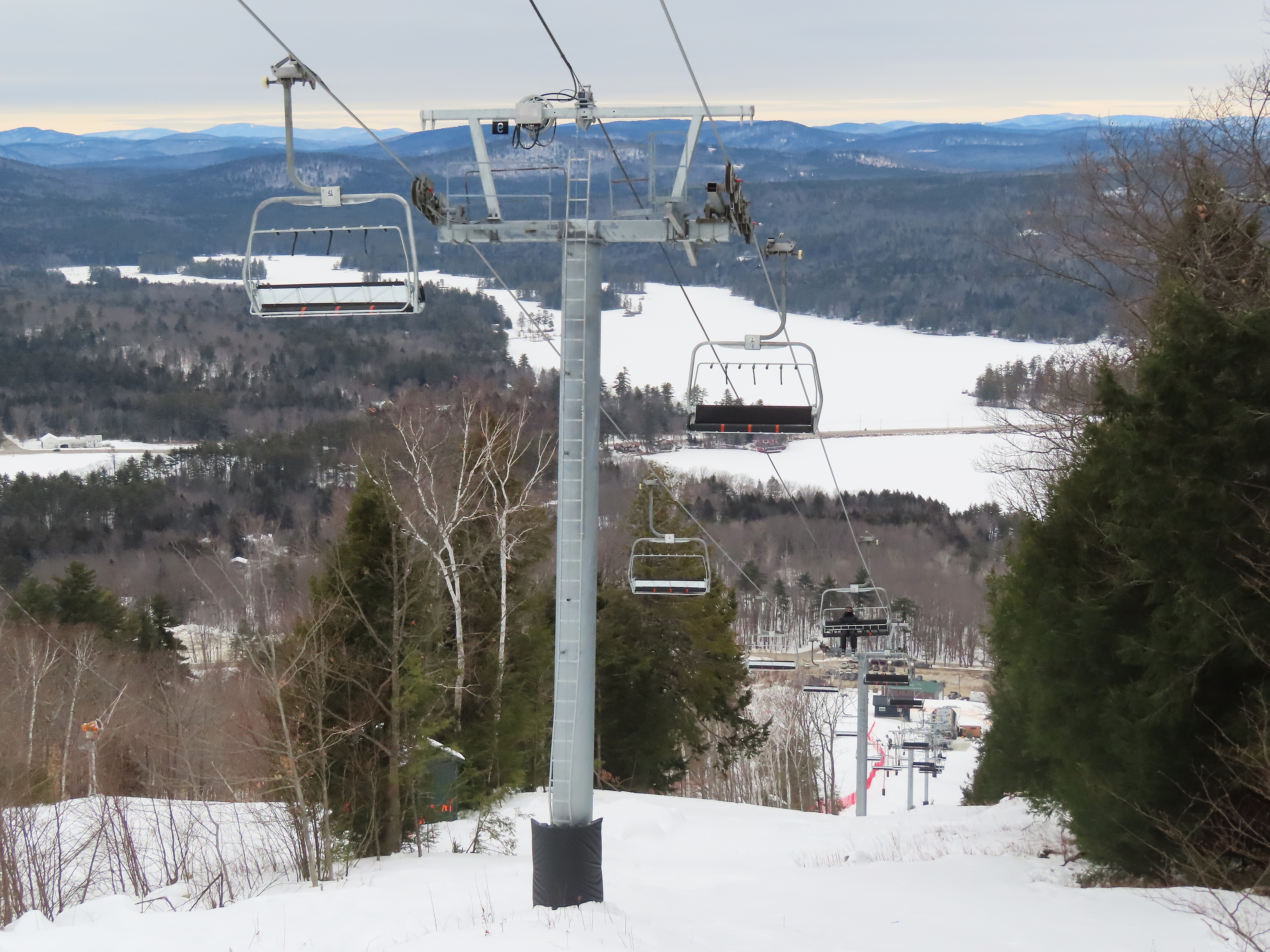 This lift was relocated from Sunday River but completely refurbished to be essentially a new lift.Lift line running approximately the same alignment as a previous triple chair relocated from Loon Mountain.Lift overview.Doppelmayr provided new Uni-G skins for the Uni terminals.Loading area with conveyor and automatic gates.View riding up at tower 3.Combination assemblies on tower 7.Middle section of the lift line.The previous lift featured a mid-station but this one does not.Tower 15.The top unload area.Uni station with all-new exterior.New chair with DS grip.View down at tower 15.Upper lift line.The final few towers near the summit.Middle section of the line closed to skiers.Lower lift line.Side view of the bottom station with one new tower and one re-used tower.Arriving at the summit.Another view of the bottom station in the main base area.Queuing gates and loading conveyor from Chairkit.Tower 16 with new and used parts.Tower 13.