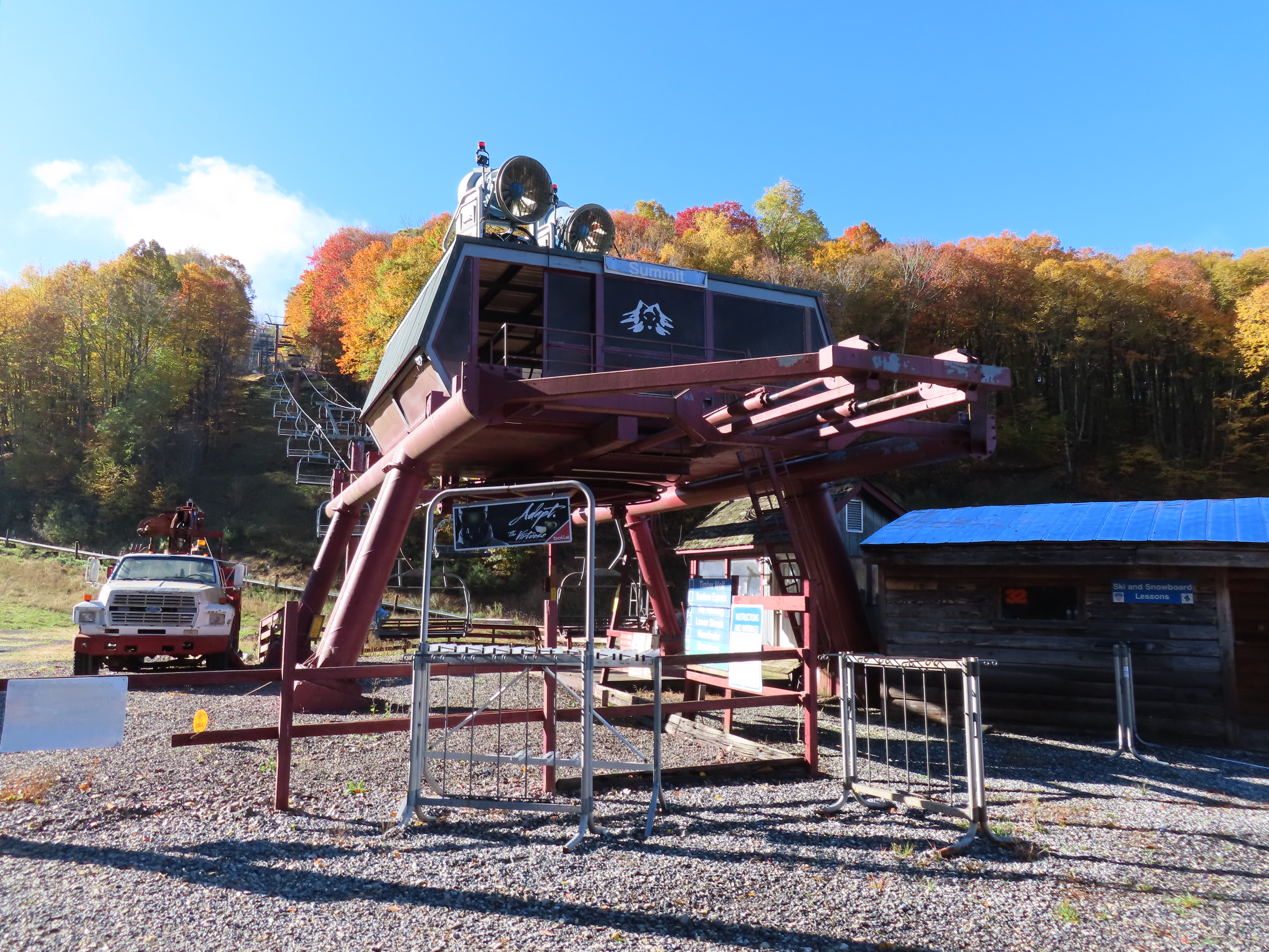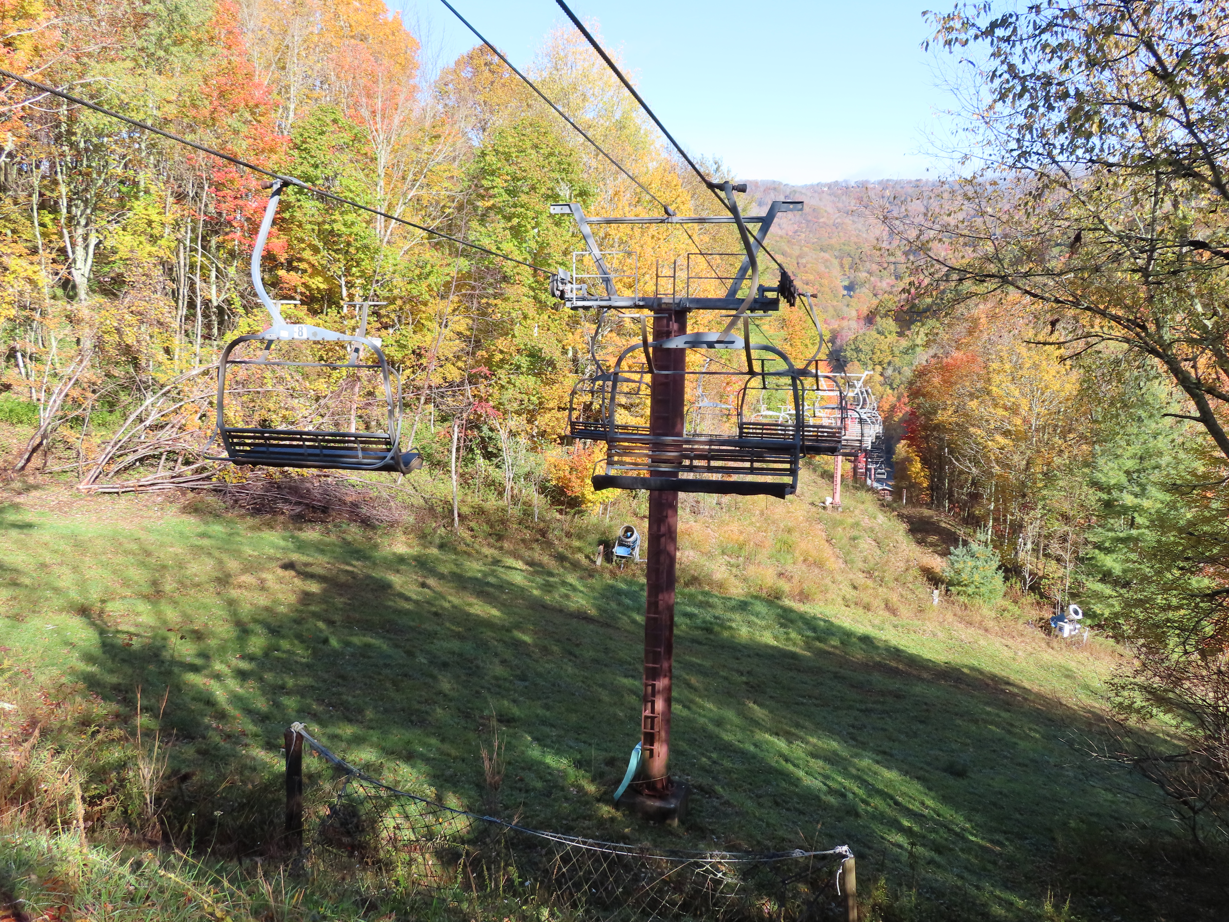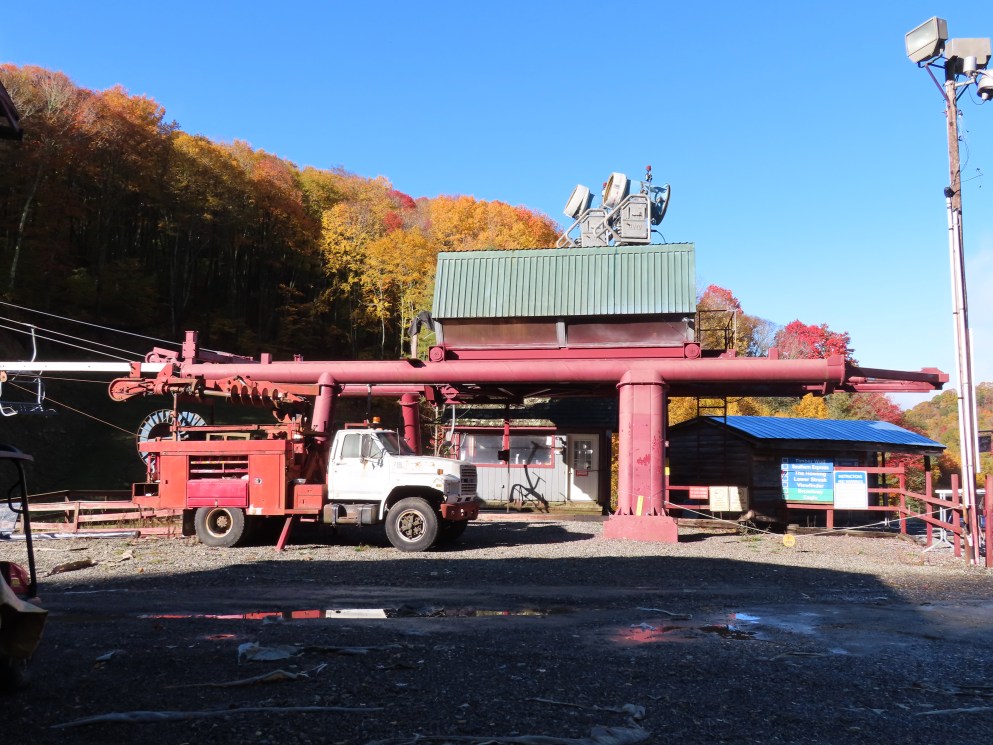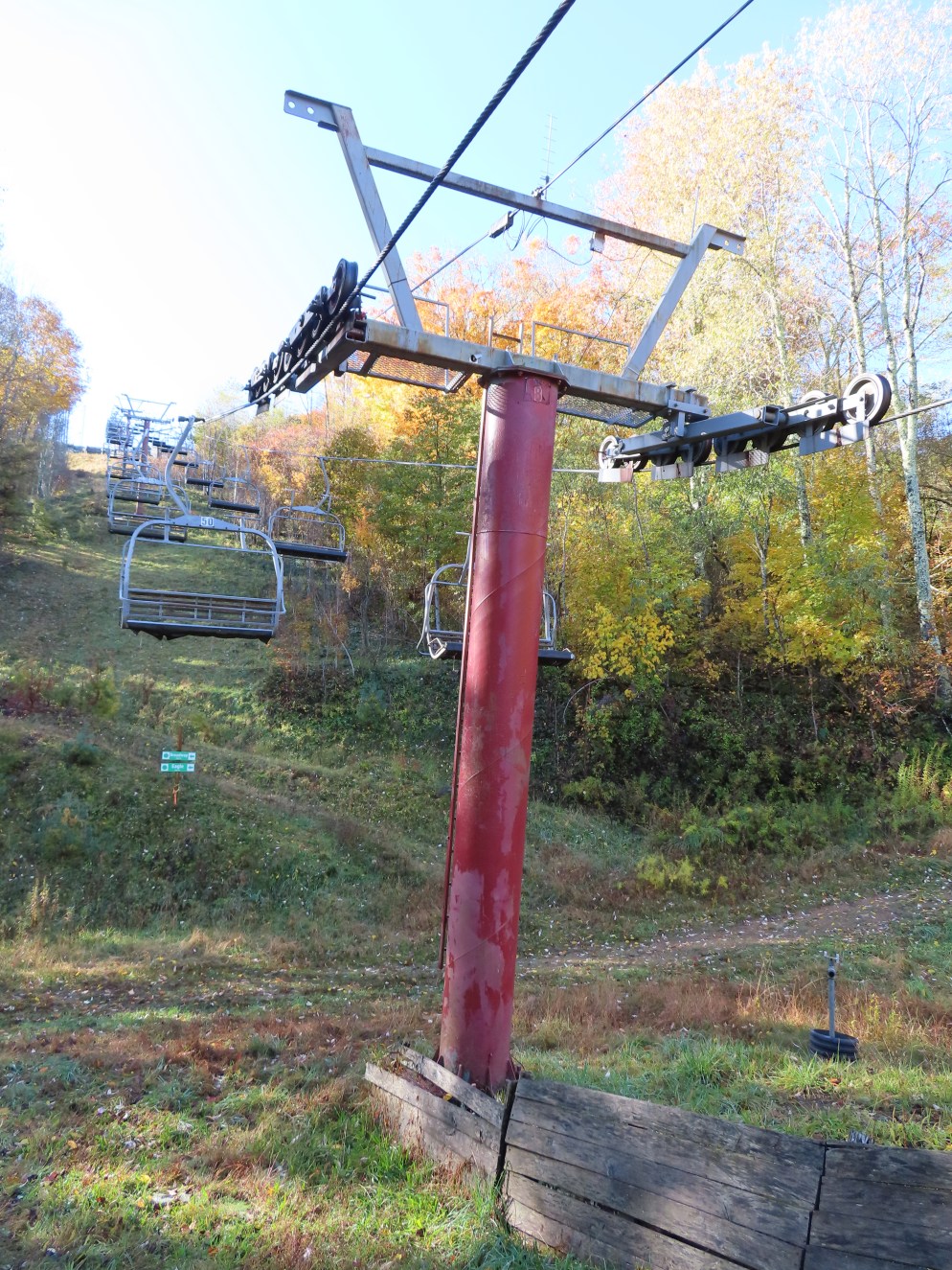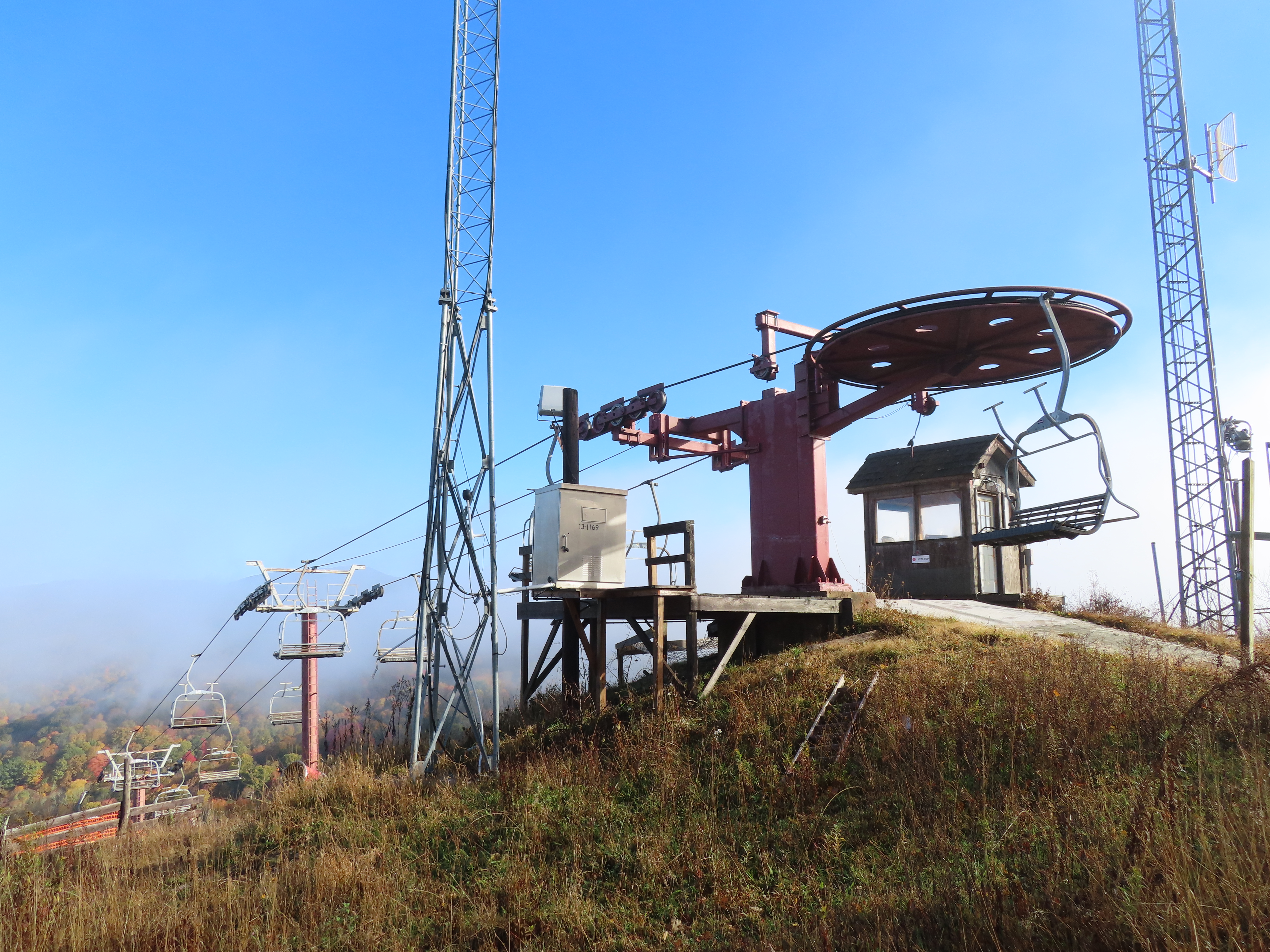 This quad opened in 1988 and effectively replaced a two lift ride from the base to summit.The top terminal and last towers.Return bullwheel and unloading area.View from the summit.Sheave assemblies integrated into the top terminal.Bottom terminal building.View up from the base.Loading area.Doppelmayr drive/tension station.Lower part of the lift line.Middle lift line.Just below the first offload ramp.Looking down from the middle station.Tower at the mid unload.Mid-station overview.Upper part of the lift line.