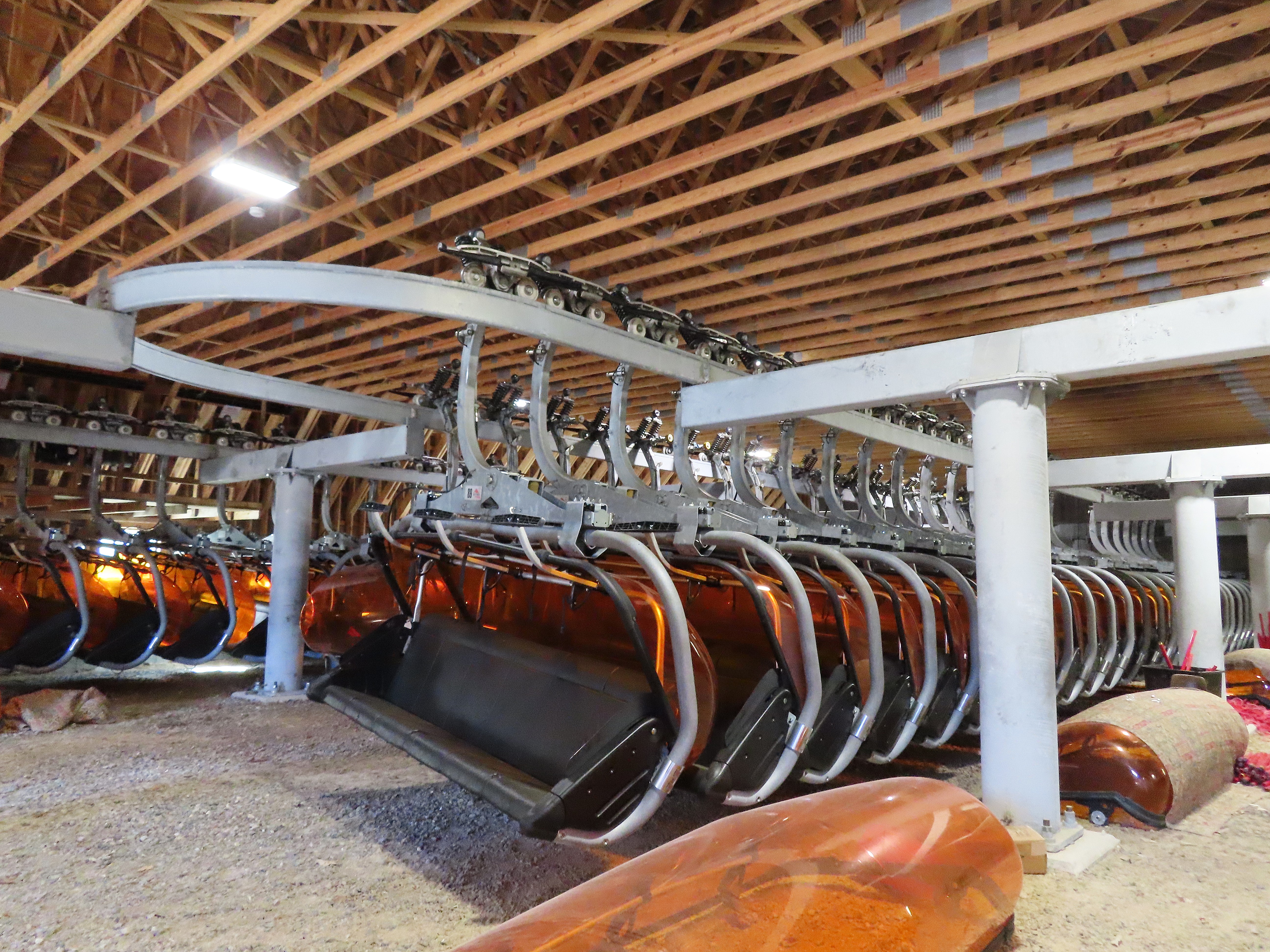 This monster lift replaced a 22 year old high-speed quad in 2014.The bottom terminal with 90 degree loading.A massive parking barn houses all 100+ chairs when not in use.Loading area with gates.Riding up the line.Breakover towers.Arriving at the LPA model drive terminal.Unloading ramp.When these photos were taken, only half the chairs were on line.Top terminal and last tower.View down the lift line, most of which is closed to skiing.Another view of the line.Lower lift line.Leaving the return station.Six place chair with closed bubble.Heated seats.View down the very lower line.Looking down at T12.Tower 17. Some old foundations were reused.Another angle on the top station.Rear of a Leitner bubble chair.Side view of the drive.Lift overview.Riding up at T3.Lift line with double the normal chair spacing.Inside the chair storage building.View from inside the top terminal.Riding down the line in fall.Lower lift line.