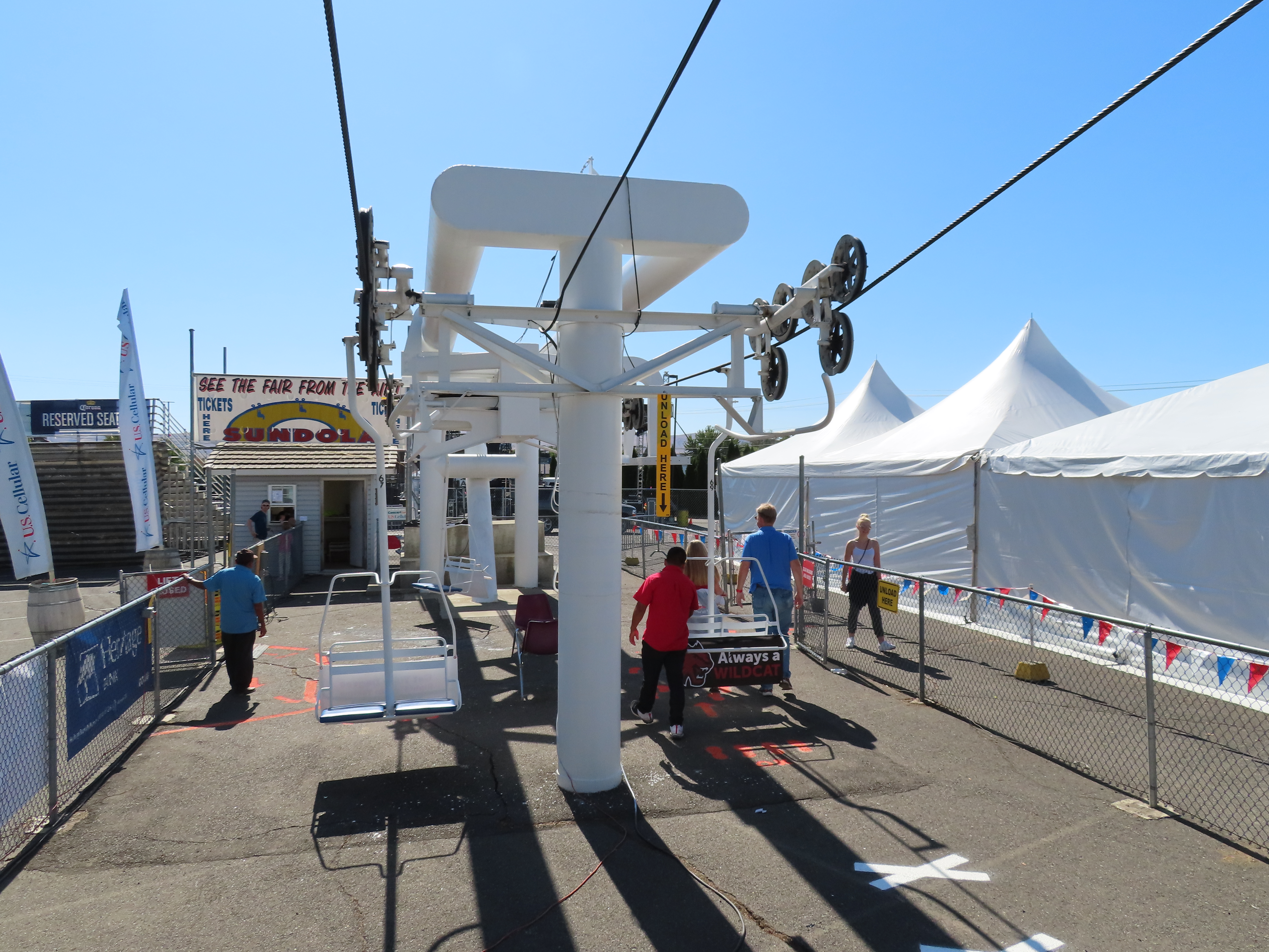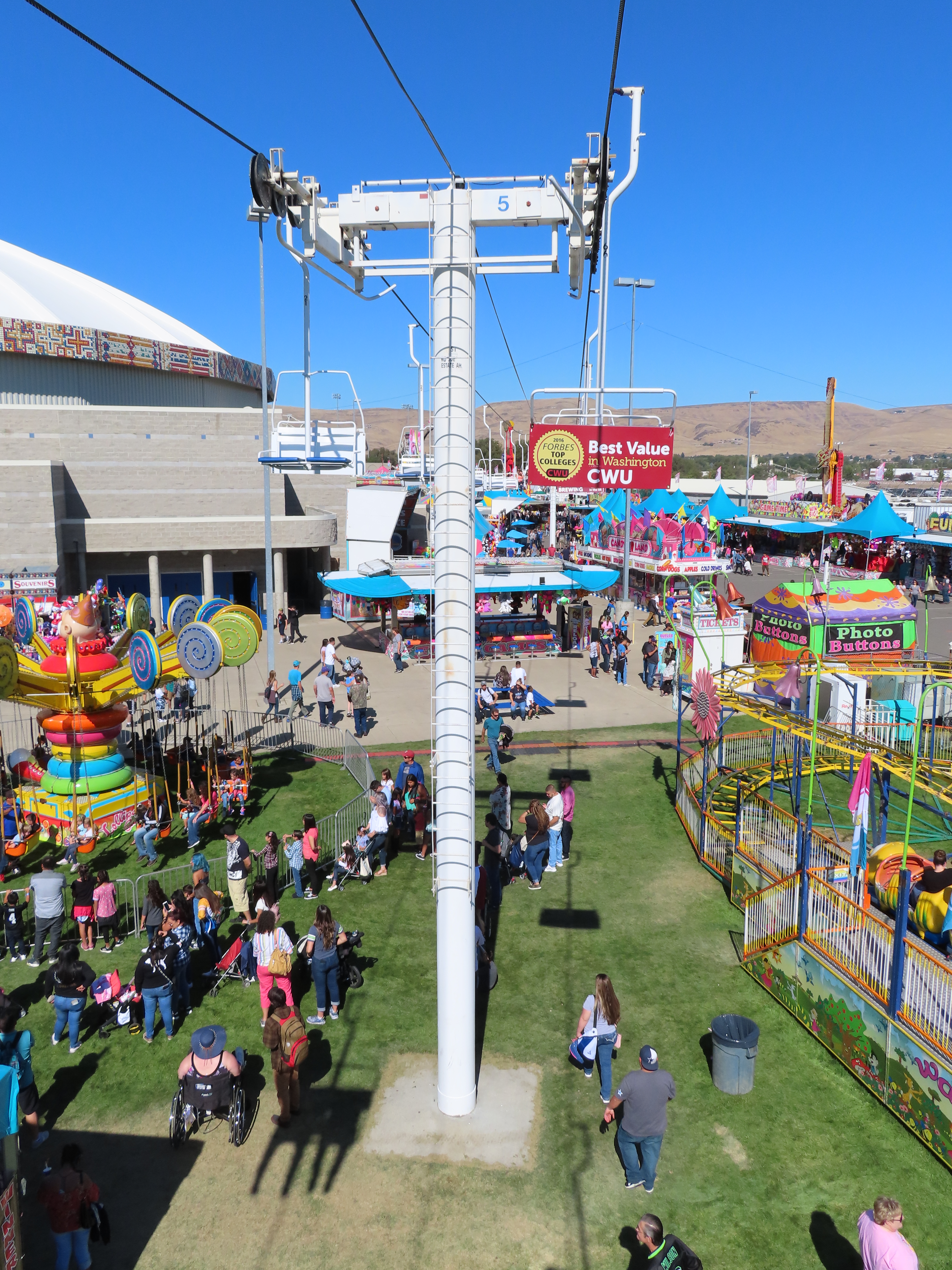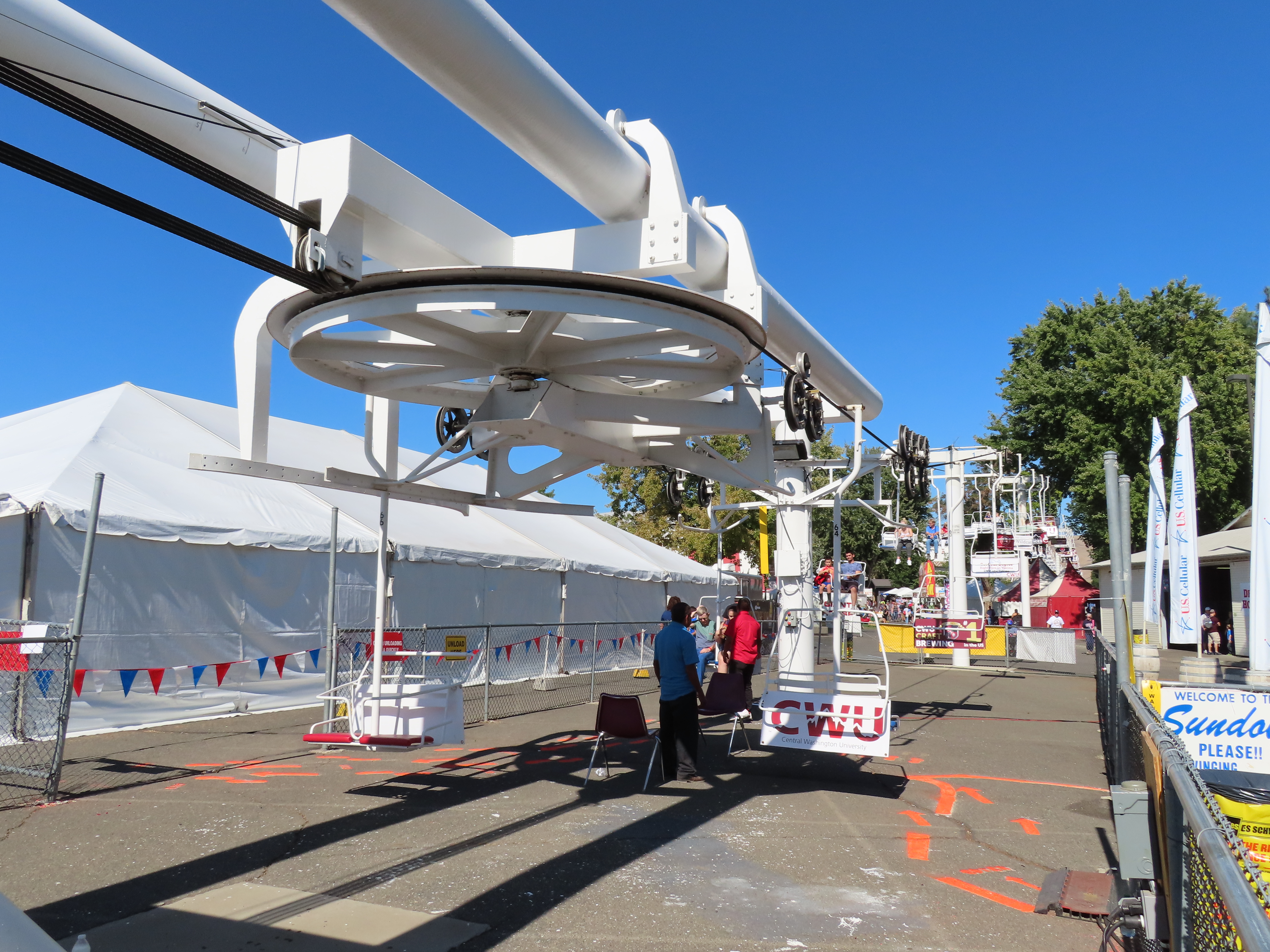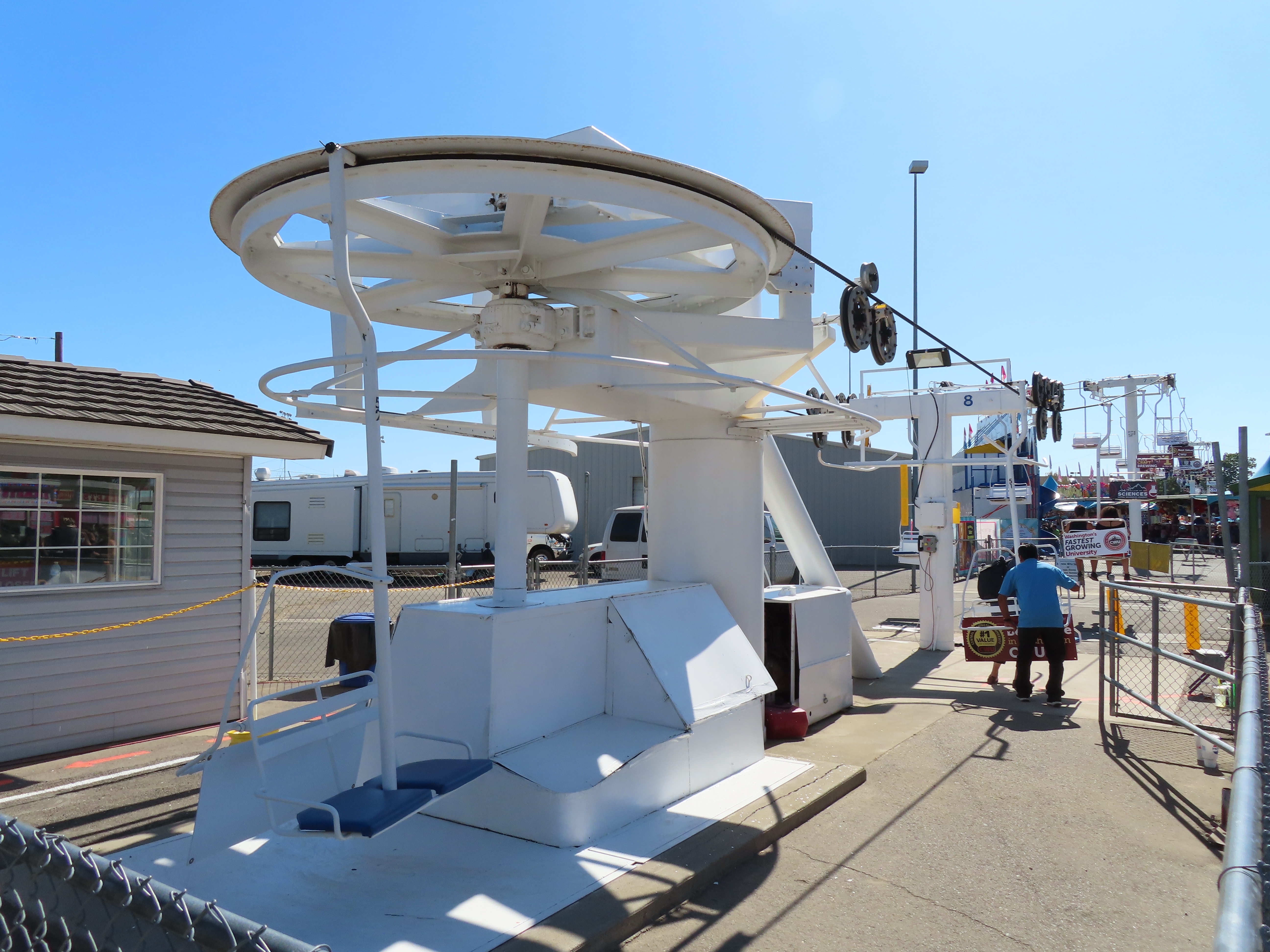 This Riblet chairlift services a short fall fair in Yakima, Washington each year.The lift has 8 towers and 115 chairs.Drive station with backup combustion engine.Drive shaft and bullwheel.Side view of the drive bullwheel.Tower 8 at the loading area.Tower 6.Southern end of the lift.Return terminal with tension carriage.View north.Concrete counterweight.Tower 1.Long return station.Return bullwheel and loading area.Sheaves integrated into the southern station.Riding over the fair.T3.The Sundola passes the Sundome.T5.Riblet chairs with close spacing.Carrier with rare safety bar for Washington.Arriving at the drive terminal.Riding south.Tower 2.The return bullwheel.View north at tower 1.8 sheave assemblies.Looking up at T3.Tower 6.Tower near the drive station..North station bullwheel.A tower head.