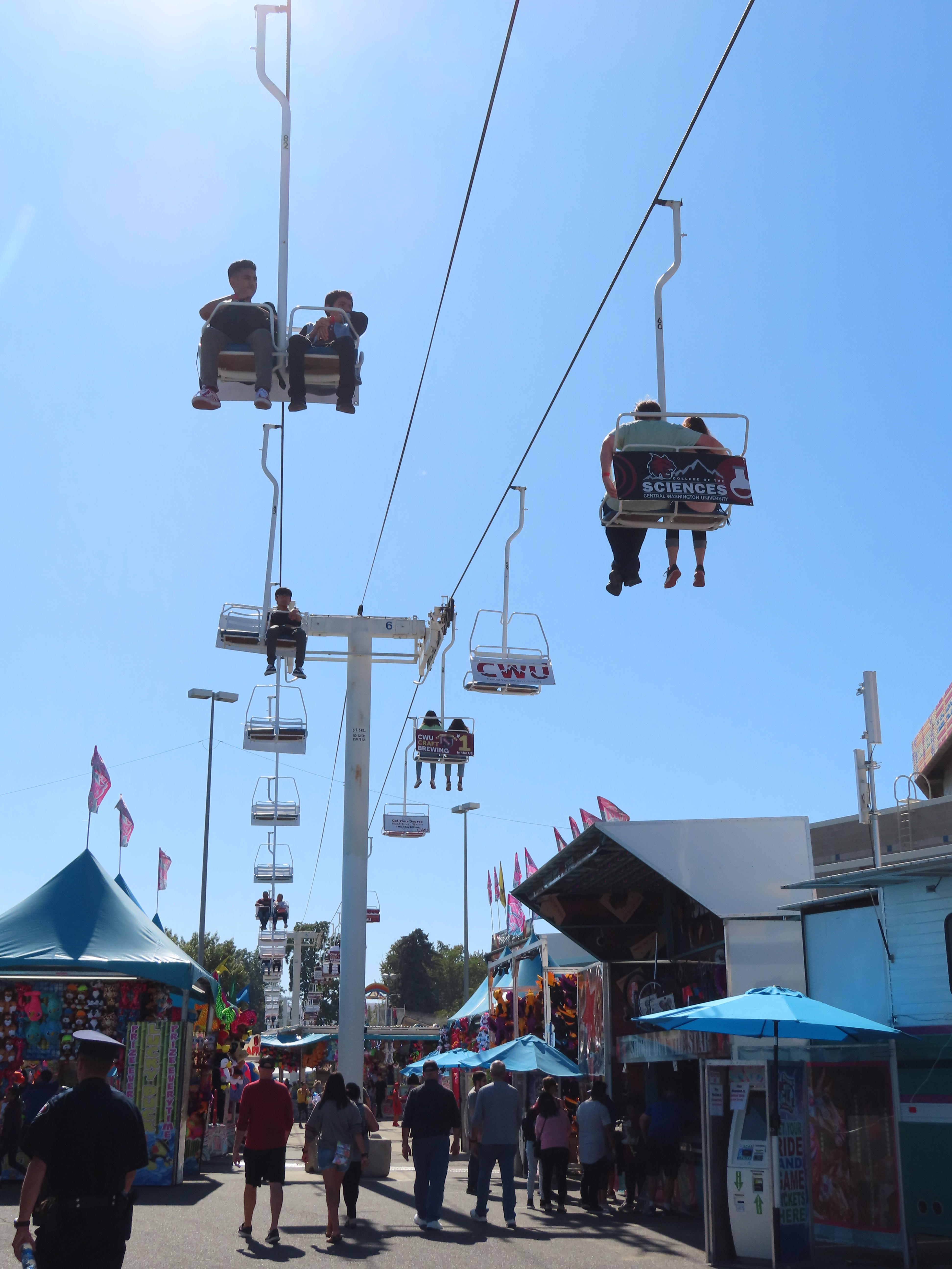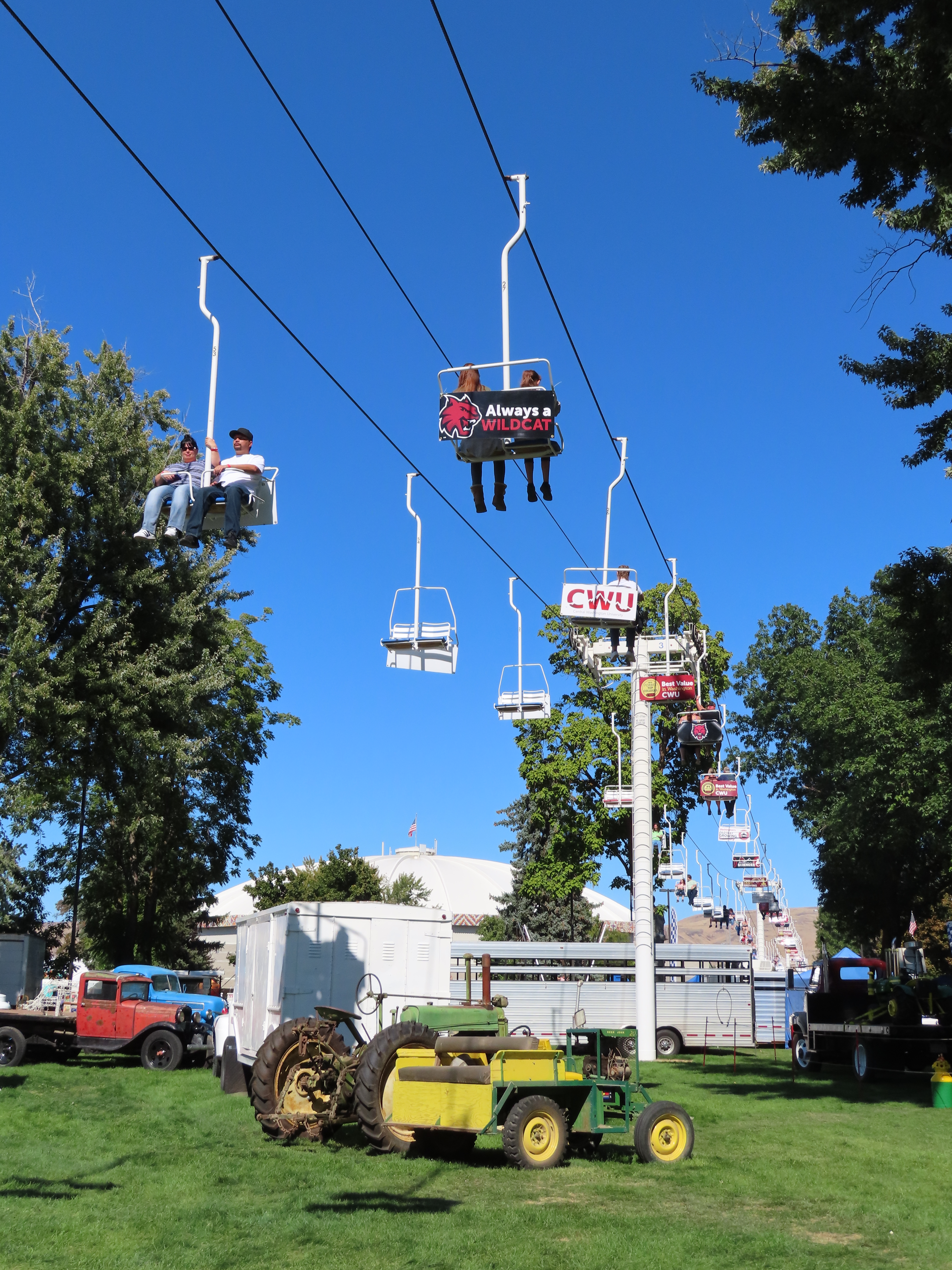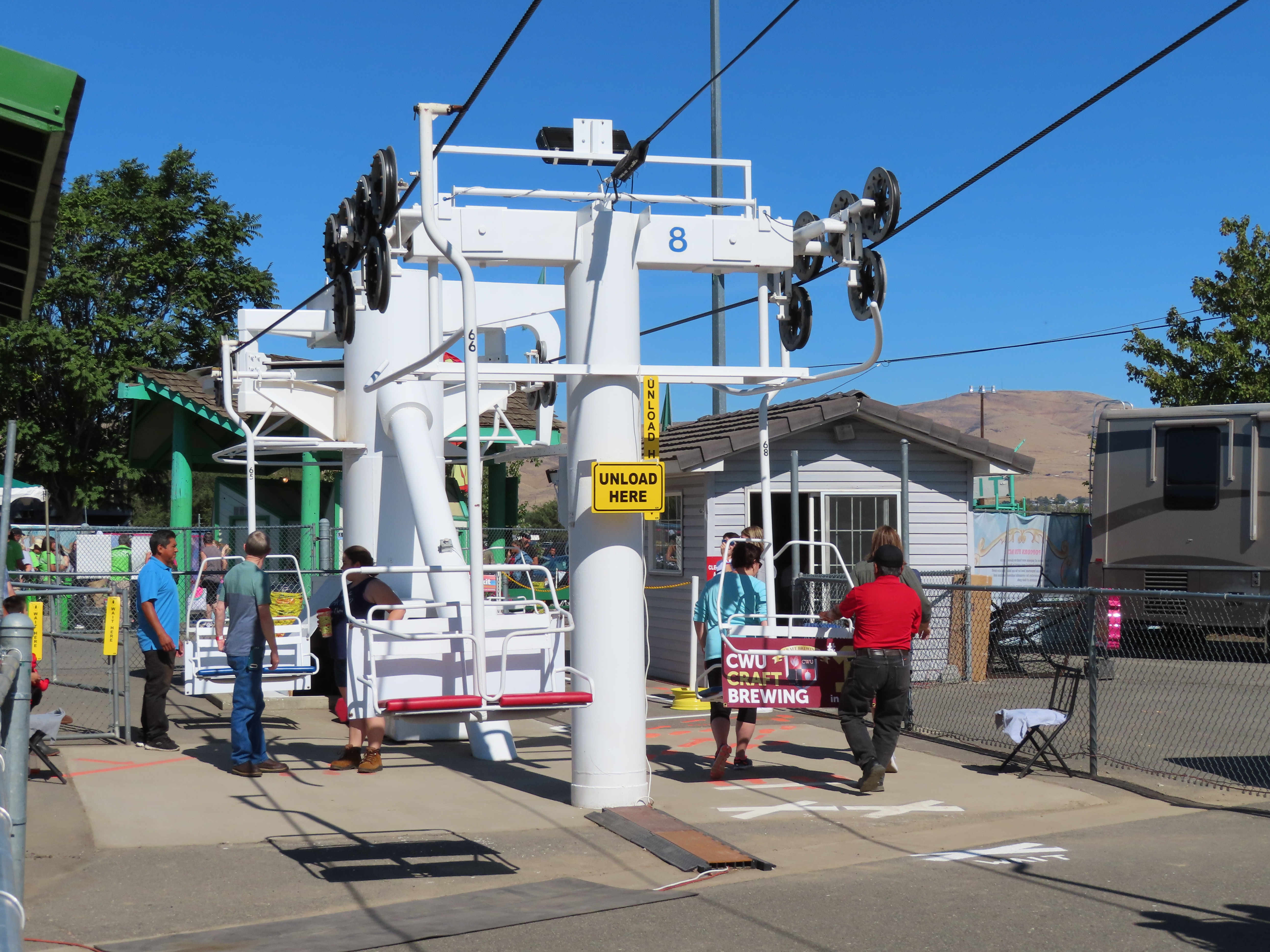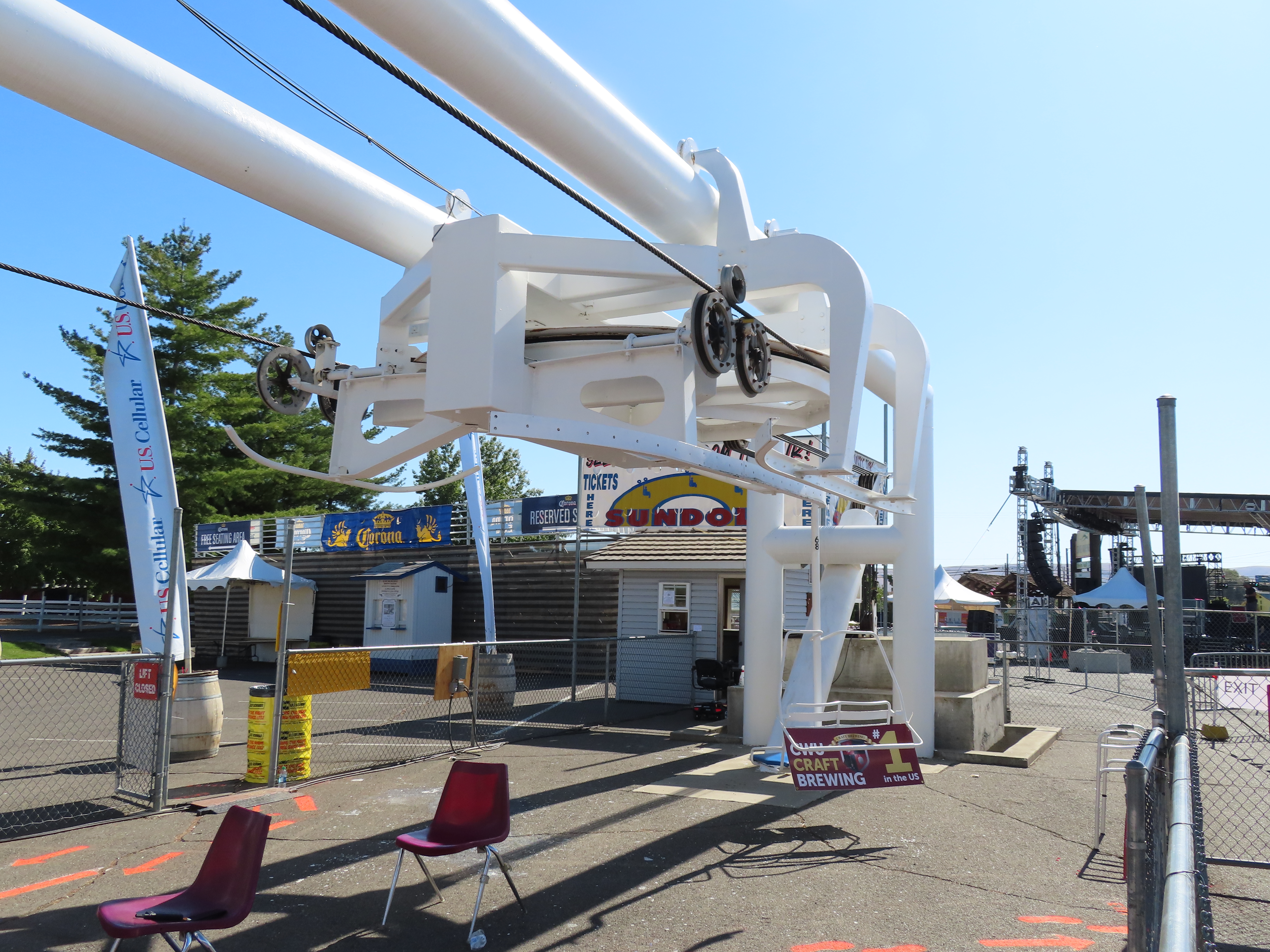 This Riblet chairlift services a short fall fair in Yakima, Washington each year.The lift has 8 towers and 115 chairs.Drive station with backup combustion engine.Drive shaft and bullwheel.Side view of the drive bullwheel.Tower 8 at the loading area.Tower 6.Southern end of the lift.Return terminal with tension carriage.View north.Concrete counterweight.Tower 1.Long return station.Return bullwheel and loading area.Sheaves integrated into the southern station.Riding over the fair.T3.The Sundola passes the Sundome.T5.Riblet chairs with close spacing.Carrier with rare safety bar for Washington.Arriving at the drive terminal.Riding south.Tower 2.The return bullwheel.View north at tower 1.8 sheave assemblies.Looking up at T3.Tower 6.Tower near the drive station..North station bullwheel.A tower head.