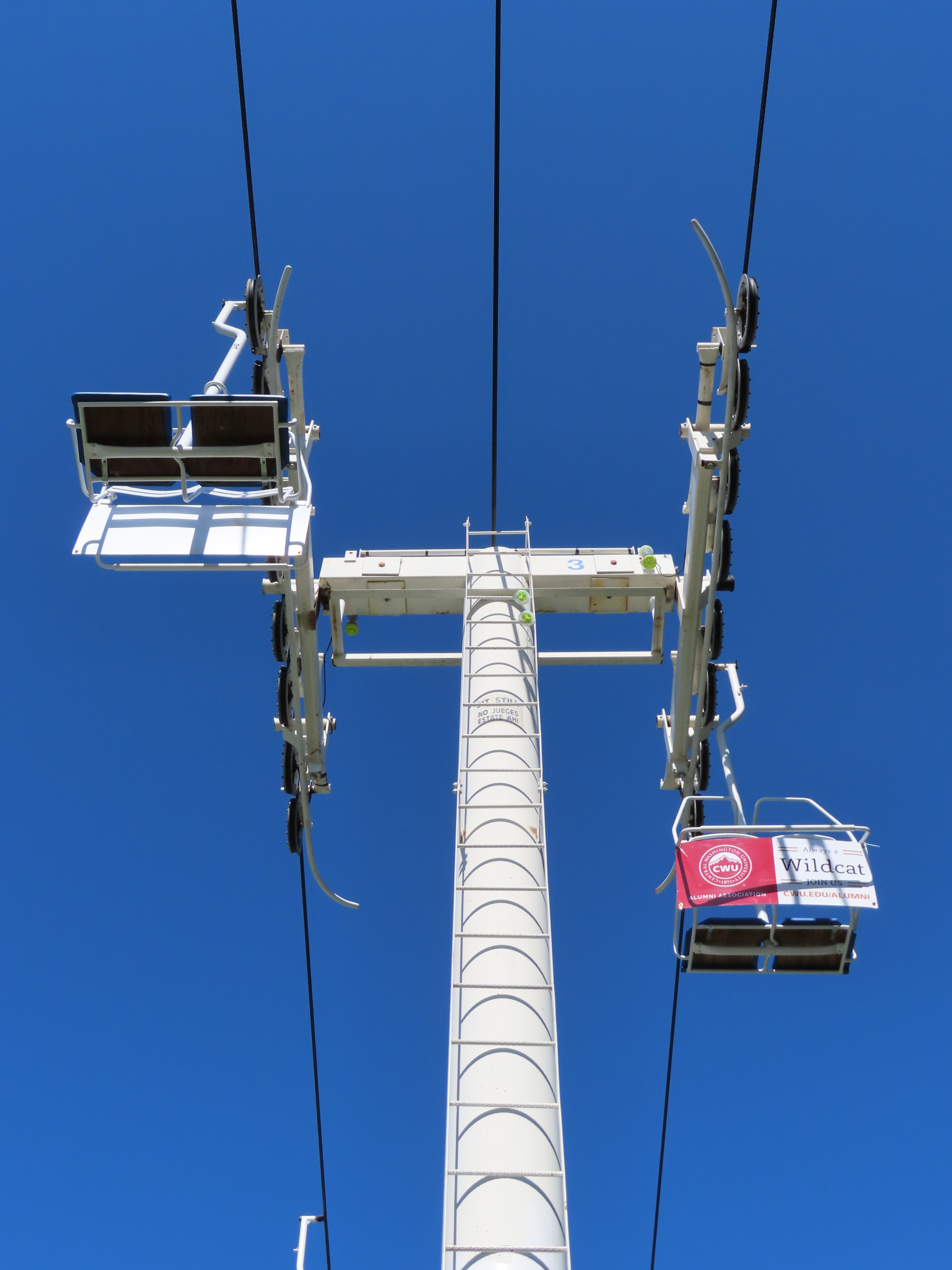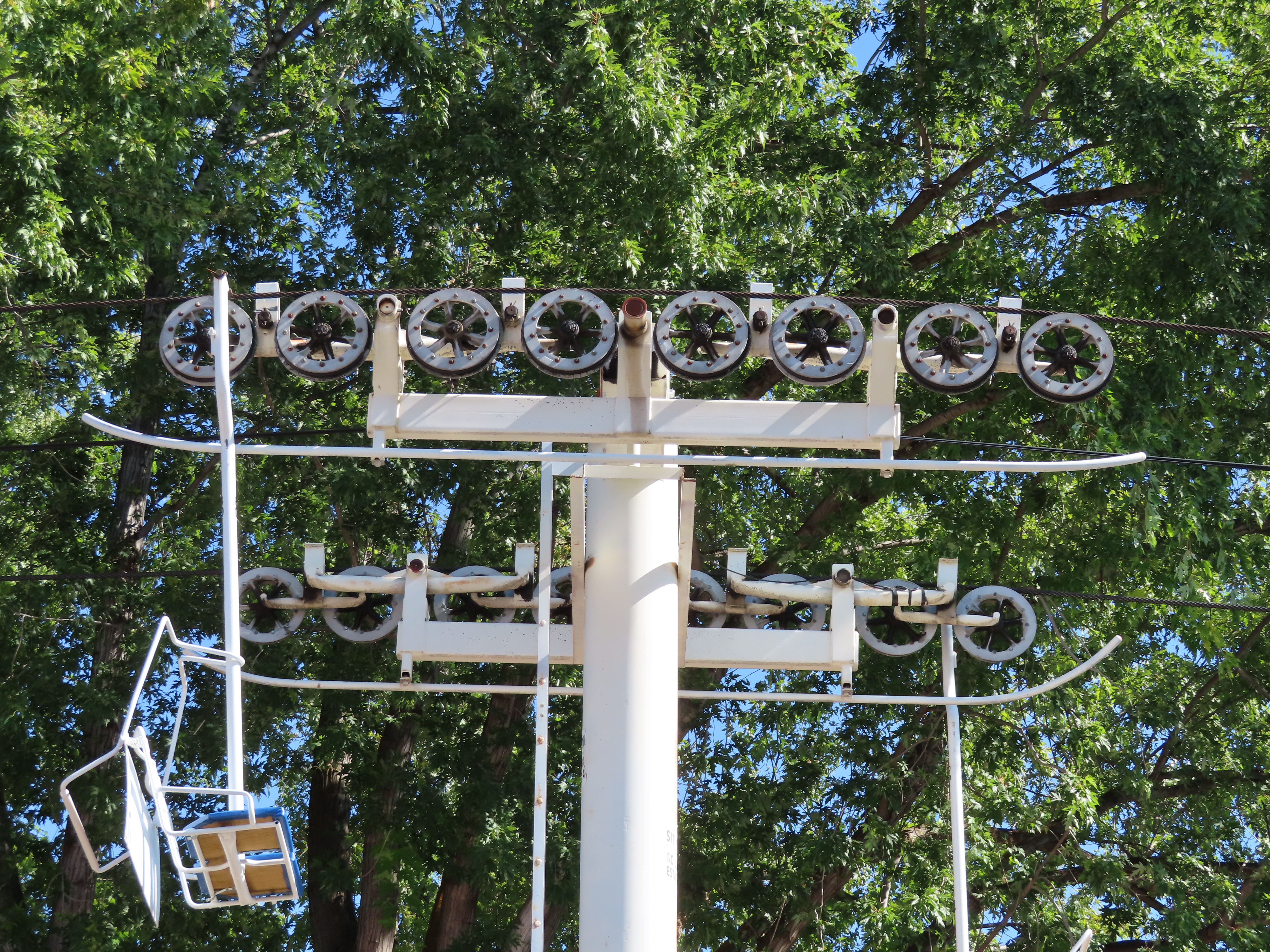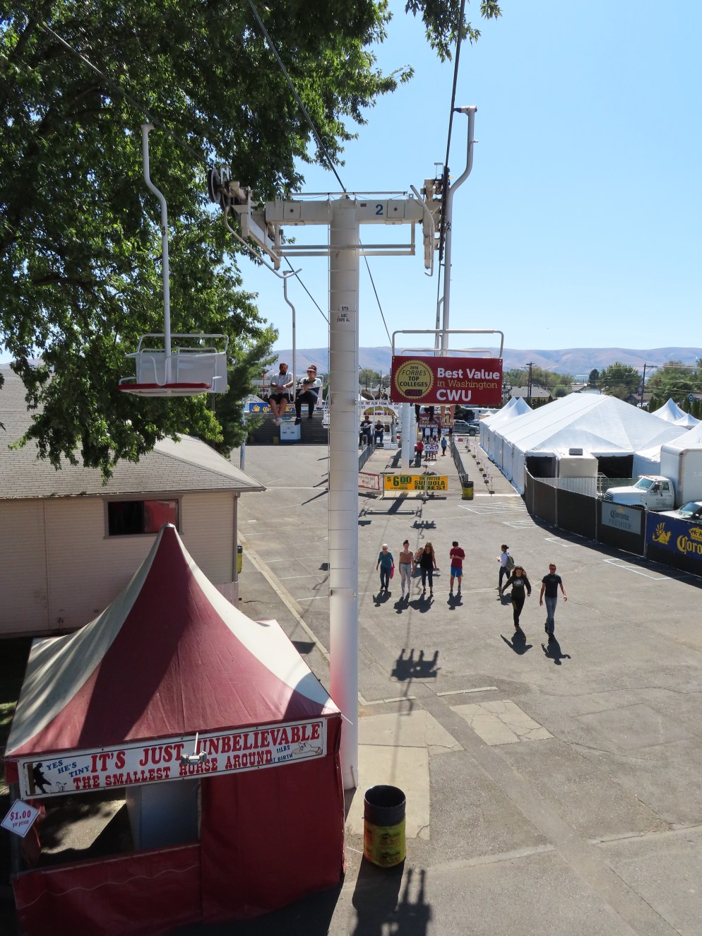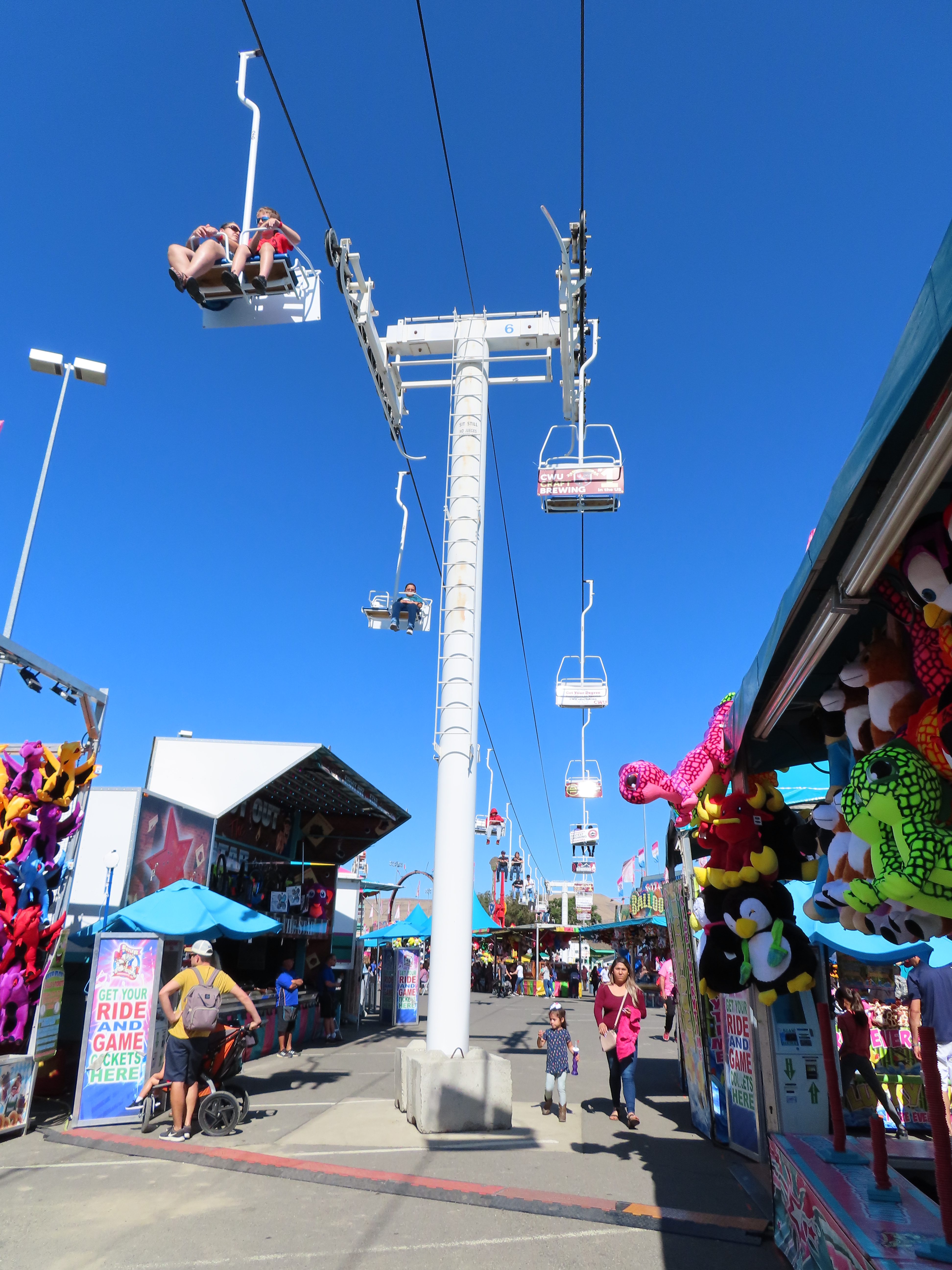 This Riblet chairlift services a short fall fair in Yakima, Washington each year.The lift has 8 towers and 115 chairs.Drive station with backup combustion engine.Drive shaft and bullwheel.Side view of the drive bullwheel.Tower 8 at the loading area.Tower 6.Southern end of the lift.Return terminal with tension carriage.View north.Concrete counterweight.Tower 1.Long return station.Return bullwheel and loading area.Sheaves integrated into the southern station.Riding over the fair.T3.The Sundola passes the Sundome.T5.Riblet chairs with close spacing.Carrier with rare safety bar for Washington.Arriving at the drive terminal.Riding south.Tower 2.The return bullwheel.View north at tower 1.8 sheave assemblies.Looking up at T3.Tower 6.Tower near the drive station..North station bullwheel.A tower head.