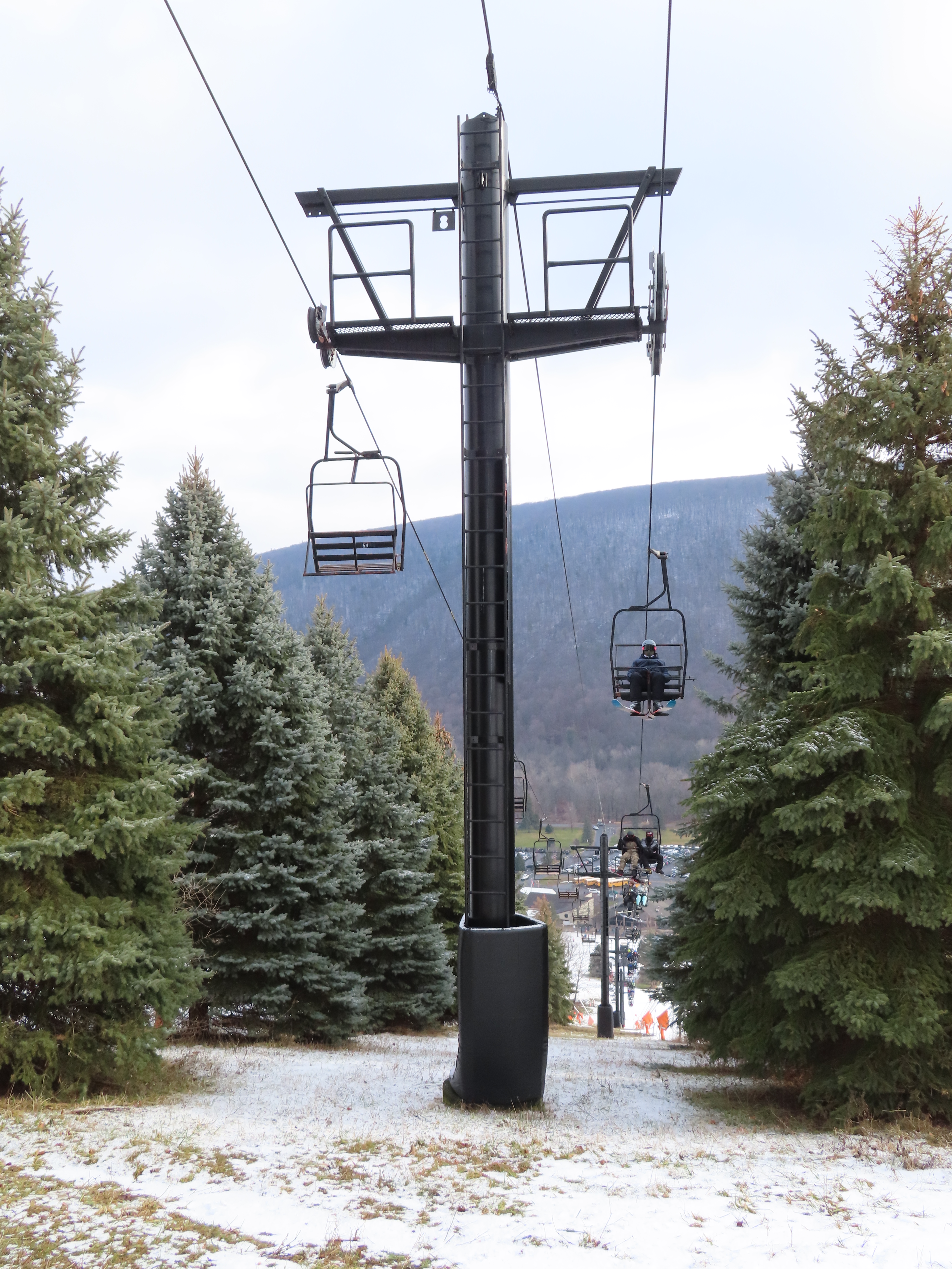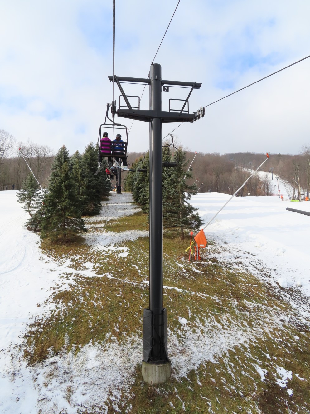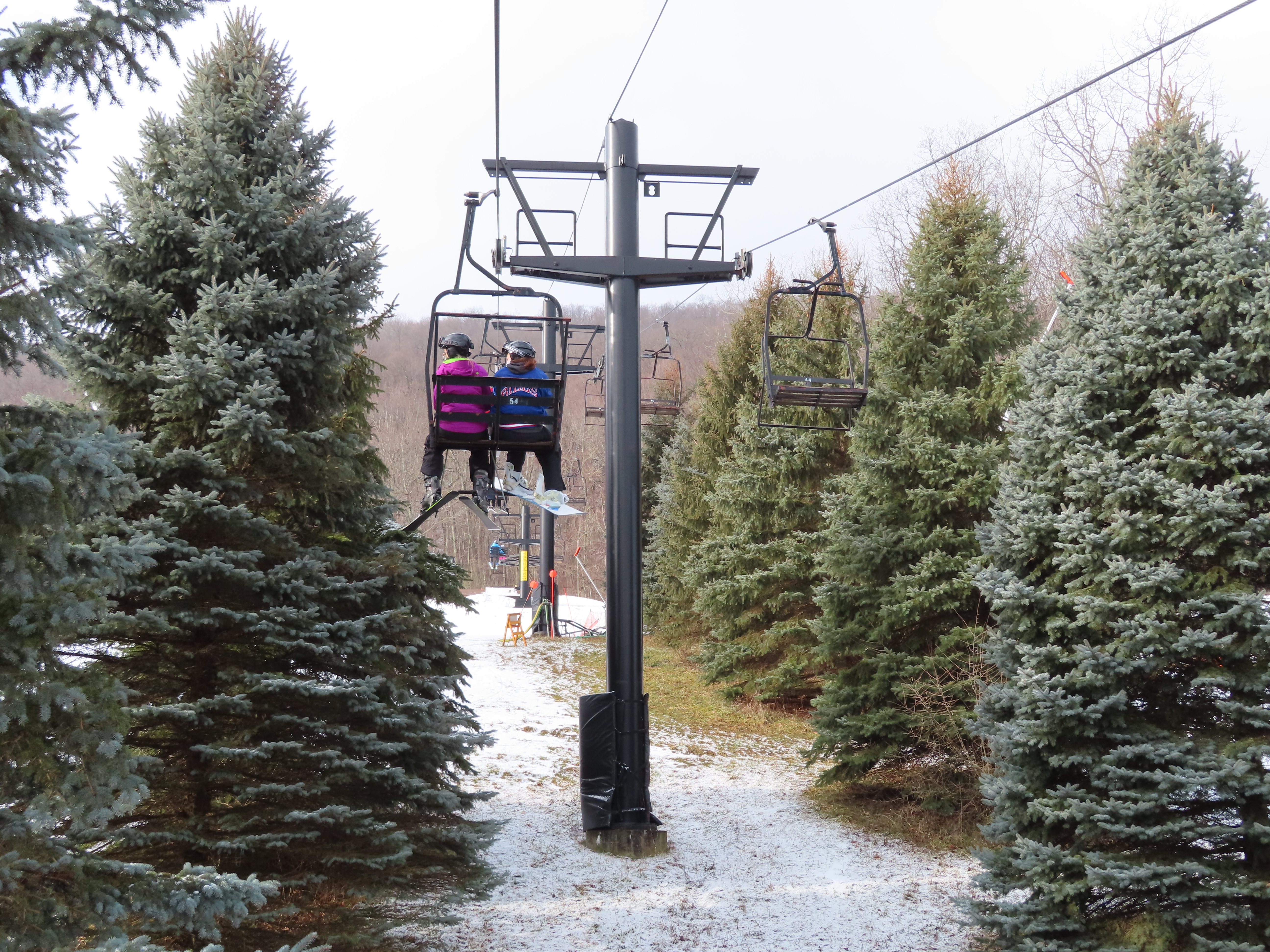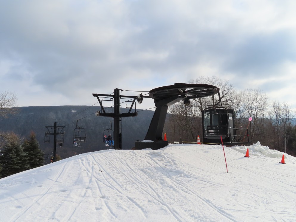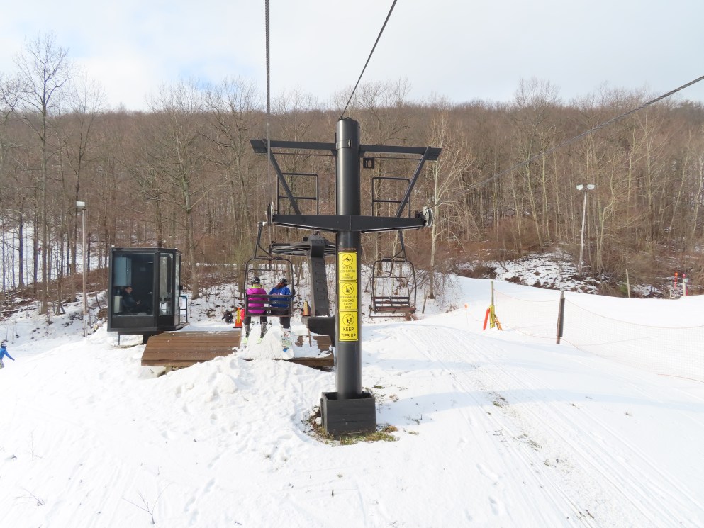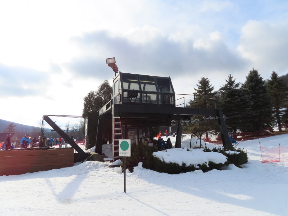 Love this lift how part of it is in the evergreens and its another quiet lift. This may have been my first double ever. They have been replacing some of the Borvig chairs with newer or used Patrek chairs for some reason? I didn’t realize how old this lift is. The problem the handlebars are too high for my skis and my snowboard. The back rest is wood and I would love to see them put a cushion on that or something