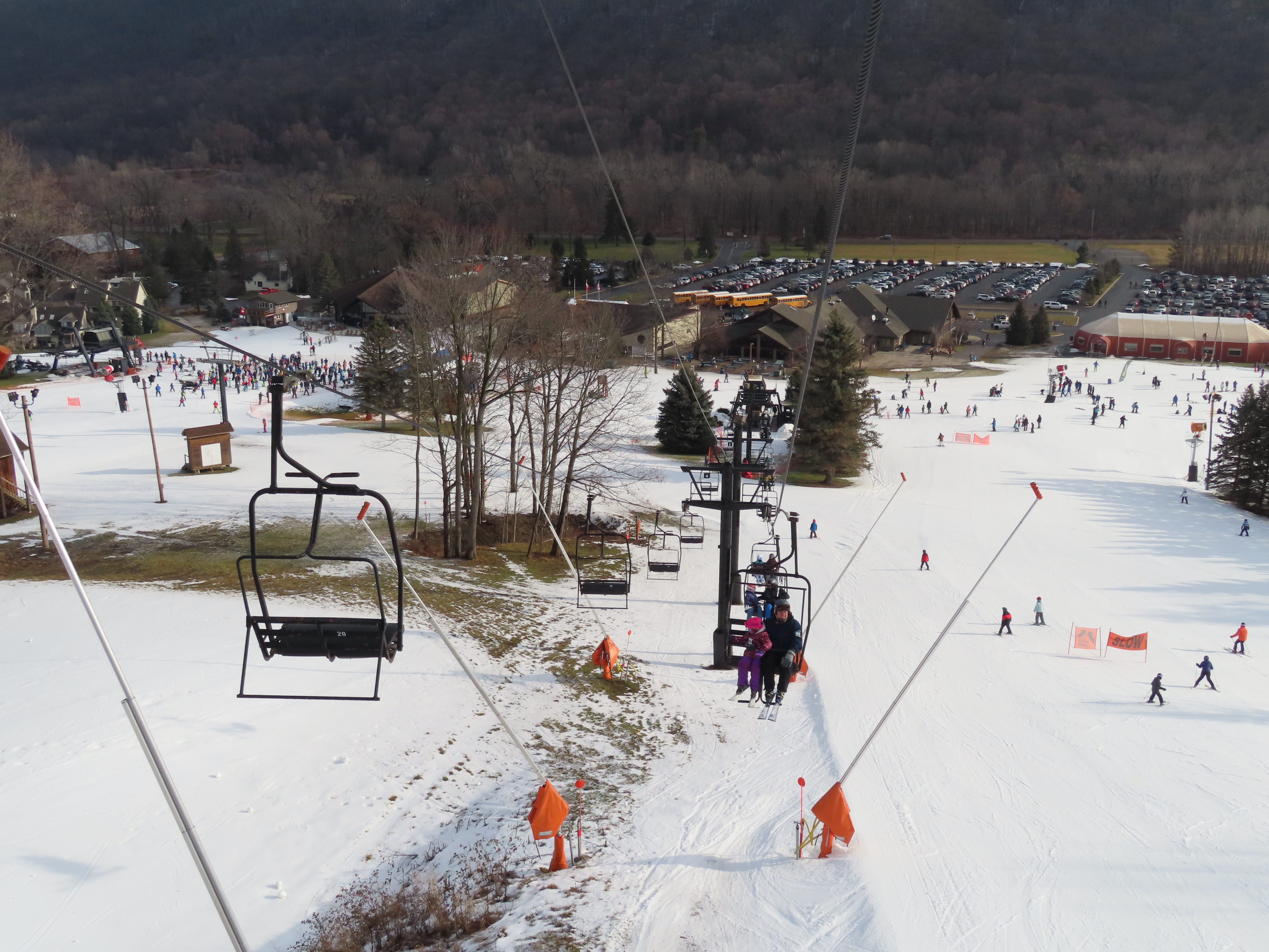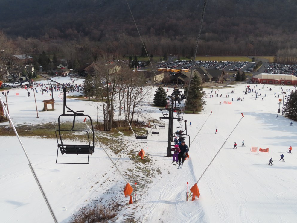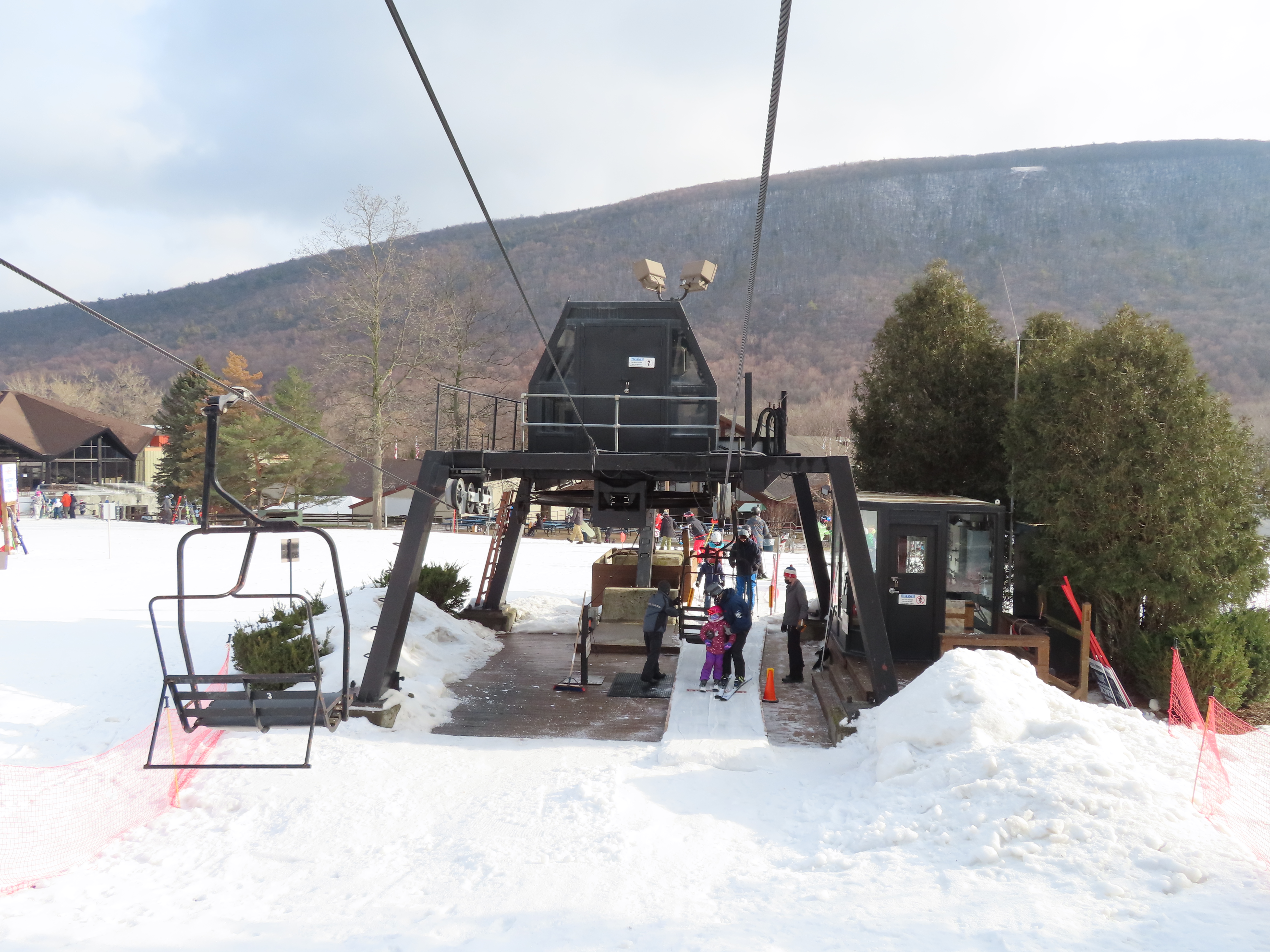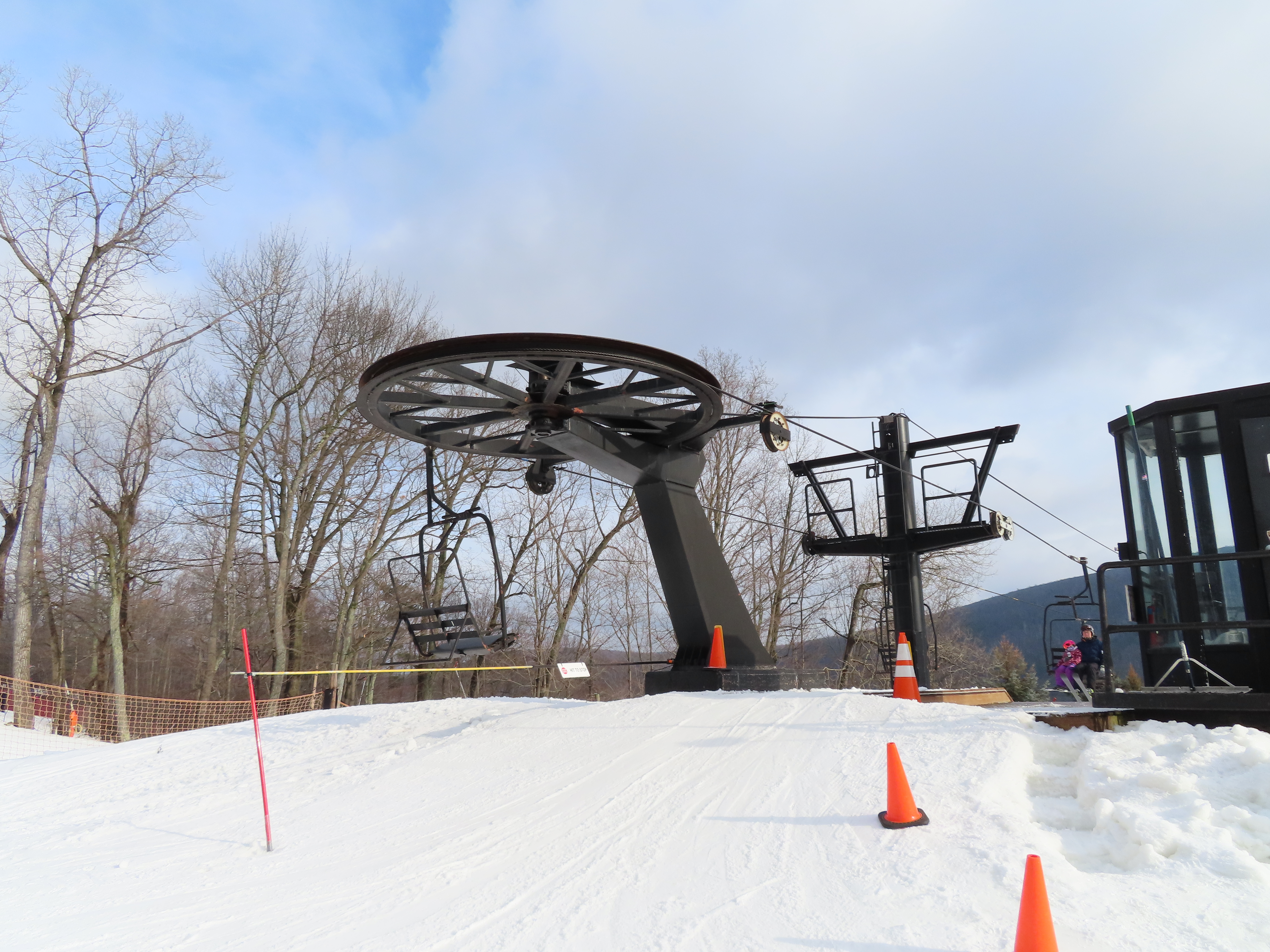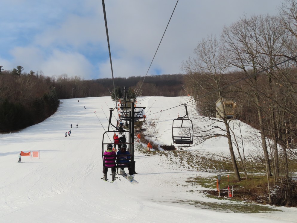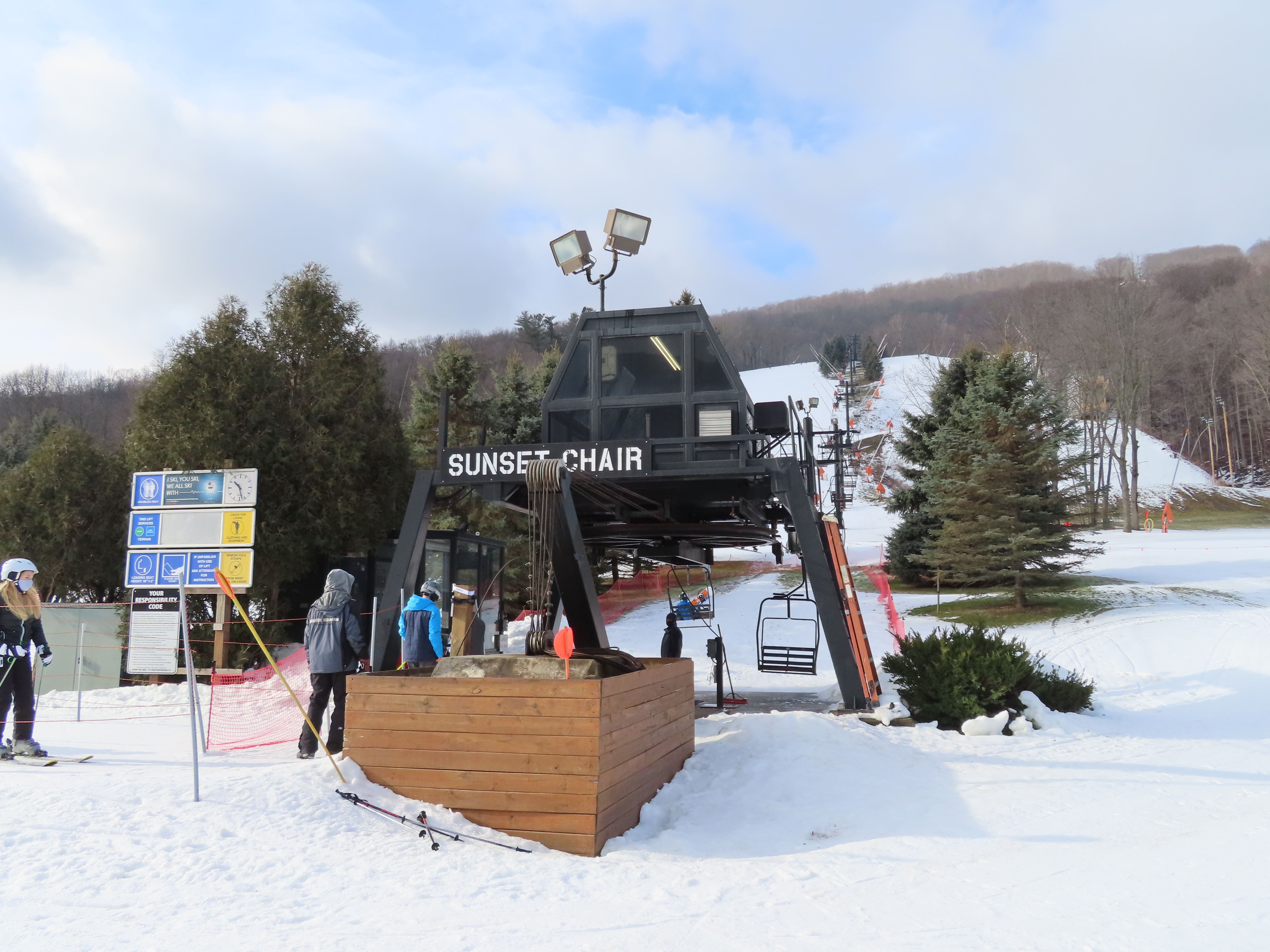 Love this lift how part of it is in the evergreens and its another quiet lift. This may have been my first double ever. They have been replacing some of the Borvig chairs with newer or used Patrek chairs for some reason? I didn’t realize how old this lift is. The problem the handlebars are too high for my skis and my snowboard. The back rest is wood and I would love to see them put a cushion on that or something