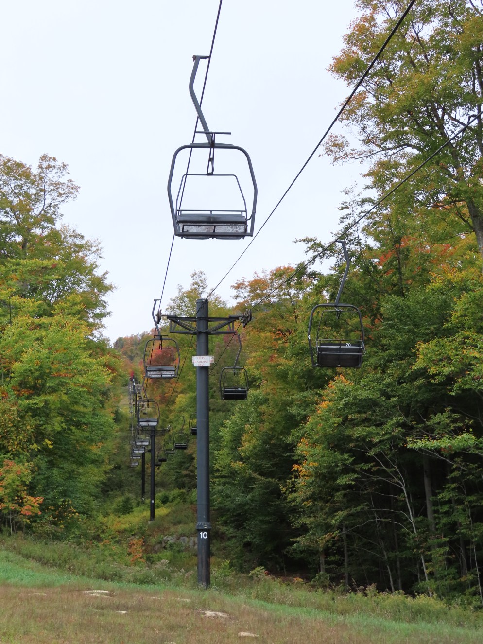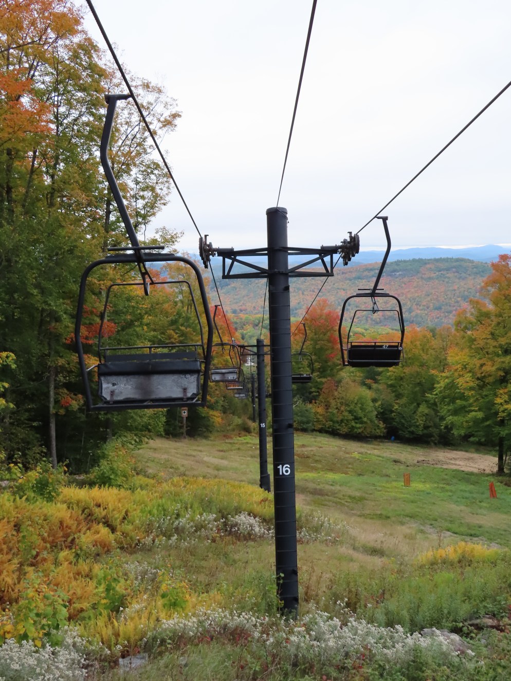 The Sunway double runs the line of the first former gondola section and has a middle station for unloading.View up the lift line.’80s-style Riblet drive-tension station.Lift overview.Side view of the mid.Lift line below the midstation.Upper part of the lift line.Unload ramp number one.Breakover towers below the top terminal.View down from the summit.The top bullwheel.