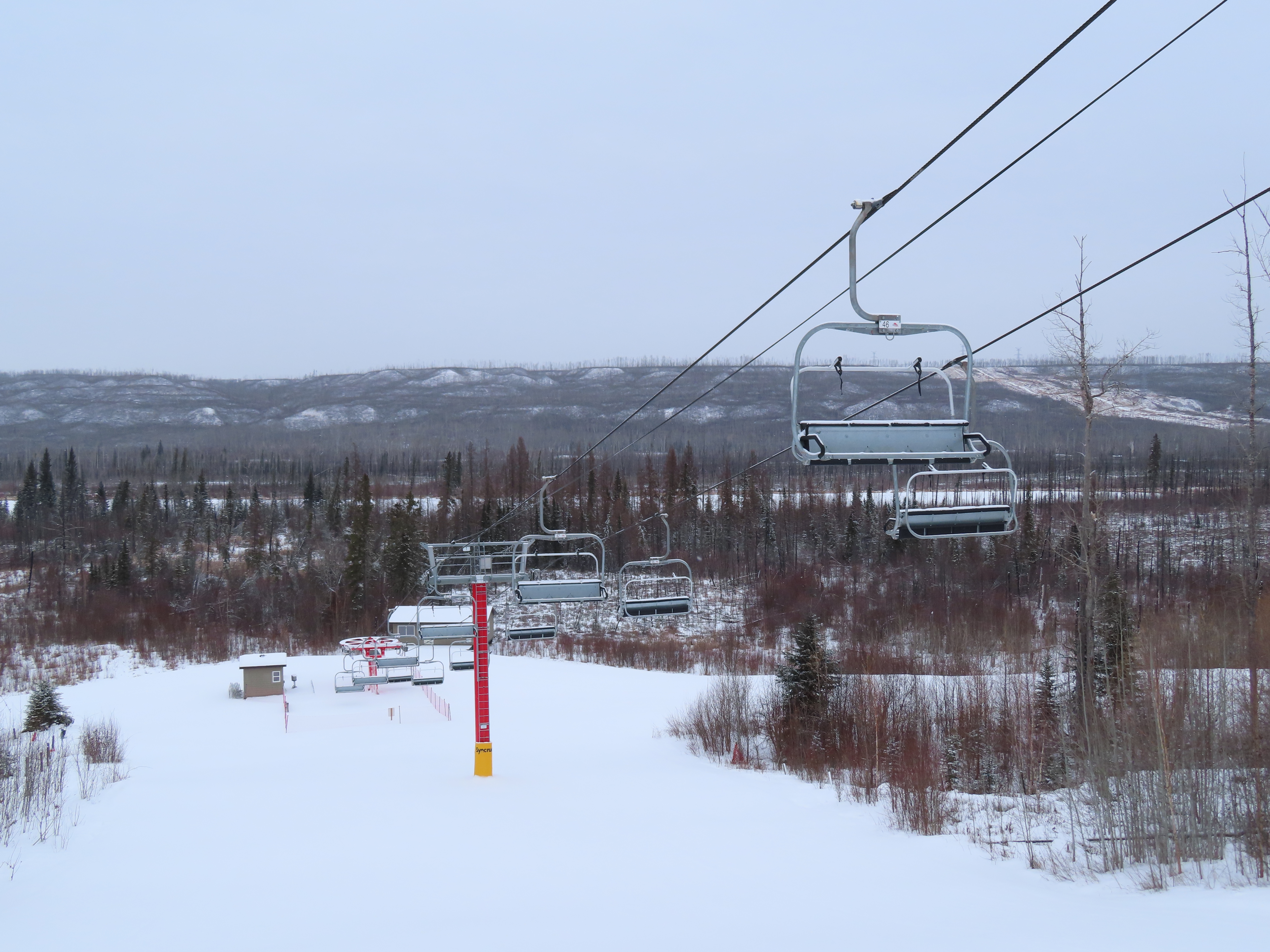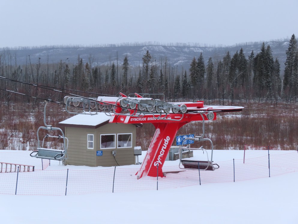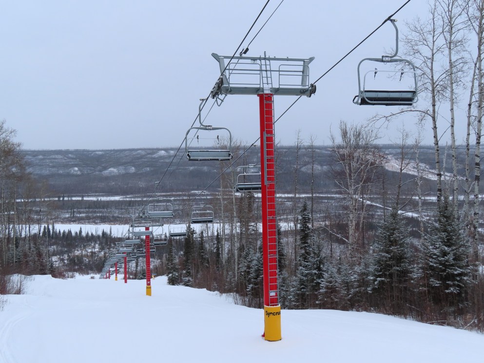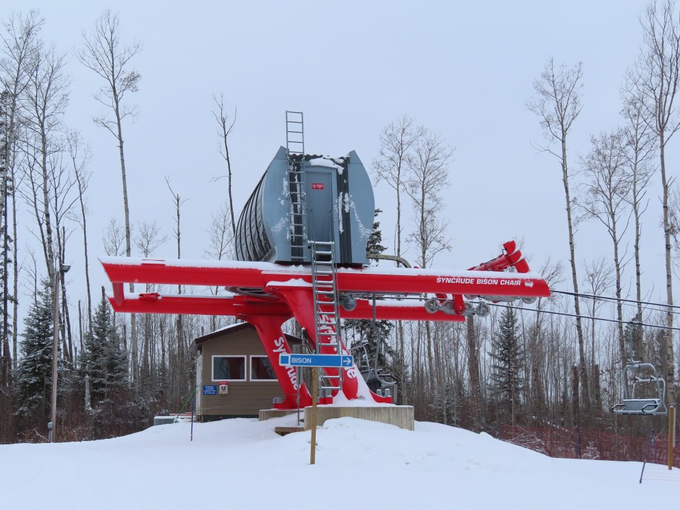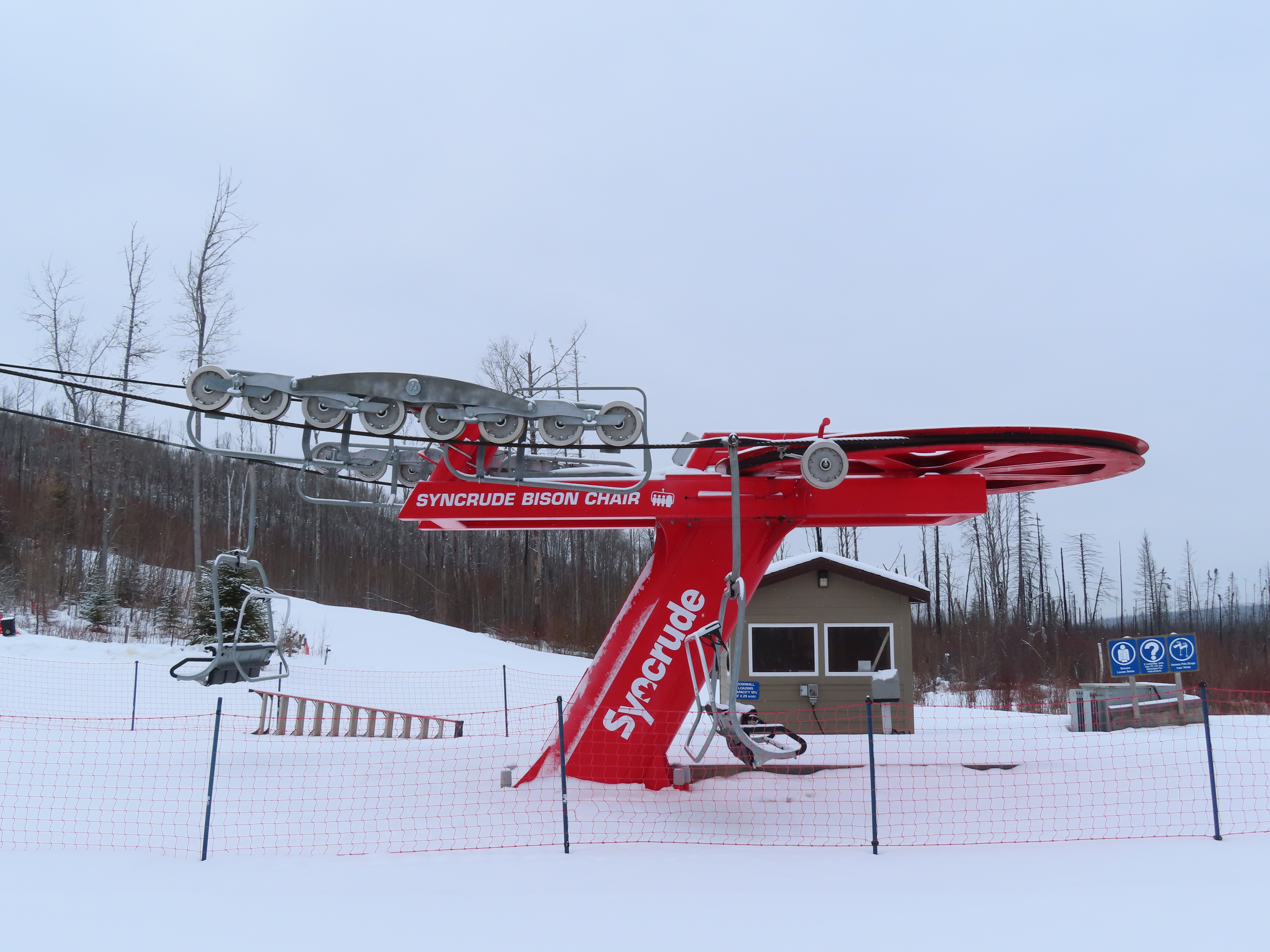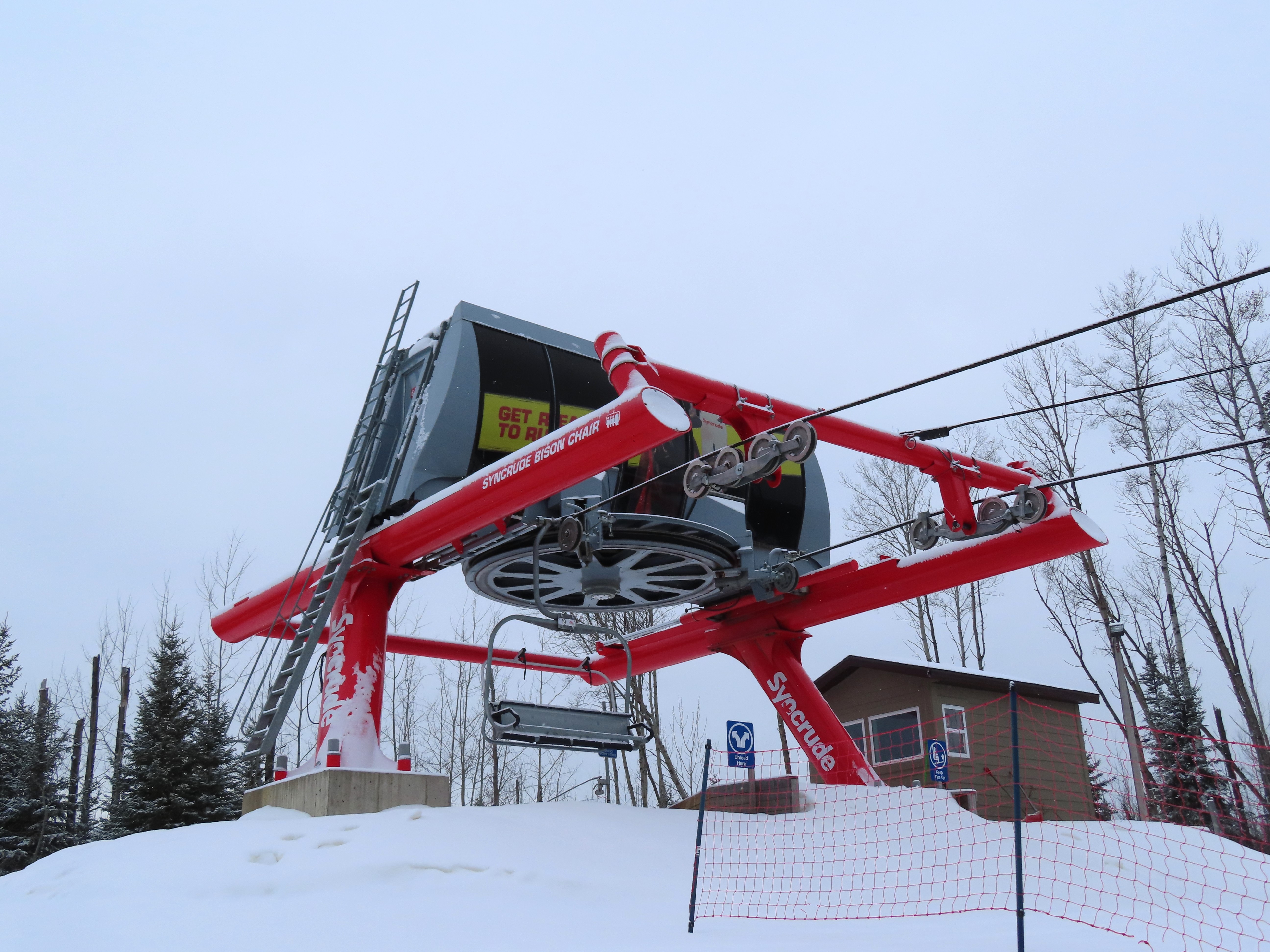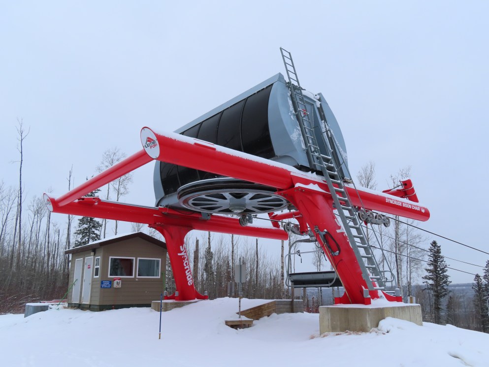 This was the first of two Leitner-Poma Alpha quads built at Vista Ridge over two years.Unloading area.Motor room and drive bullwheel.Another view of the top station at this up side down ski area.View down the lift line.Top terminal and tower 8.Rare painted towers instead of galvanized.Upper half of the lift line.Lower lift line.Tower 1.This lift was funded and named by the Syncrude oil company.Loading area and Z terminal.View up the line.Bottom station in the Northern Alberta wilderness.