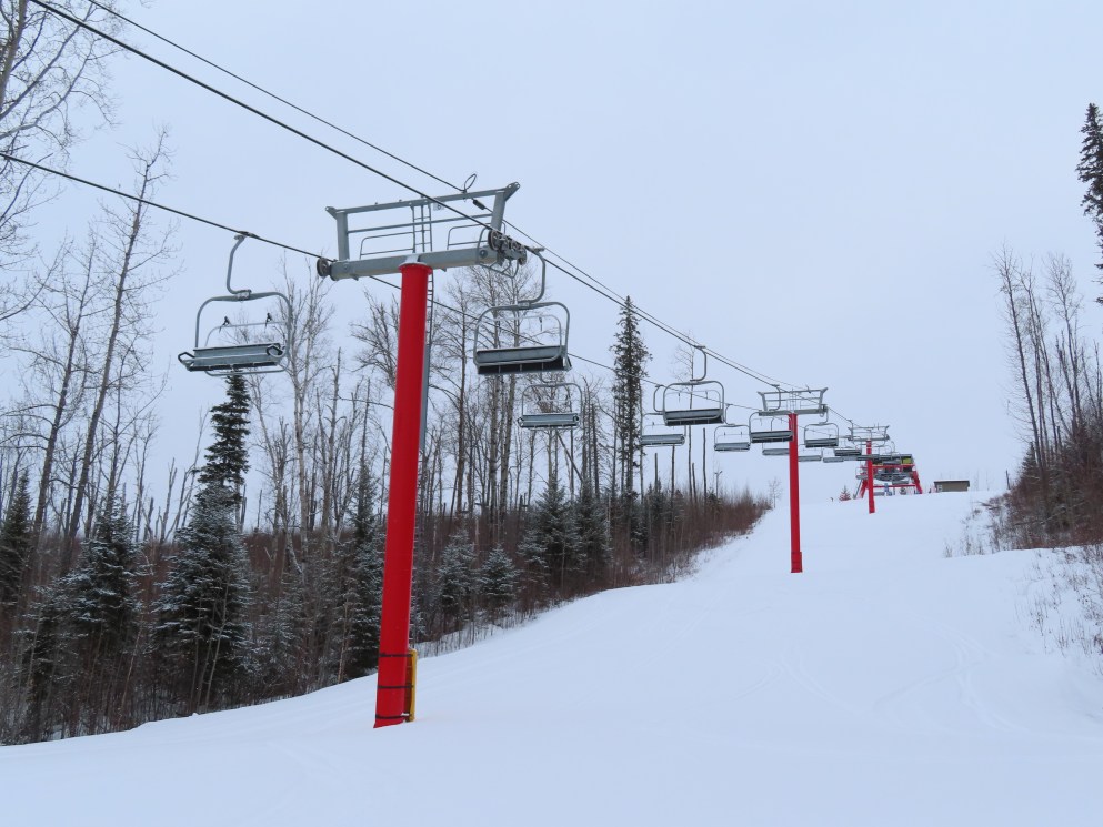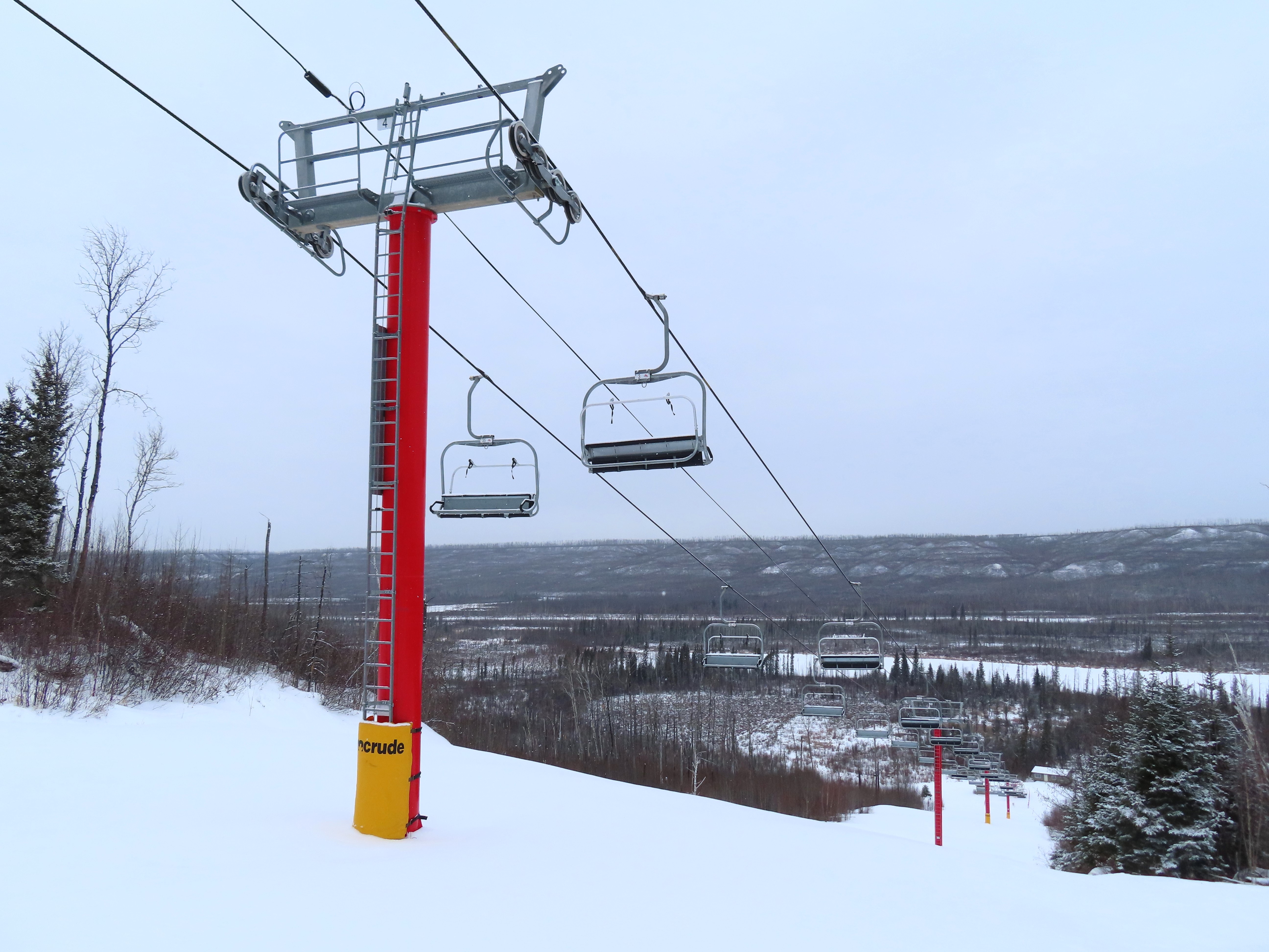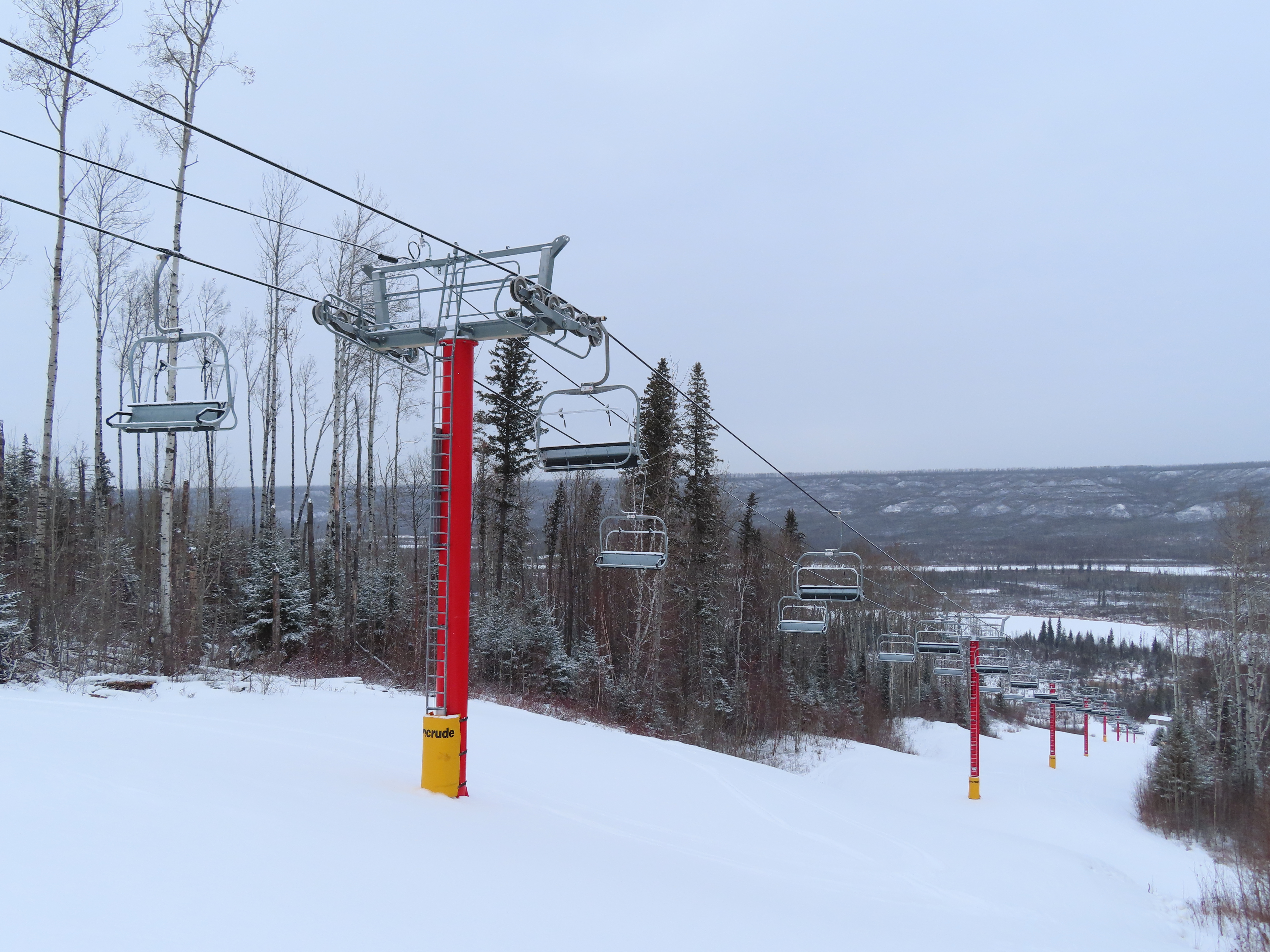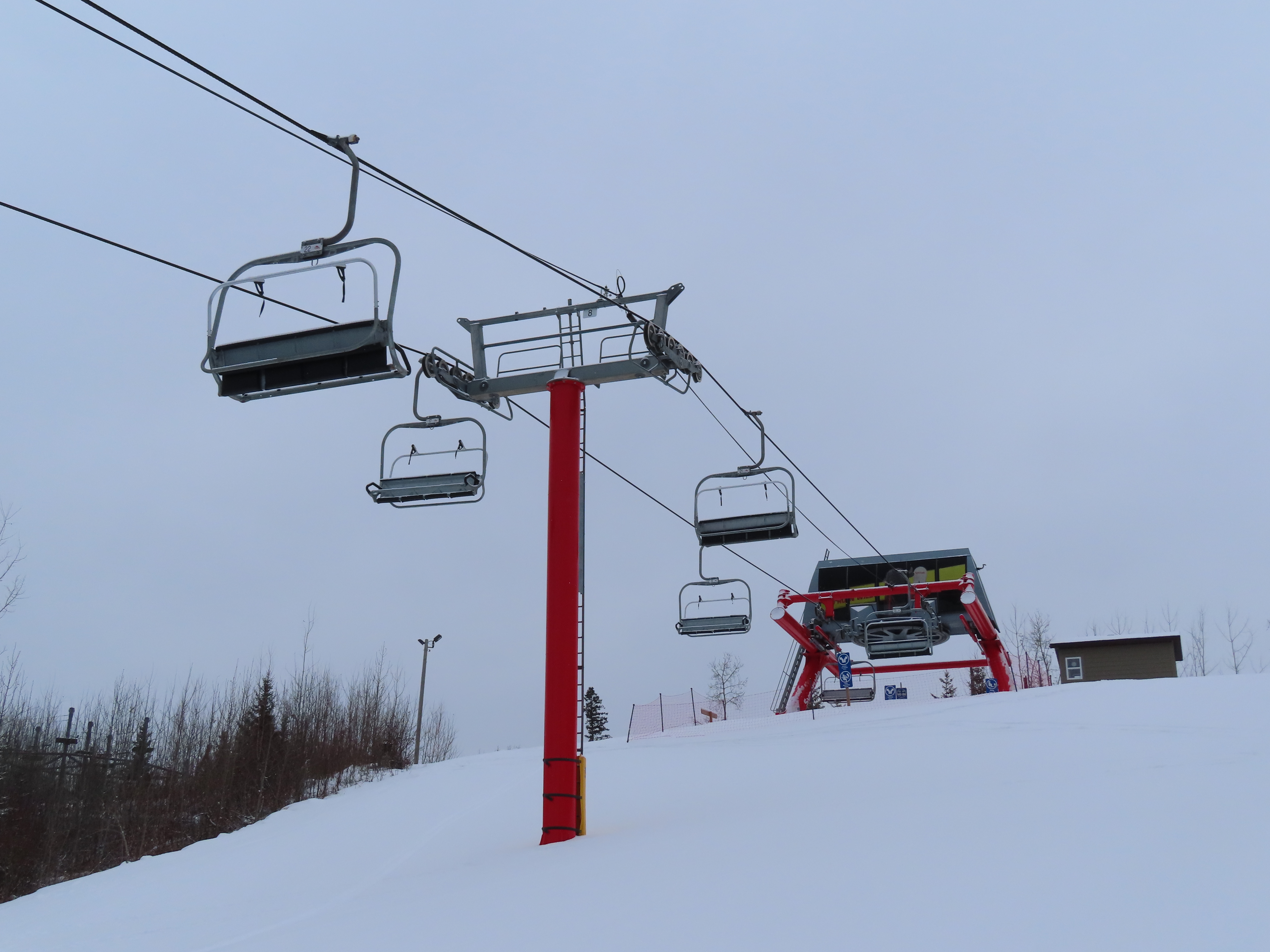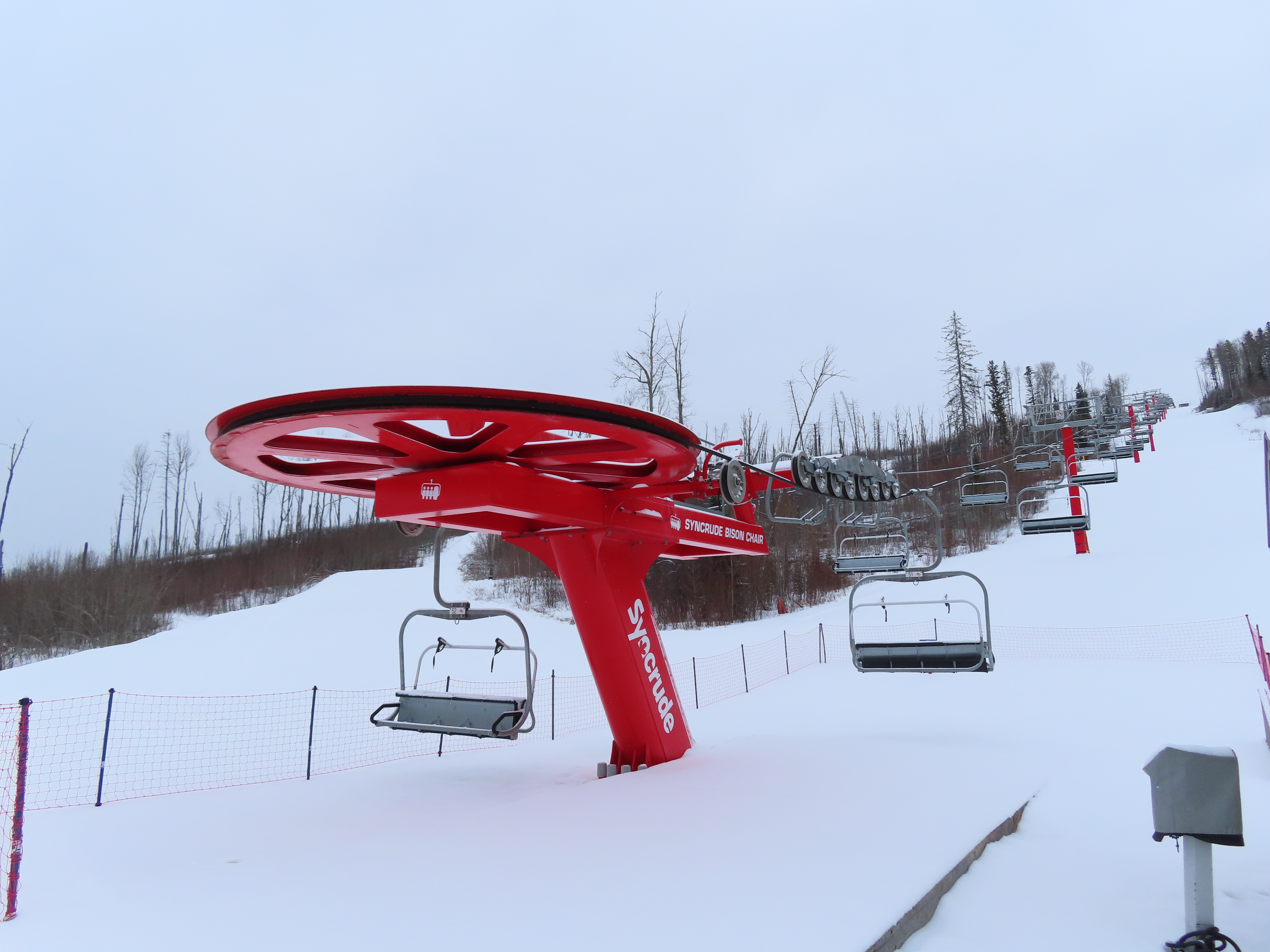 This was the first of two Leitner-Poma Alpha quads built at Vista Ridge over two years.Unloading area.Motor room and drive bullwheel.Another view of the top station at this up side down ski area.View down the lift line.Top terminal and tower 8.Rare painted towers instead of galvanized.Upper half of the lift line.Lower lift line.Tower 1.This lift was funded and named by the Syncrude oil company.Loading area and Z terminal.View up the line.Bottom station in the Northern Alberta wilderness.