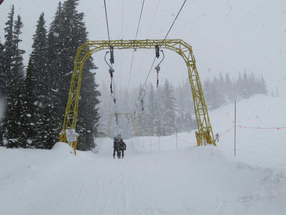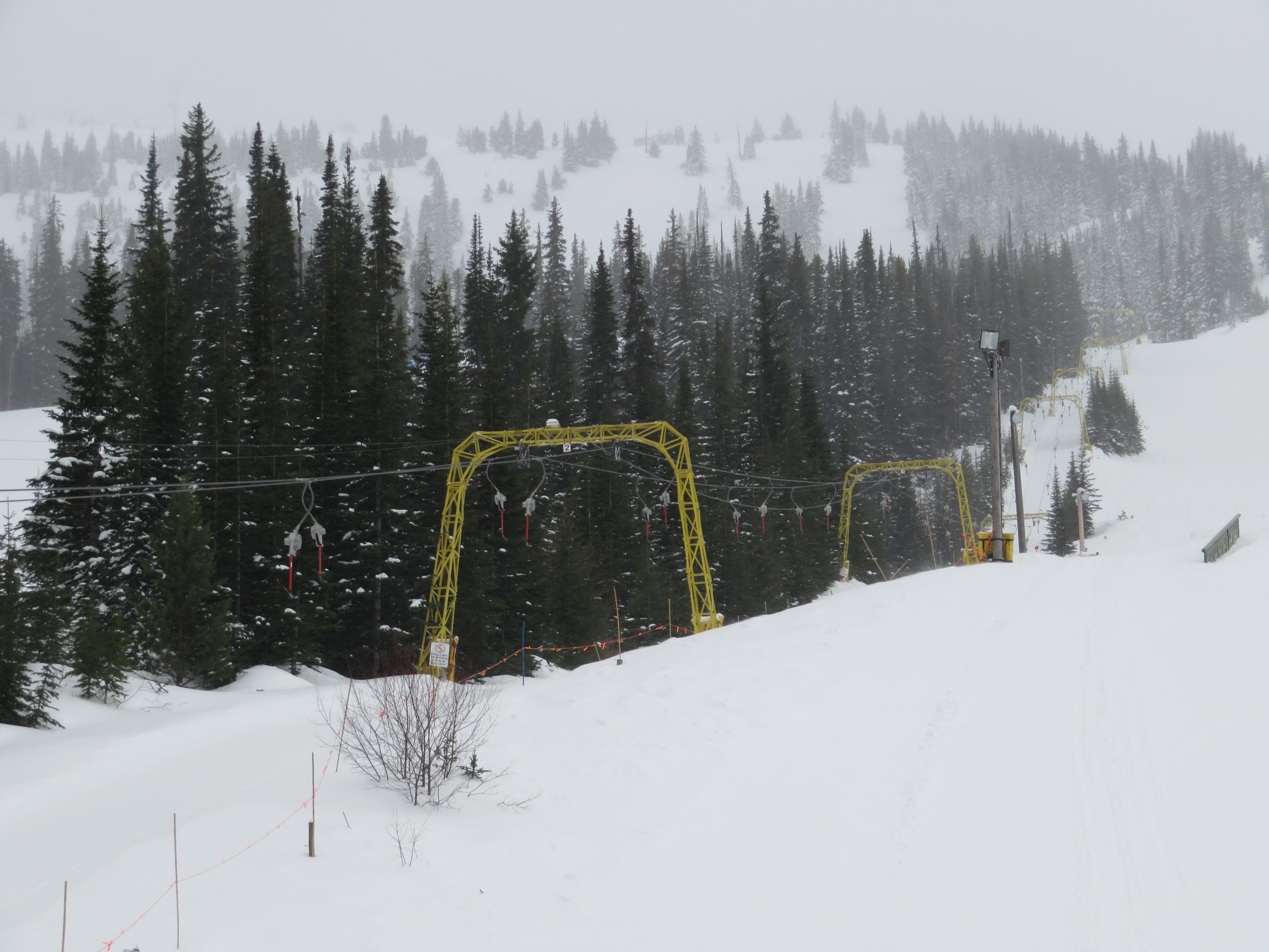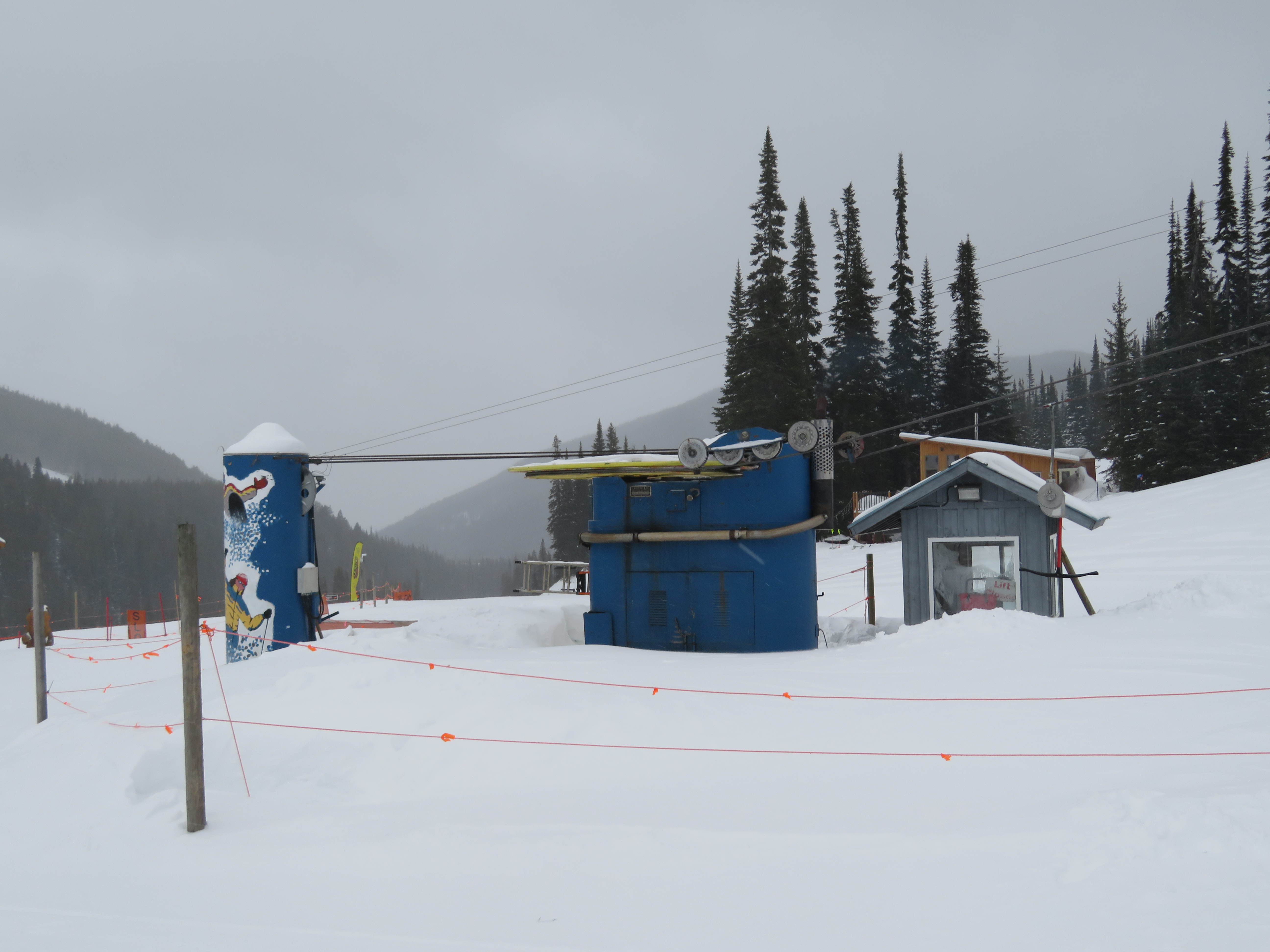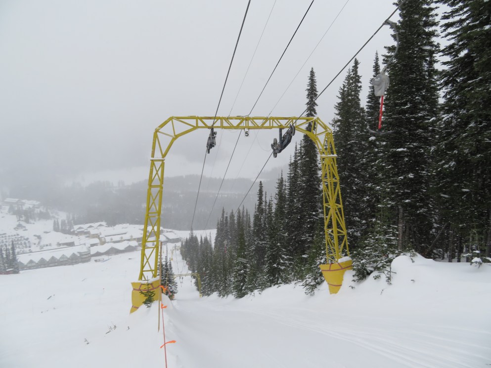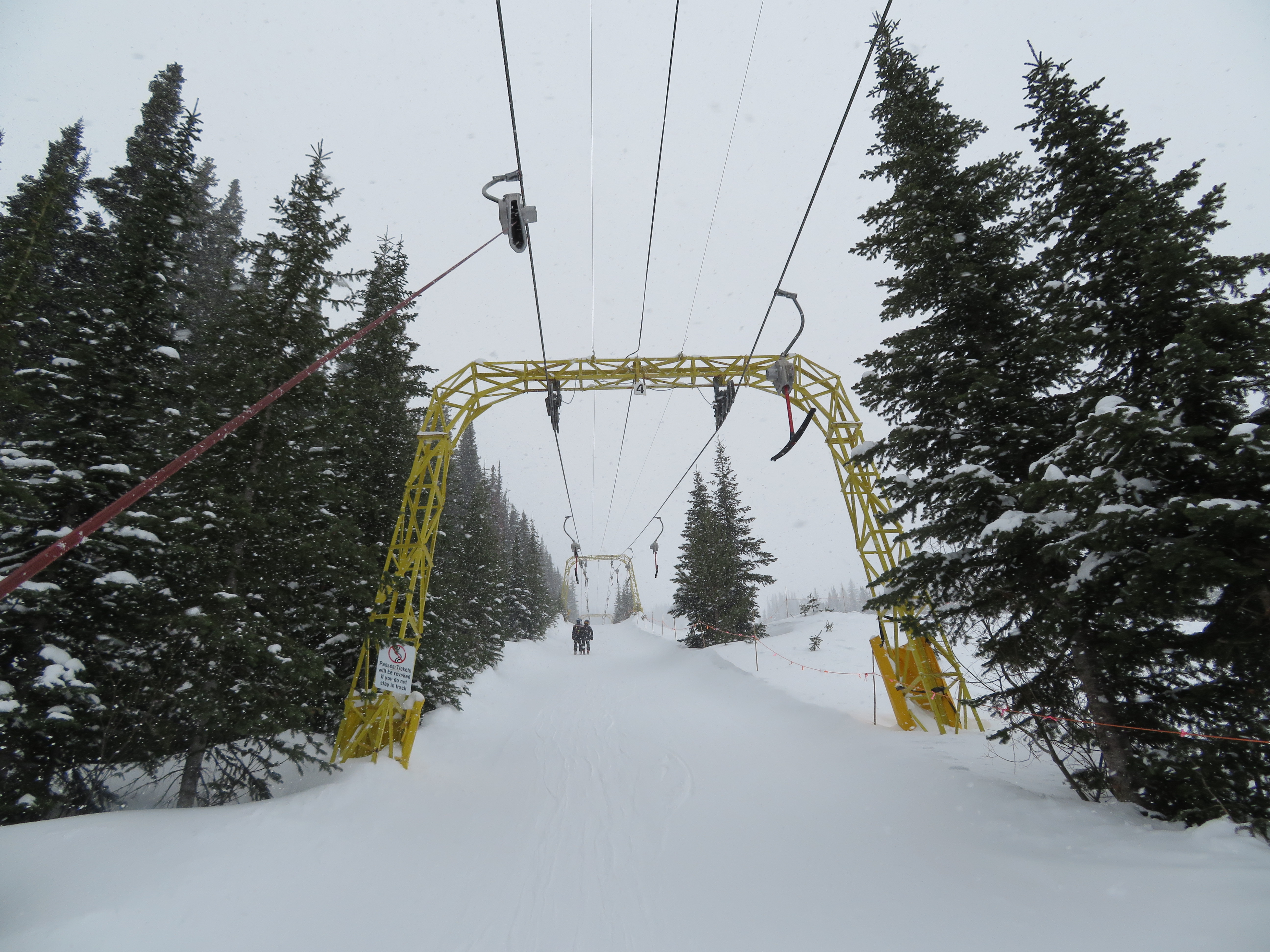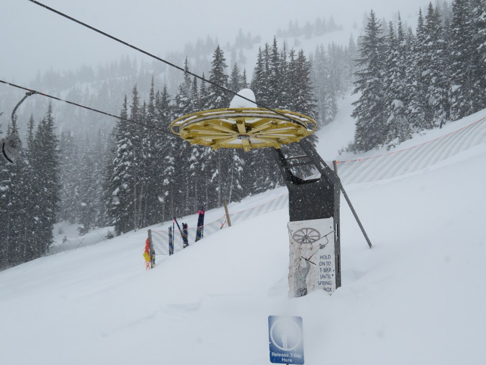 Even though all of its terrain is accessed from a high-speed quad, the T-Bar still operates during peak periods.Lift line full of portal lattice towers.The bottom terminal is powered by diesel and also features counterweight tensioning.The top station is a simple fixed bullwheel with unloading at tower 8.Mueller lattice tower.Bottom station overview.Riding up the track.Nearing the summit.Top bullwheel turnaround.Top operator house and unloading ramp.