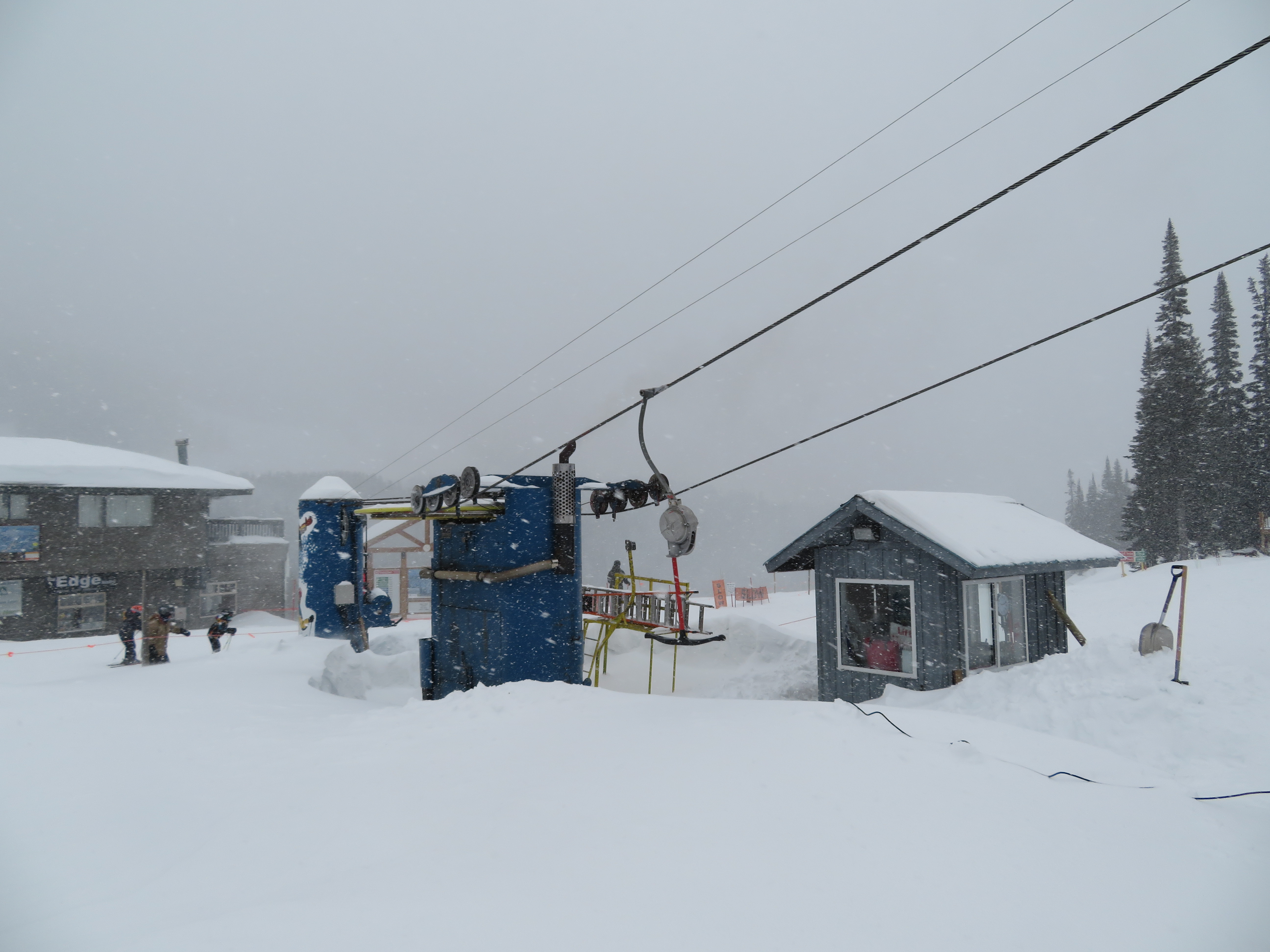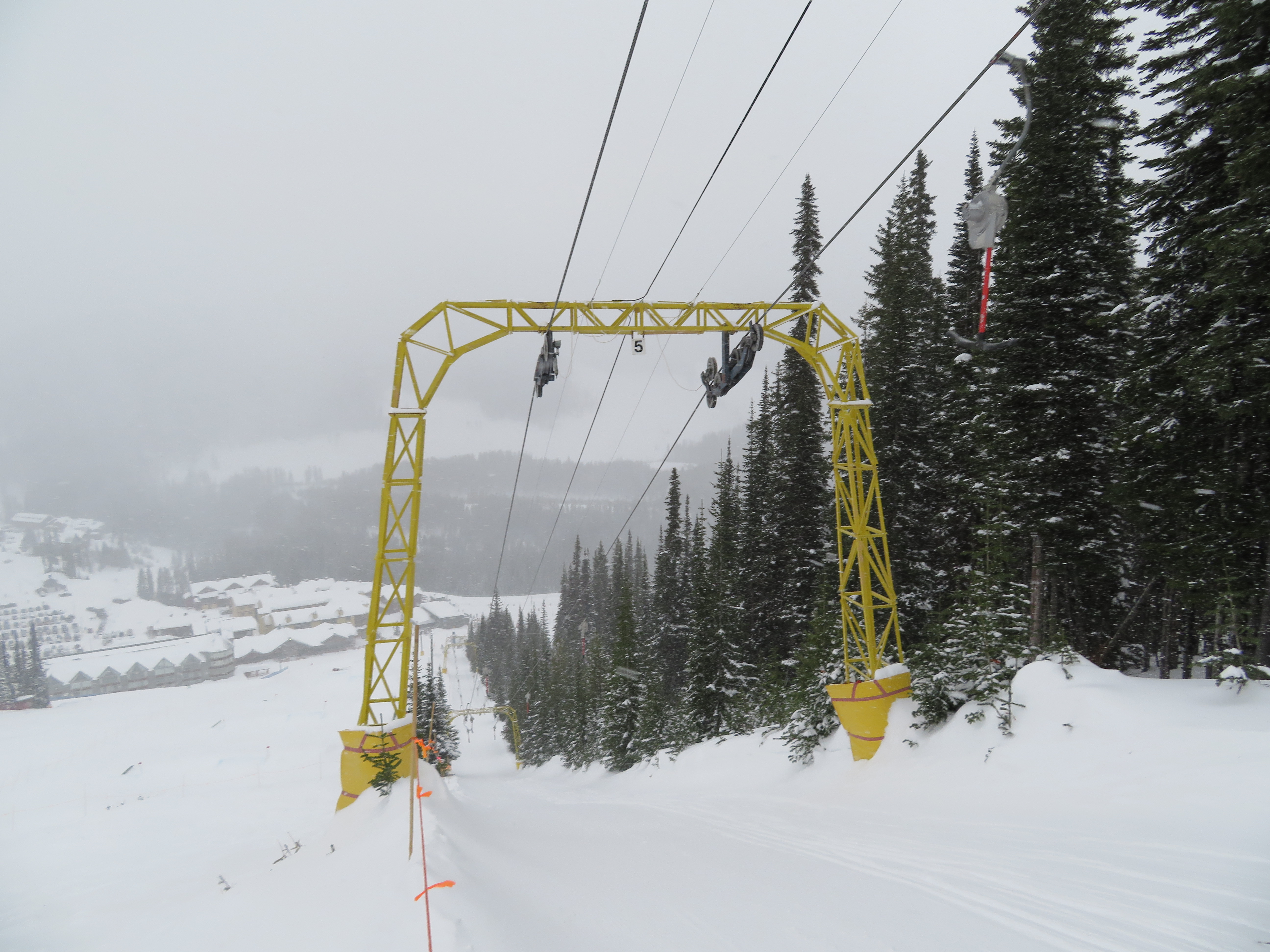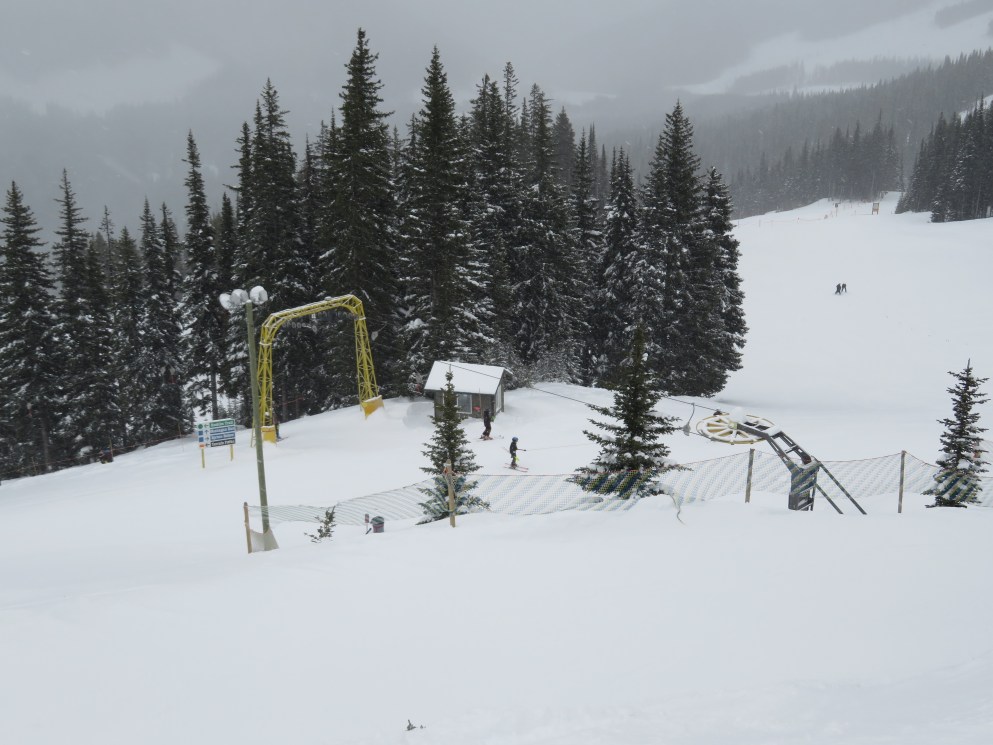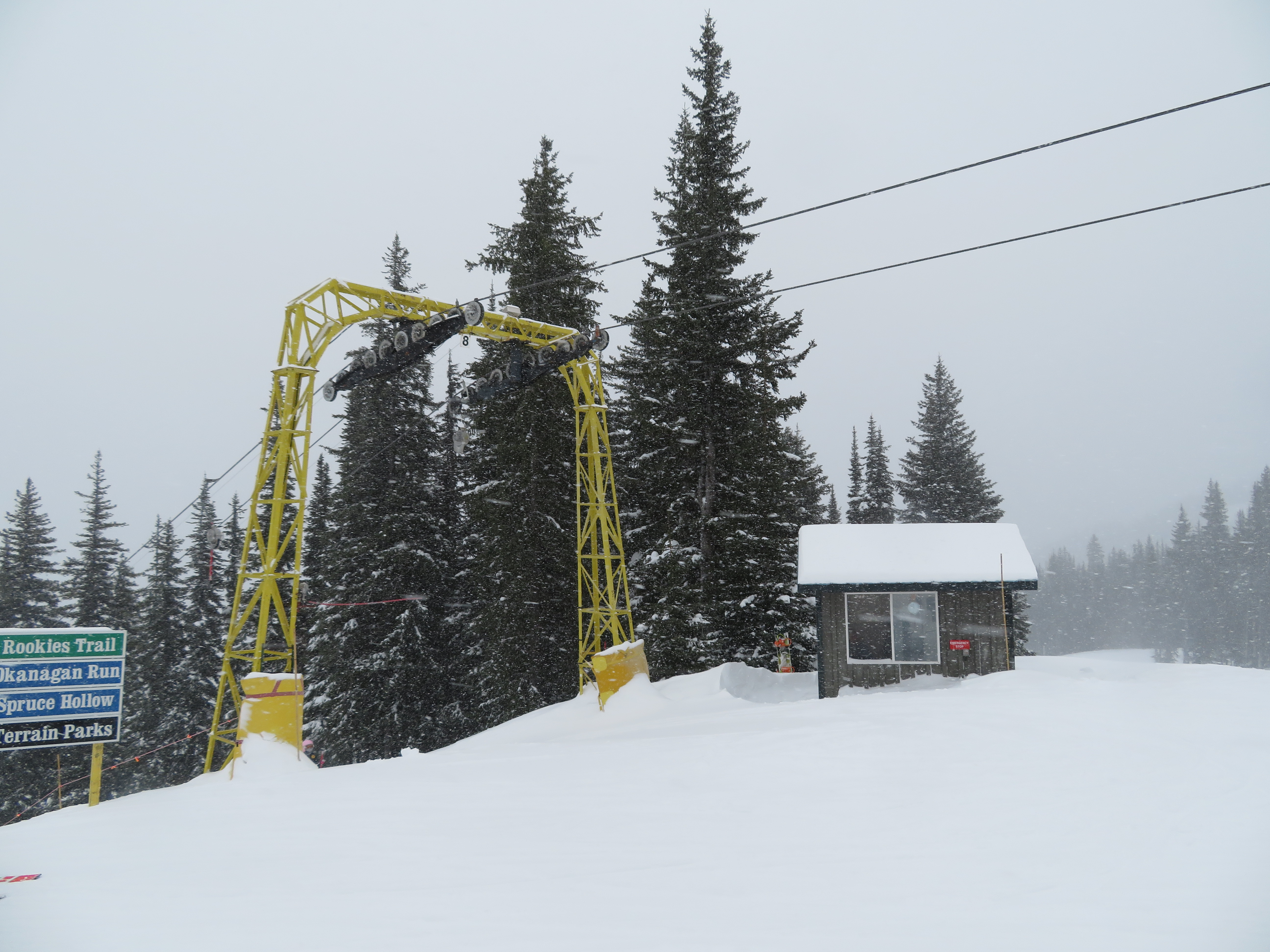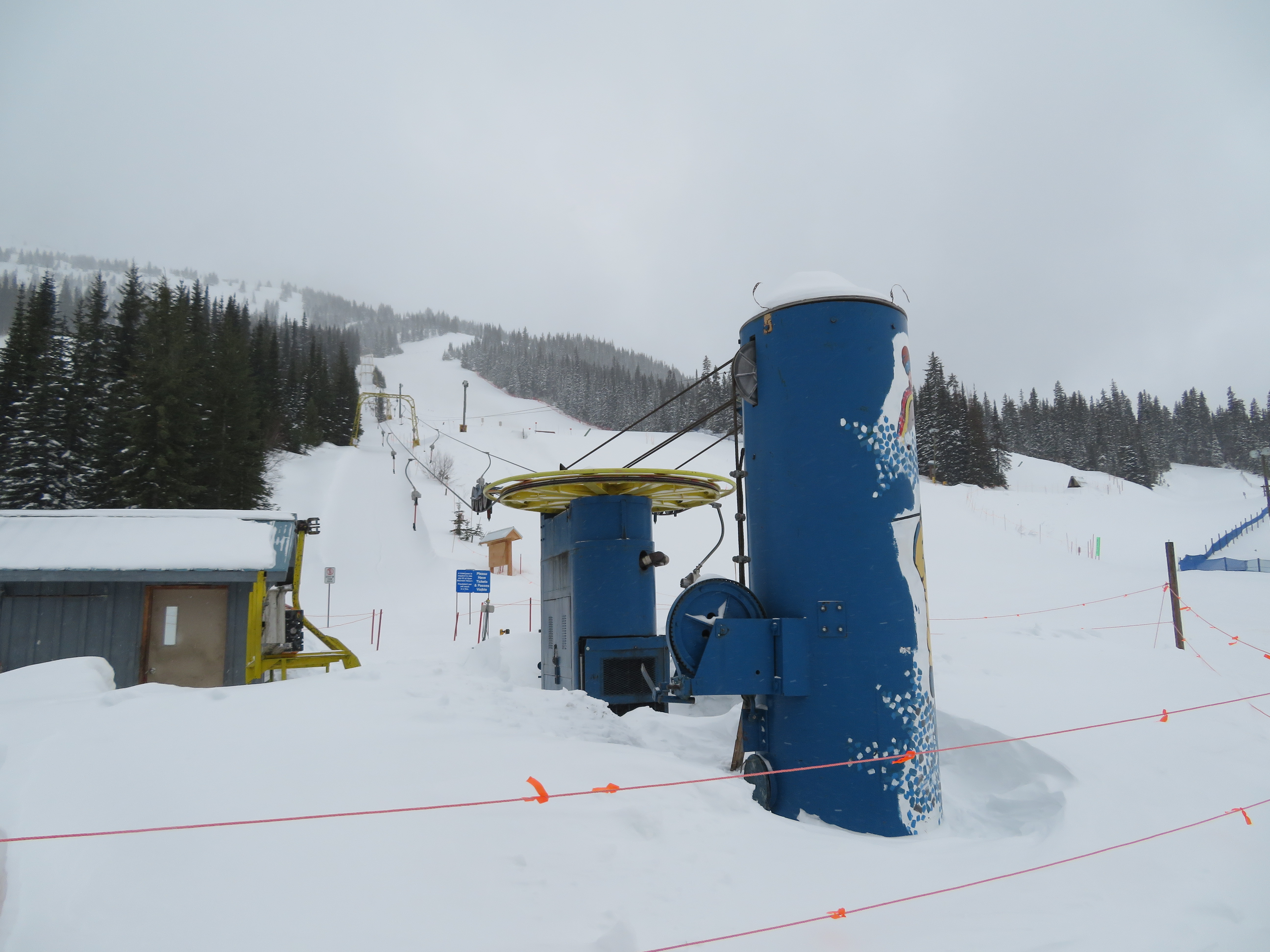 Even though all of its terrain is accessed from a high-speed quad, the T-Bar still operates during peak periods.Lift line full of portal lattice towers.The bottom terminal is powered by diesel and also features counterweight tensioning.The top station is a simple fixed bullwheel with unloading at tower 8.Mueller lattice tower.Bottom station overview.Riding up the track.Nearing the summit.Top bullwheel turnaround.Top operator house and unloading ramp.