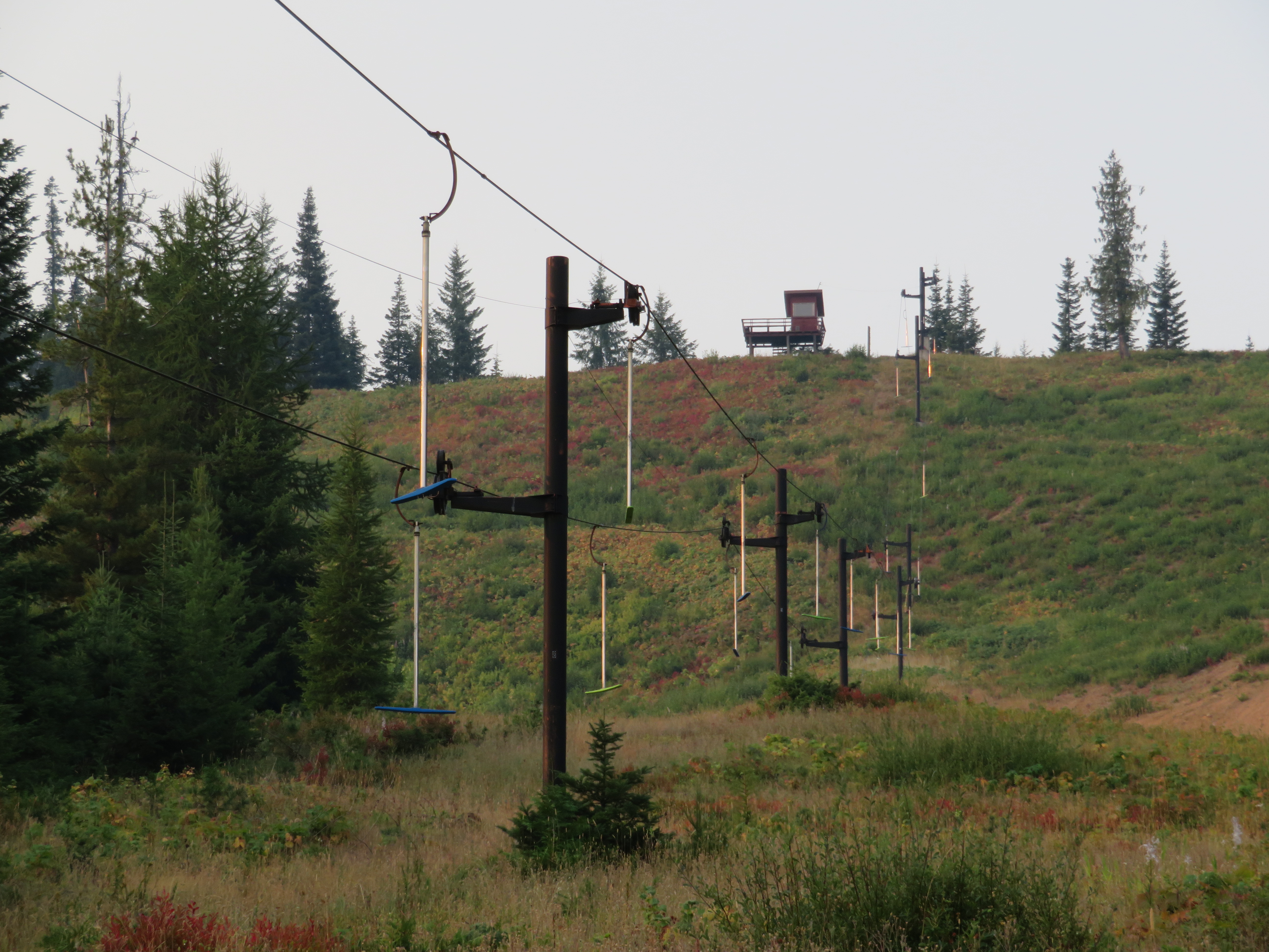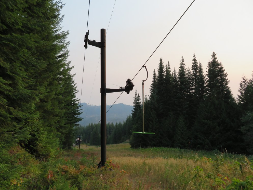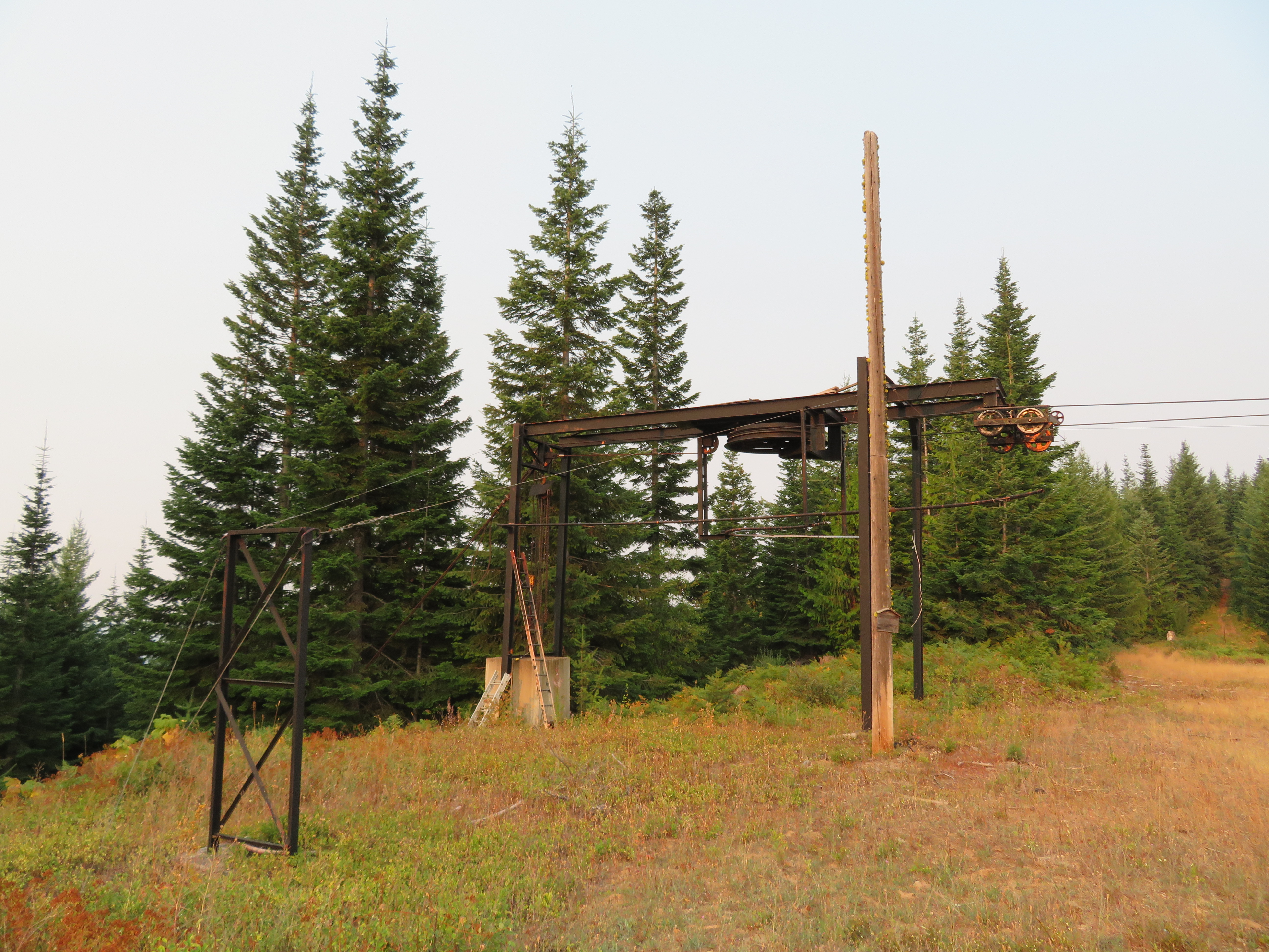 Bald Mountain is operated by the Clearwater Ski Club under permit from the Potlatch Corporation, which first developed the mountain for its employees.This is by far the longest surface lift in Idaho.’60s-style fixed drive.Hall line equipment.Loading area.Split-style tower.Middle section of the line.Lower lift line and wooden Ts.Nearing the summit.Half tower flyover.Steep last section.Lift line overview.Another view down the lift line.Top station with counterweight tensioning.Summit operator house and unload at the breakover.Return bullwheel.Top station seen from the lodge.