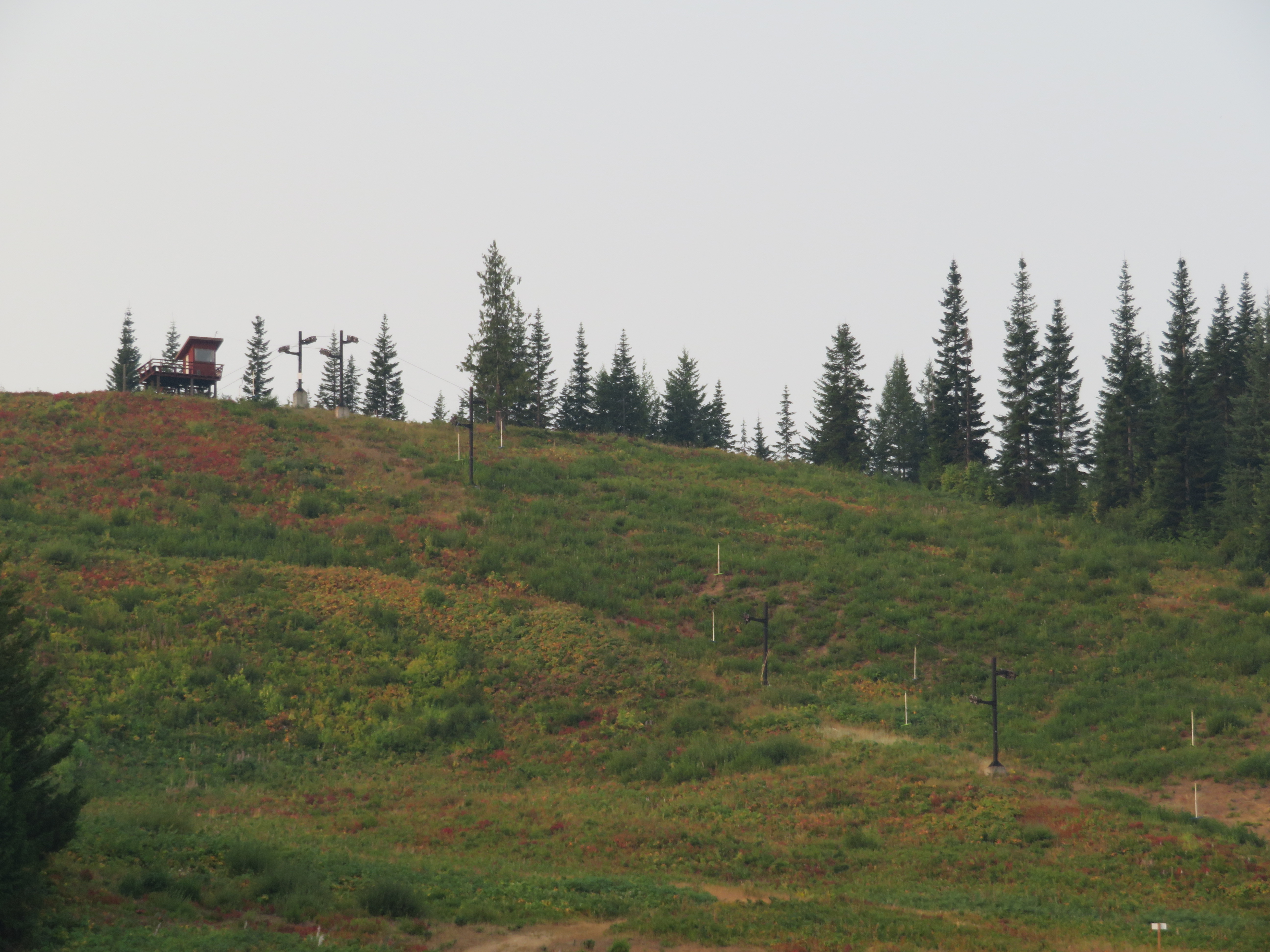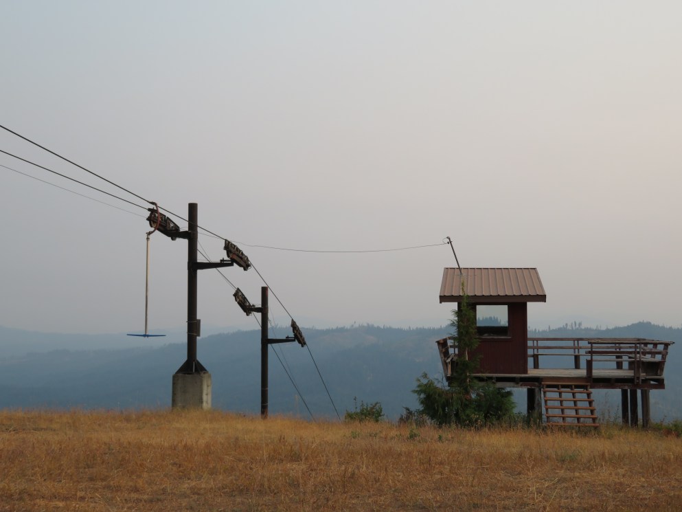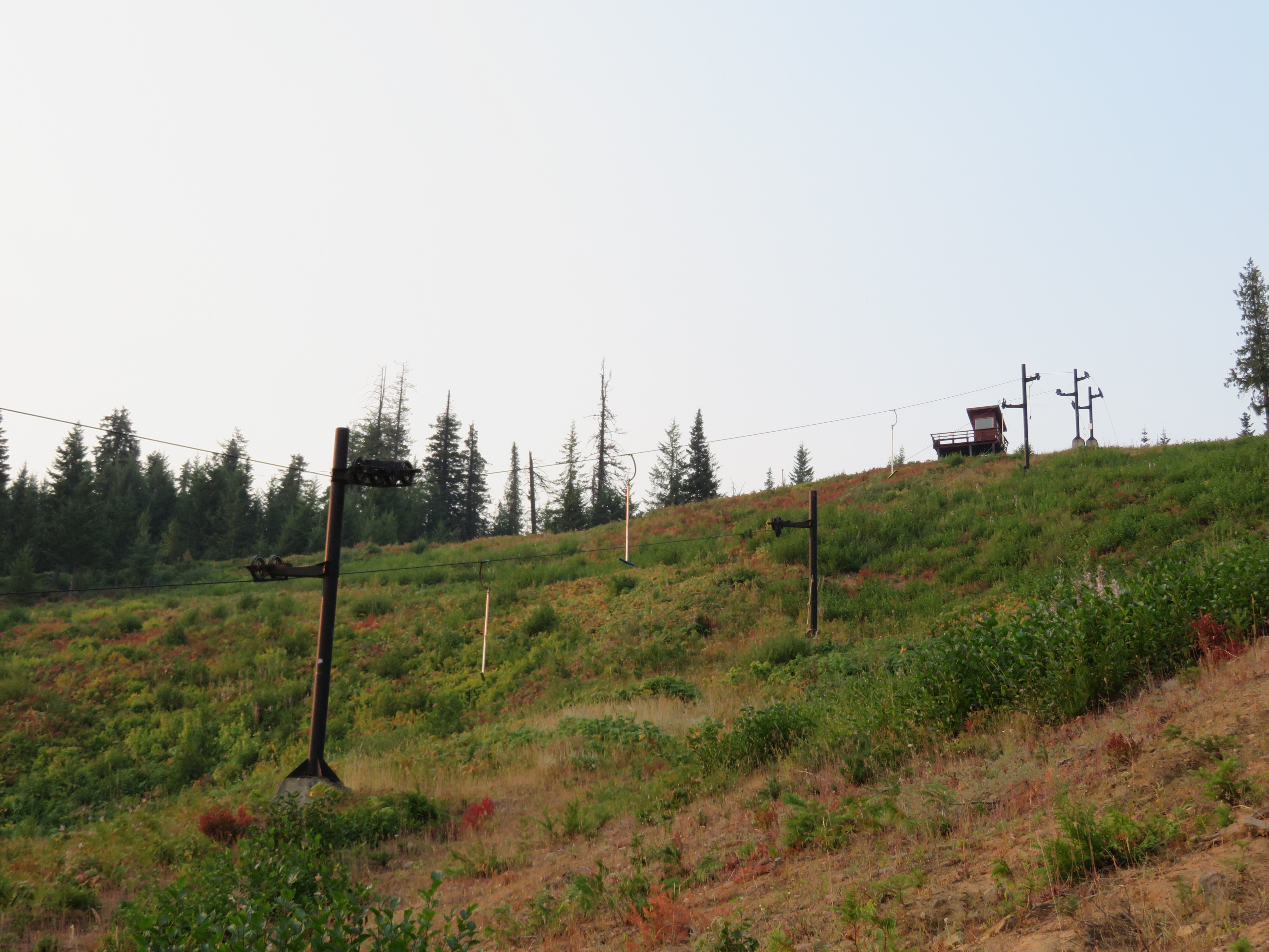 Bald Mountain is operated by the Clearwater Ski Club under permit from the Potlatch Corporation, which first developed the mountain for its employees.This is by far the longest surface lift in Idaho.’60s-style fixed drive.Hall line equipment.Loading area.Split-style tower.Middle section of the line.Lower lift line and wooden Ts.Nearing the summit.Half tower flyover.Steep last section.Lift line overview.Another view down the lift line.Top station with counterweight tensioning.Summit operator house and unload at the breakover.Return bullwheel.Top station seen from the lodge.
