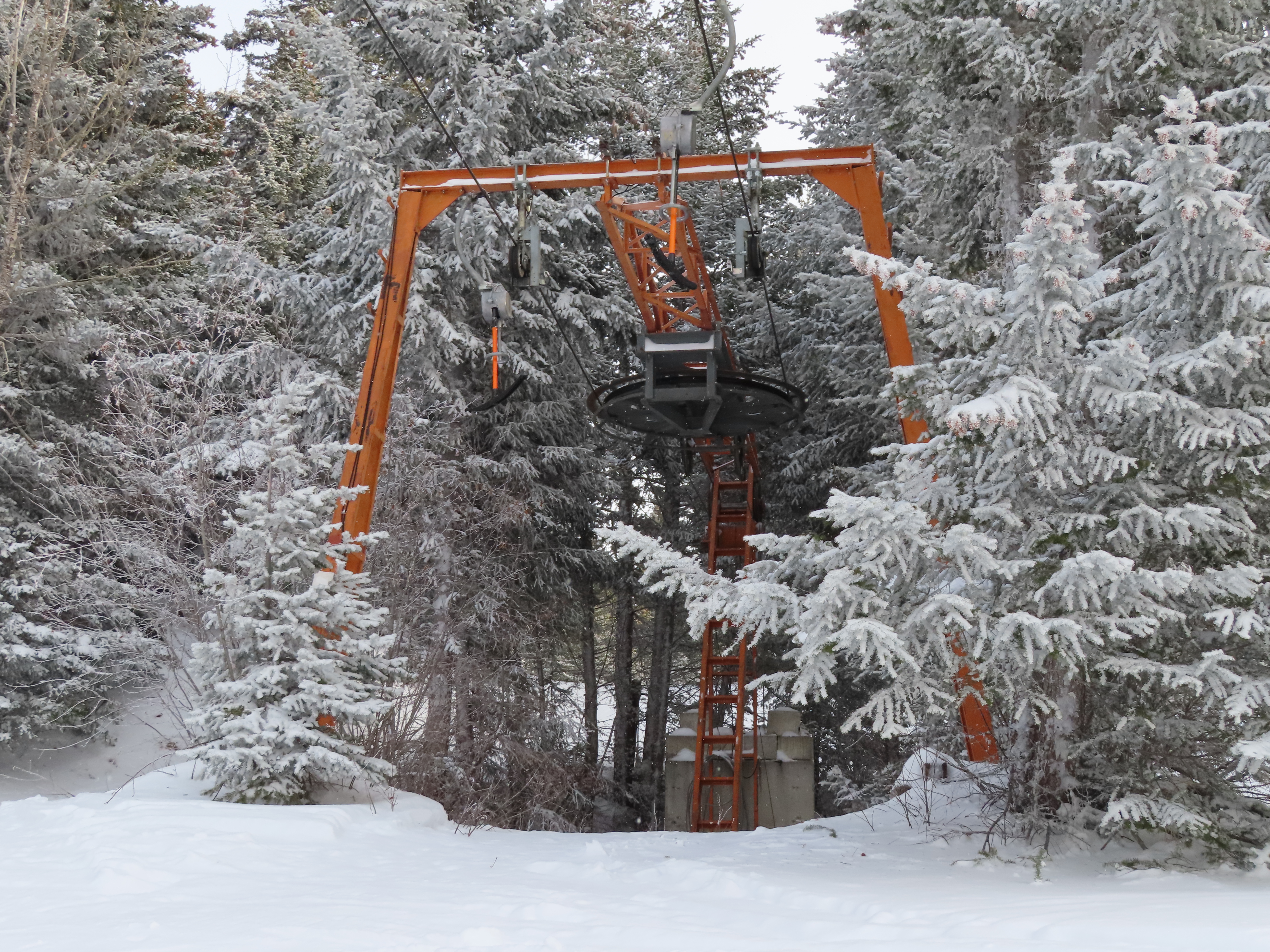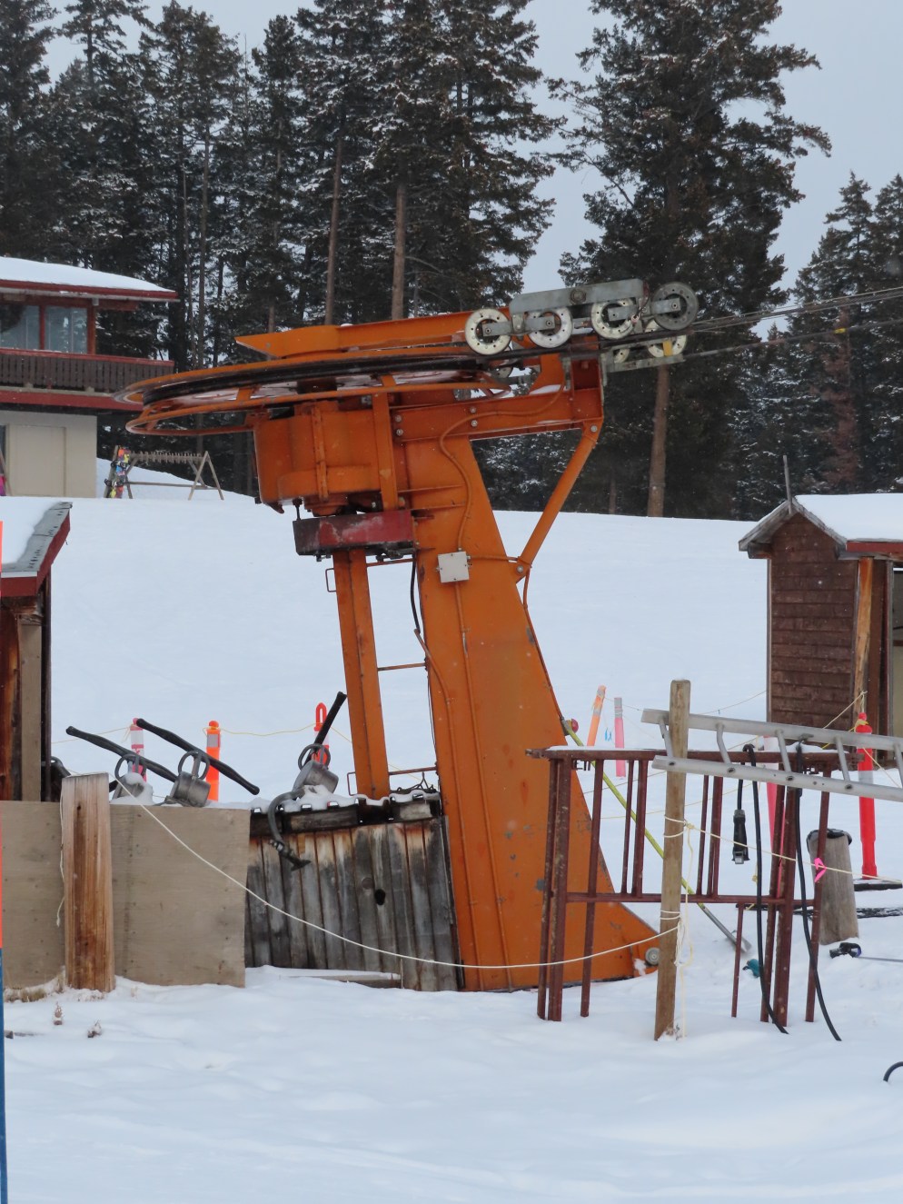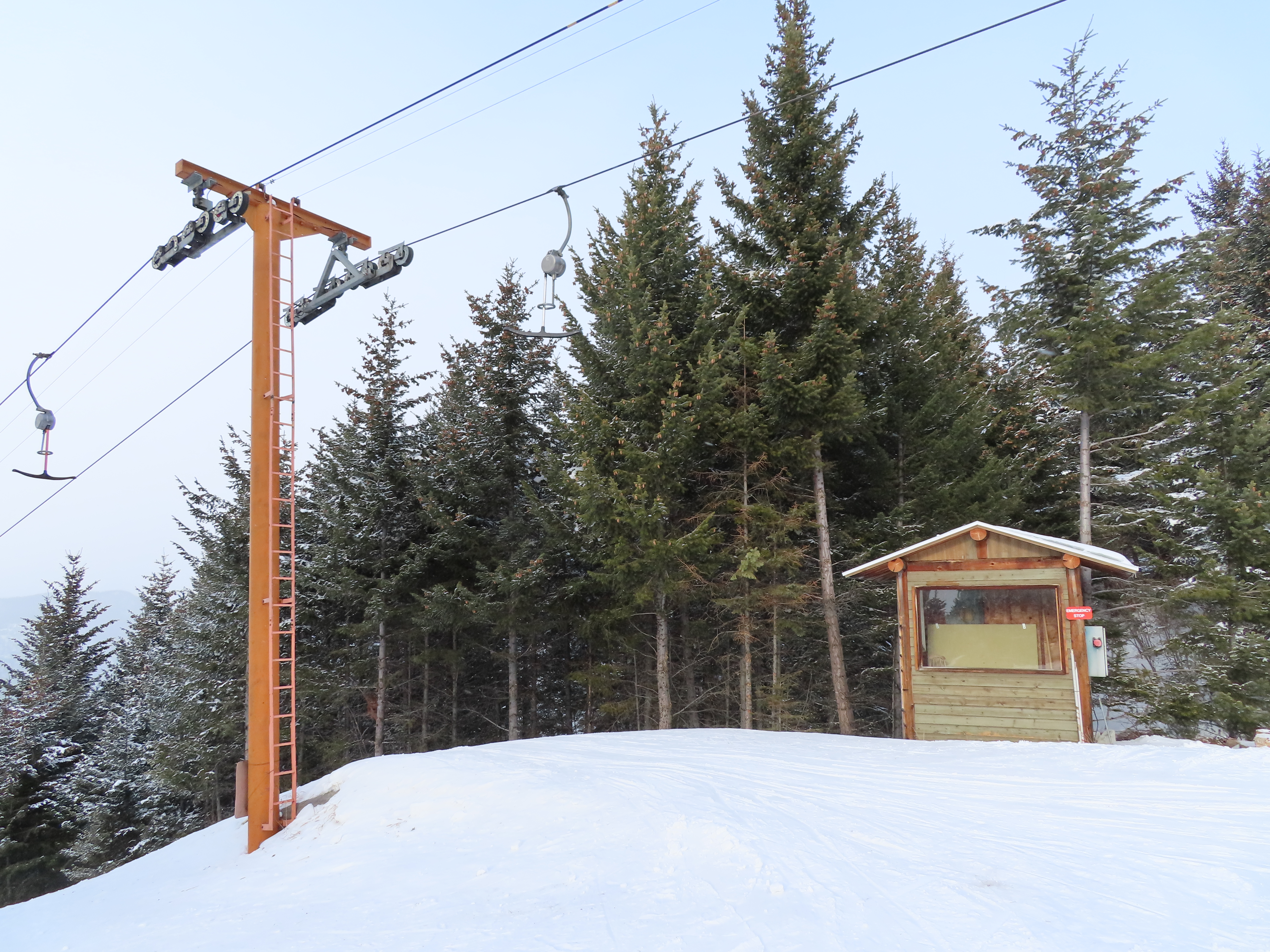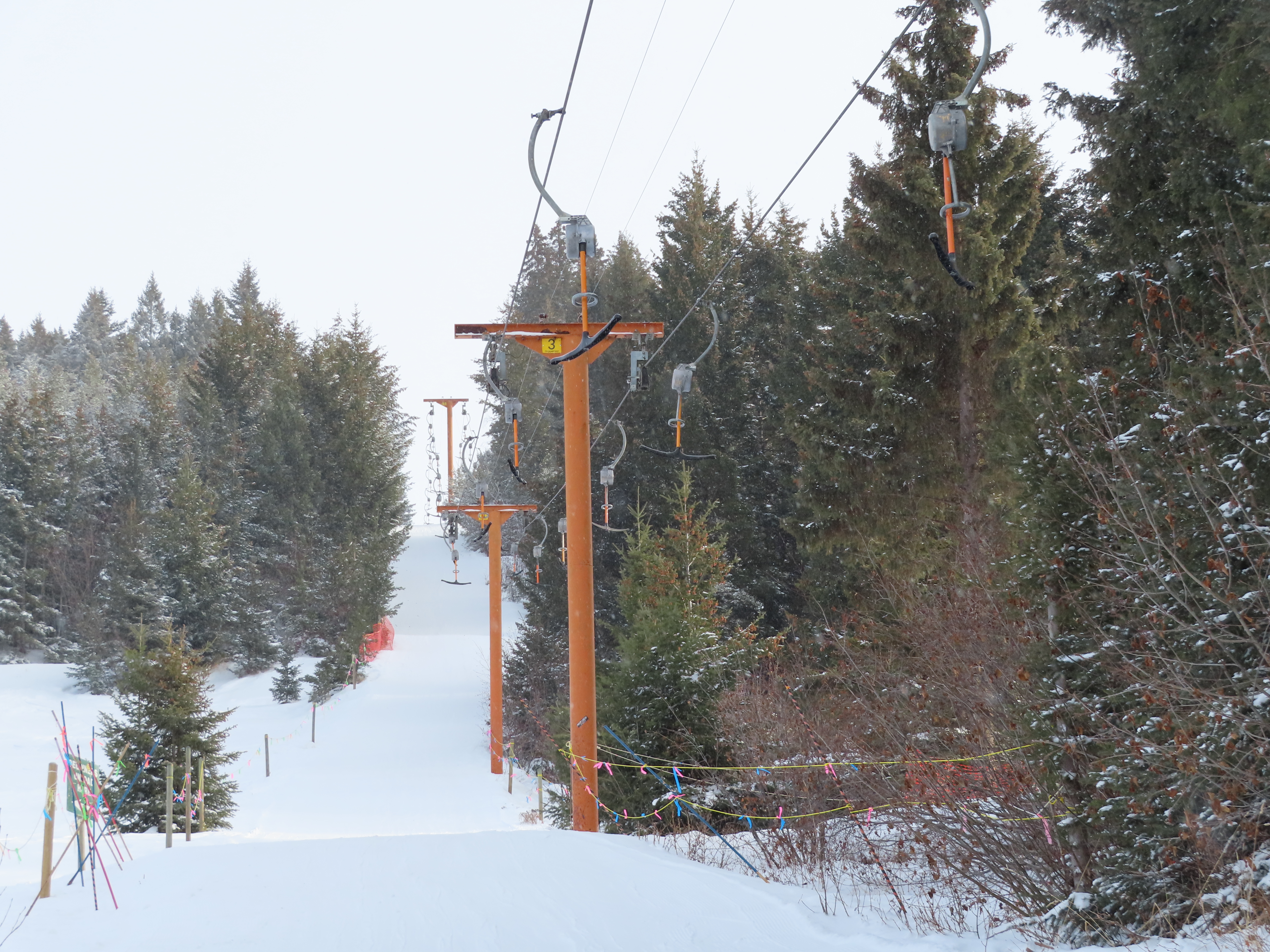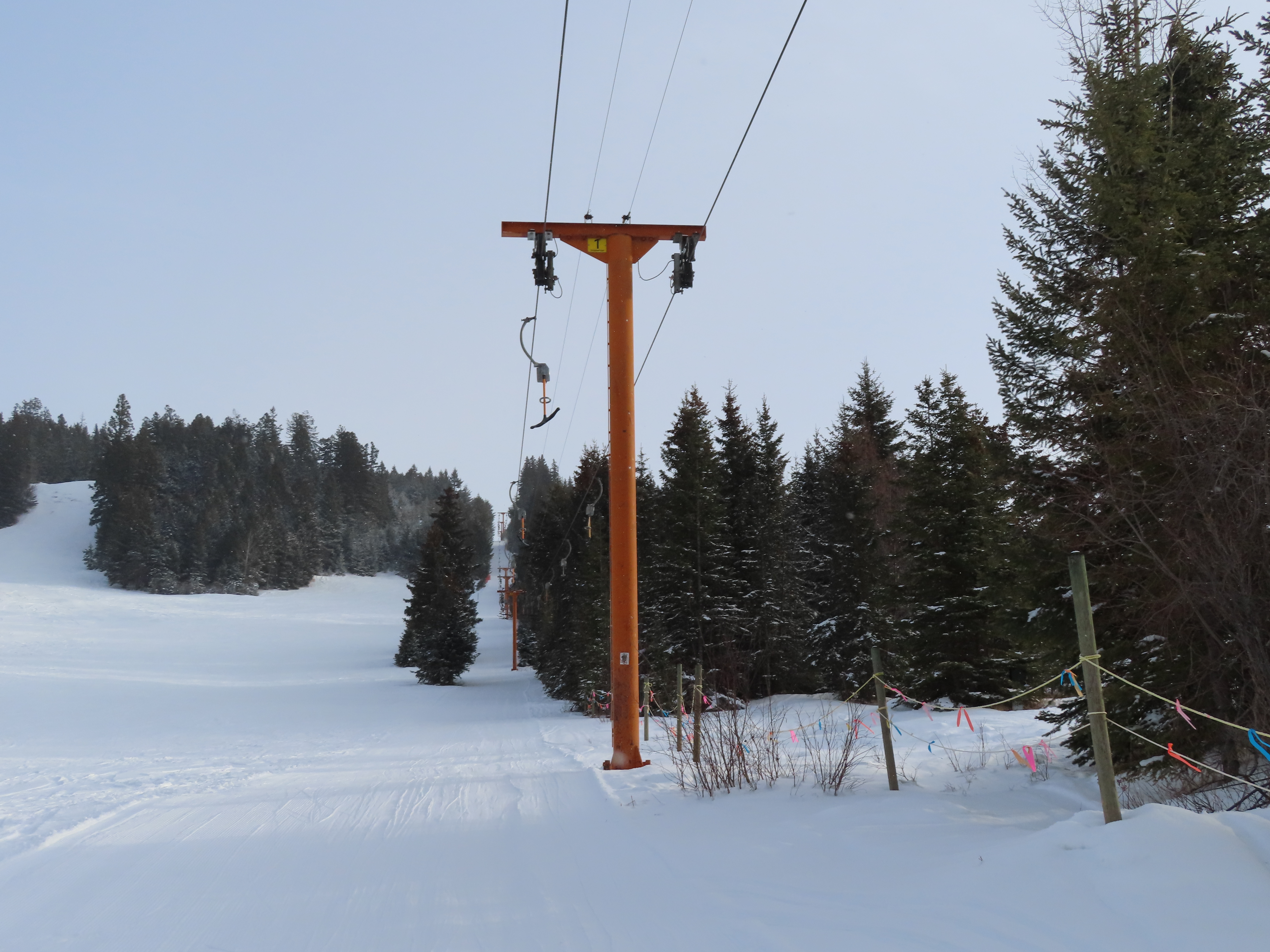This lift was the first to open at Harper back in 1973.Unloading area at tower 7.The top terminal above the unload area.There’s a counterweight for tensioning here.A Doppelmayr tower.Lower part of the lift line seen from the first official unload area.Tower 1.This lift runs up to 580 feet per minute.View up at T-1.Tower 2.Unloading for beginners at tower 3.View back down the lift line.The last tower and top operator house, which is usually unmanned.The drive terminal runs off a diesel engine in the building behind.Like many vintage Doppelmayr T-Bars, the bottom bullwheel is not level with the ground but slanted up.Lift overview.