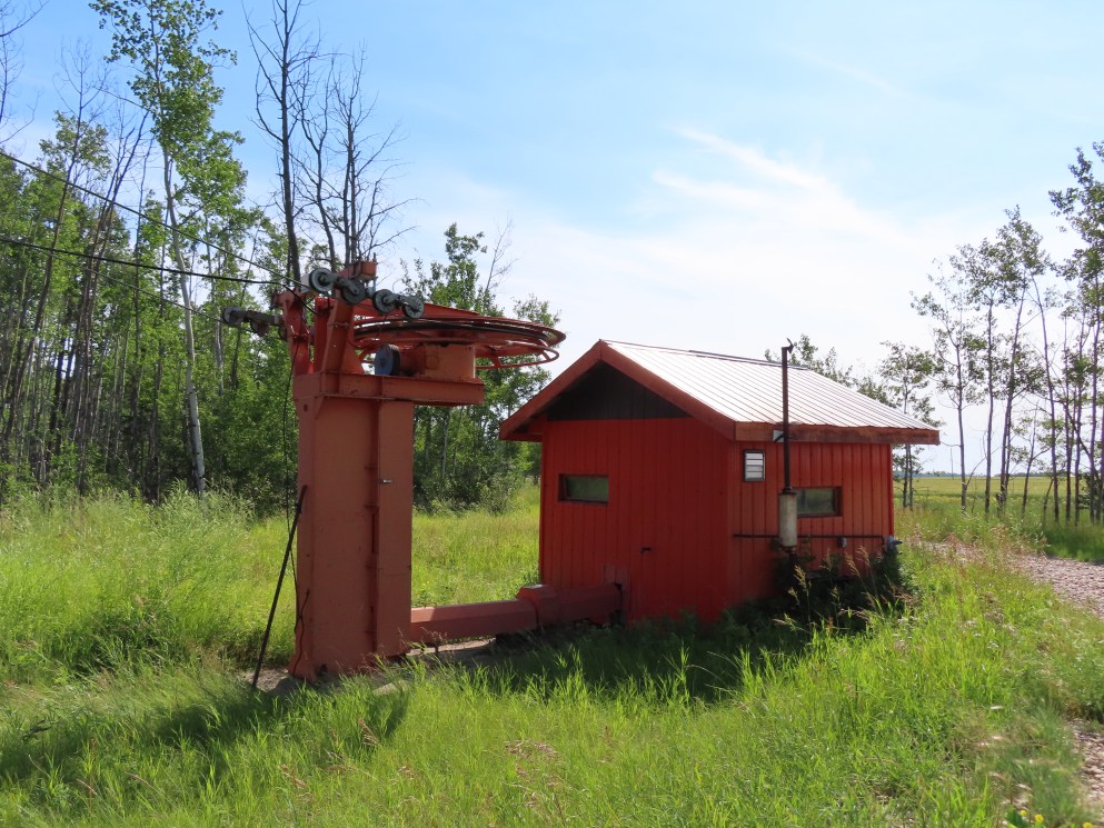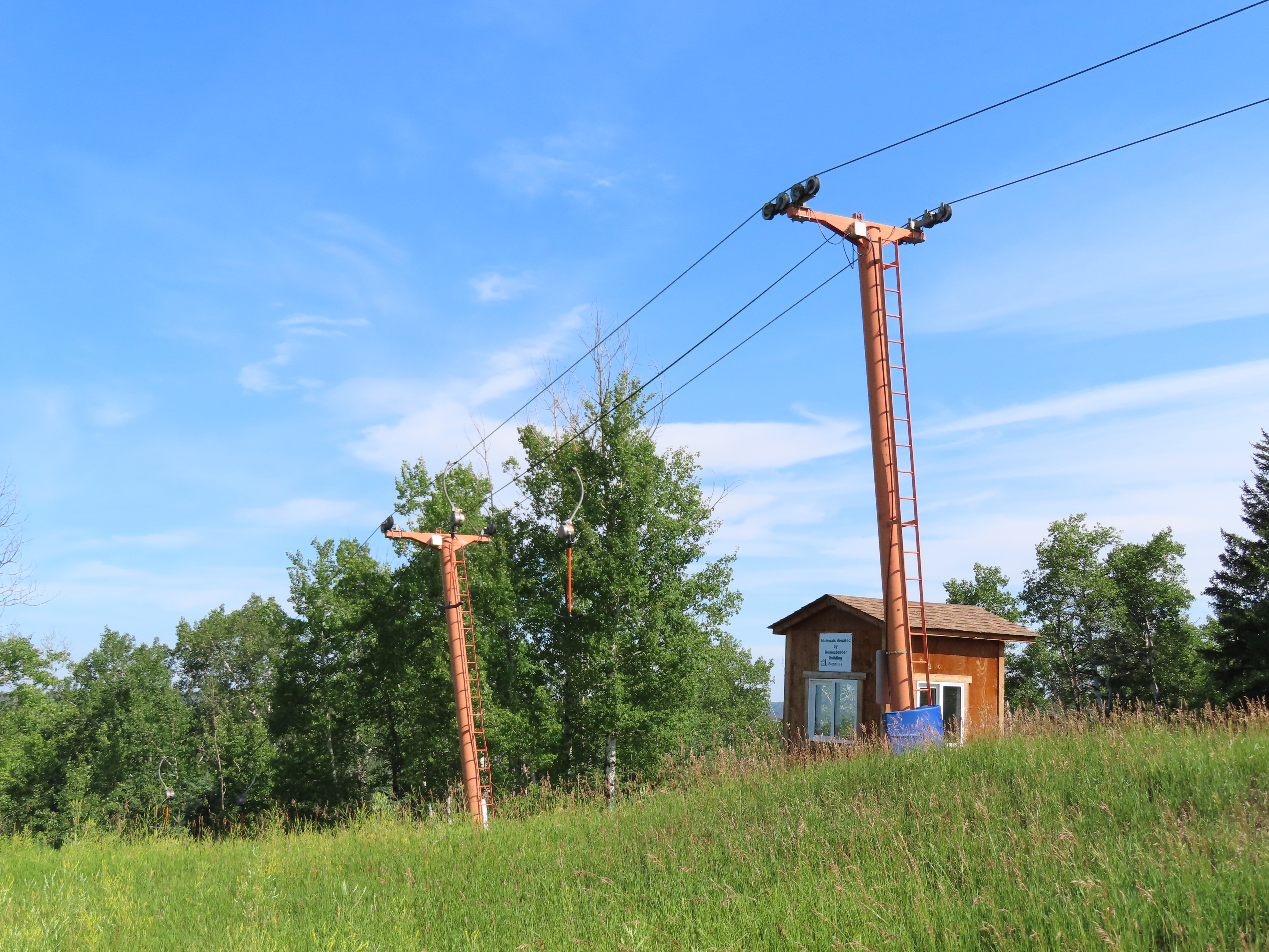 This rare top drive T-Bar operates at an upside down ski area.Also rare: a tower after the unload point.Drive station side view.Breakover towers 4 and 5.Short lift line along a river bank.Bottom terminal.Loading point at tower 1.Lower station overview.