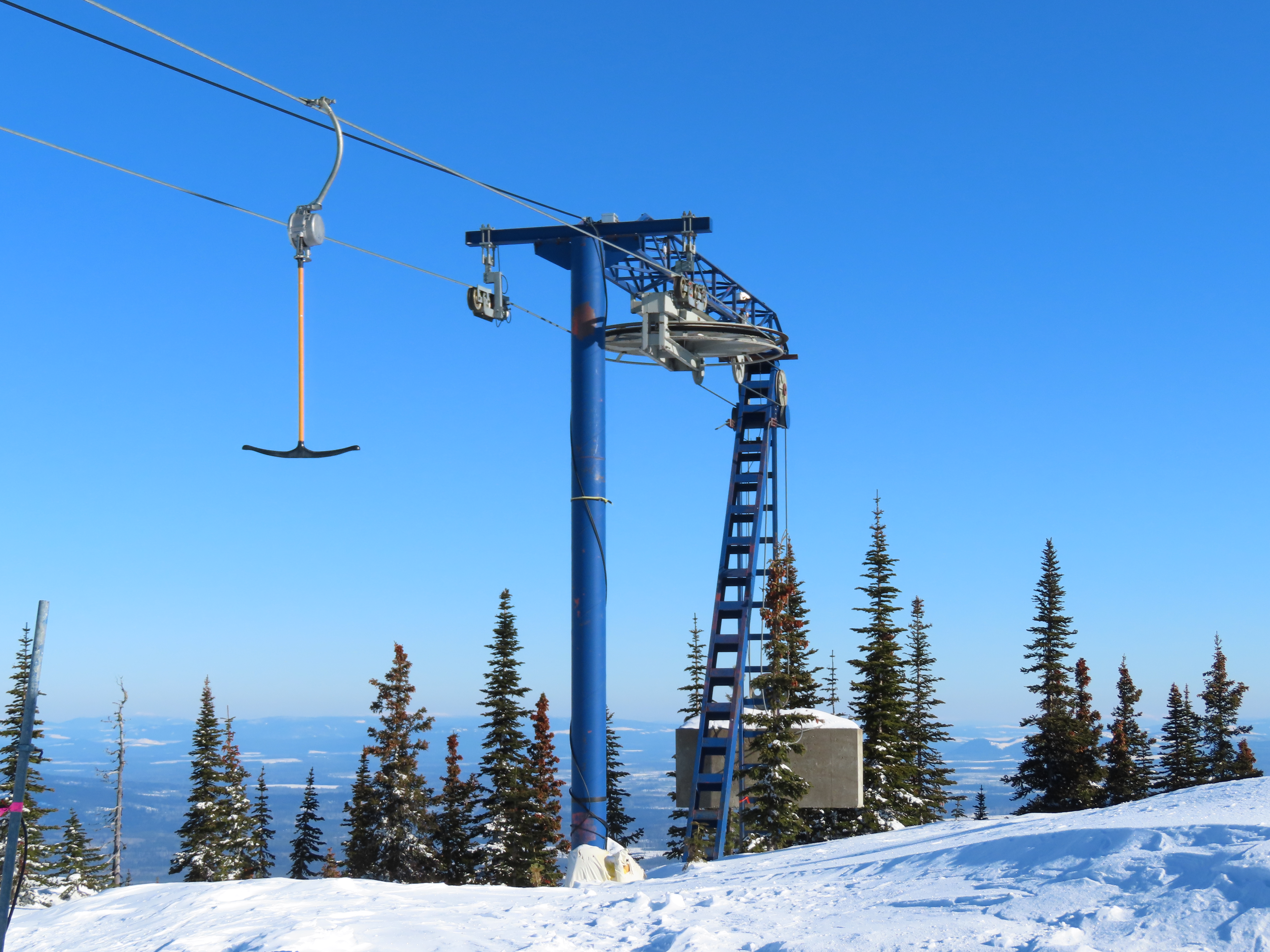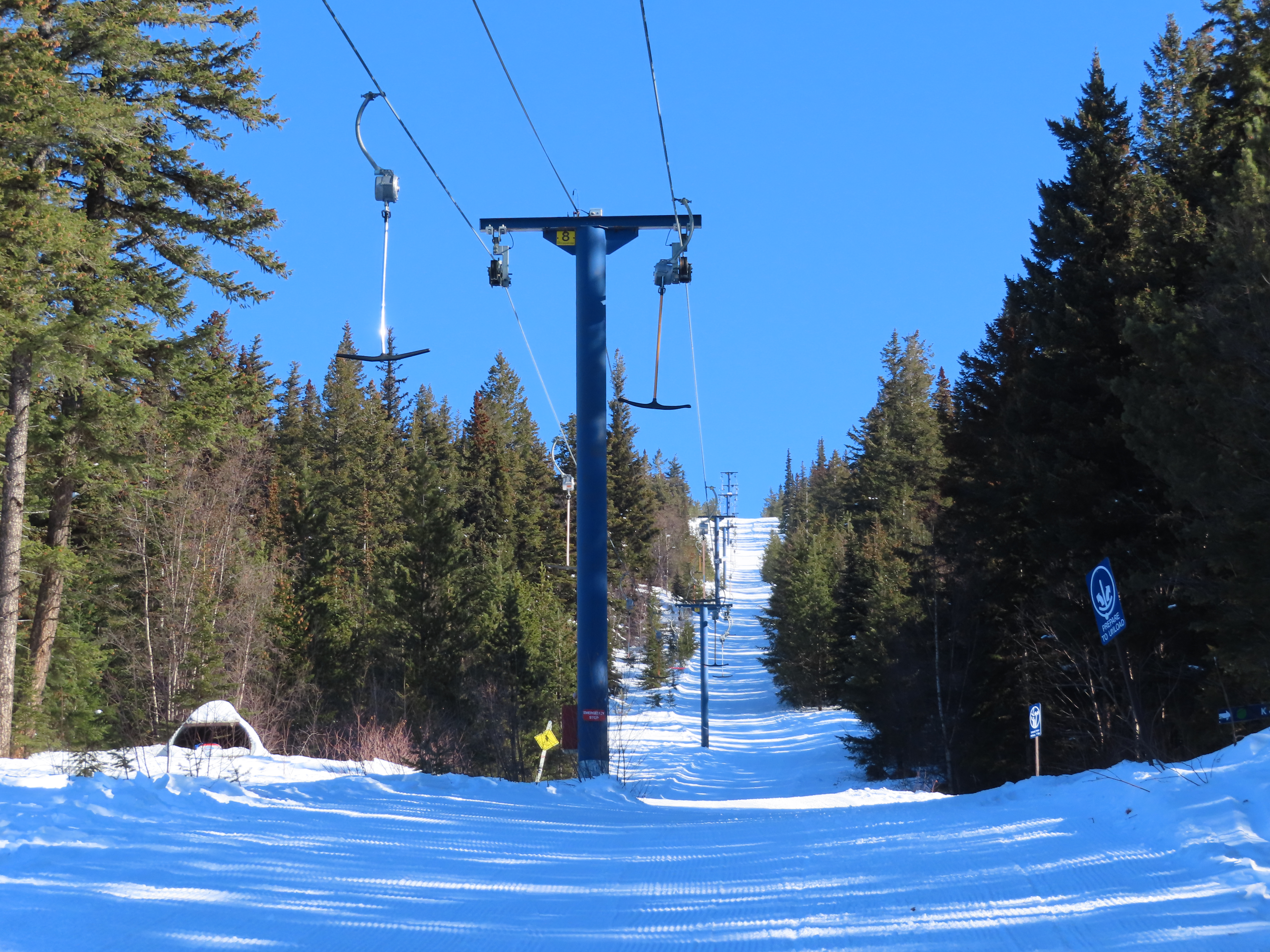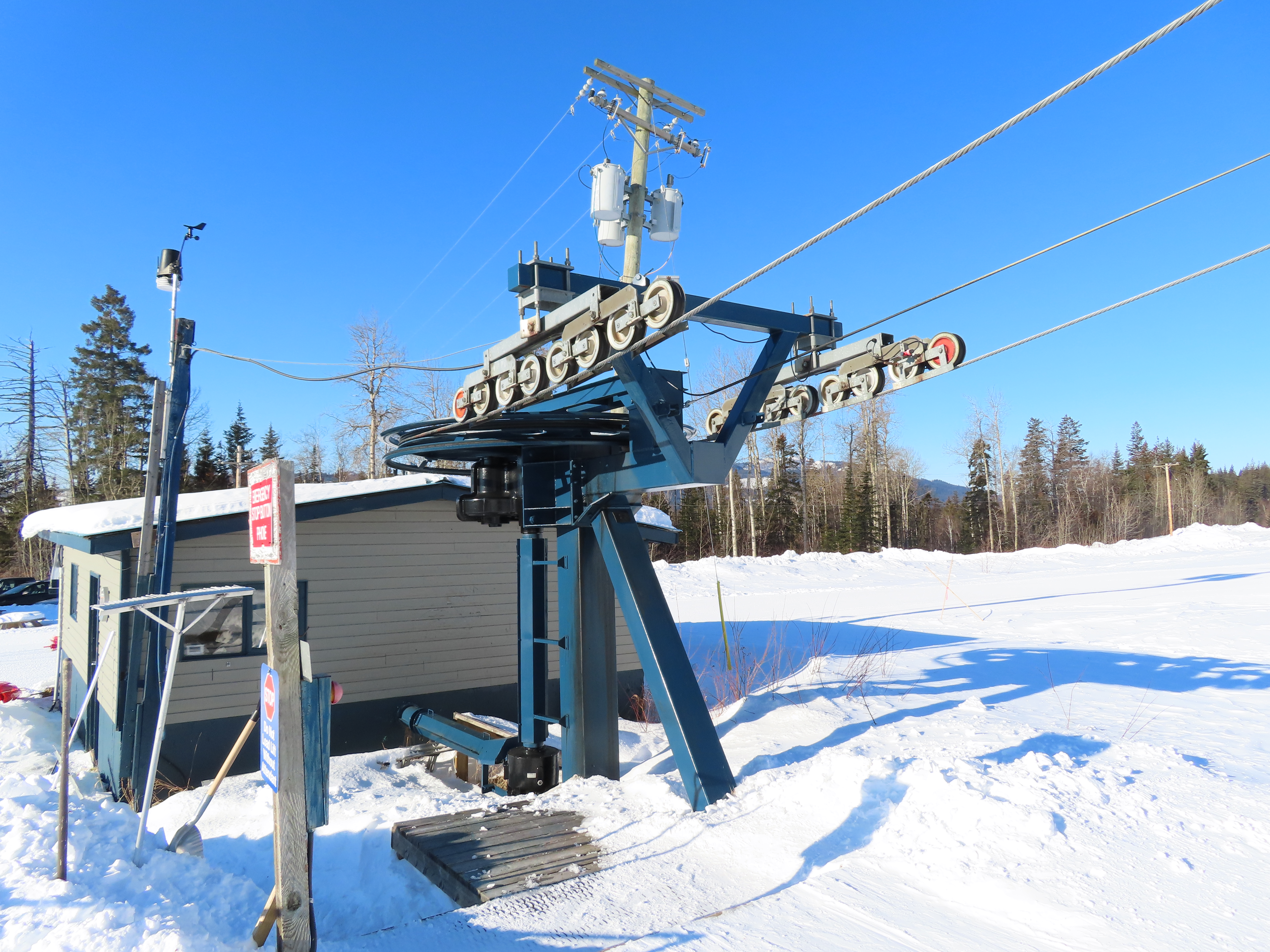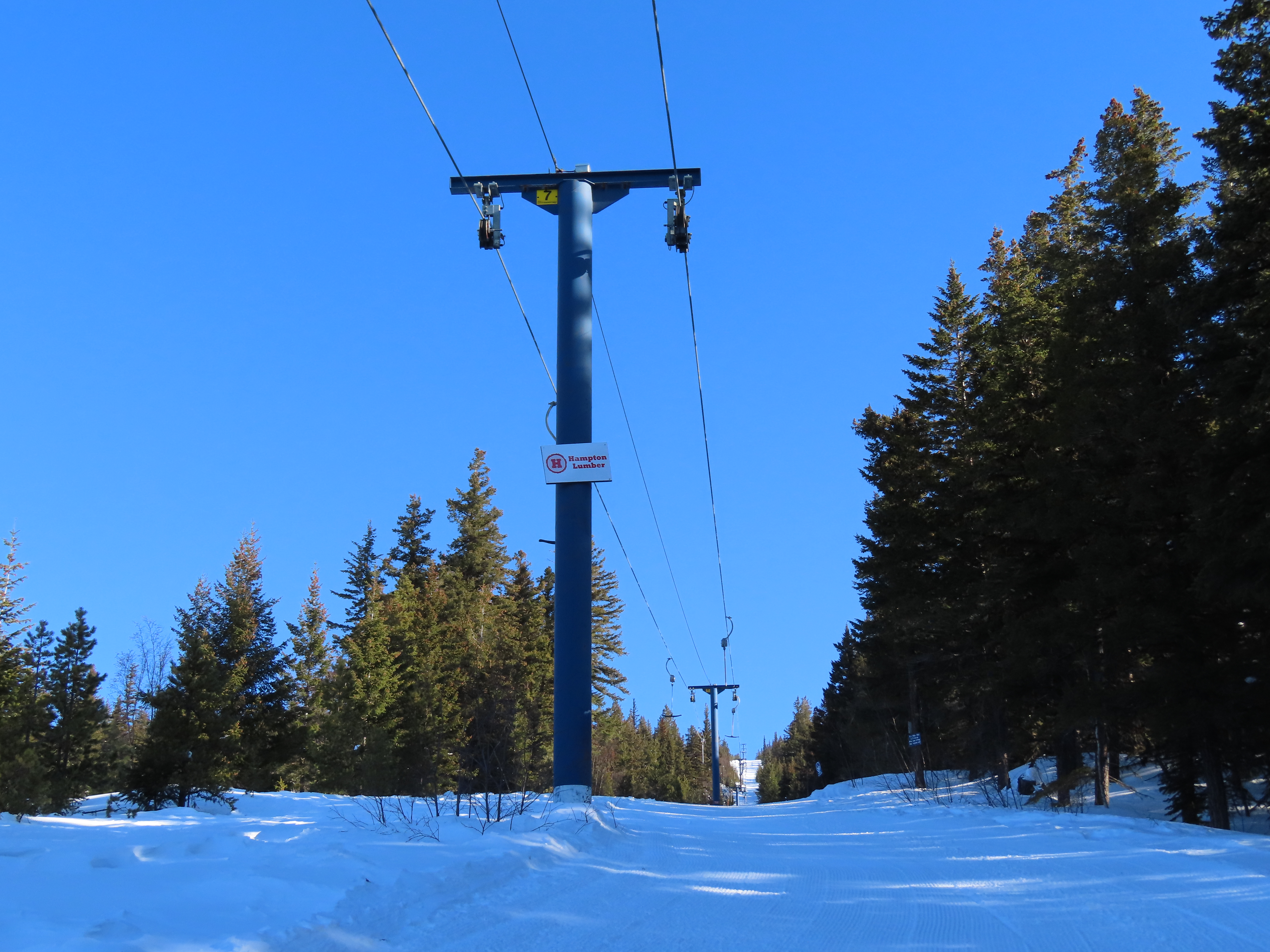 Behold the longest T-Bar in North America, spanning more than 6,400 feet.Drive station with propulsion in the adjacent building.View up from the base area.Side view of the bottom station.A T.View up at tower 2.There are three official unload point, the first of which is at tower 3.View down the middle part of the lift line.Tower 7.Nearing the summit.View down the track.View near the summit.Top terminal with counterweight tensioning.View from the unload point at tower 15.T14 view.Lower lift line at tower 3.Second unload point at tower 8.View riding up the line.Side view of the summit station.Lift line with very wide tower spacing.